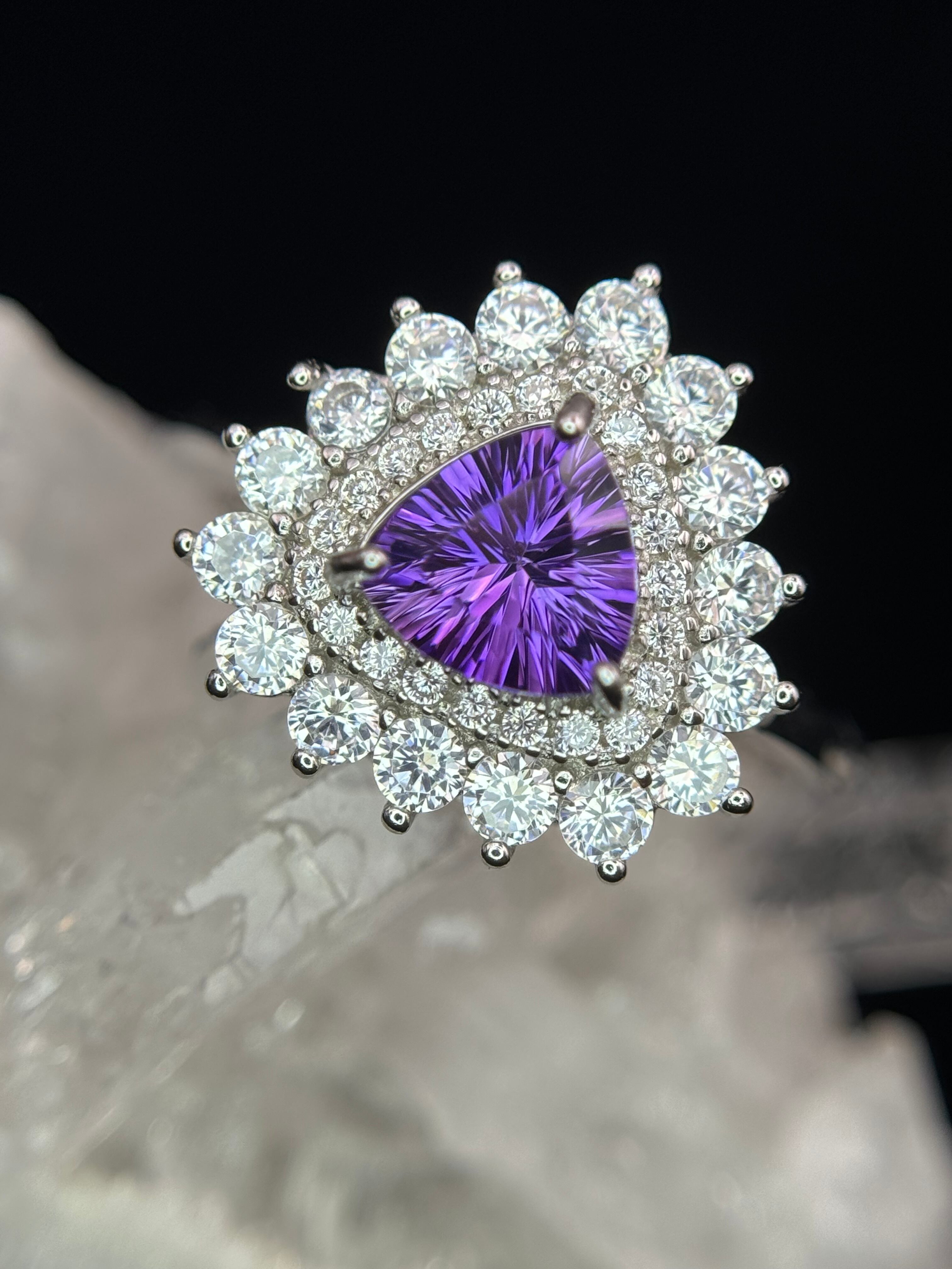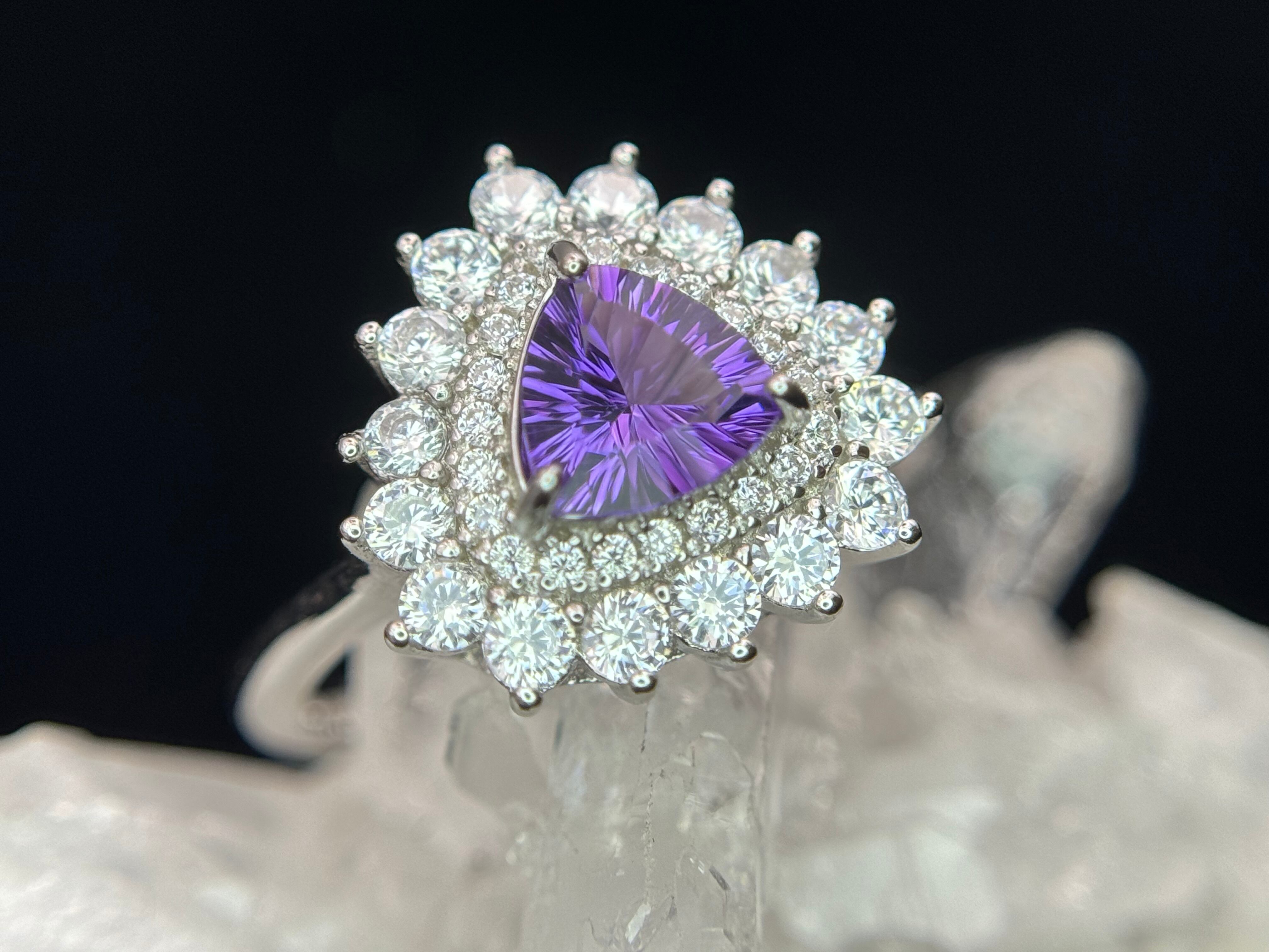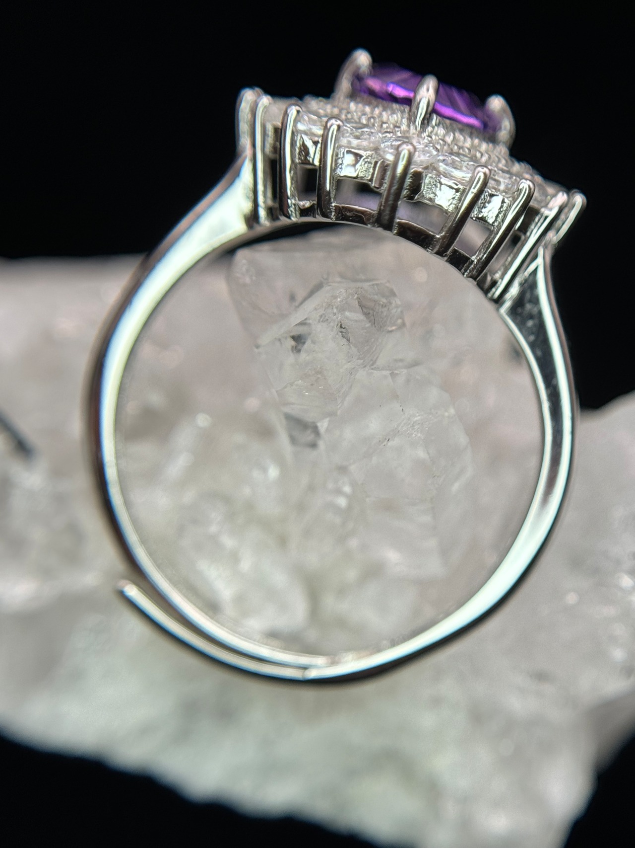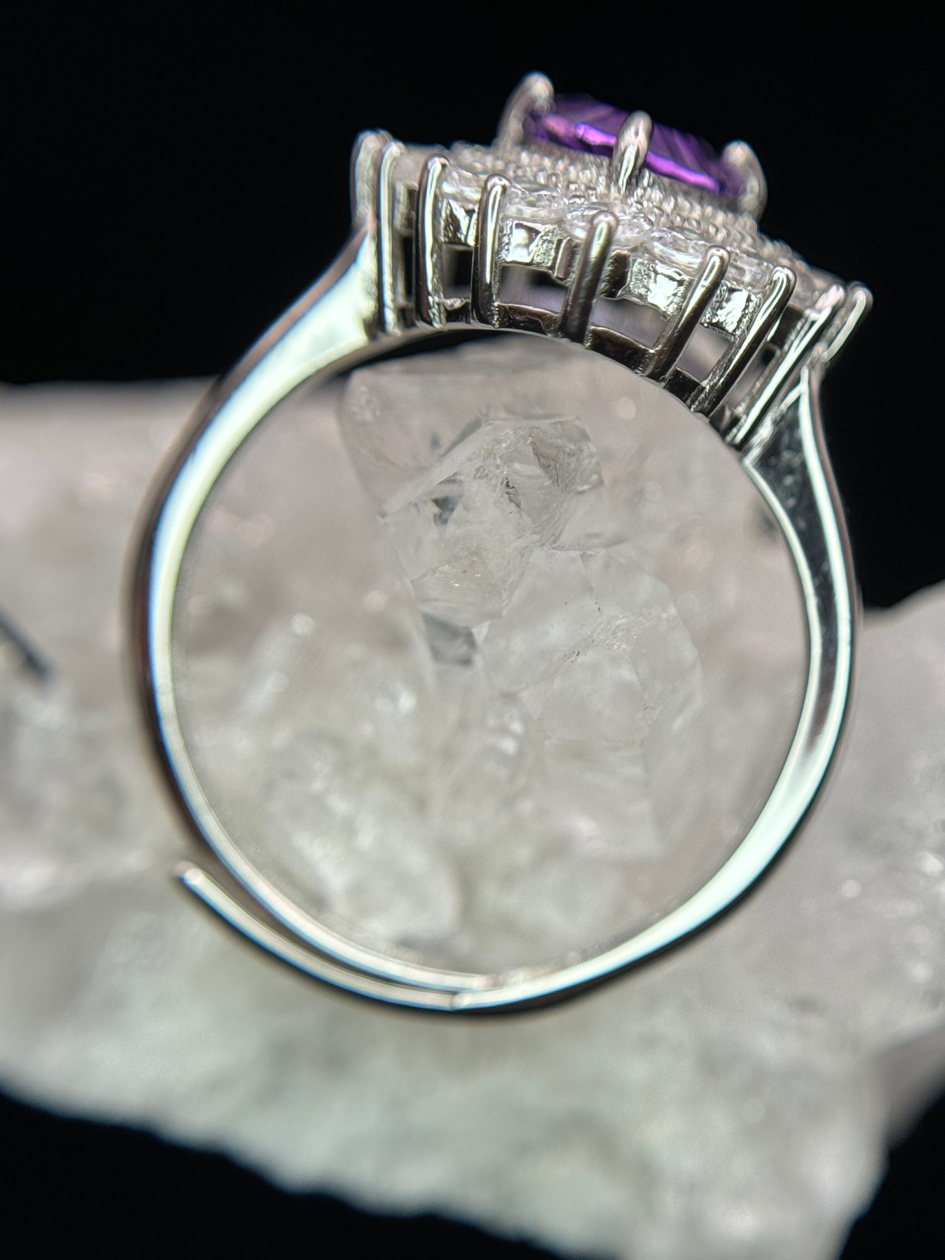煌びやかに散るジルコニアの中央に佇む、高貴な紫が美しいアメジストのリングです。
