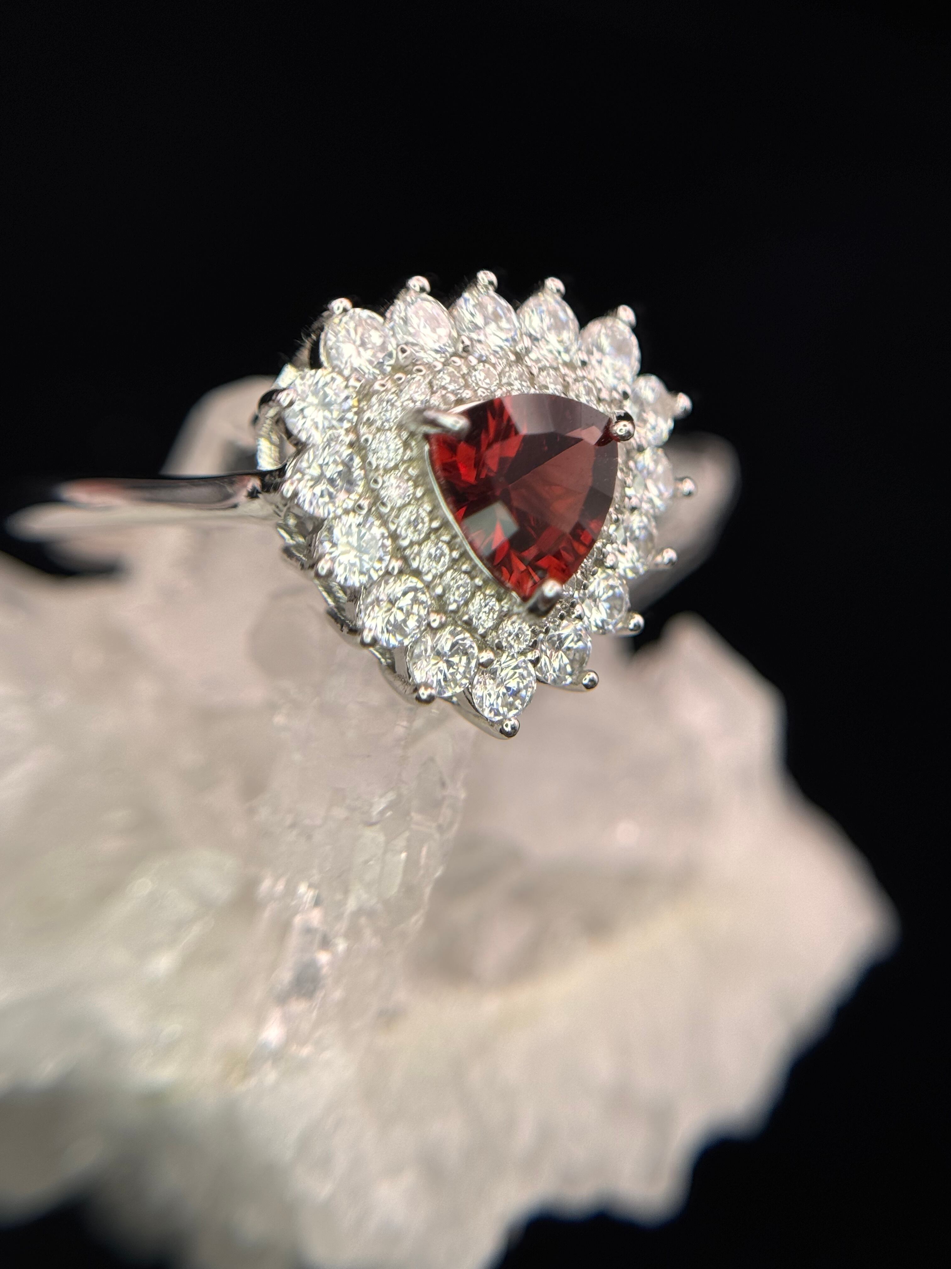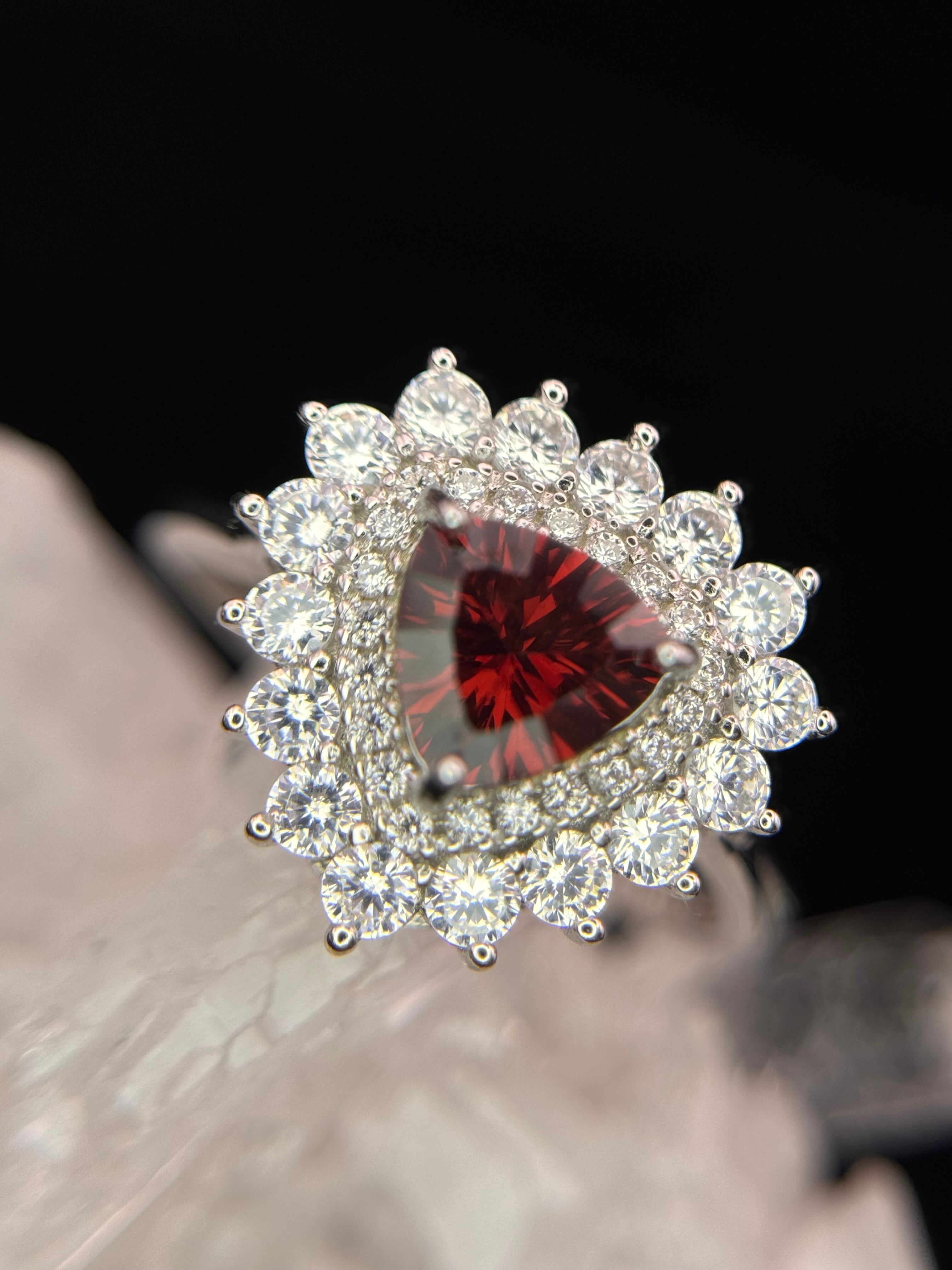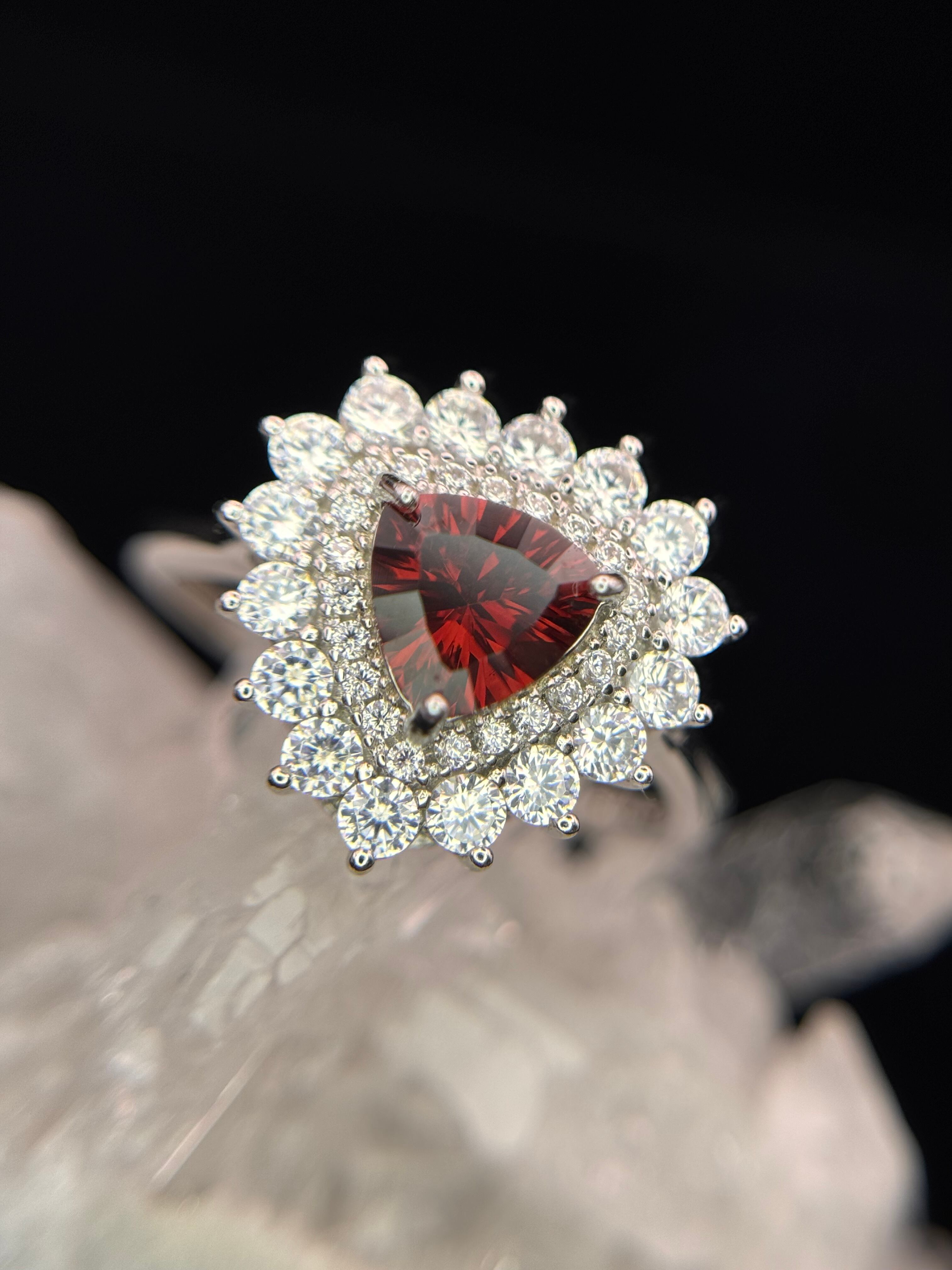 煌びやかに散るジルコニアの中央に佇む、ワインカラーが美しいガーネットのリングです。