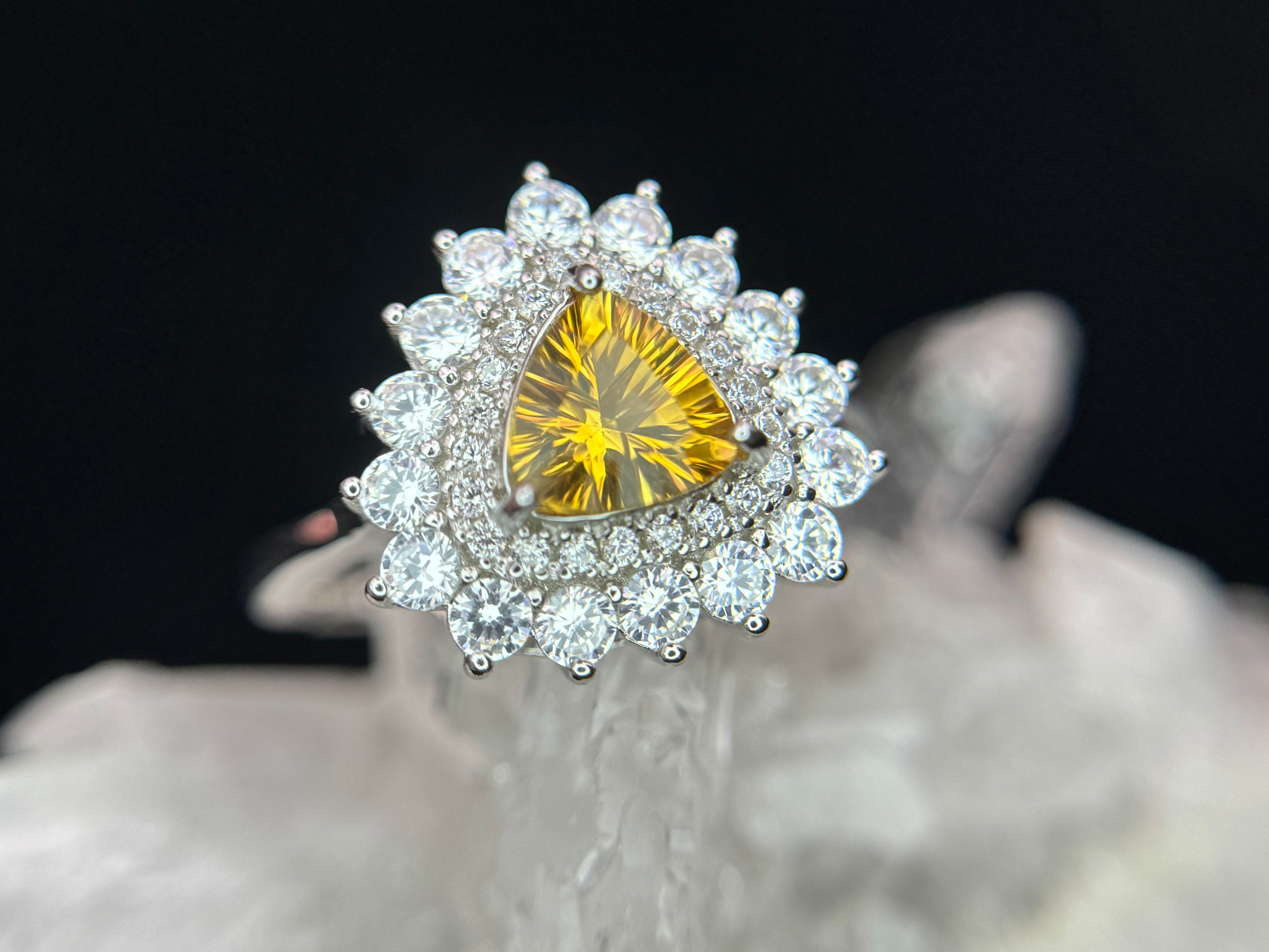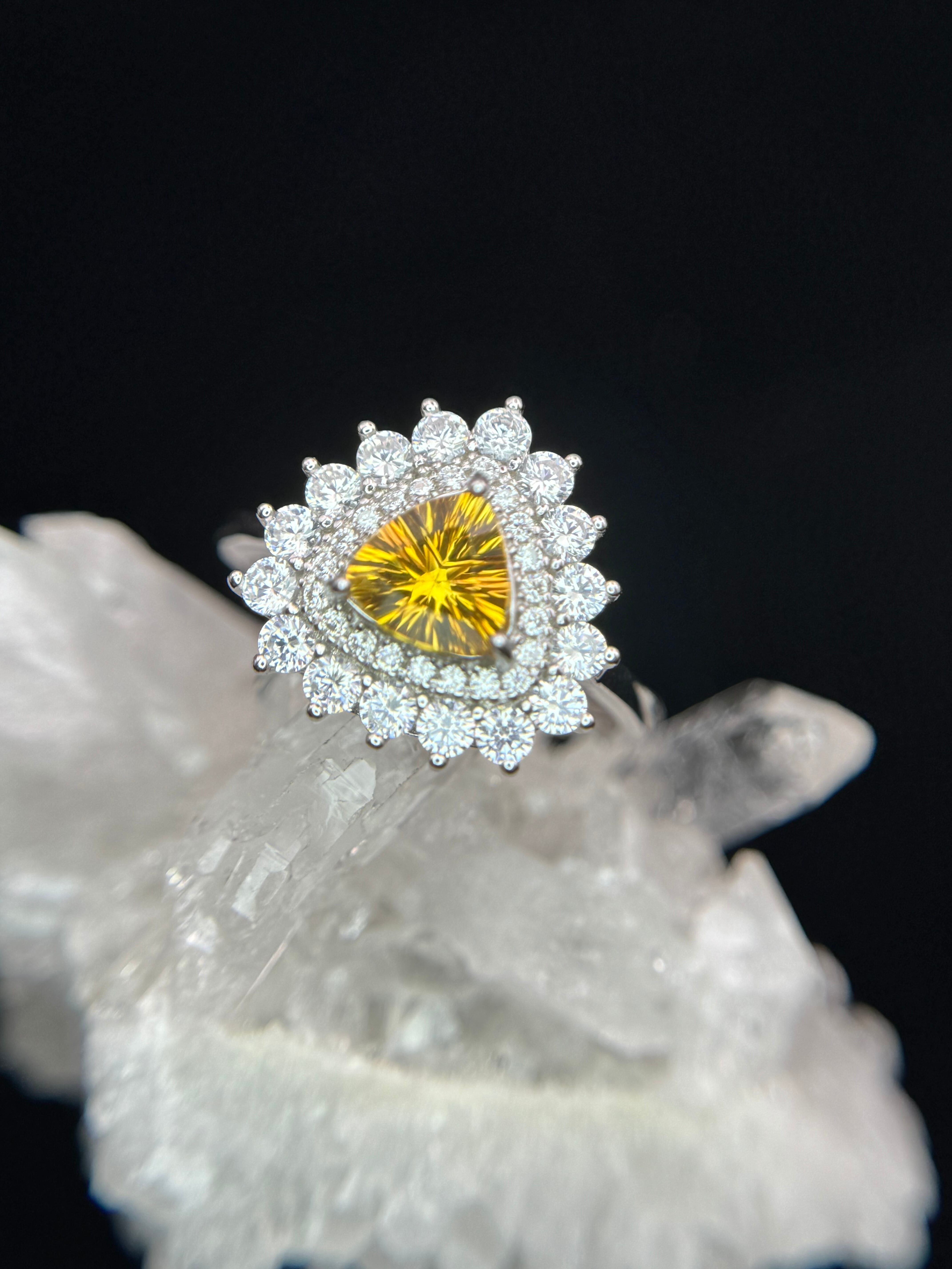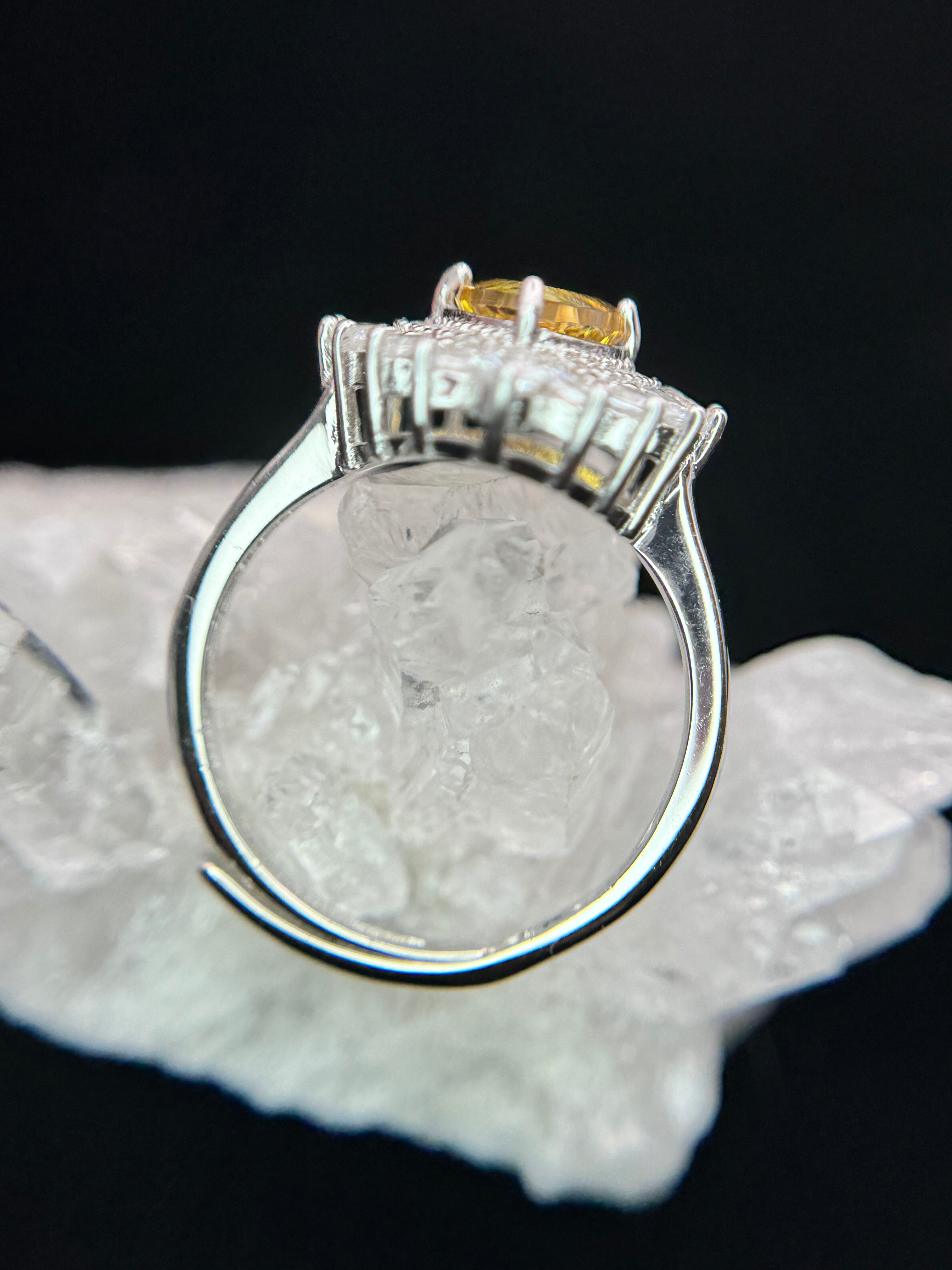 煌びやかに散るジルコニアの中央に佇む、蜂蜜カラーが美しいシトリンのリングです。