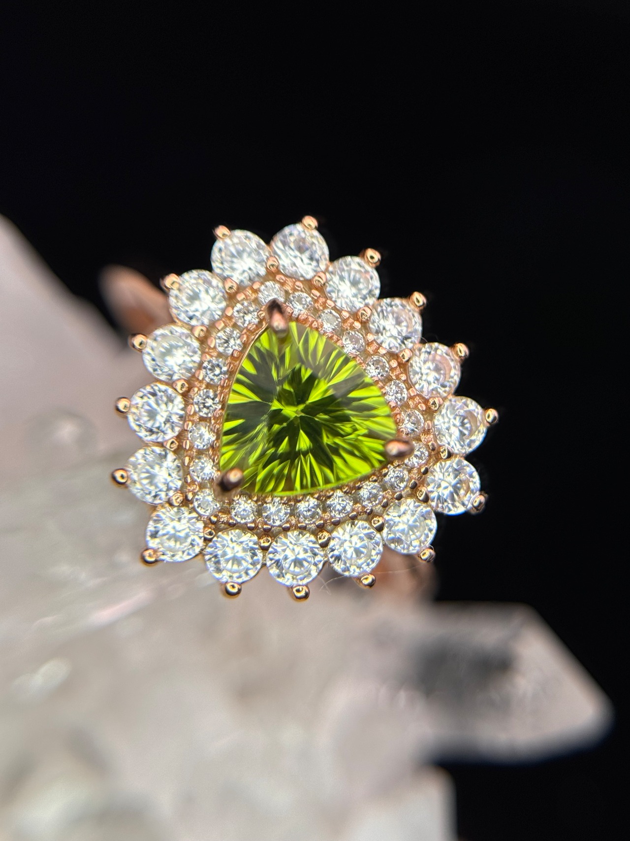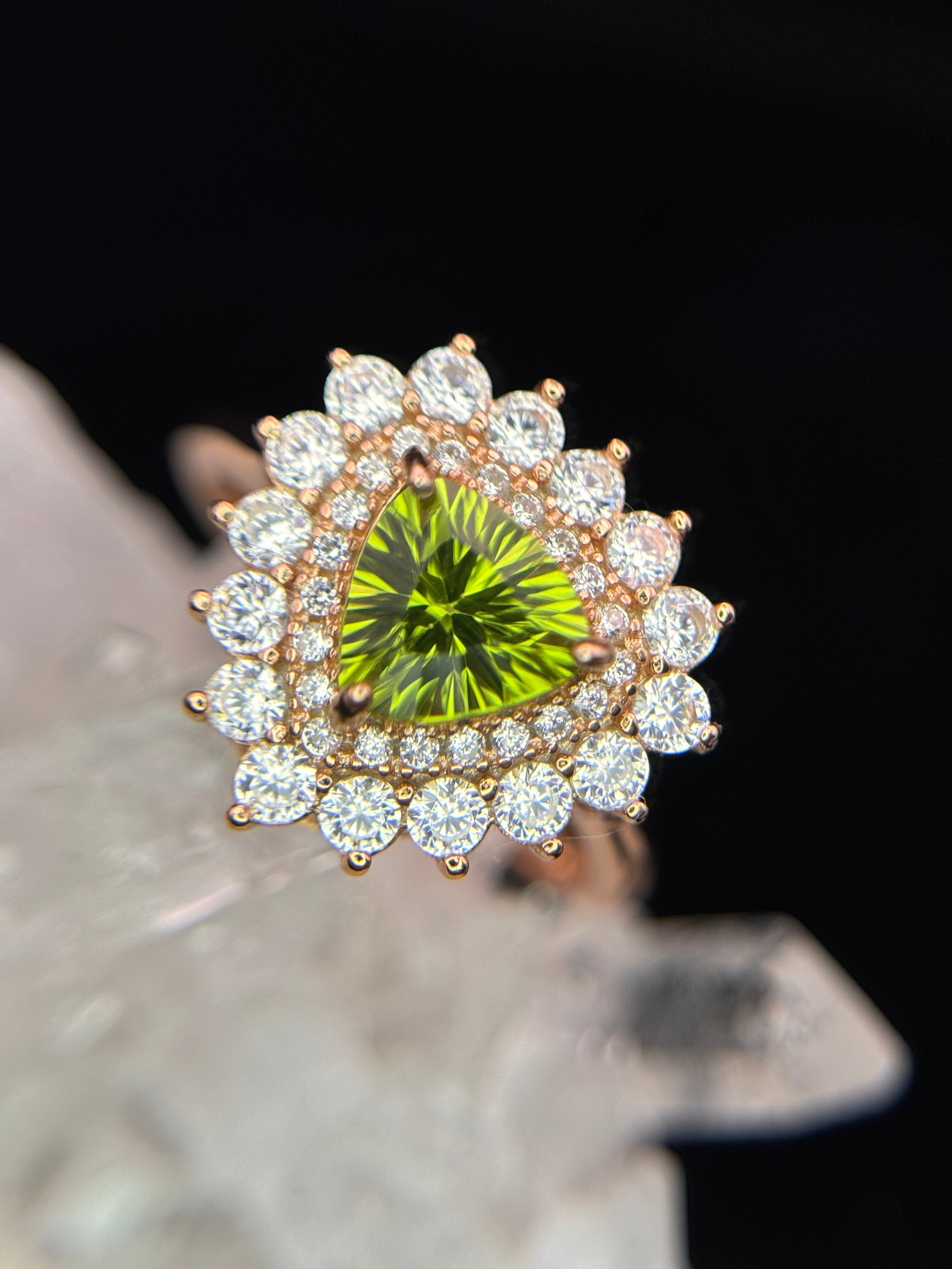 煌びやかに散るジルコニアの中央に佇む、美しいペリドットのリングです。