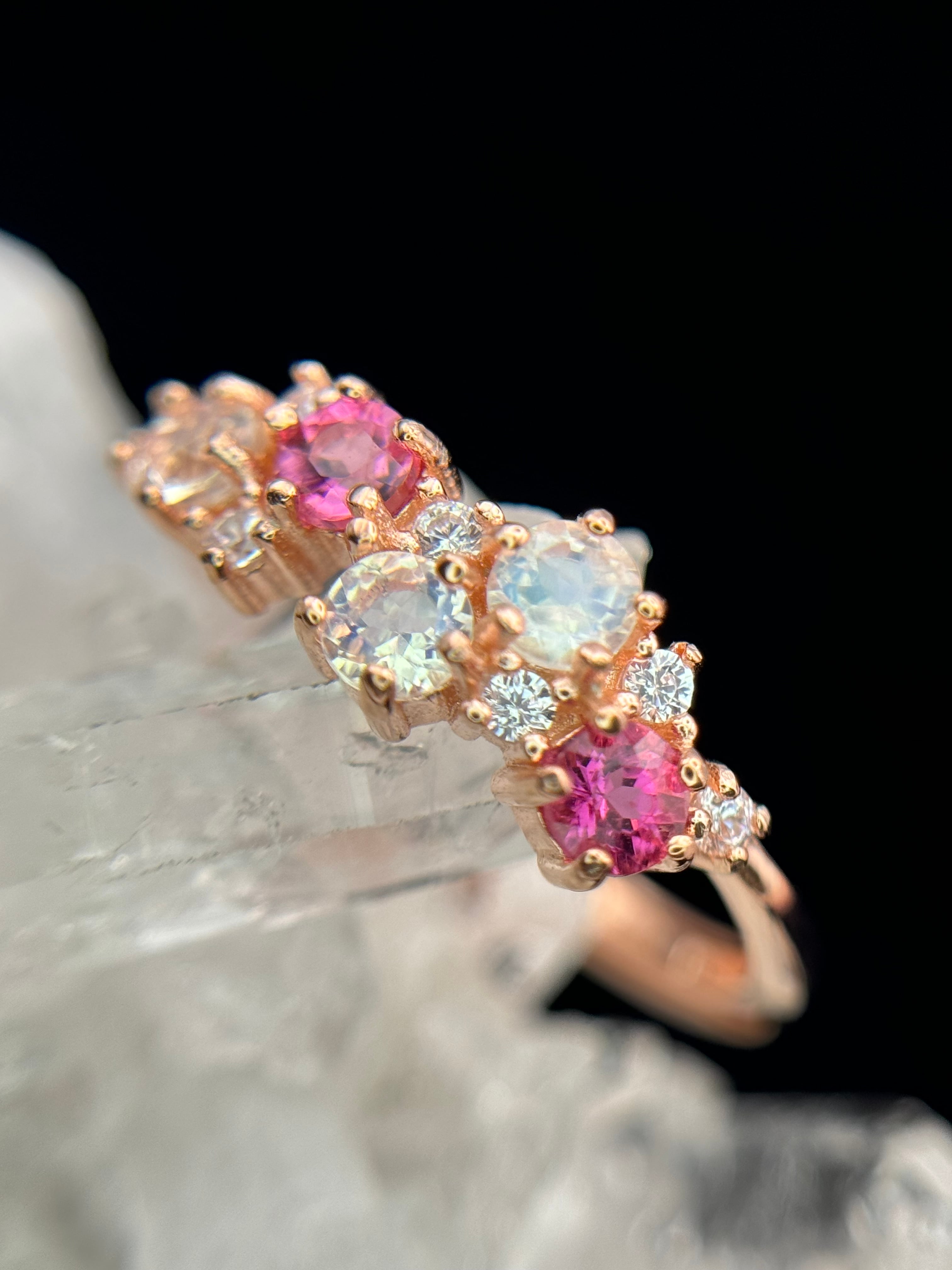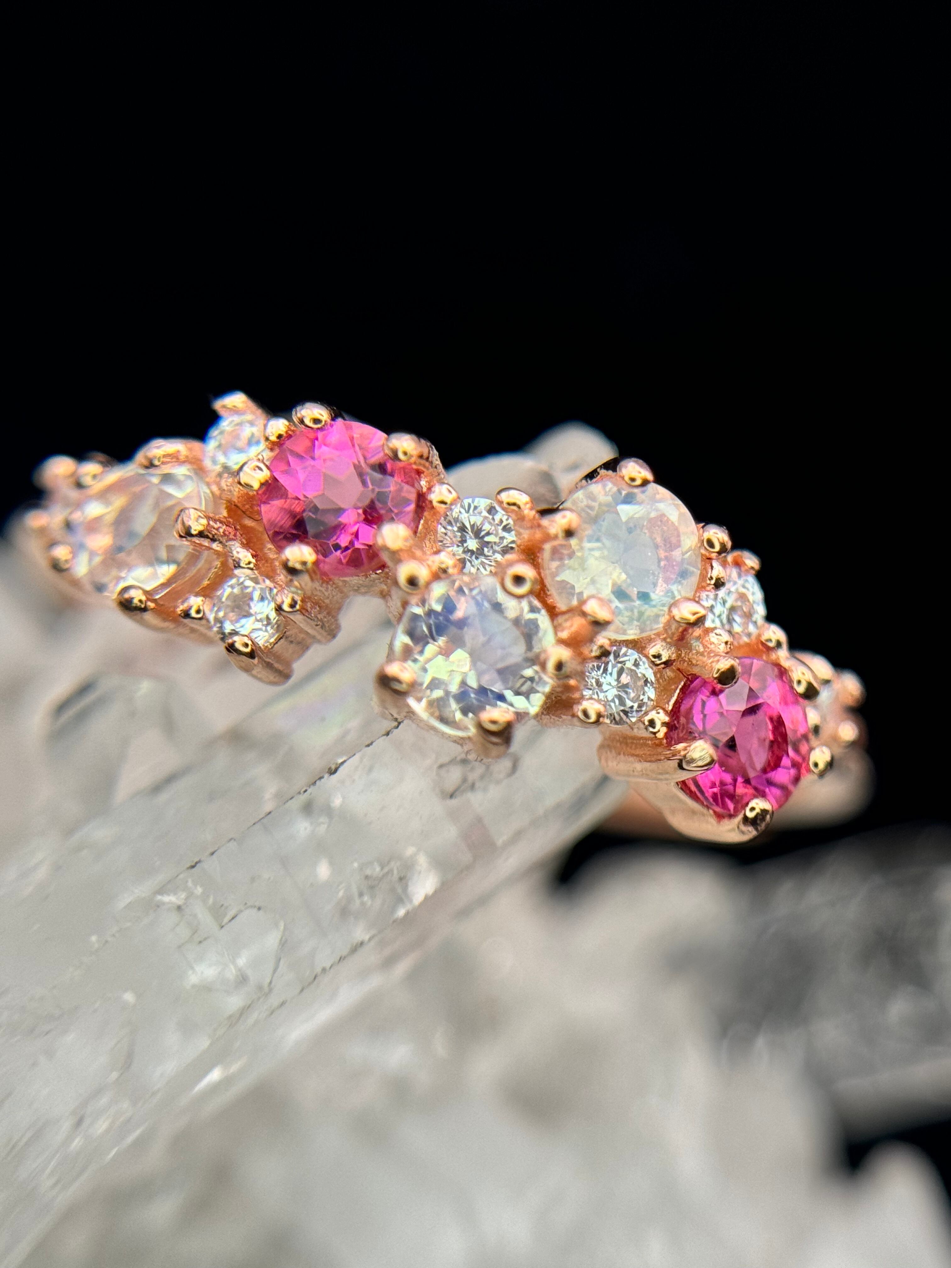 花かんむりのように配置された濃いピンクトルマリンと、淡い蕾のようなアンデシンラブラドライトたちが並んで咲いています。