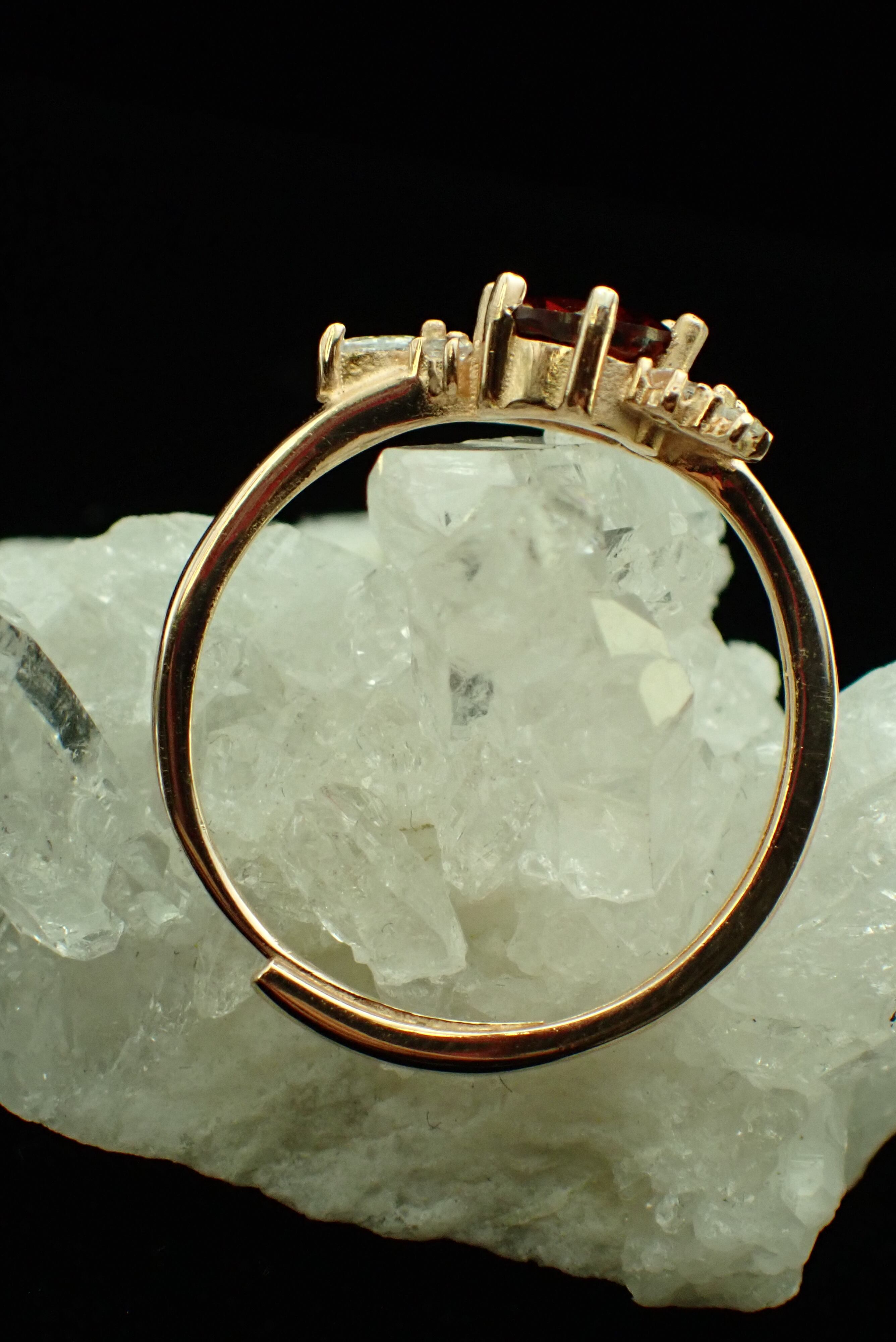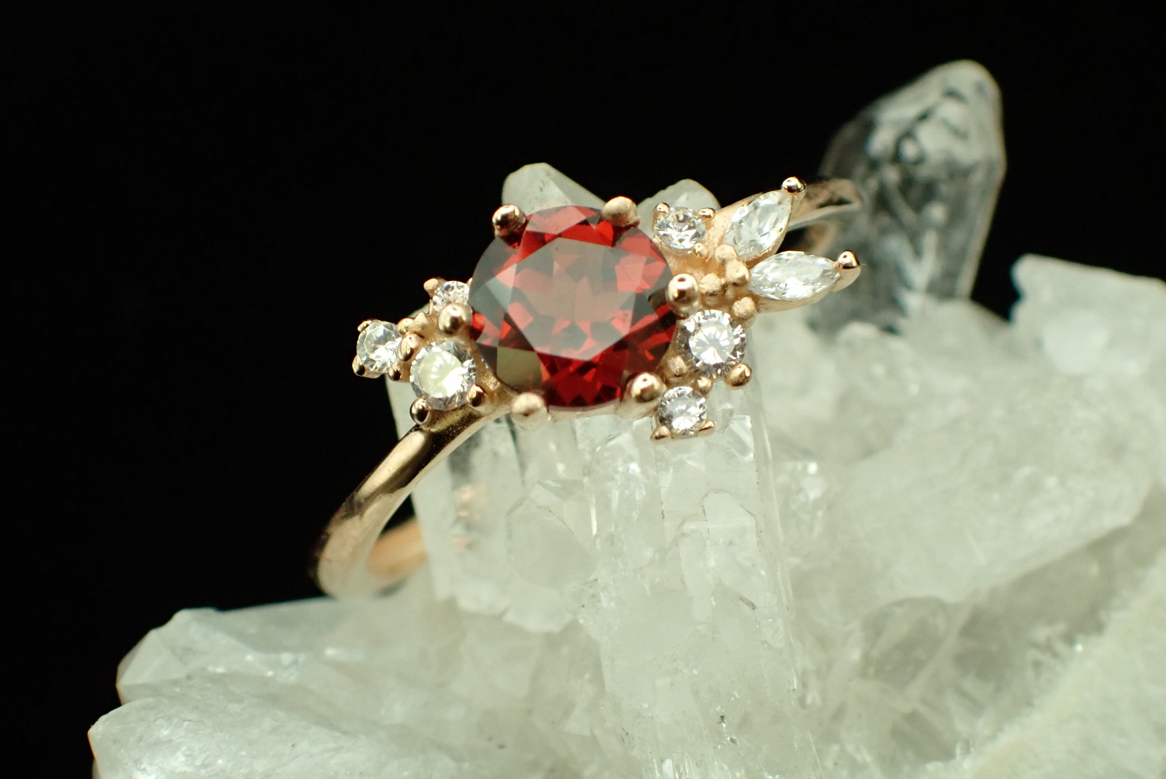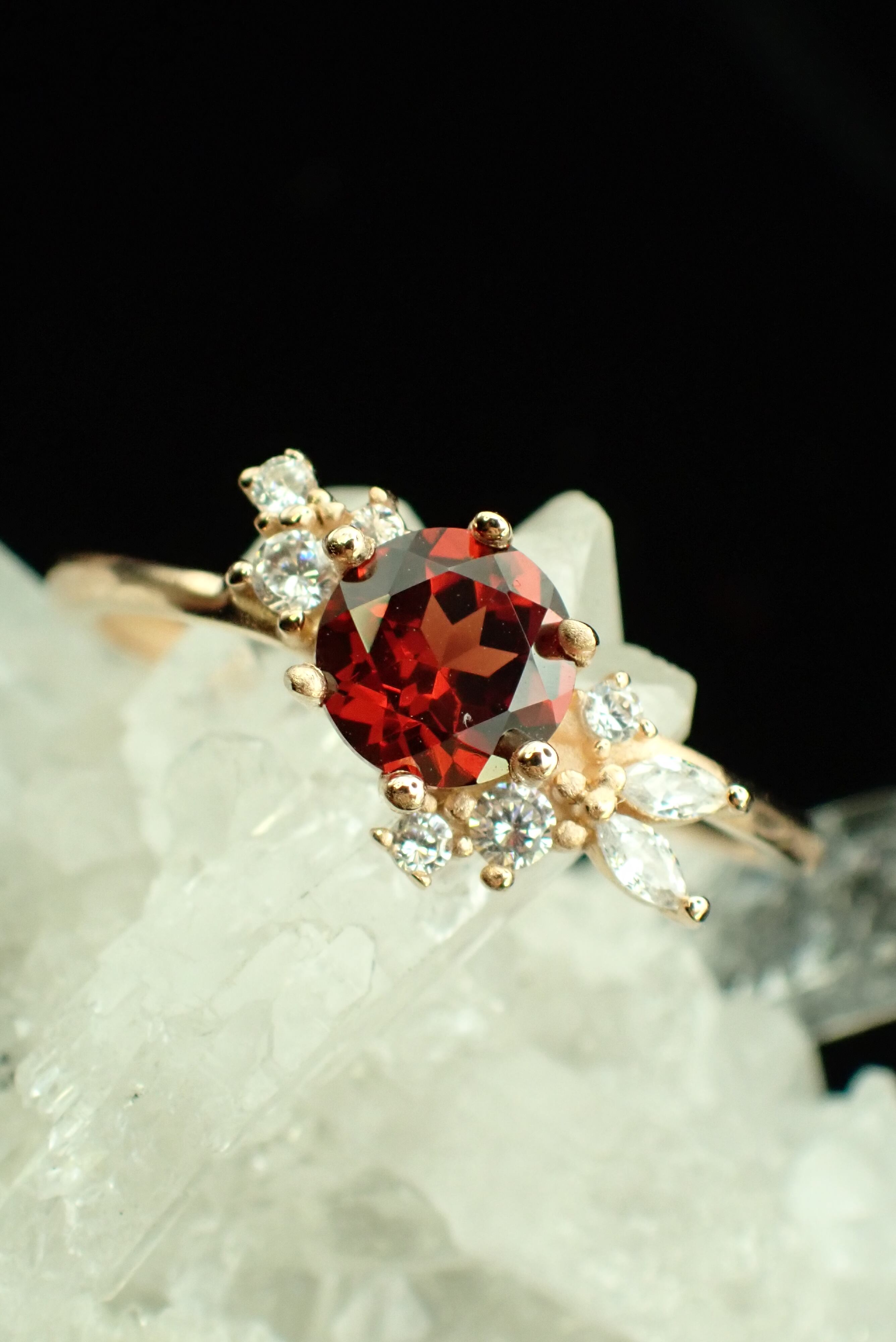 美しく包まれた花束のように並んだ小さなジルコニアたちが、鮮やかな色合いのガーネットをさらに輝かせる繊細なリングです。