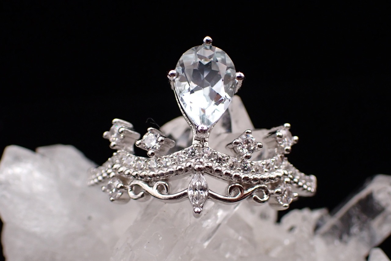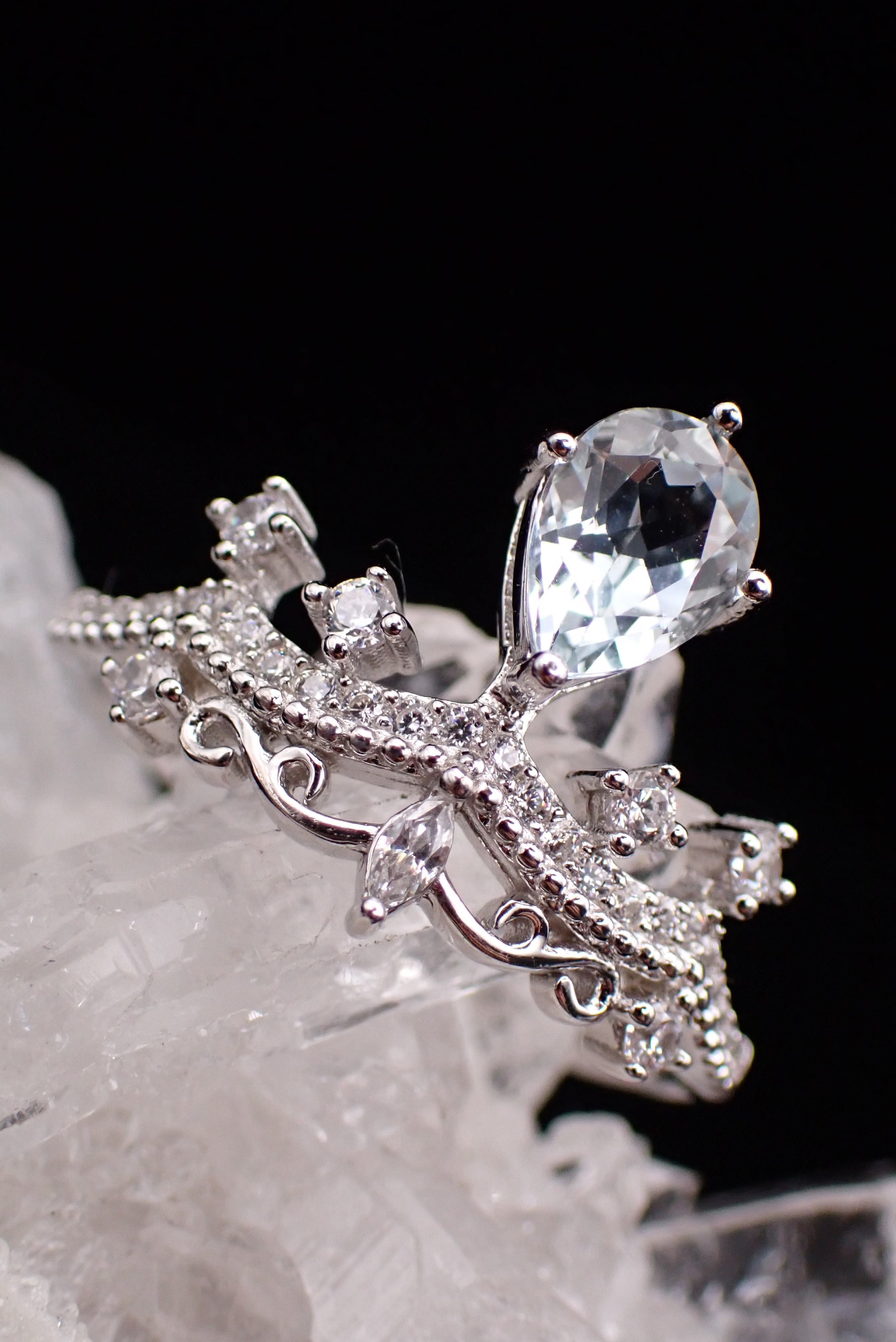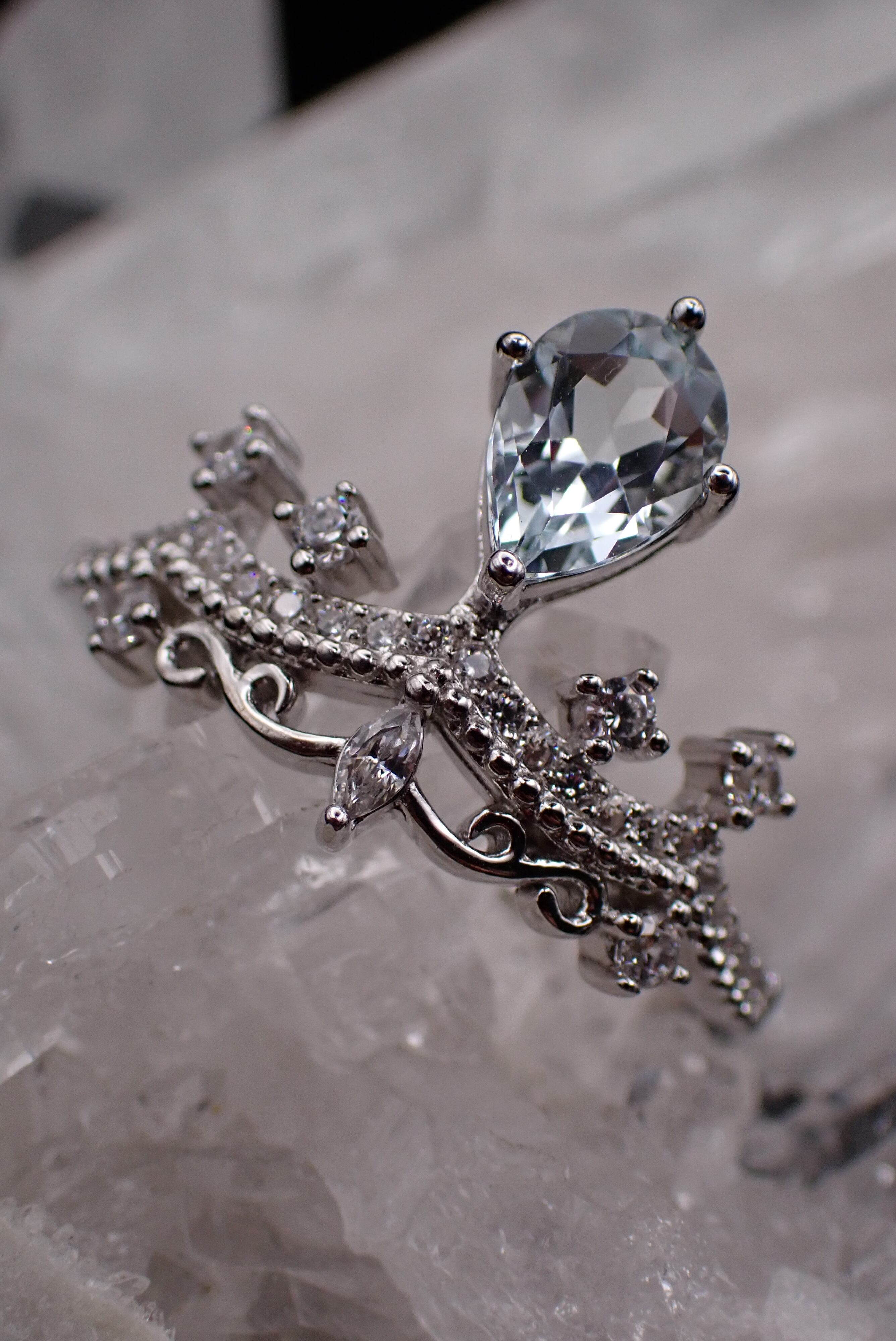 まるでシャンデリアのように美しいデザインのトップから淡いアクアマリンが零れ落ちんばかりに輝いているゴージャスなリングです。