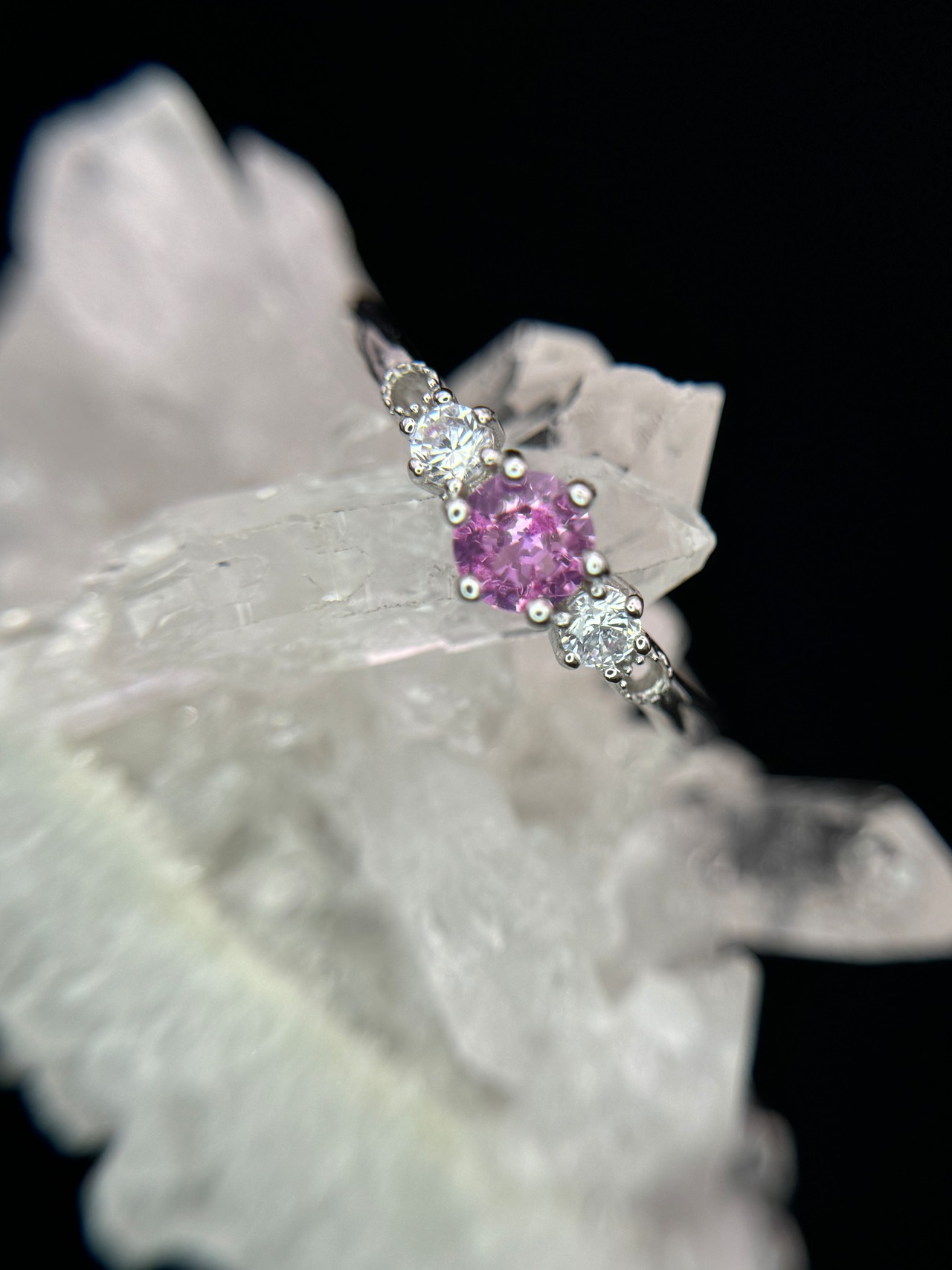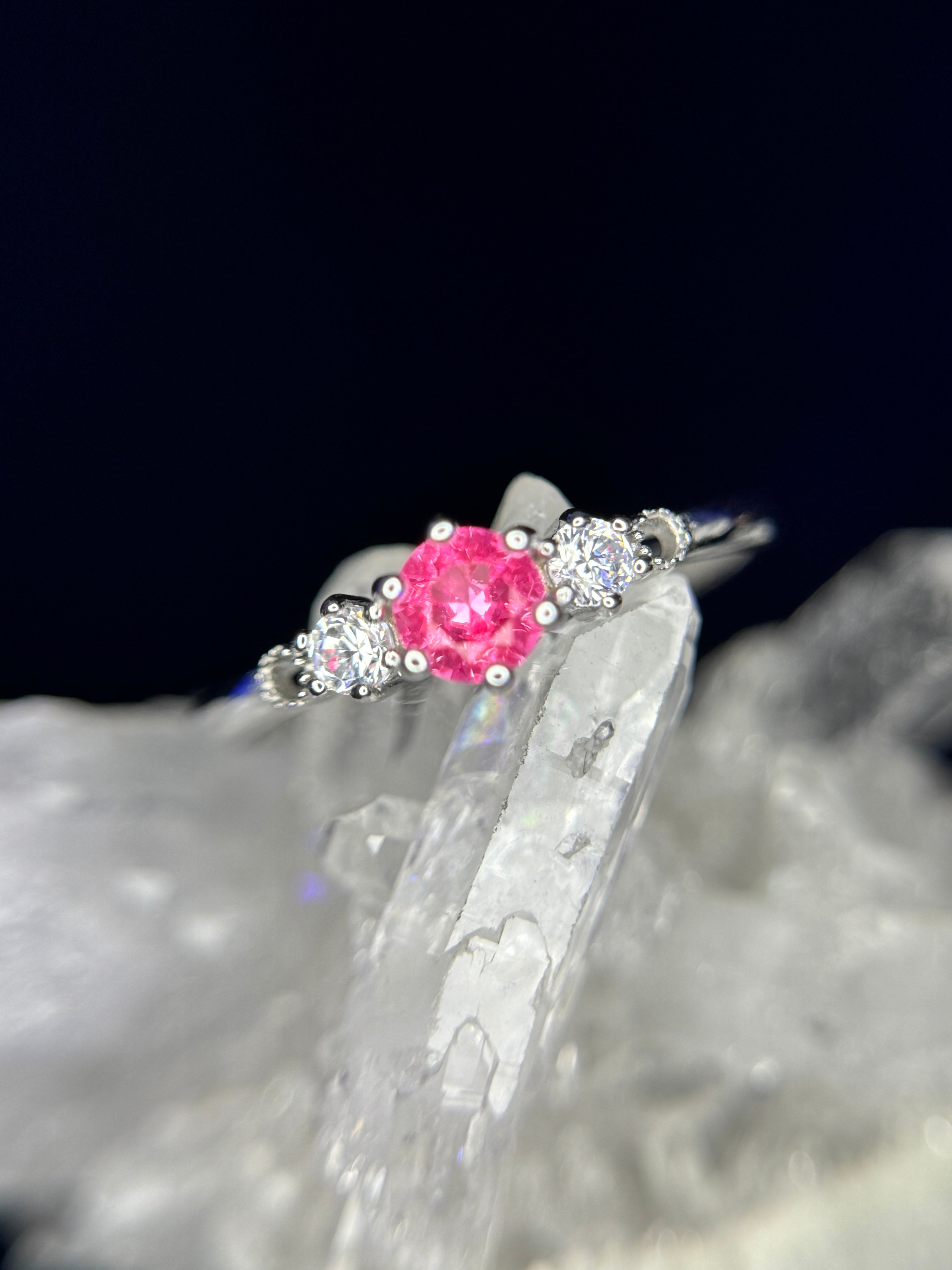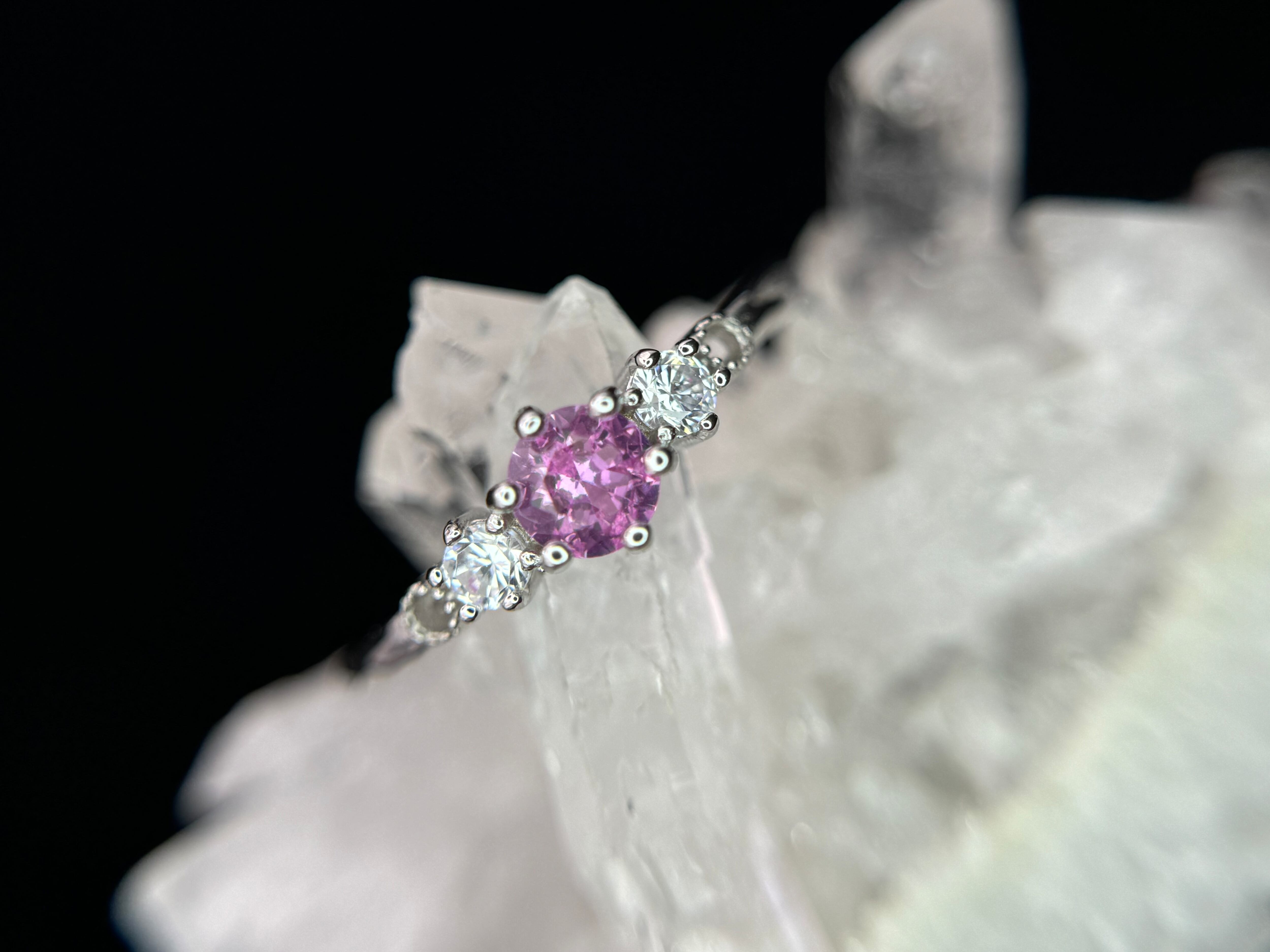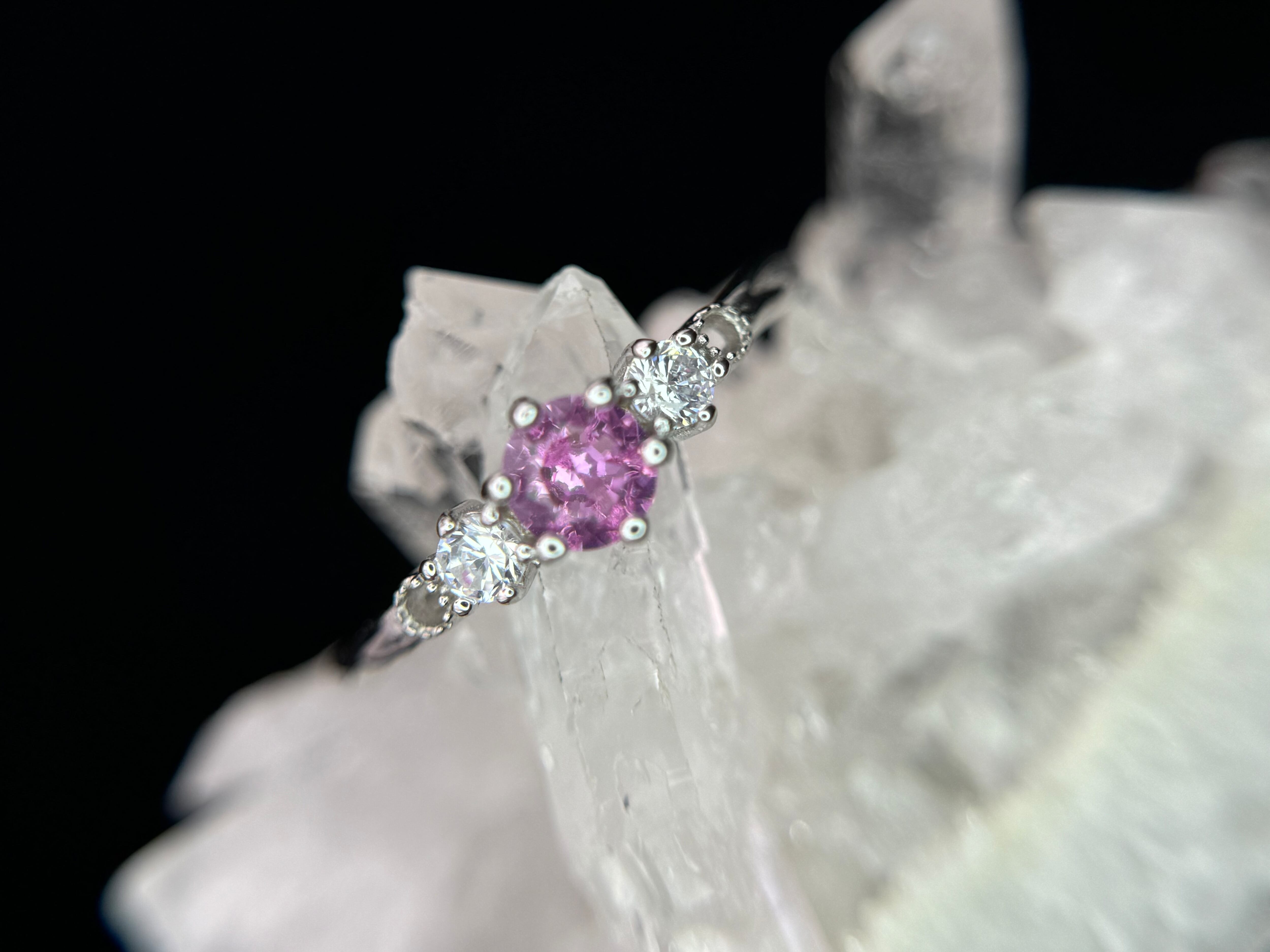 両端のジルコニアが合成ピンクサファイアの輝きをより一層引き立て、キラキラと輝きます。