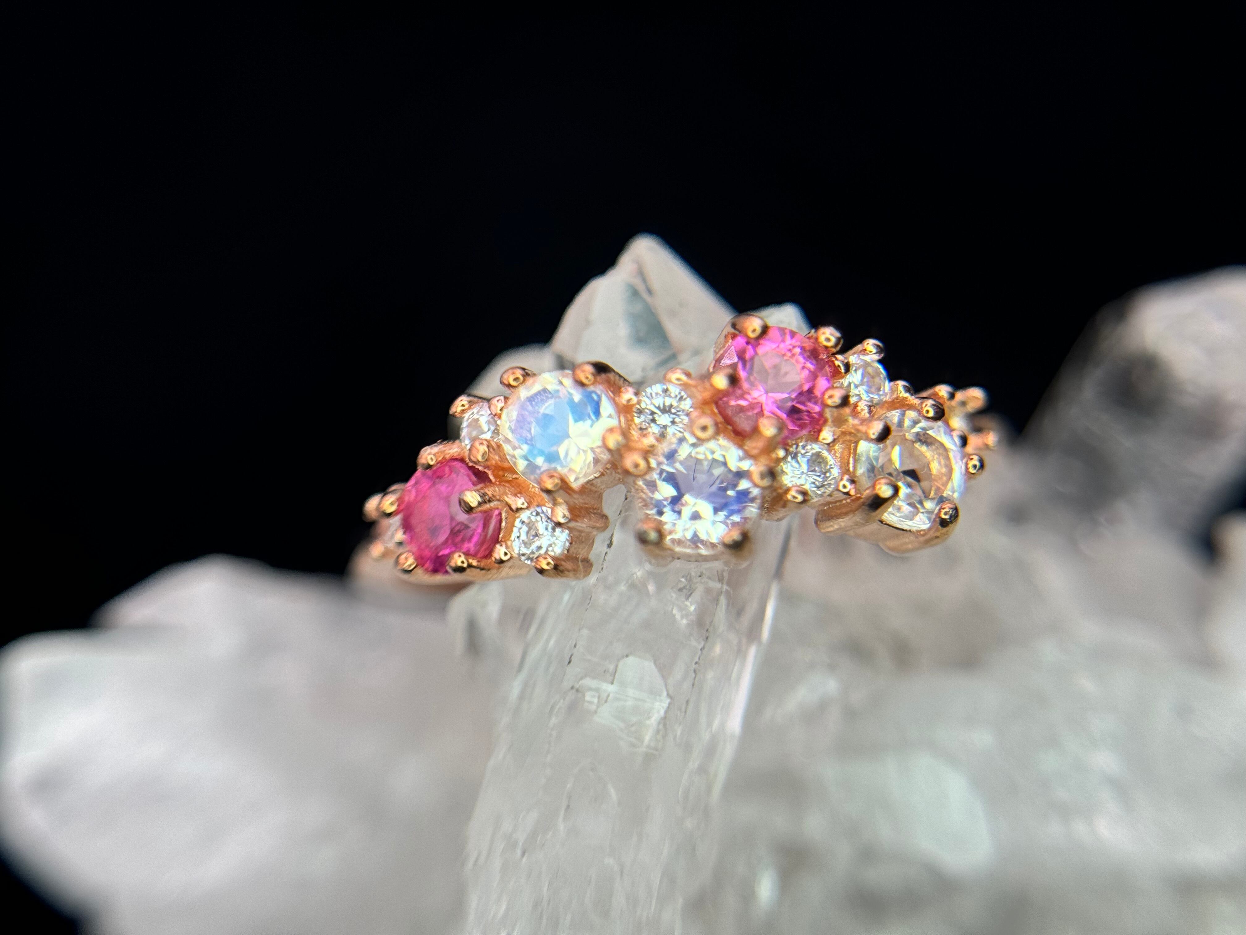 花かんむりのように配置された濃いピンクトルマリンと、淡い蕾のようなアンデシンラブラドライトたちが並んで咲いています。