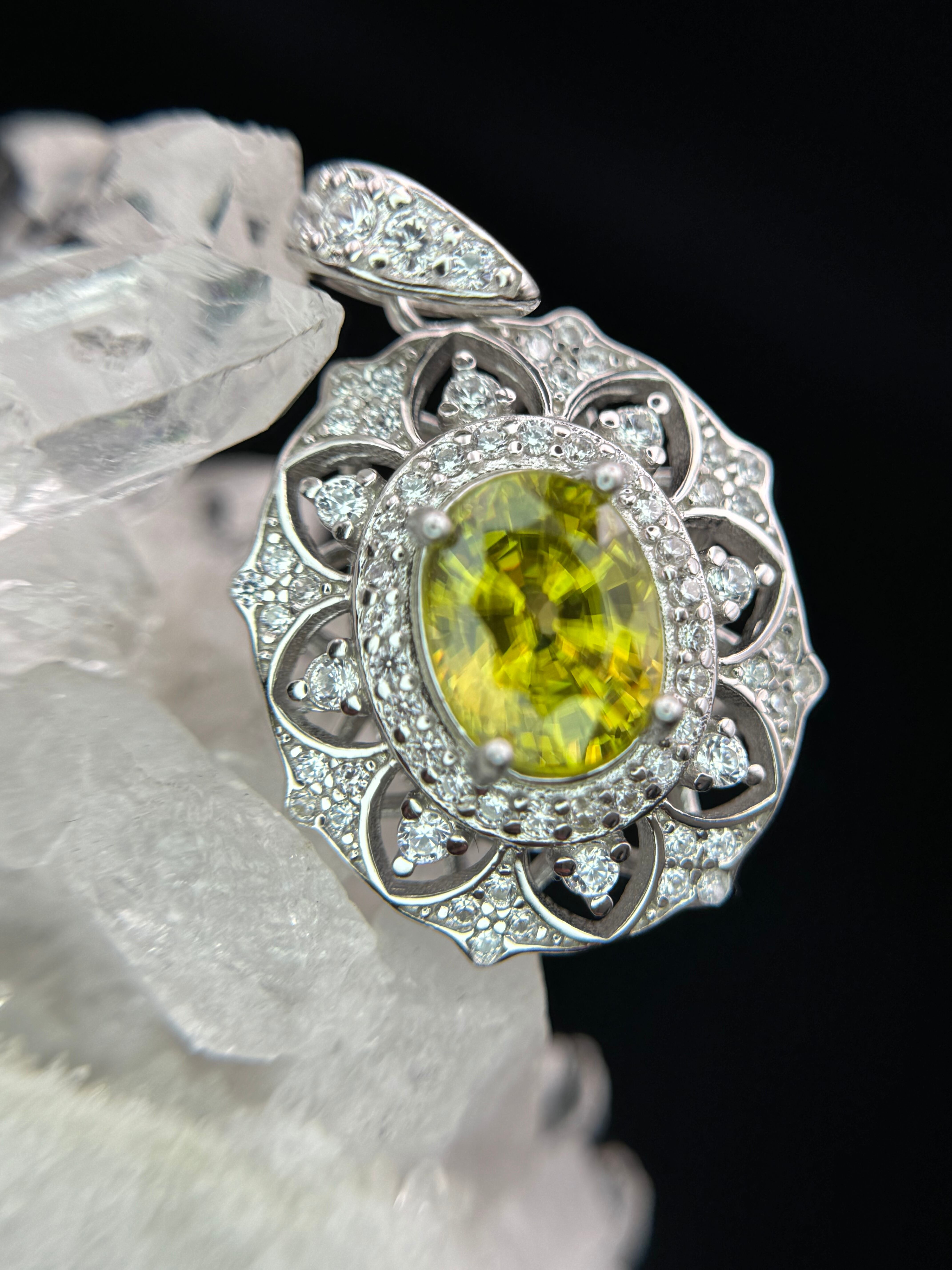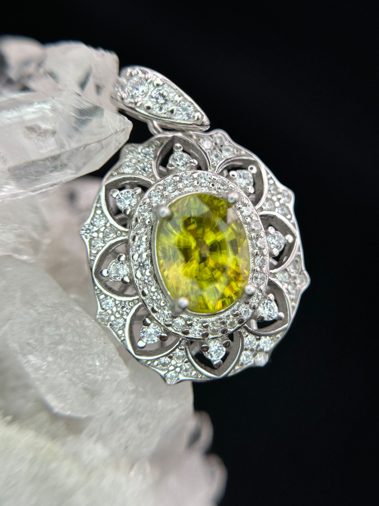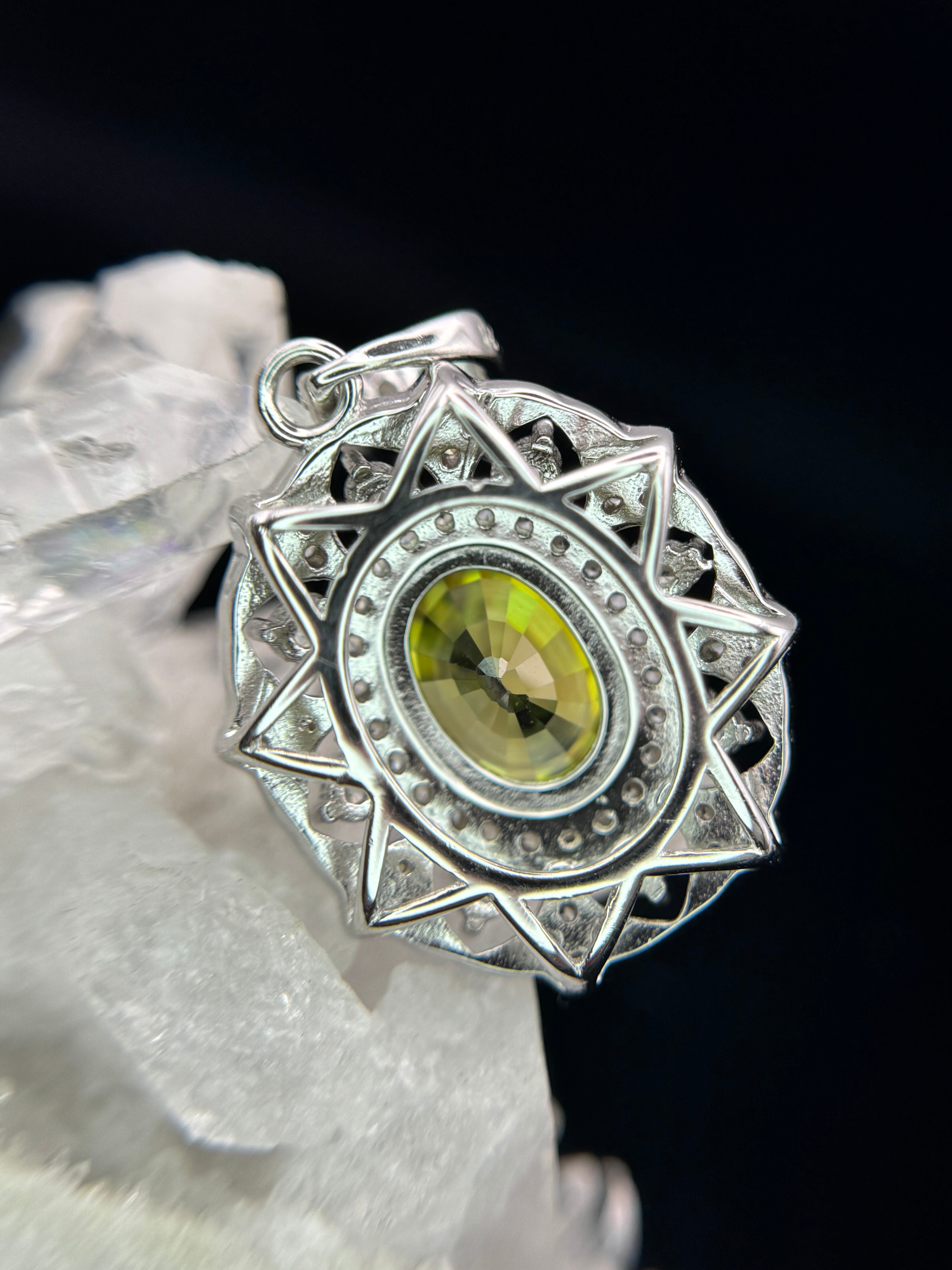 見る角度によってスフェーンのギラギラとしたファイアの見える太陽の冠のようなペンダントです。