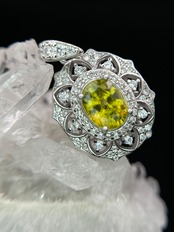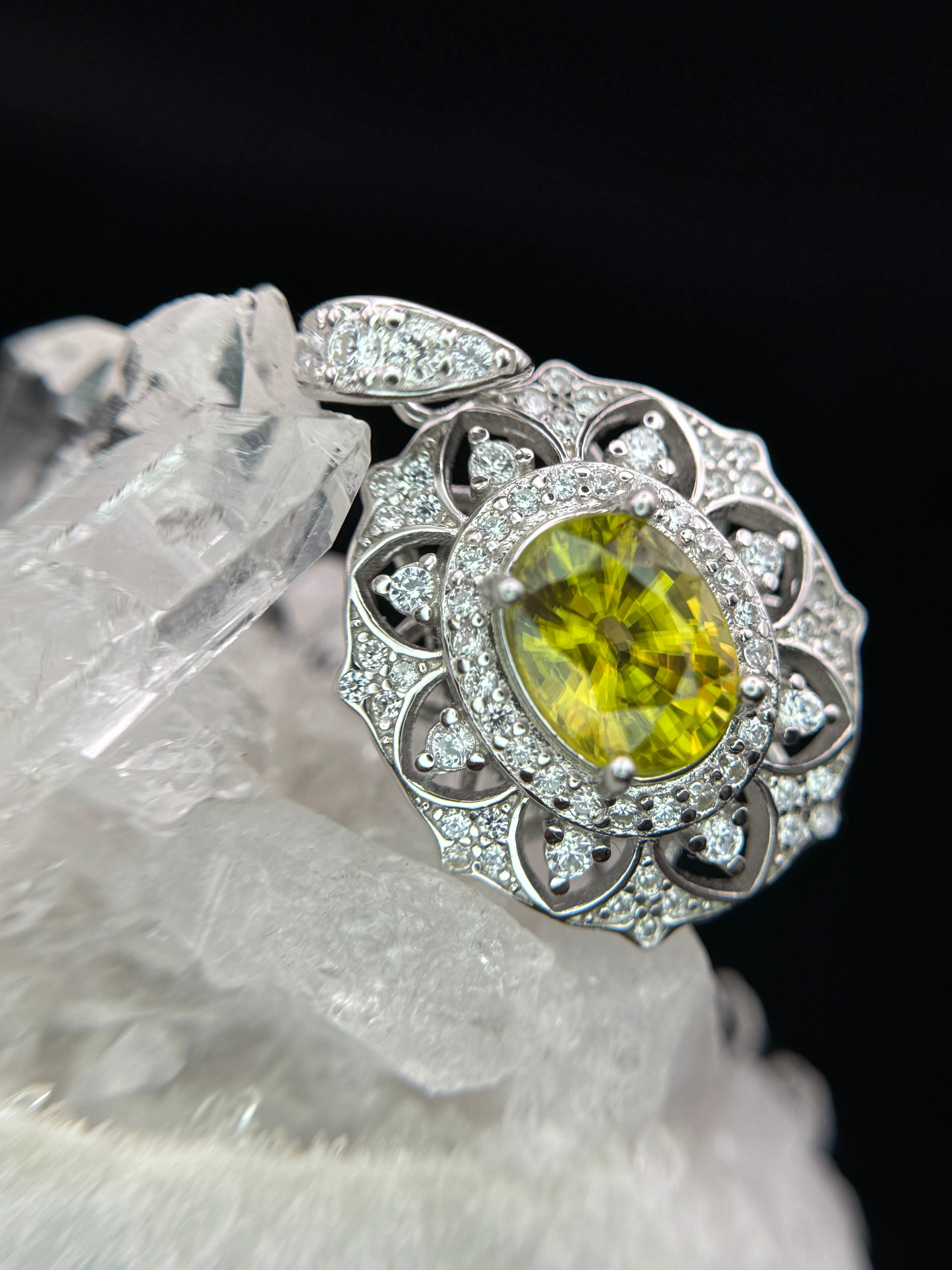 取り巻きのジルコニアたちがキラキラと輝き、スフェーンの美しい輝きを引き立てます。
