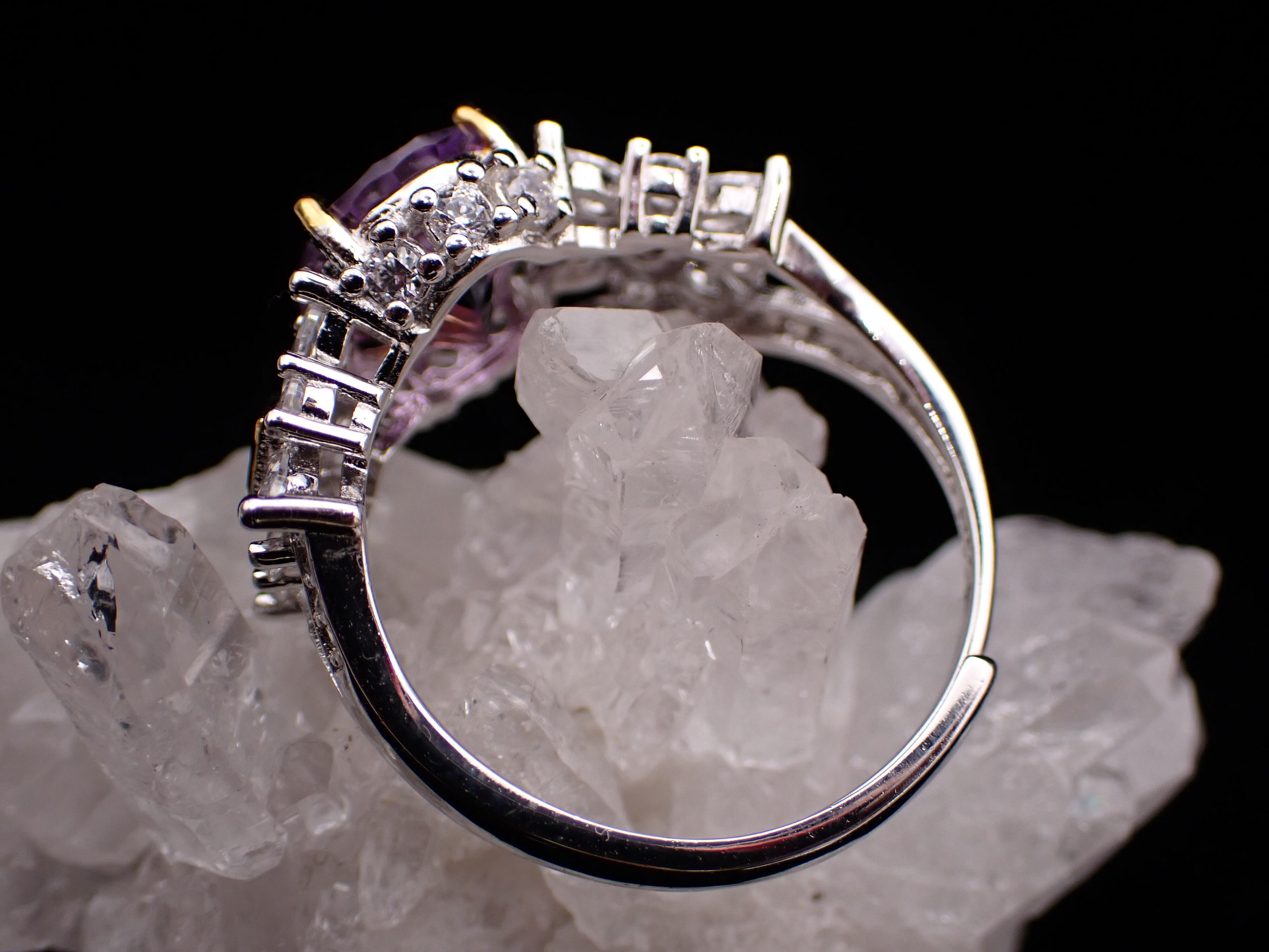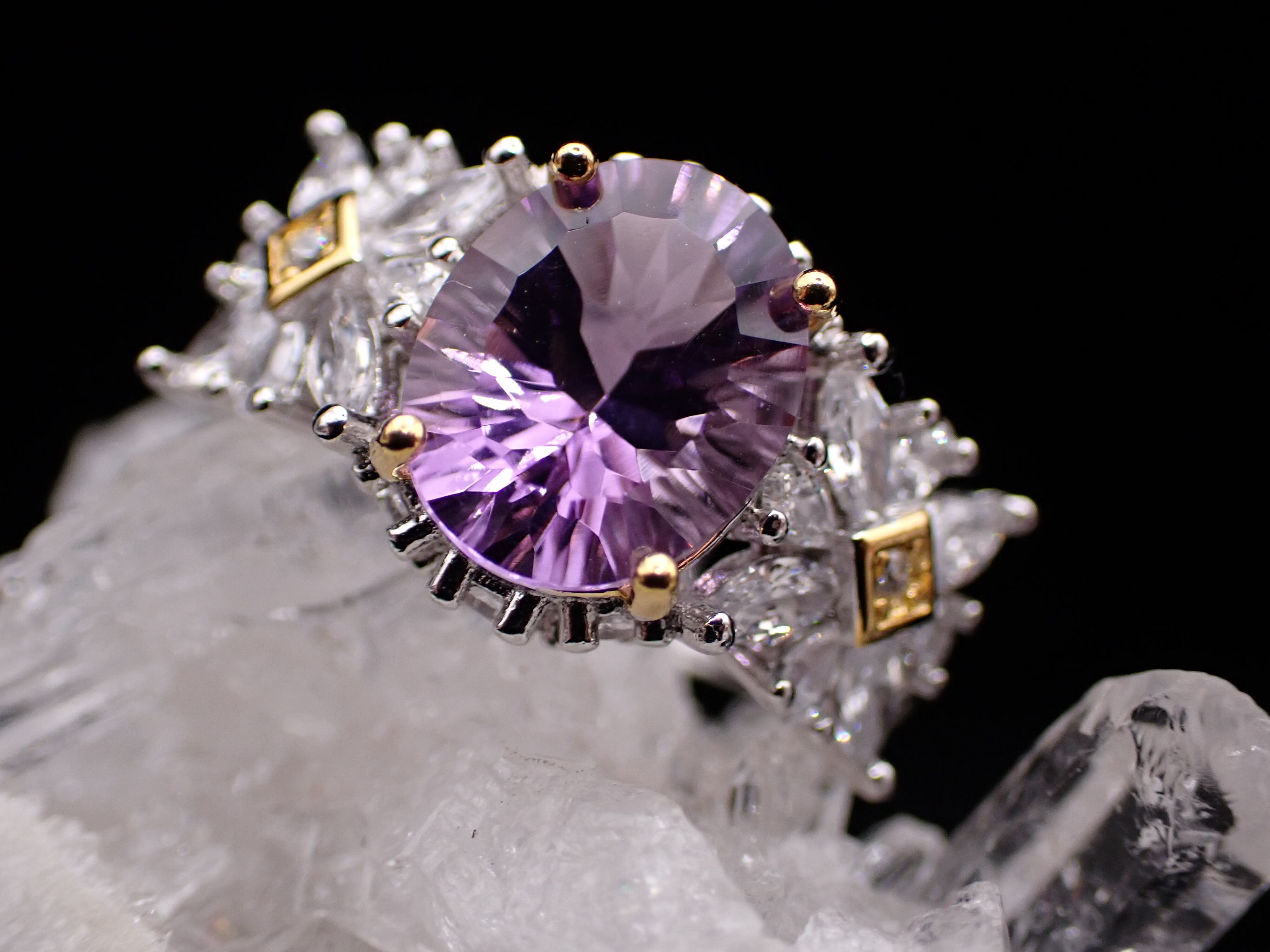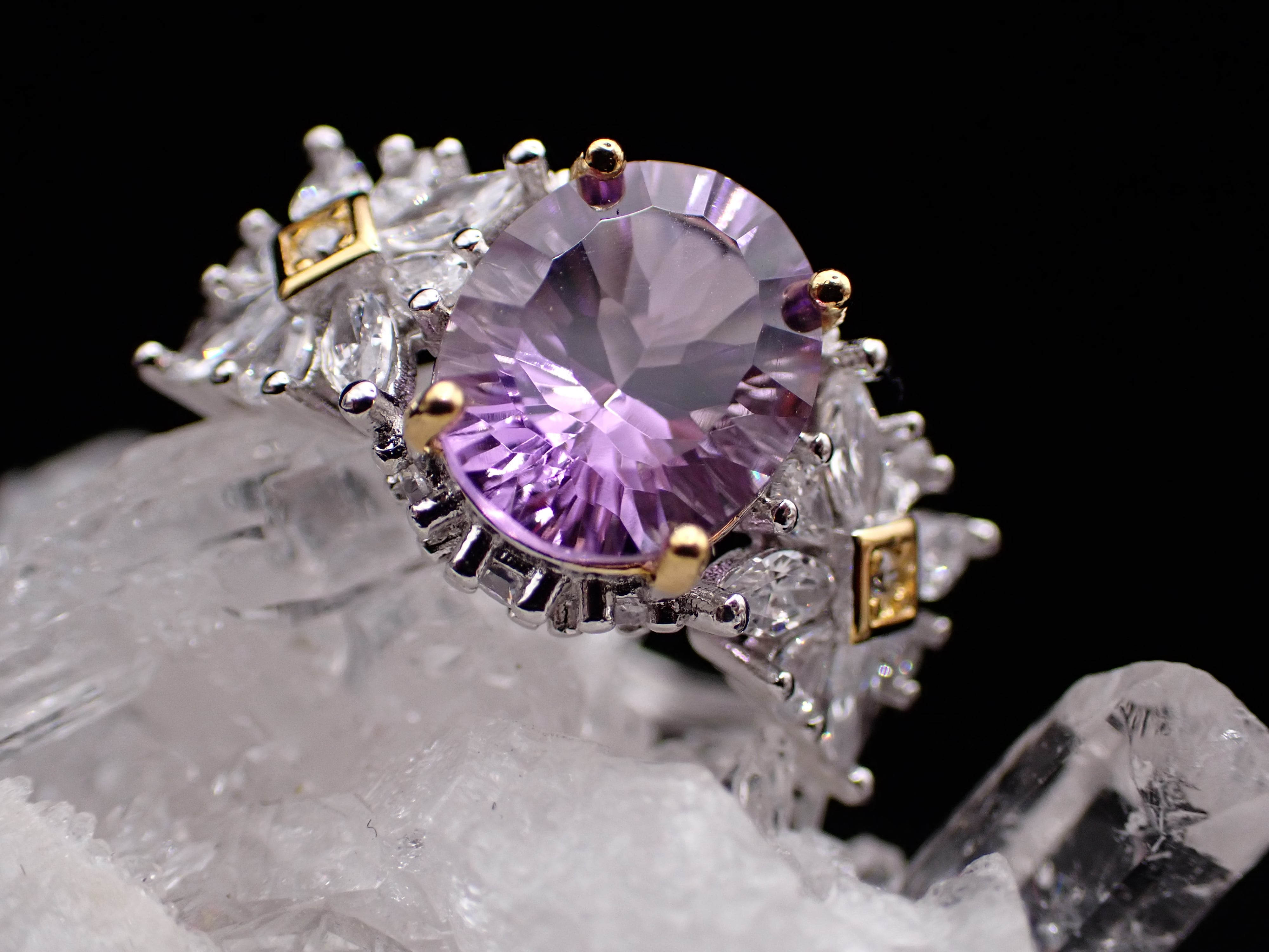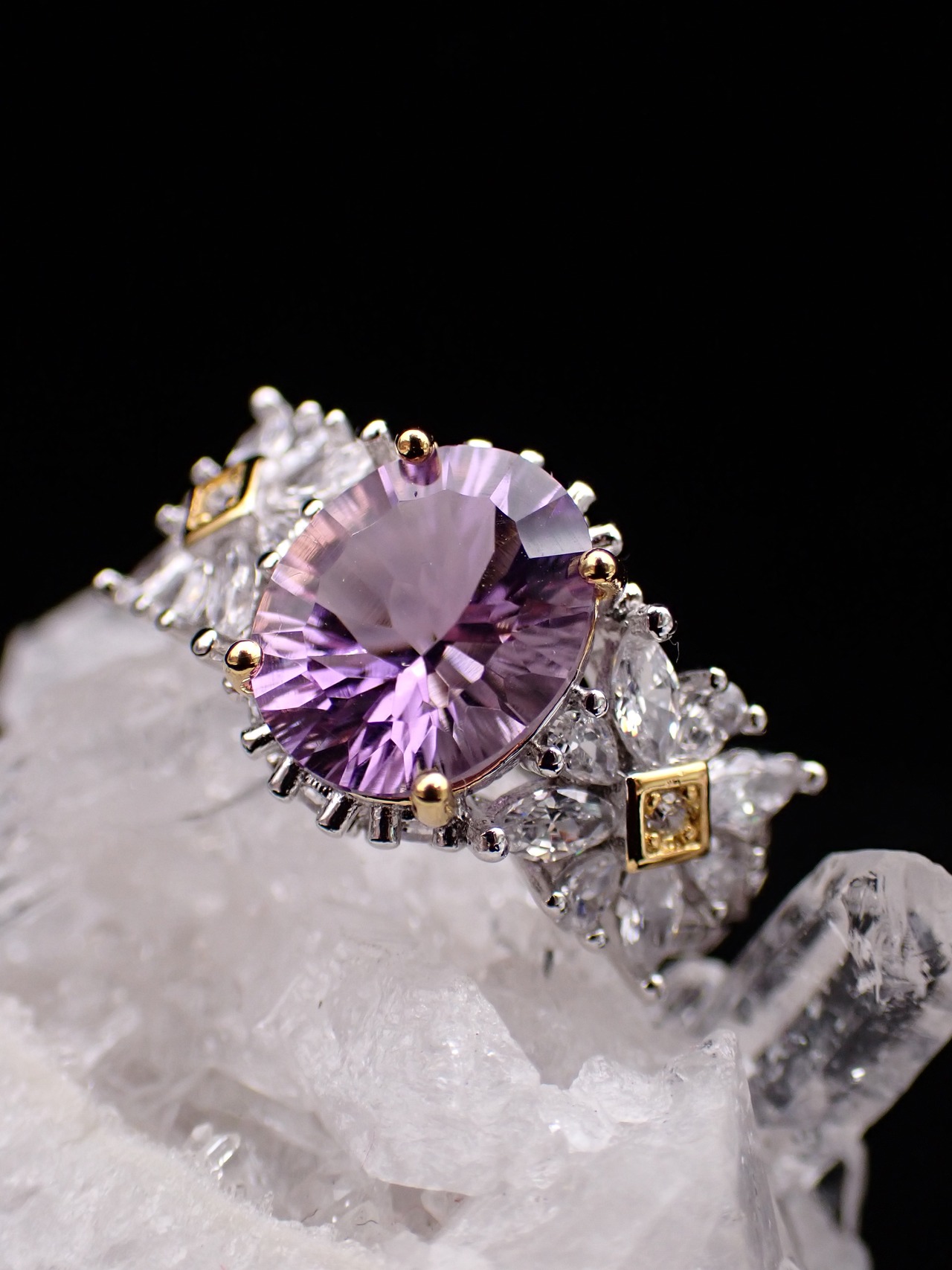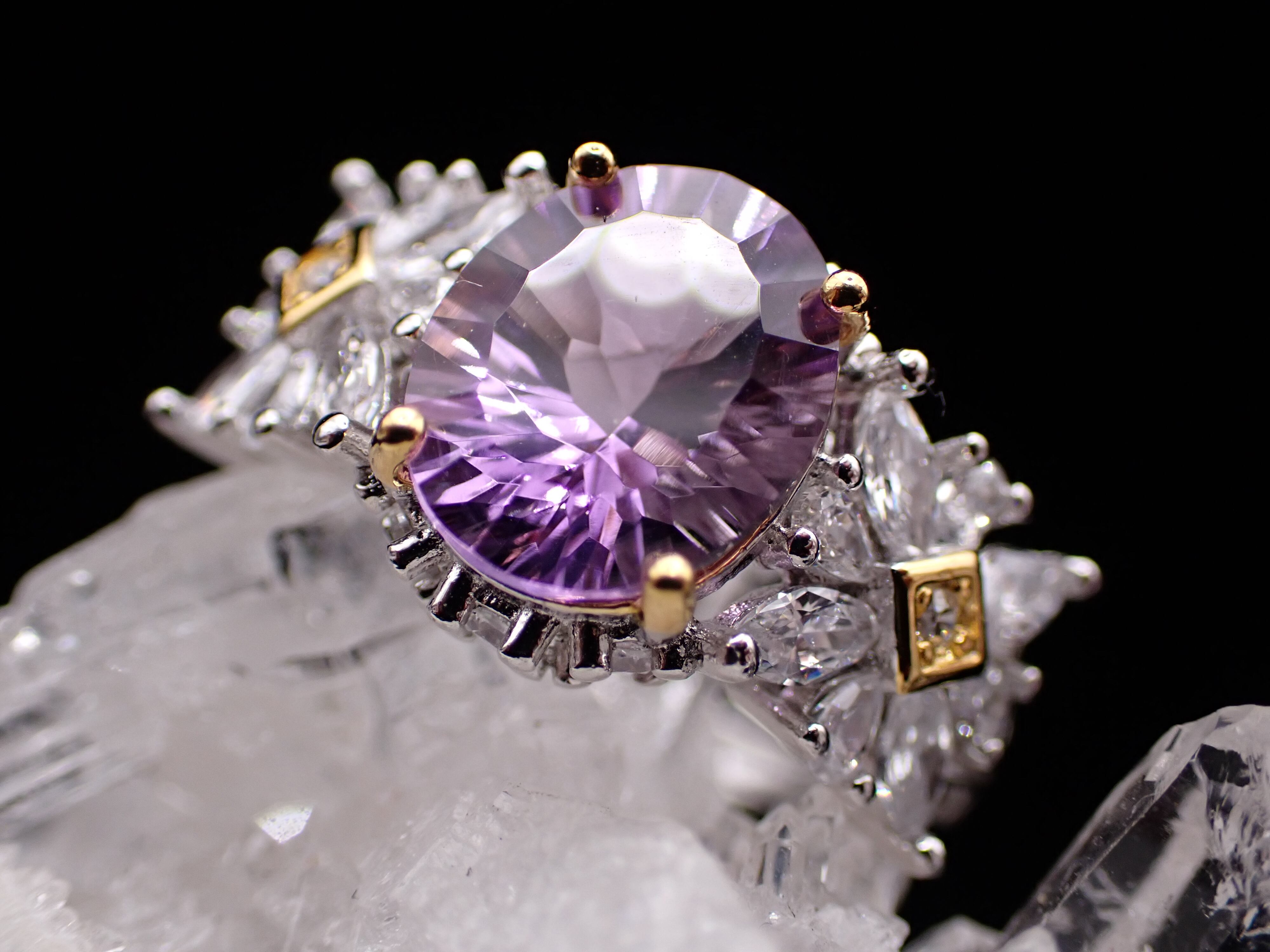 コンケーブカットが美しいアメジストを包み込んだリングです。