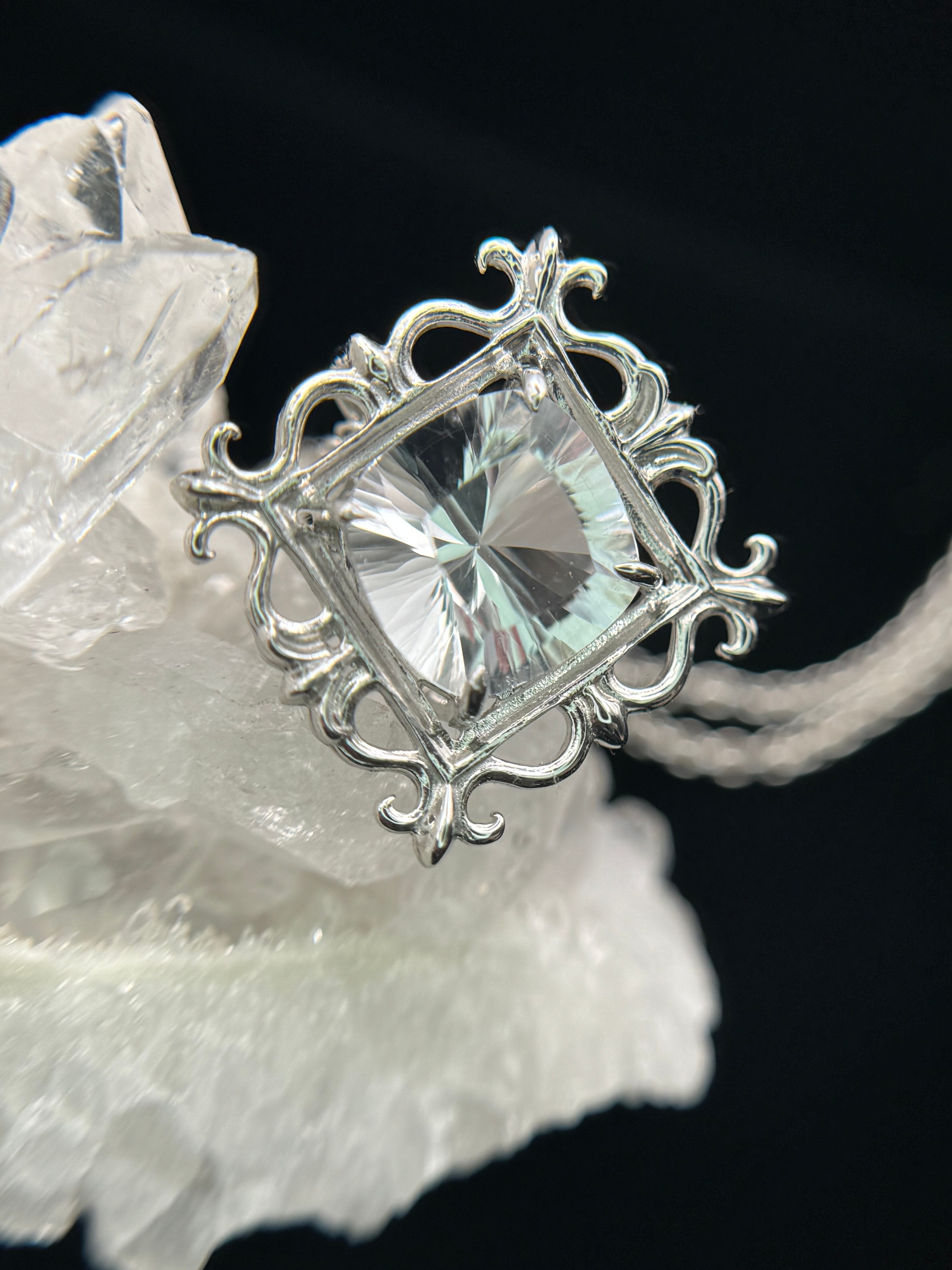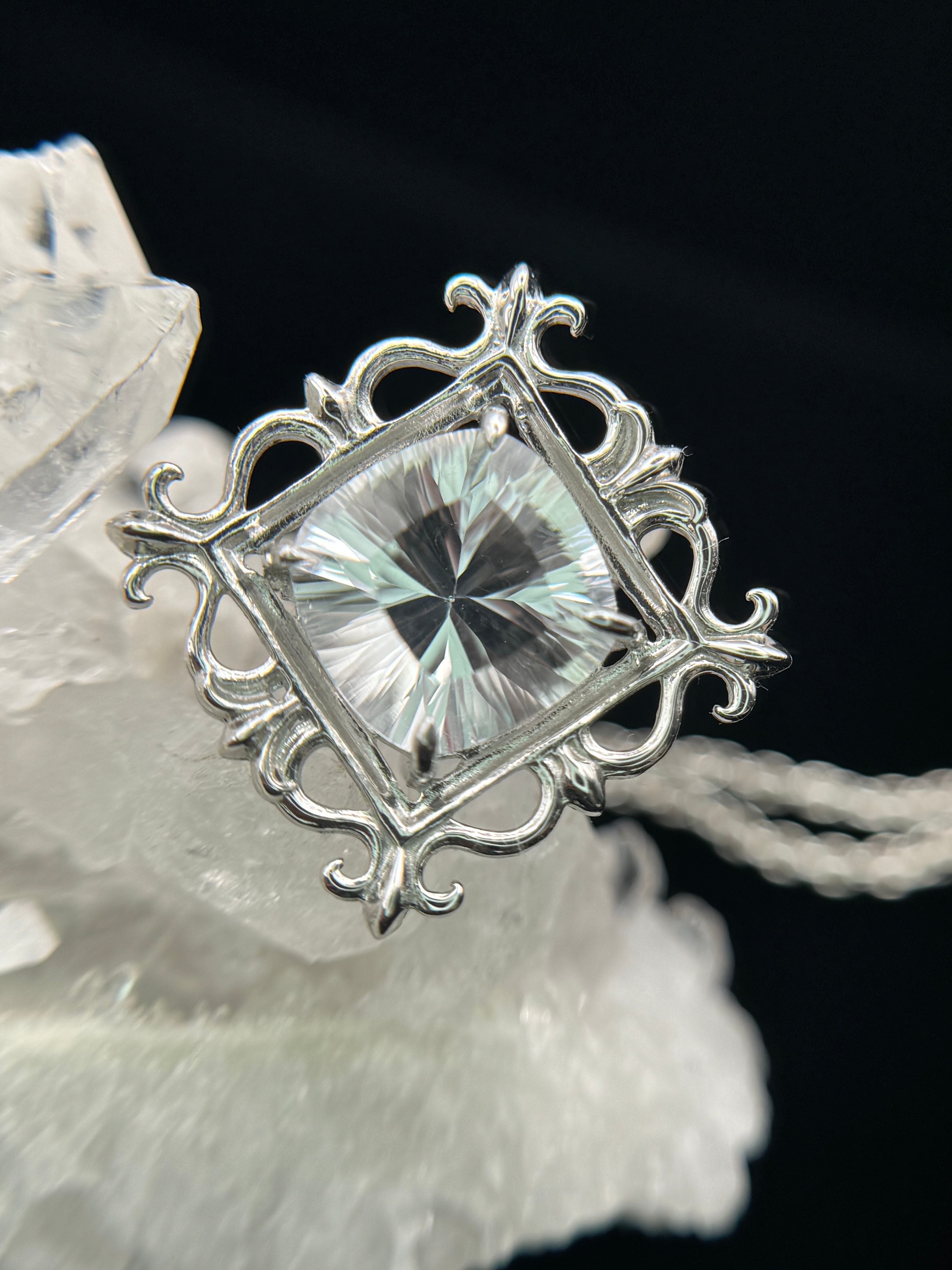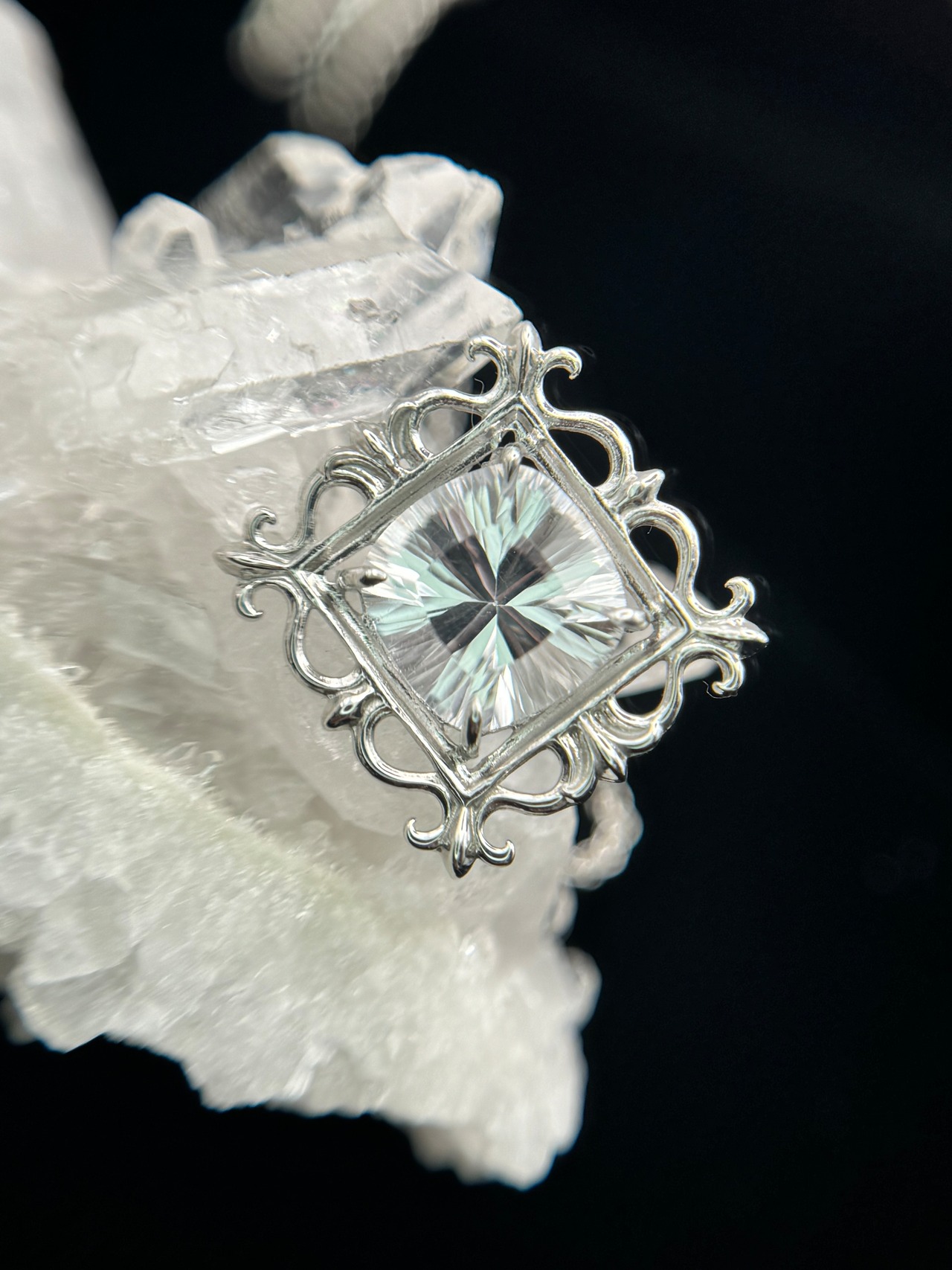 まるで石を絵画のように、美しい額縁の中へ、コンケーブカットのホワイトトパーズを納めました。