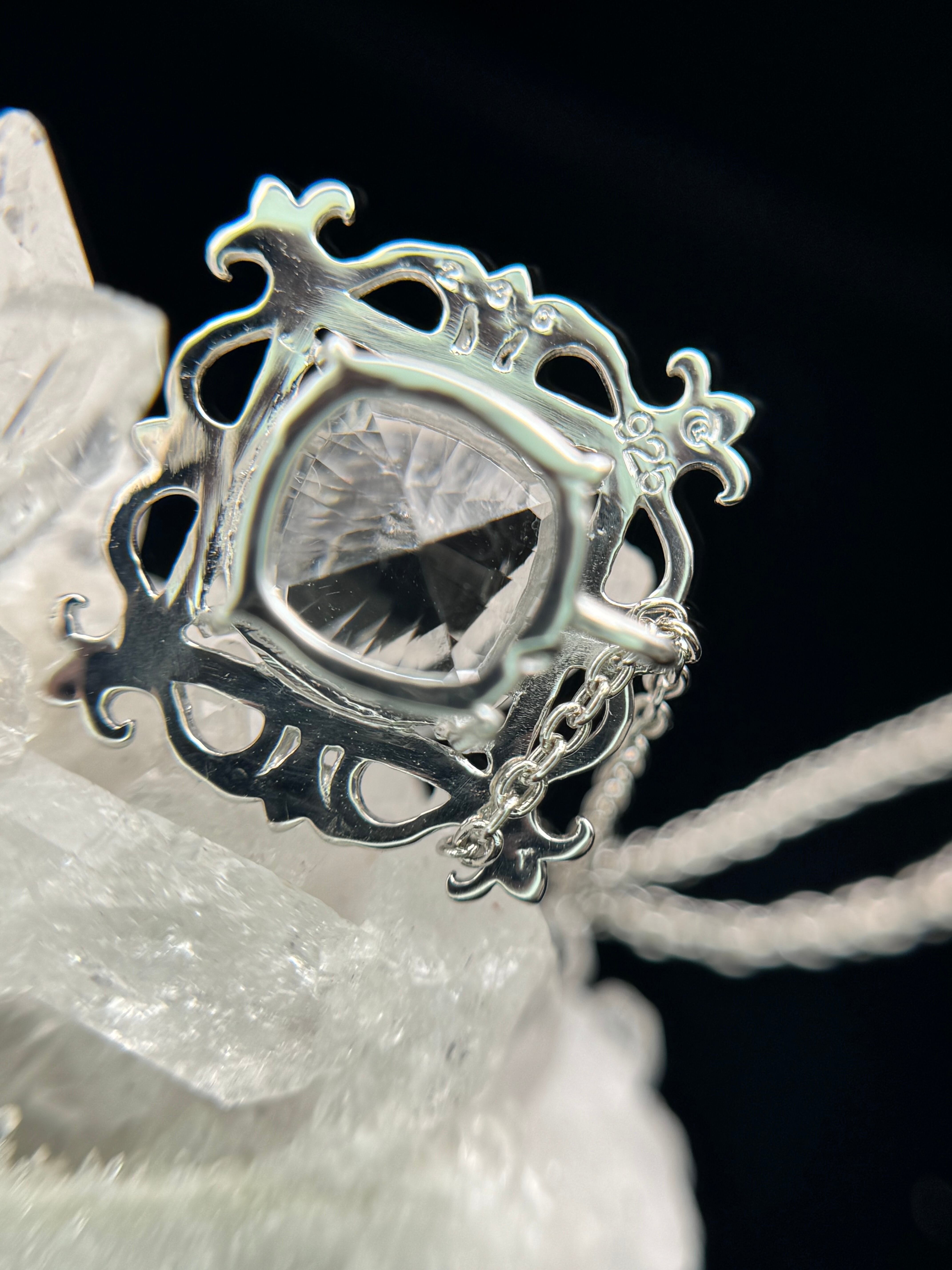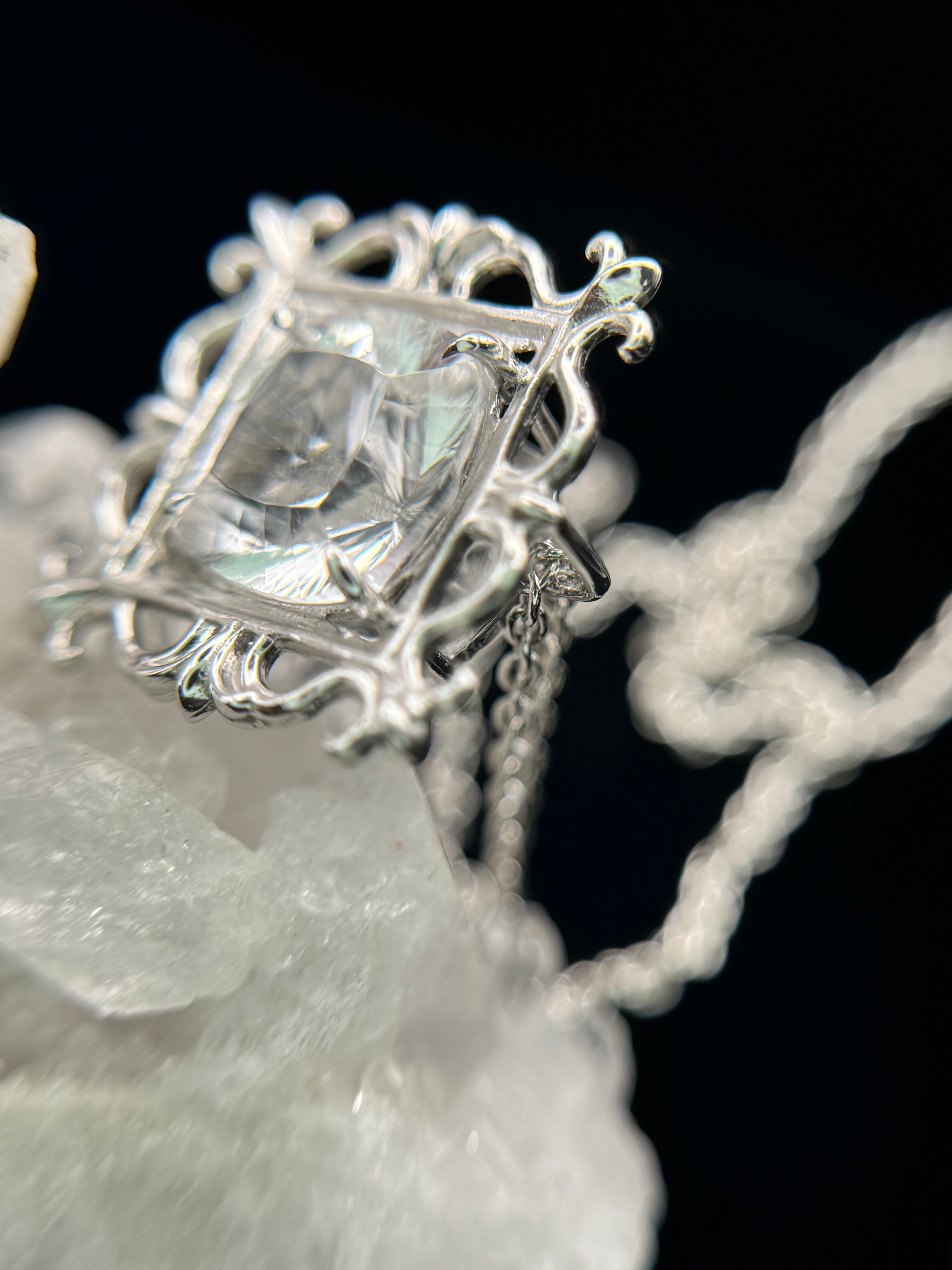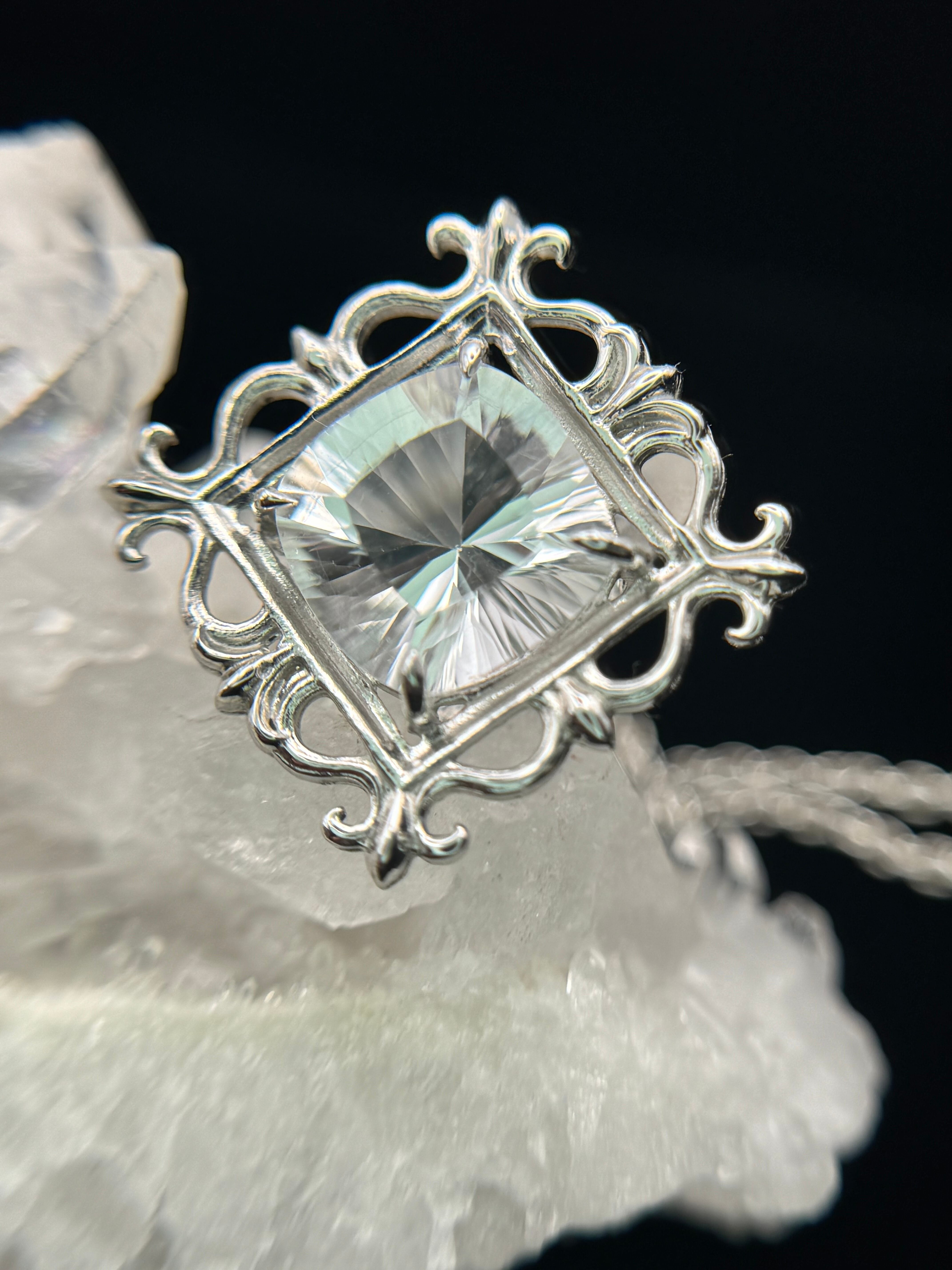 まるで石を絵画のように、美しい額縁の中へ、コンケーブカットのホワイトトパーズを納めました。