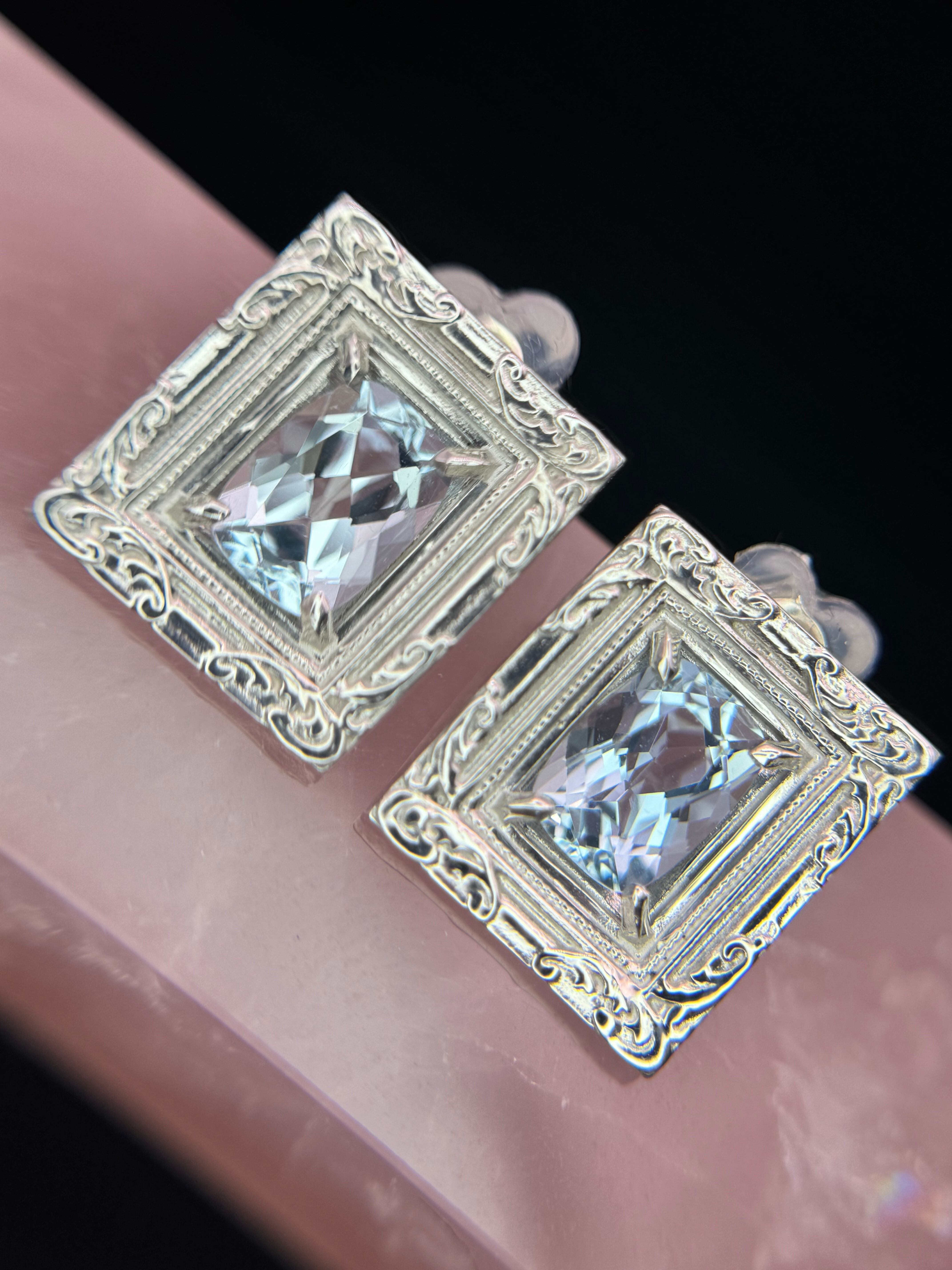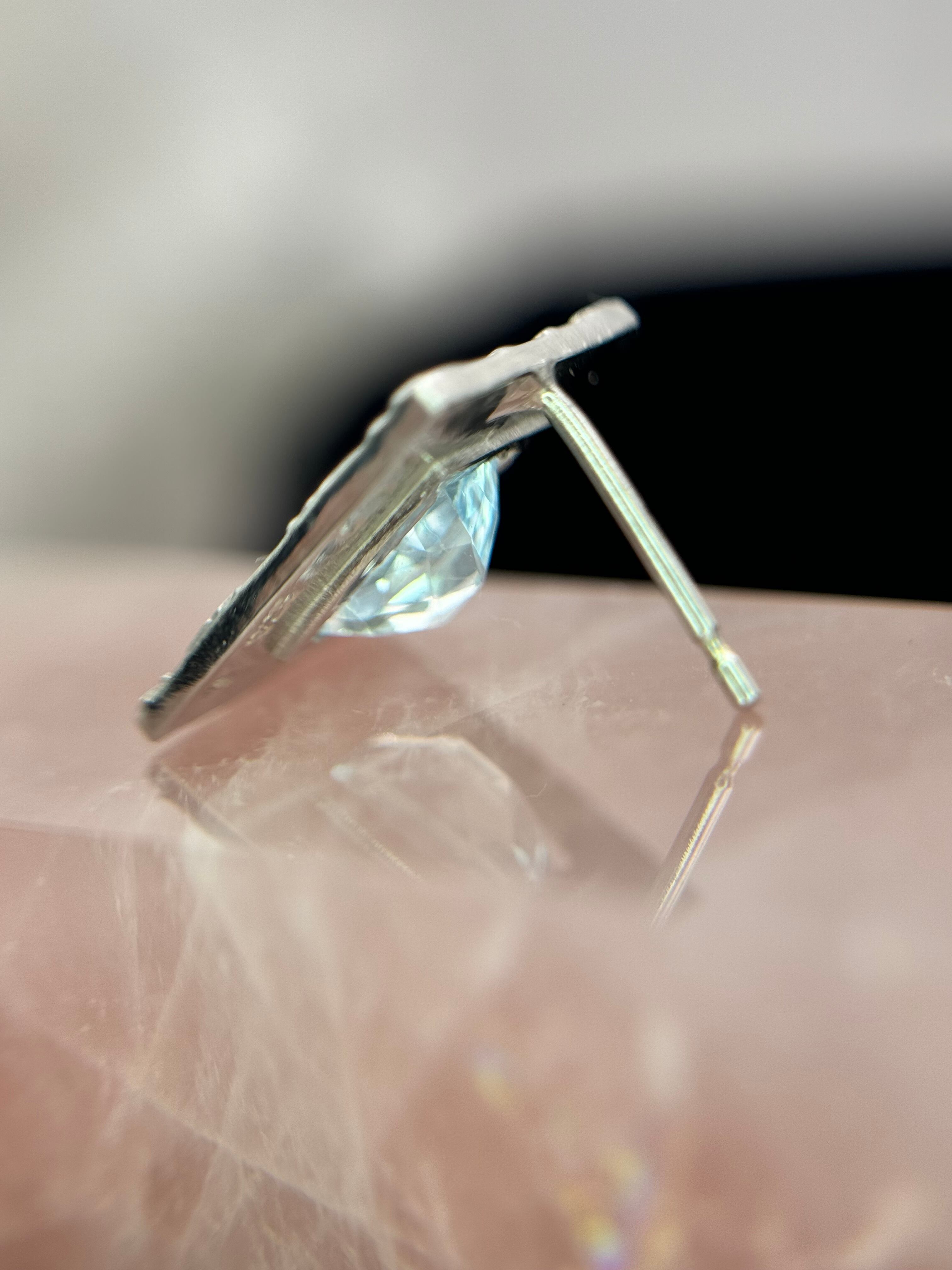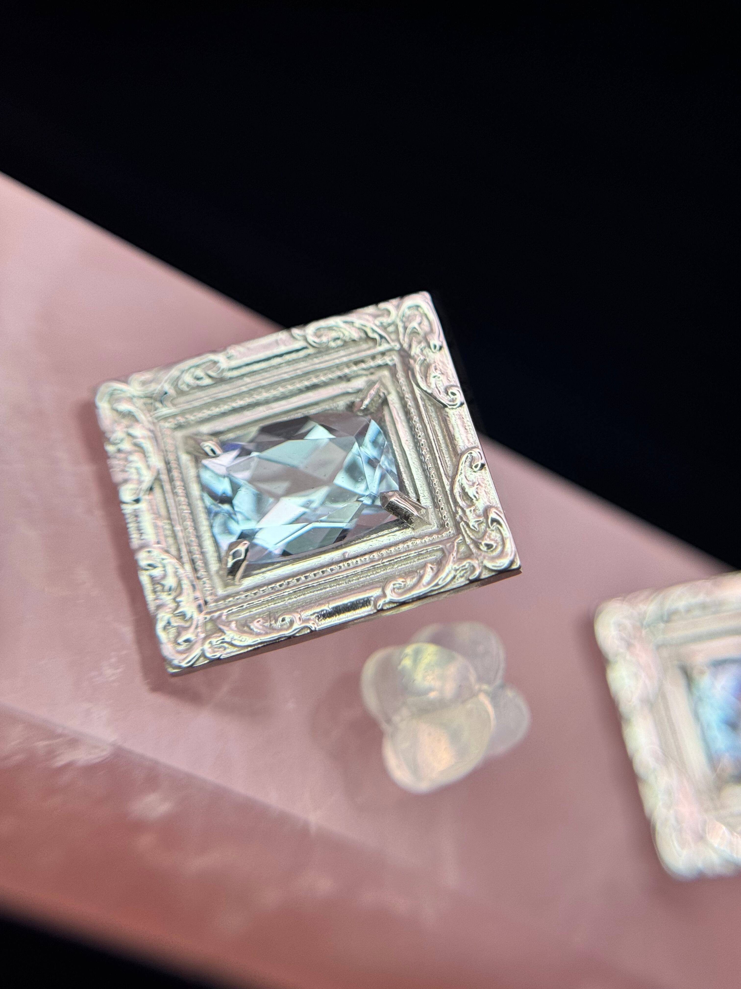 額縁の裏側はフラットにし、石が存分に光を蓄えながらも軽く着け心地がよいピアスとなっています。