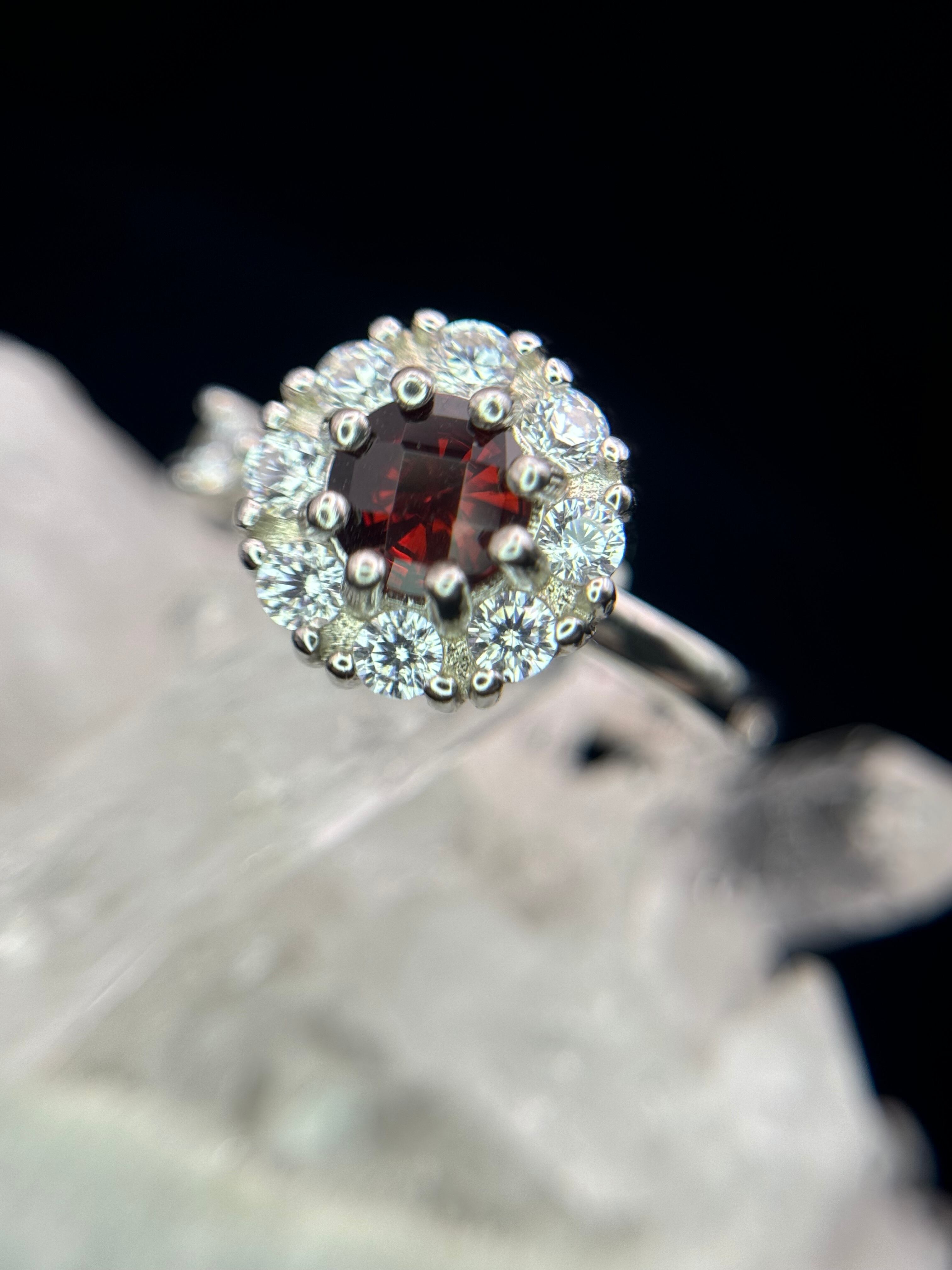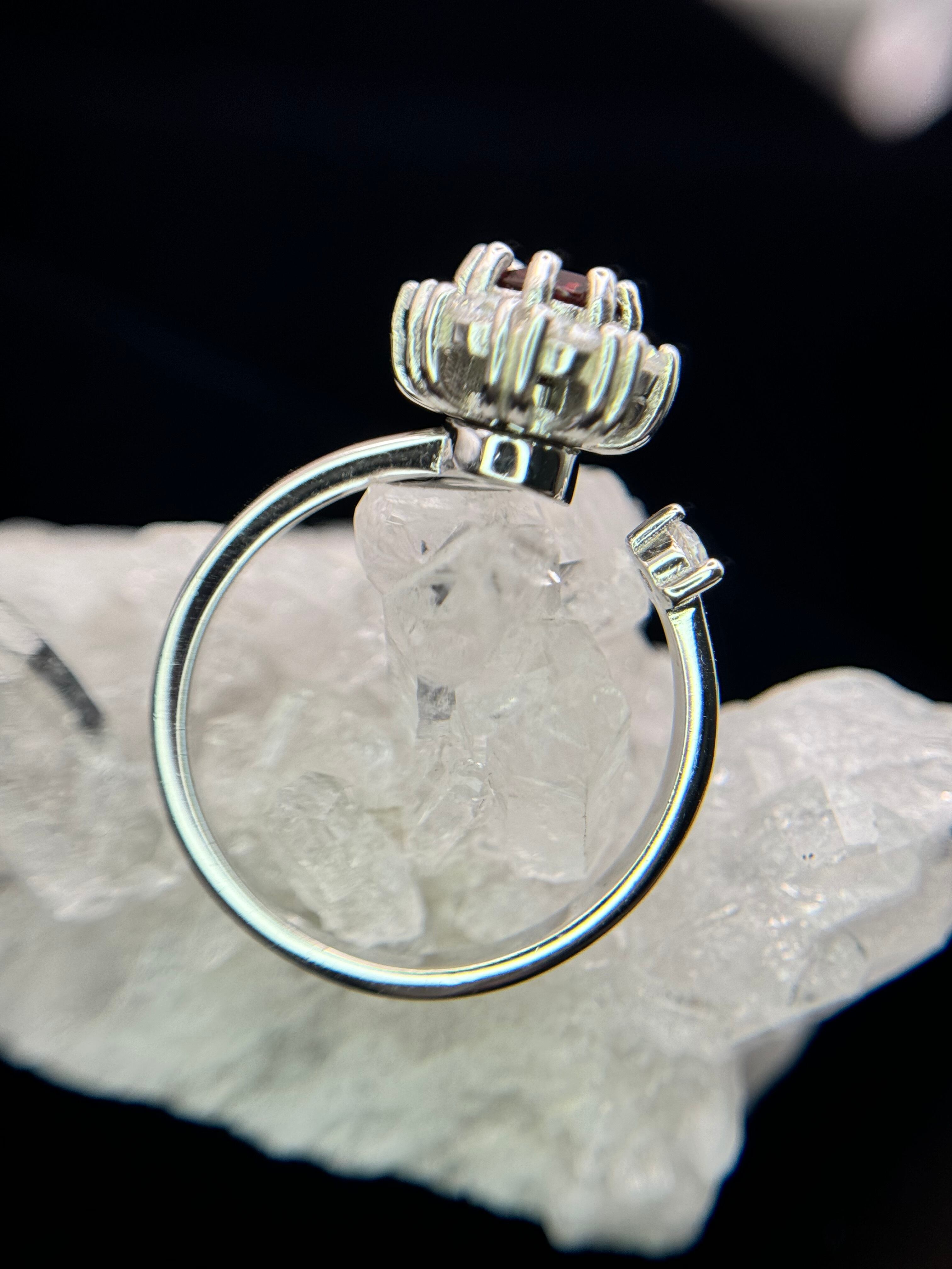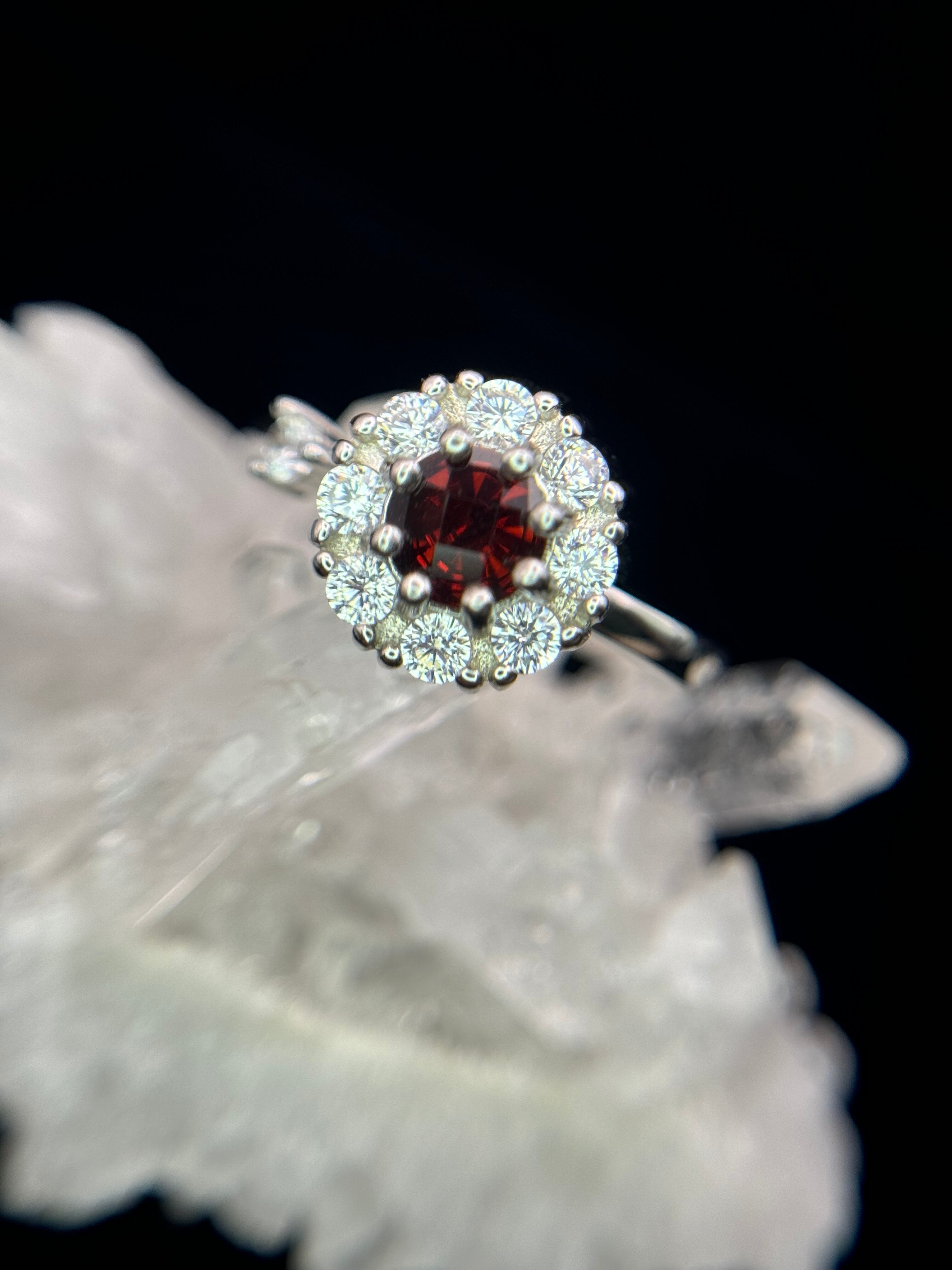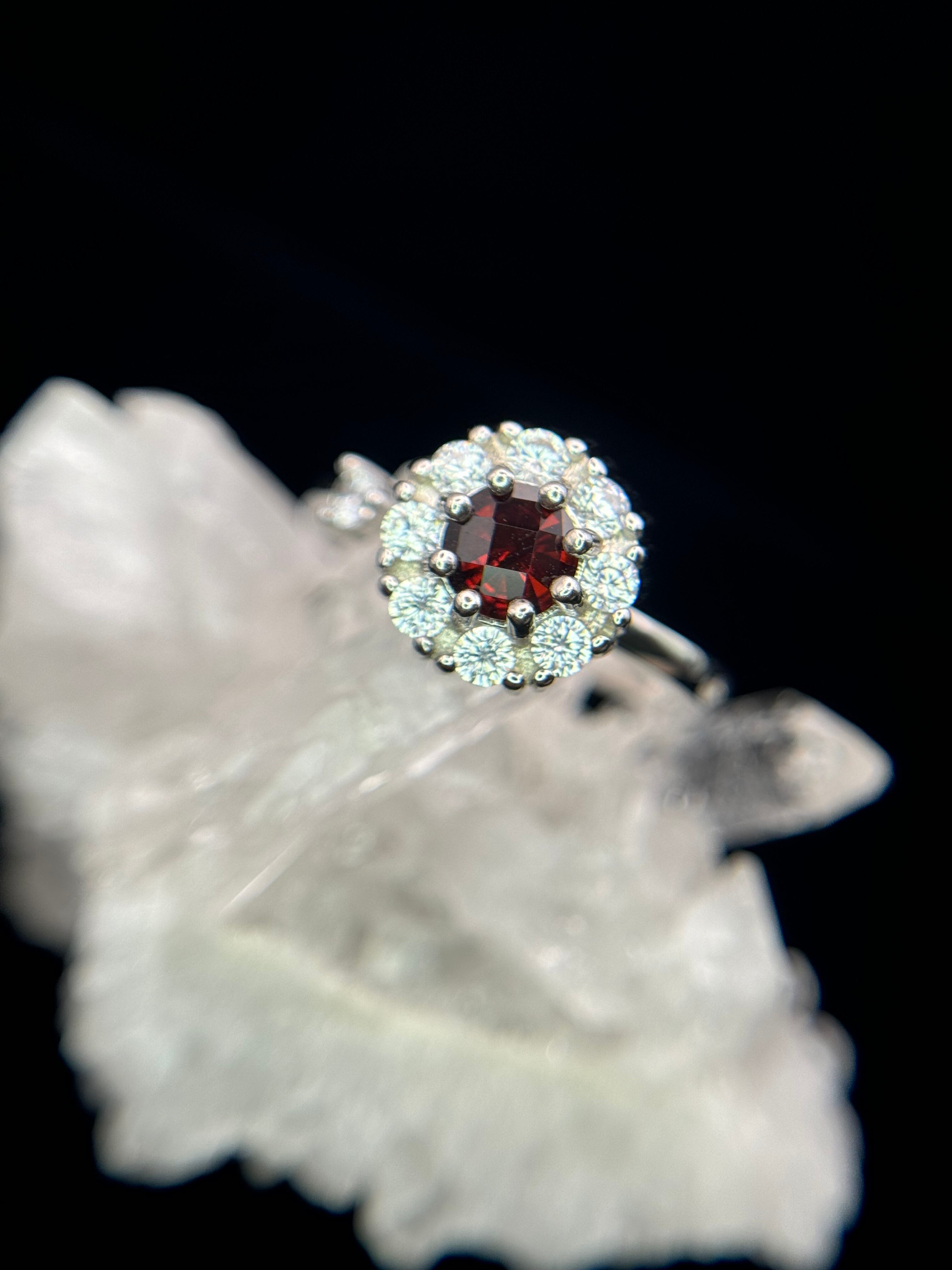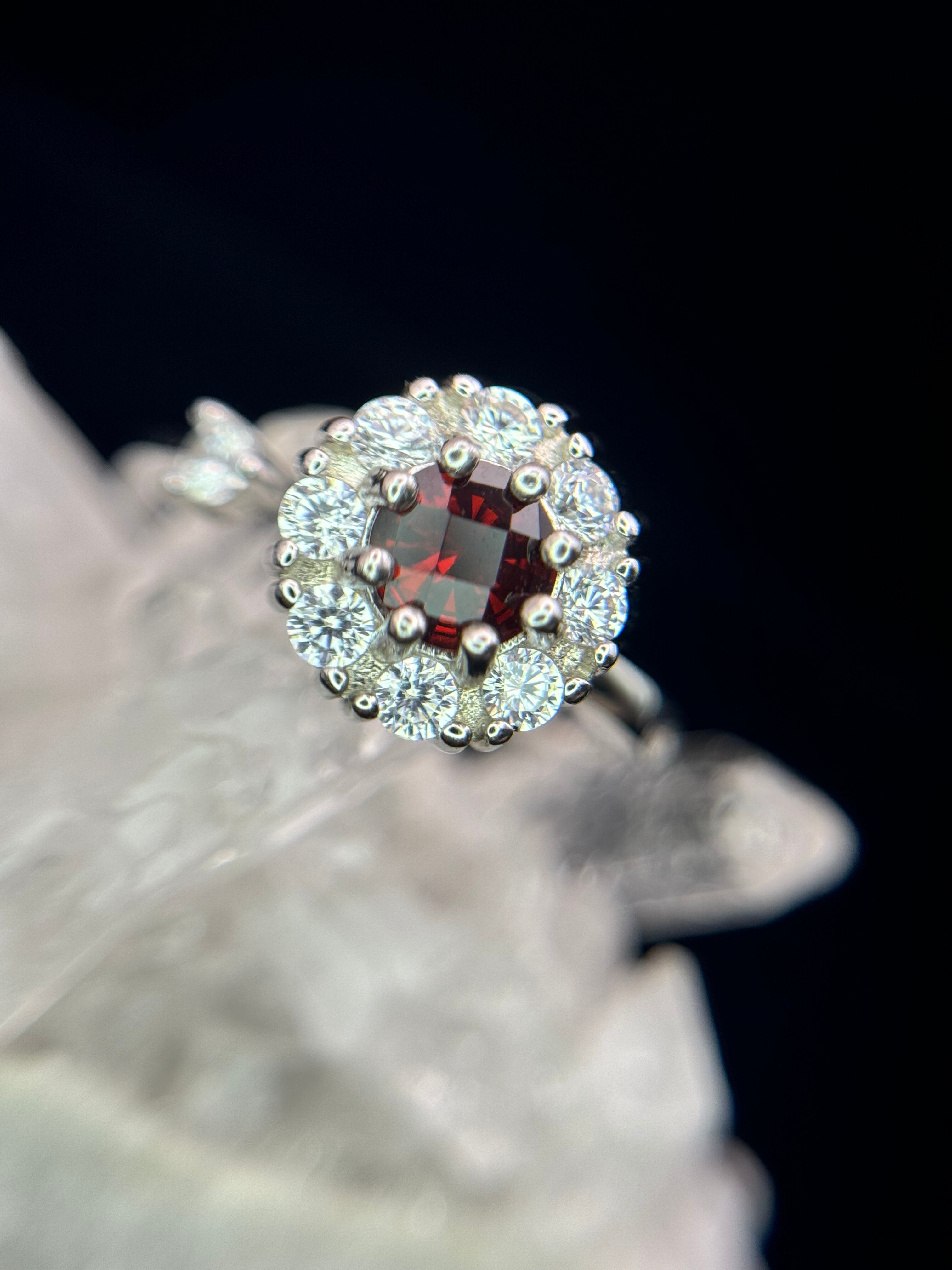中央にはチェッカーカットが美しいガーネットが輝きます。