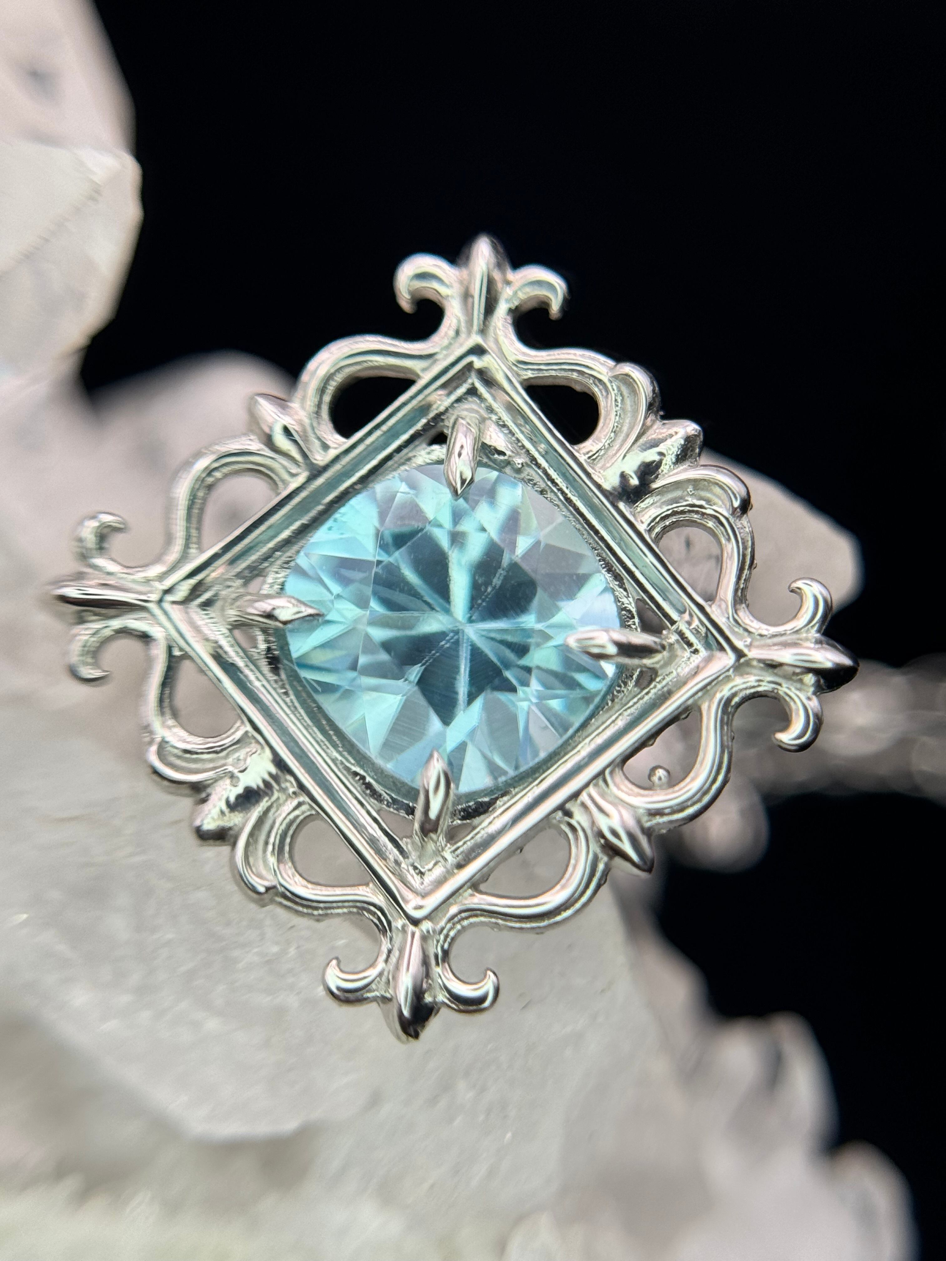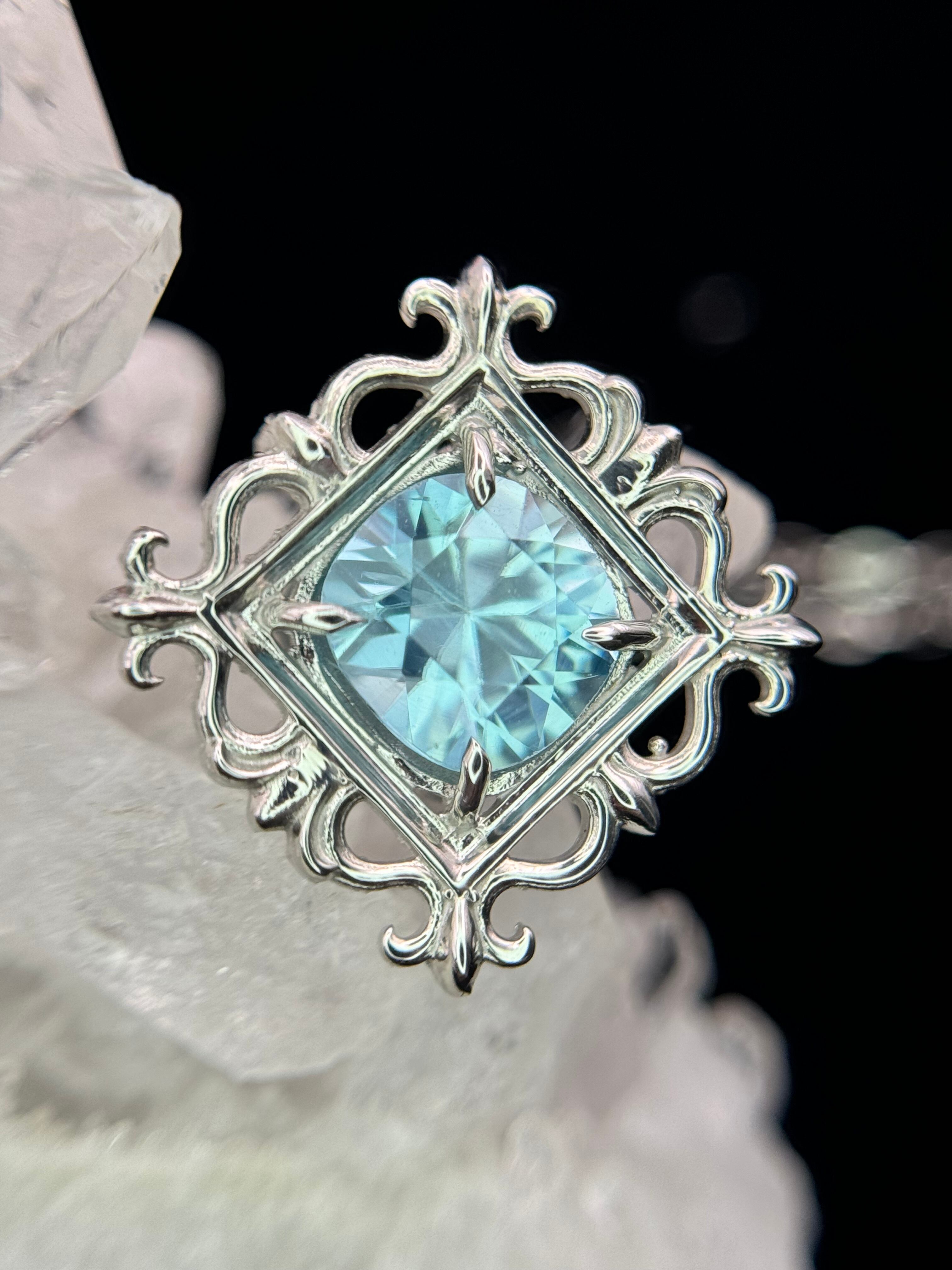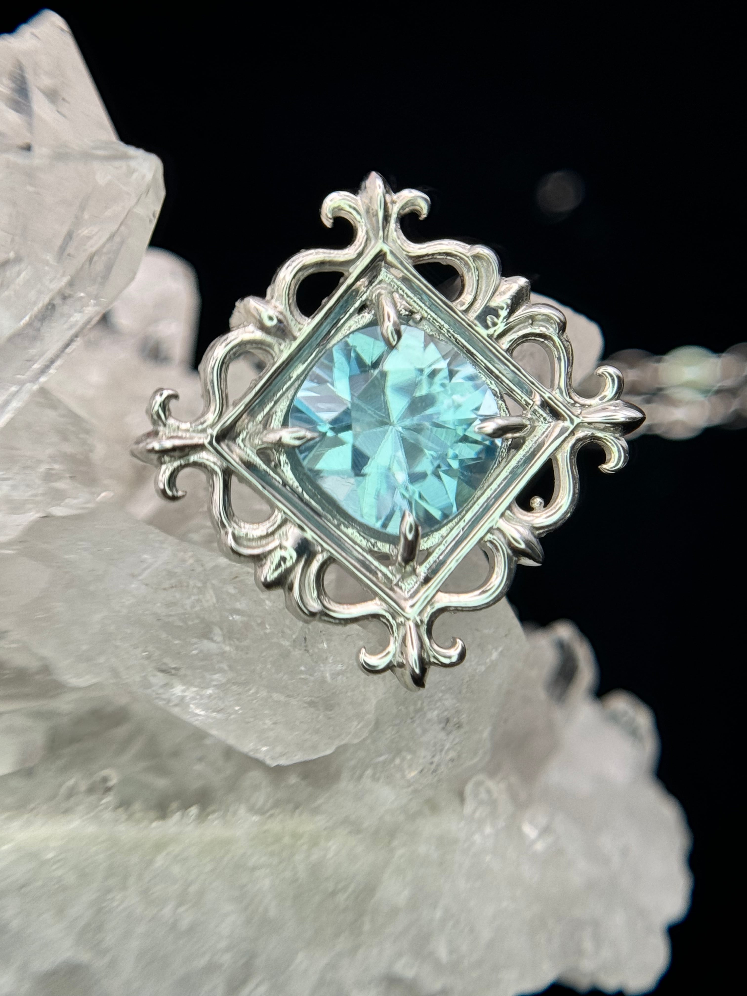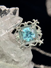 まるで石を絵画のように、美しい額縁の中へ、ブルージルコンを納めました。