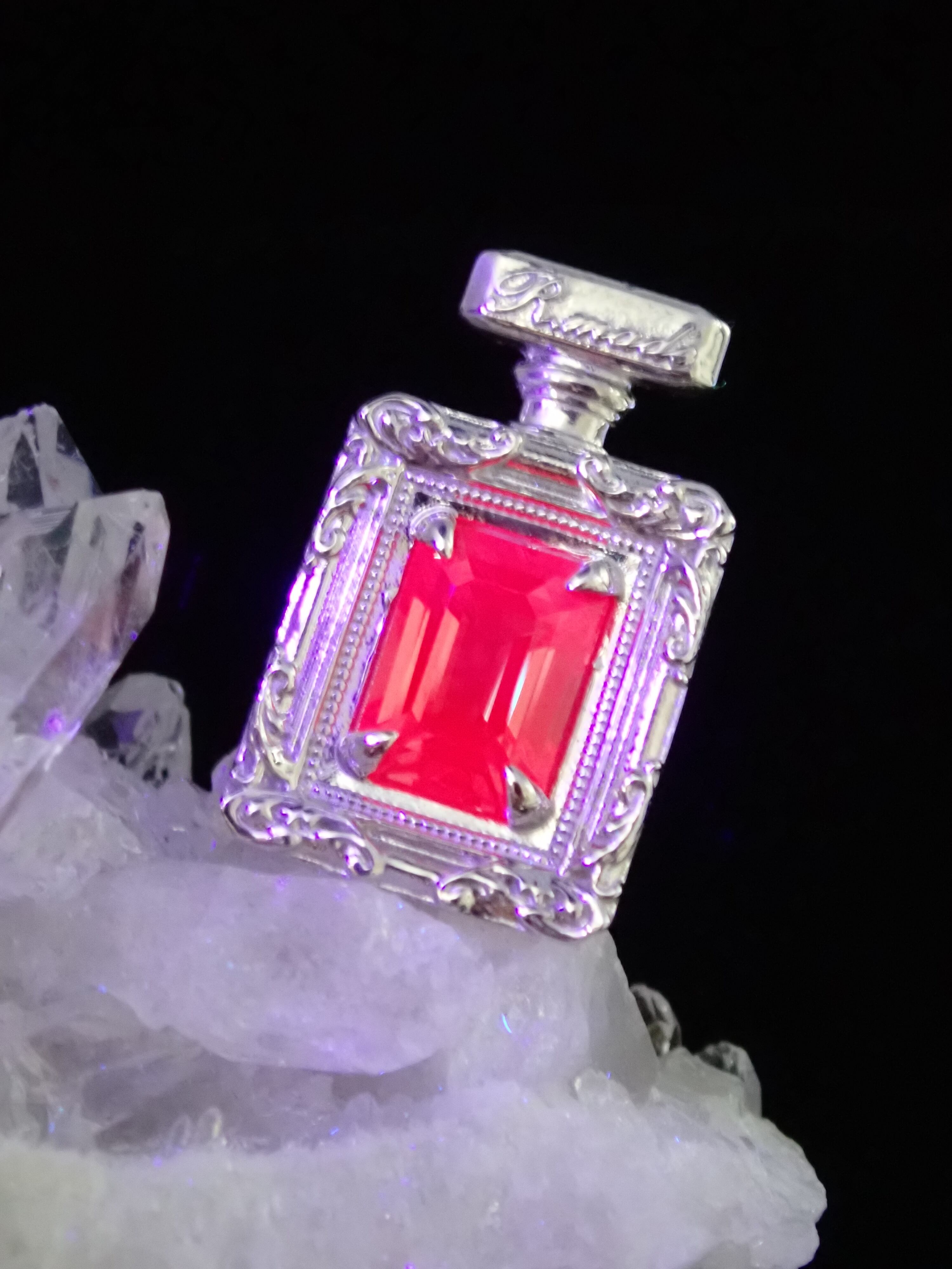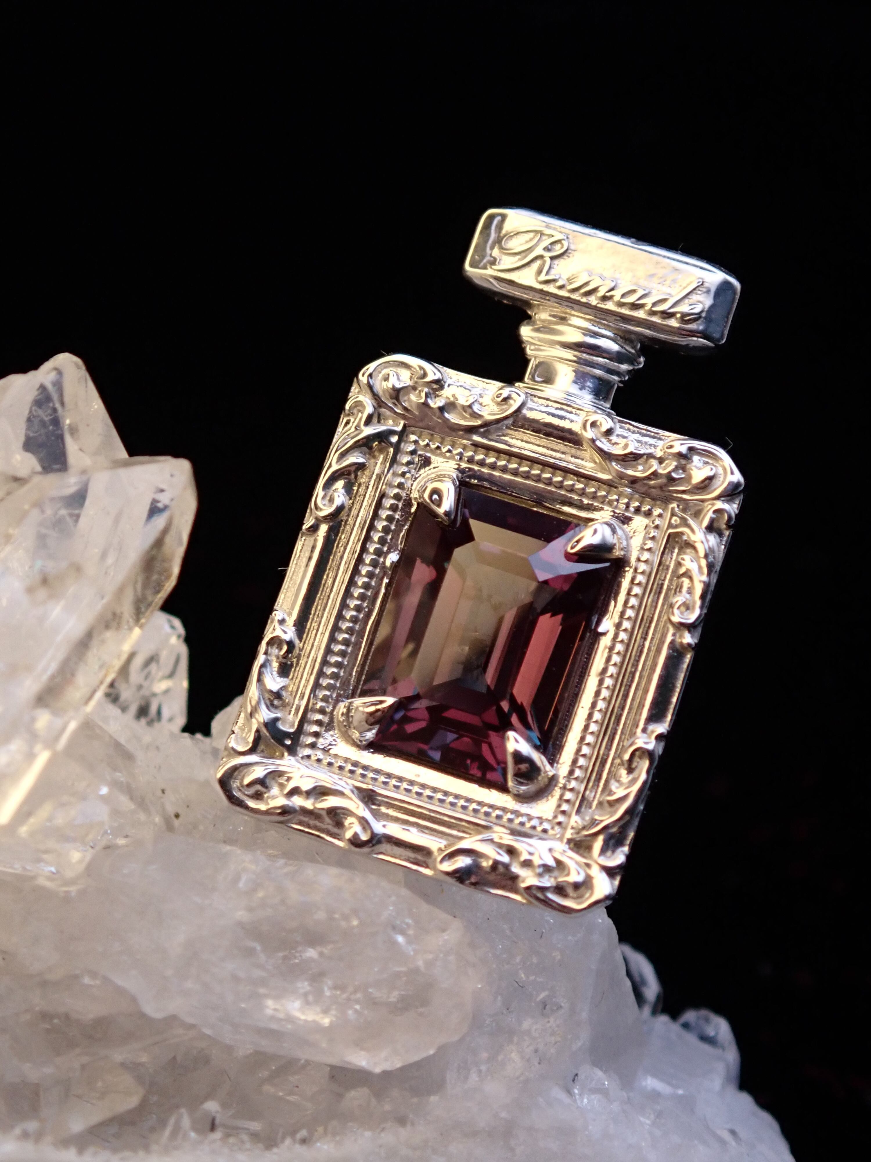 アール・ヌーヴォーシリーズの中でも人気の額縁デザインを元に、芳しい香りのしてきそうな香水瓶の中へ石を納めました。