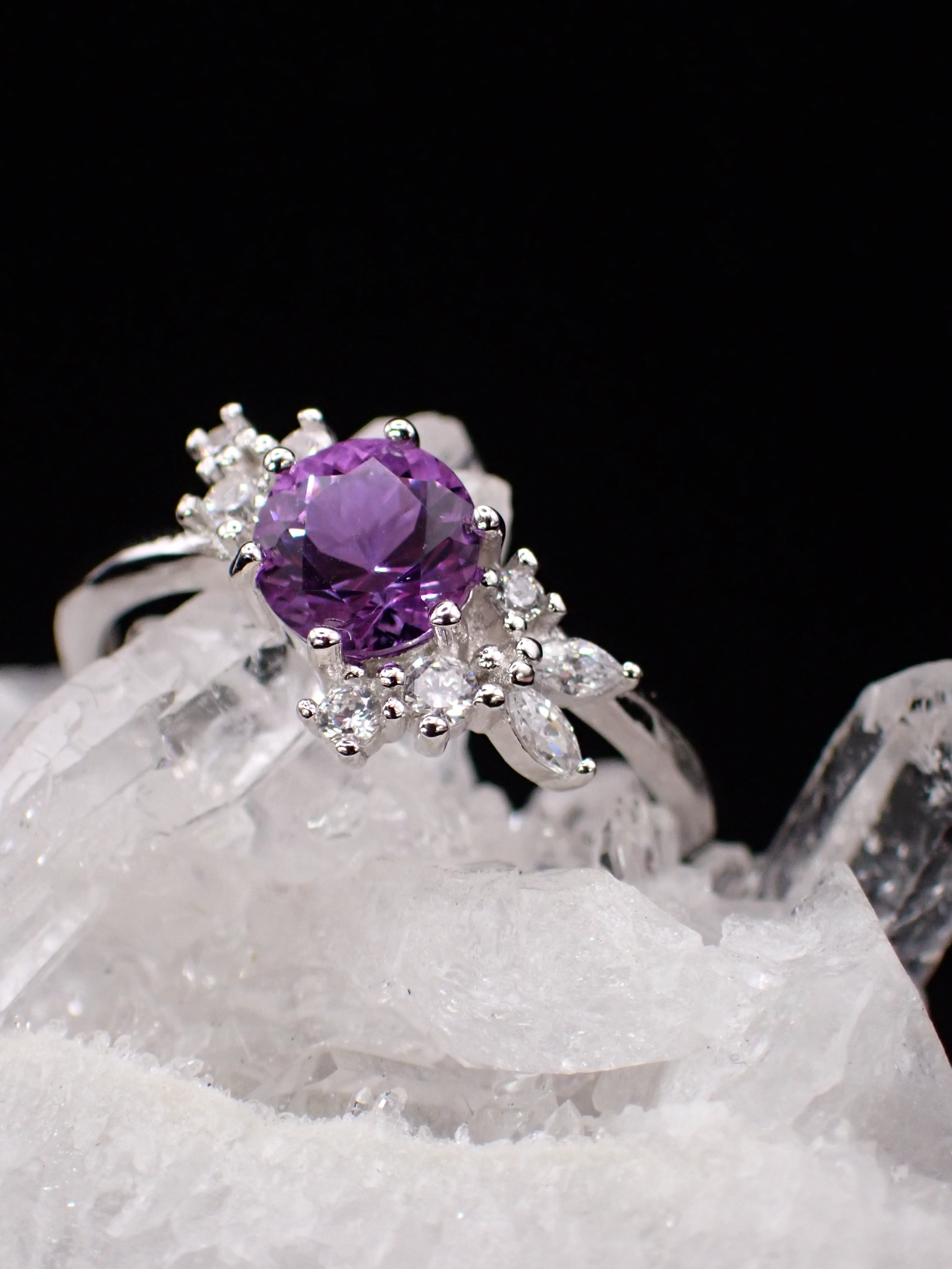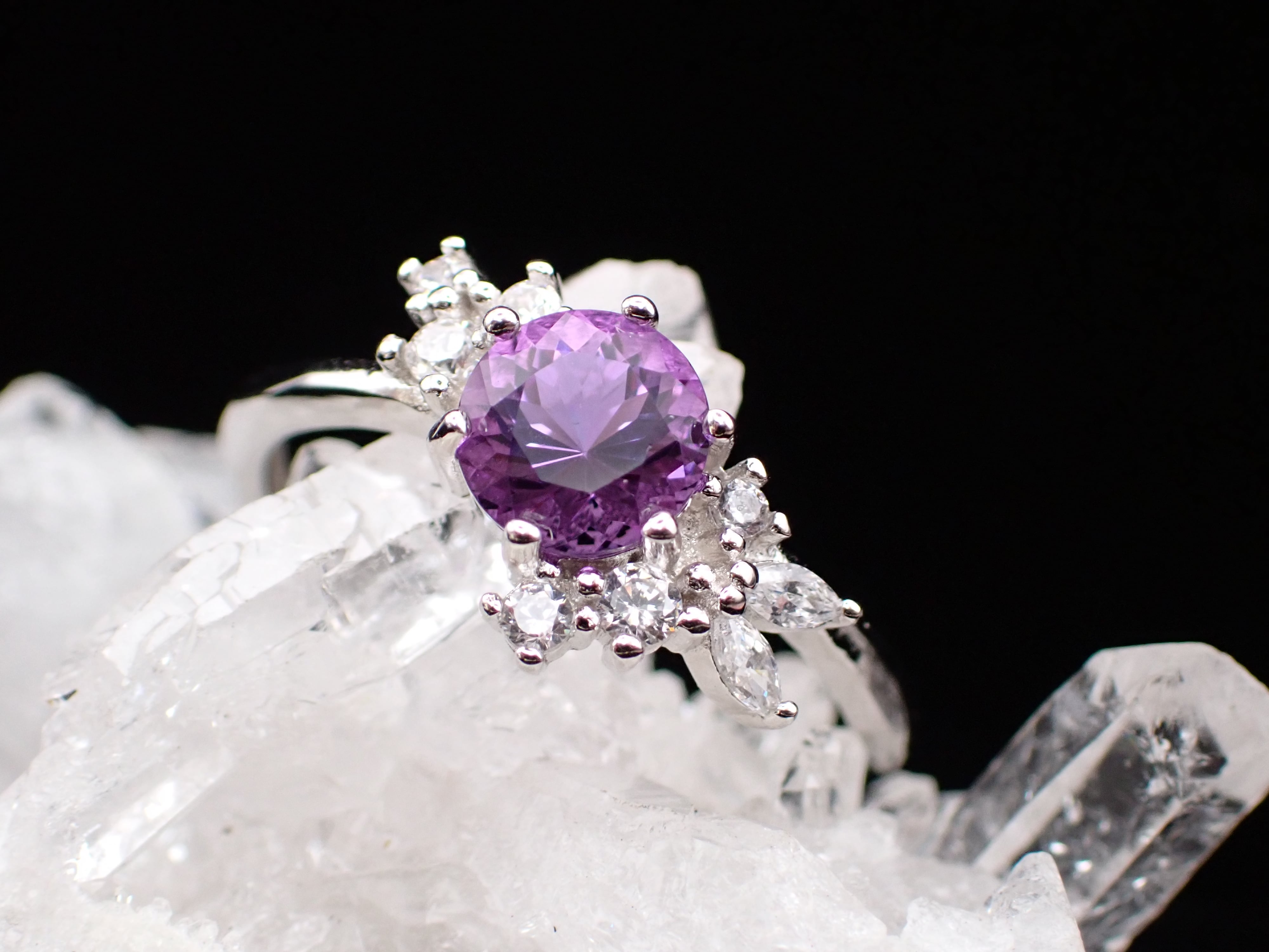 花束のように並んだ小さなジルコニアたちが、カラーシフトが美しいザンドライトガラスをさらに輝かせる繊細なリングです。