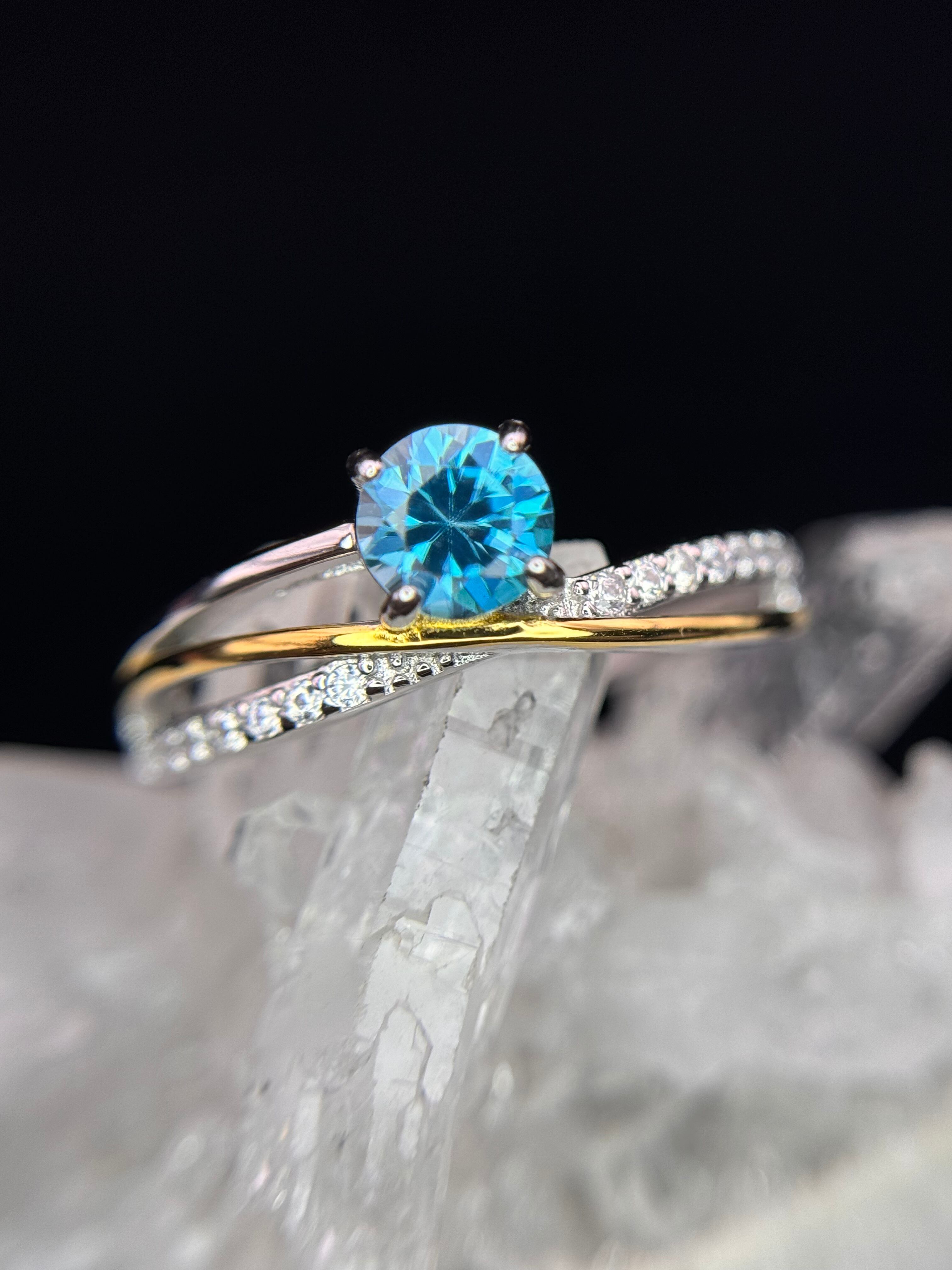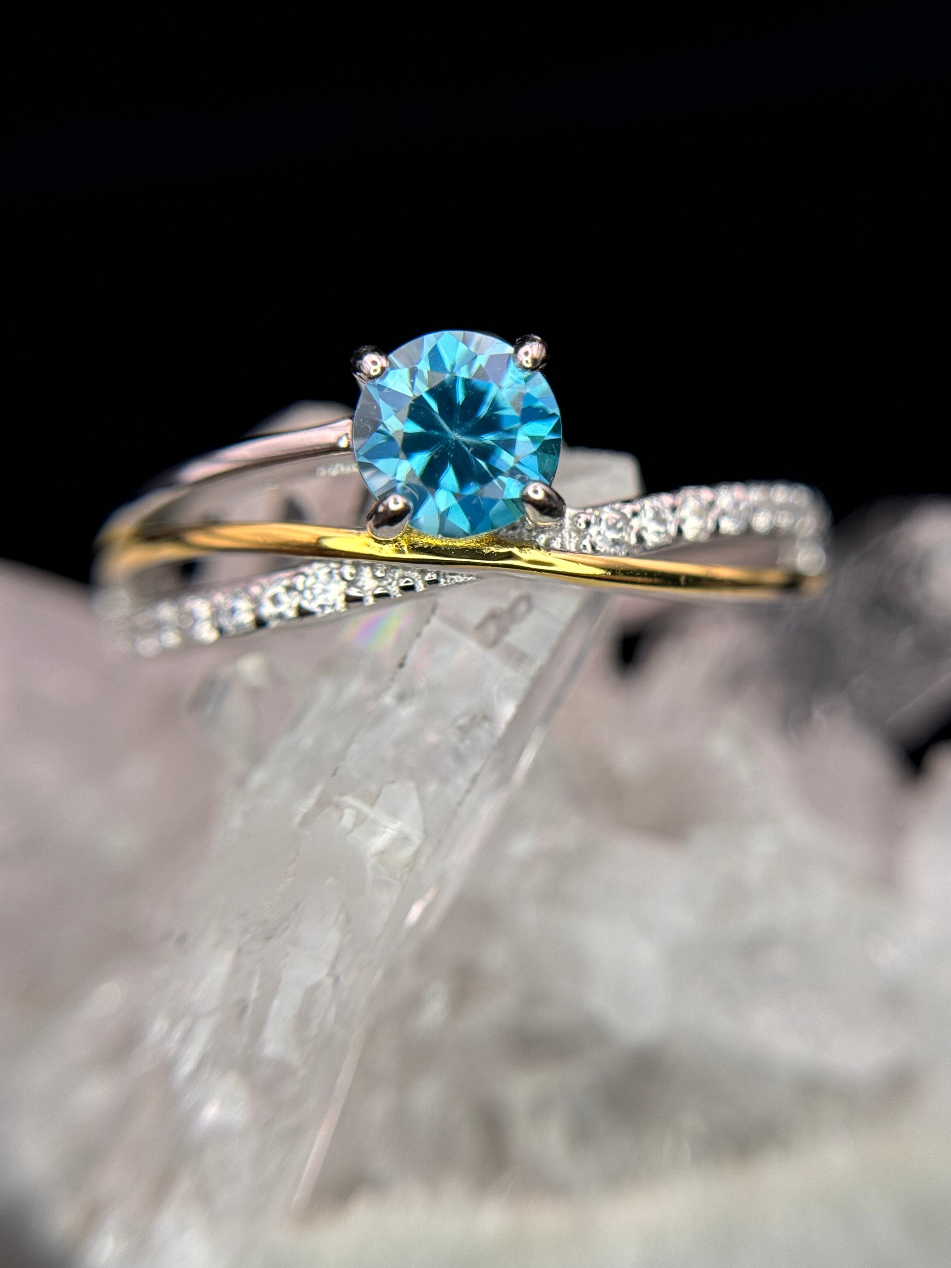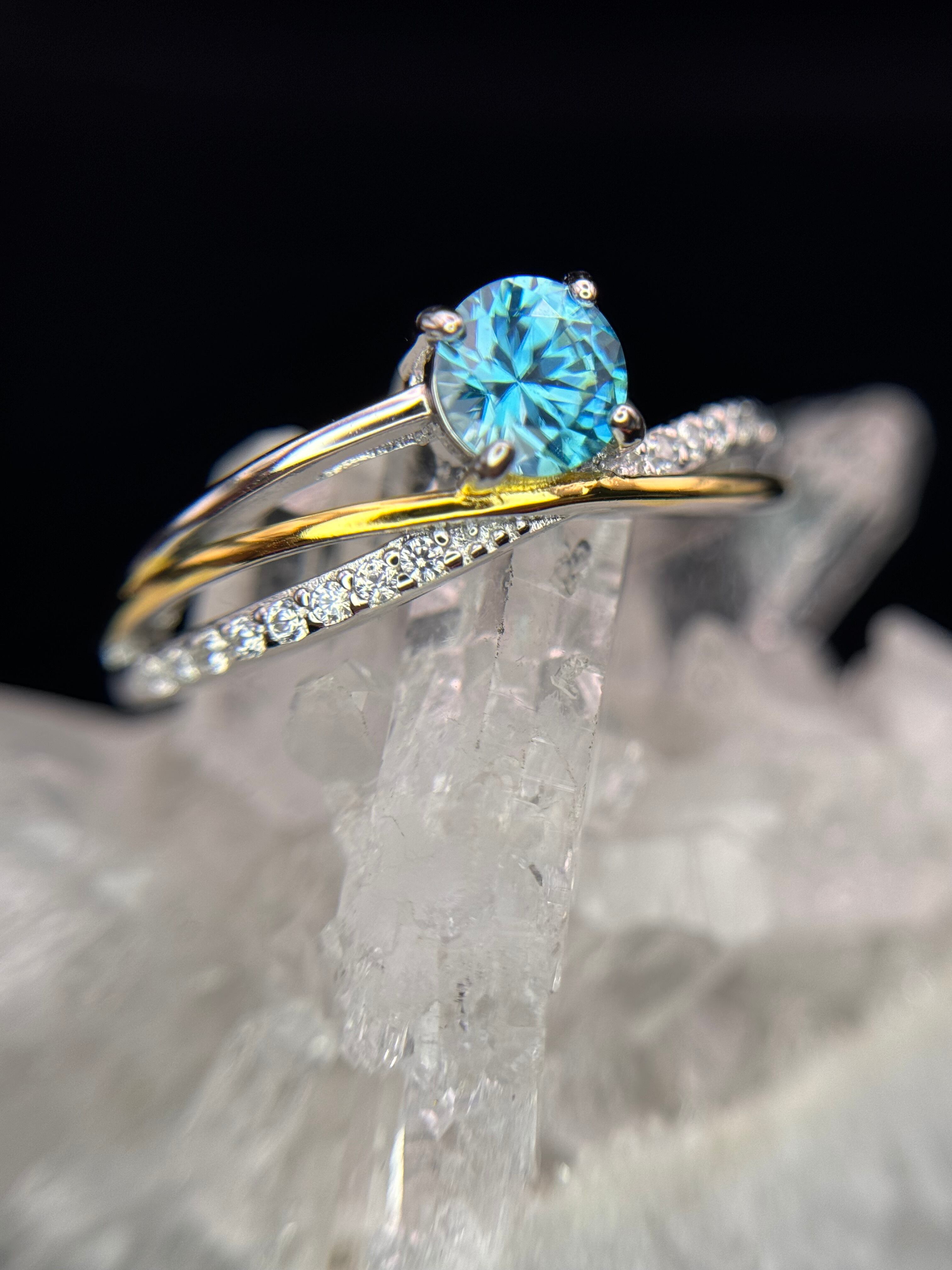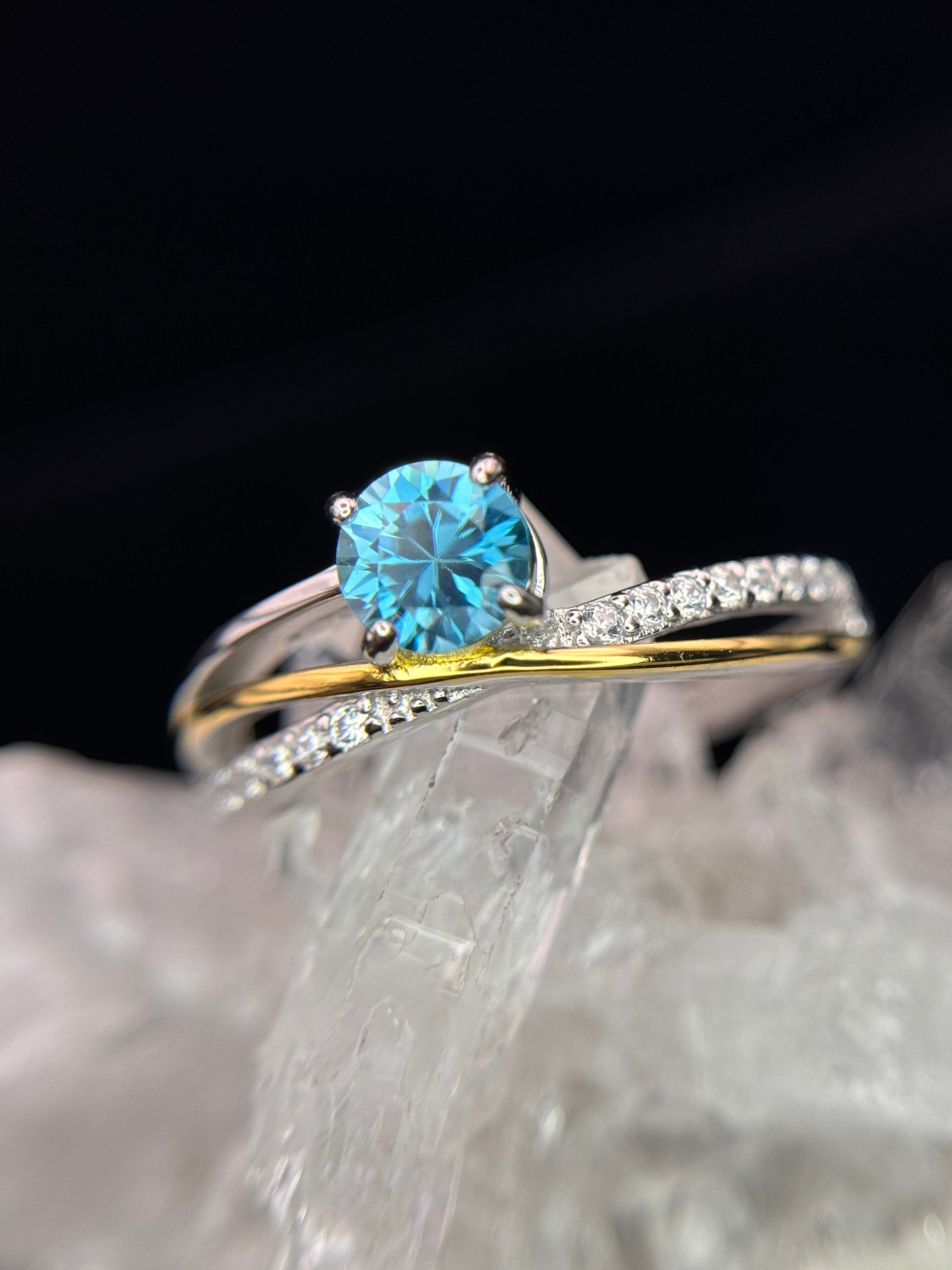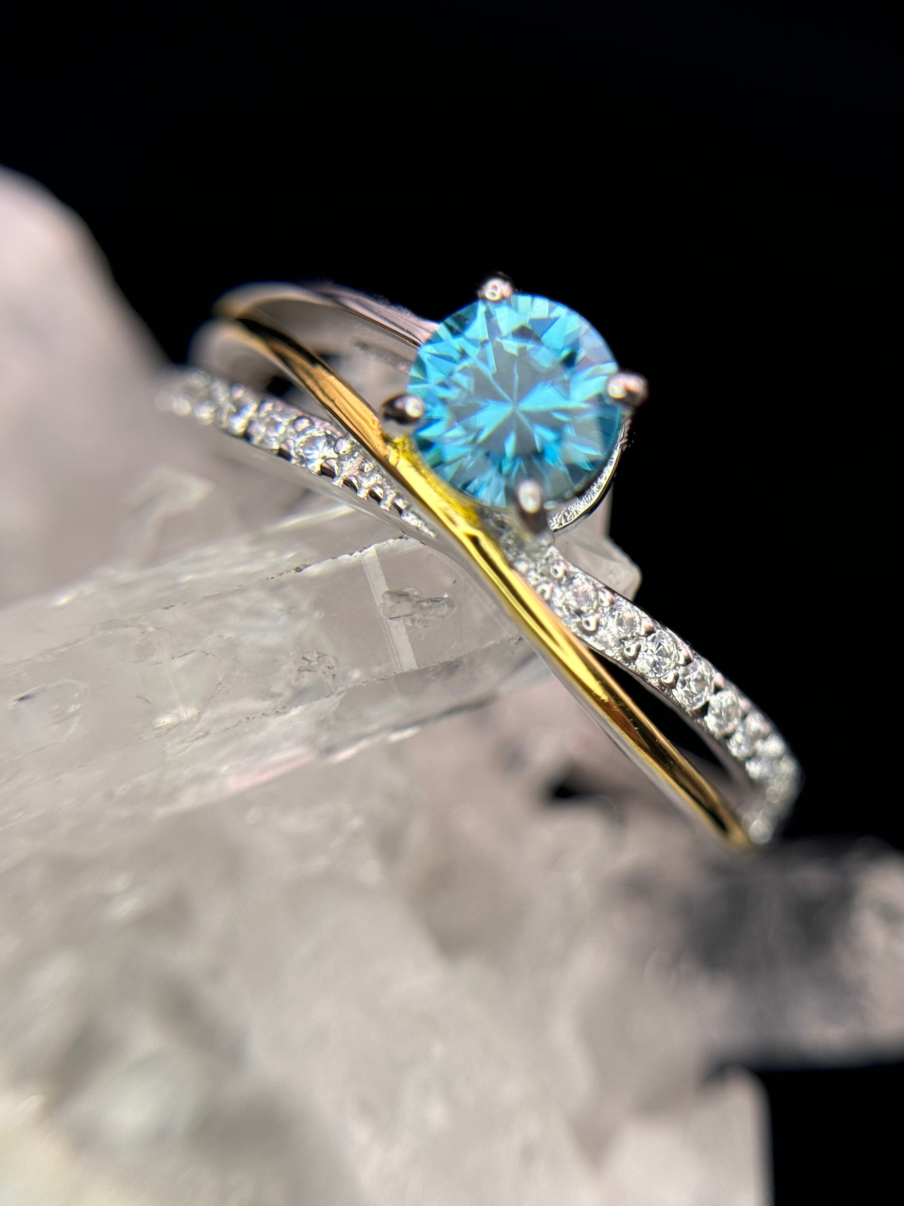 流れるようなゴールドとシルバーが交差する中央に、5mmUPのラタナキリブルージルコンが鎮座します。