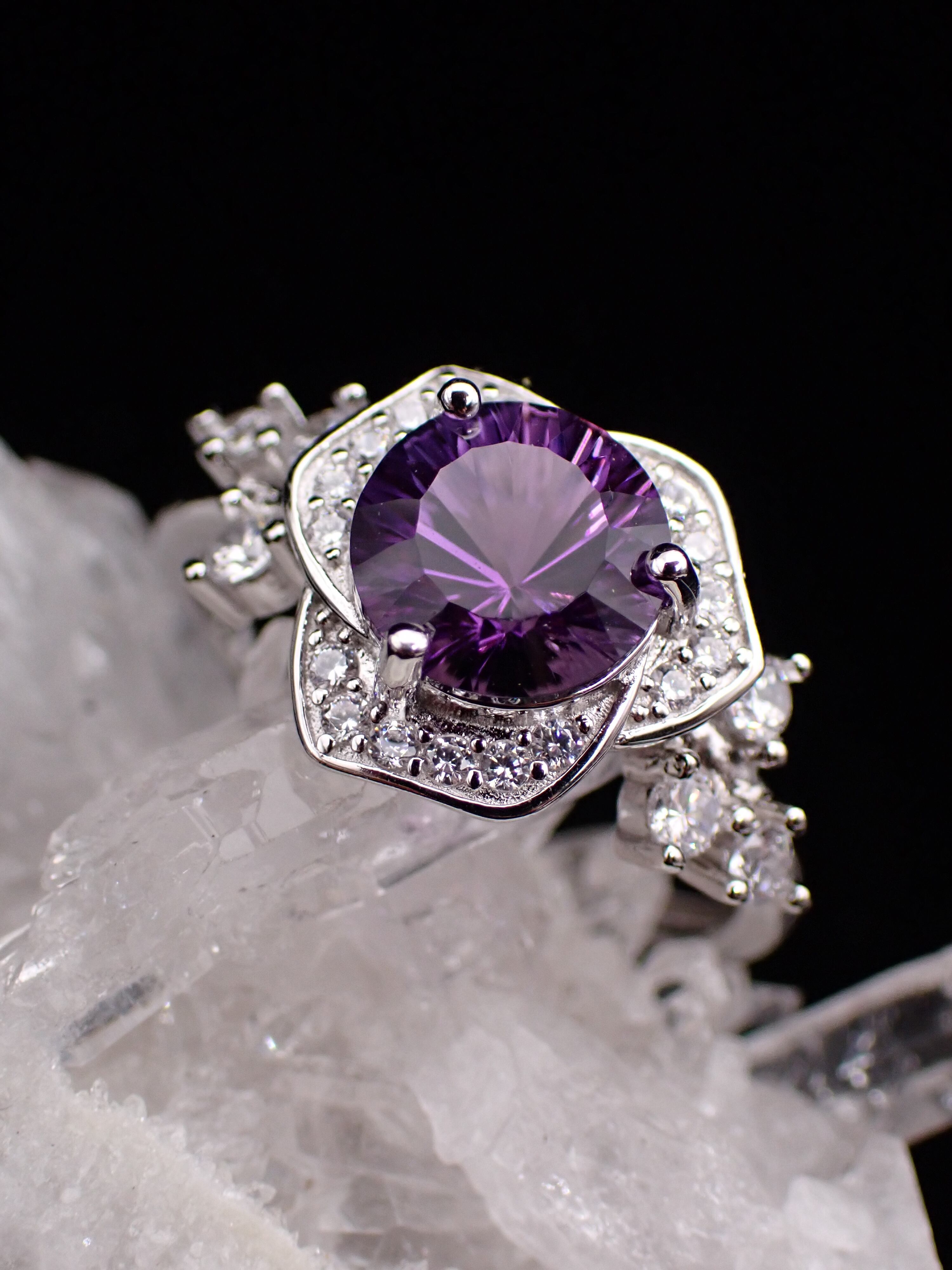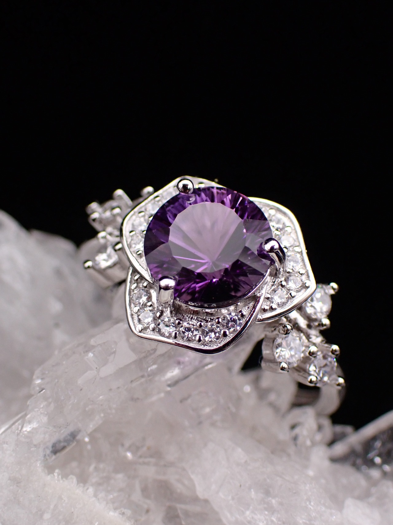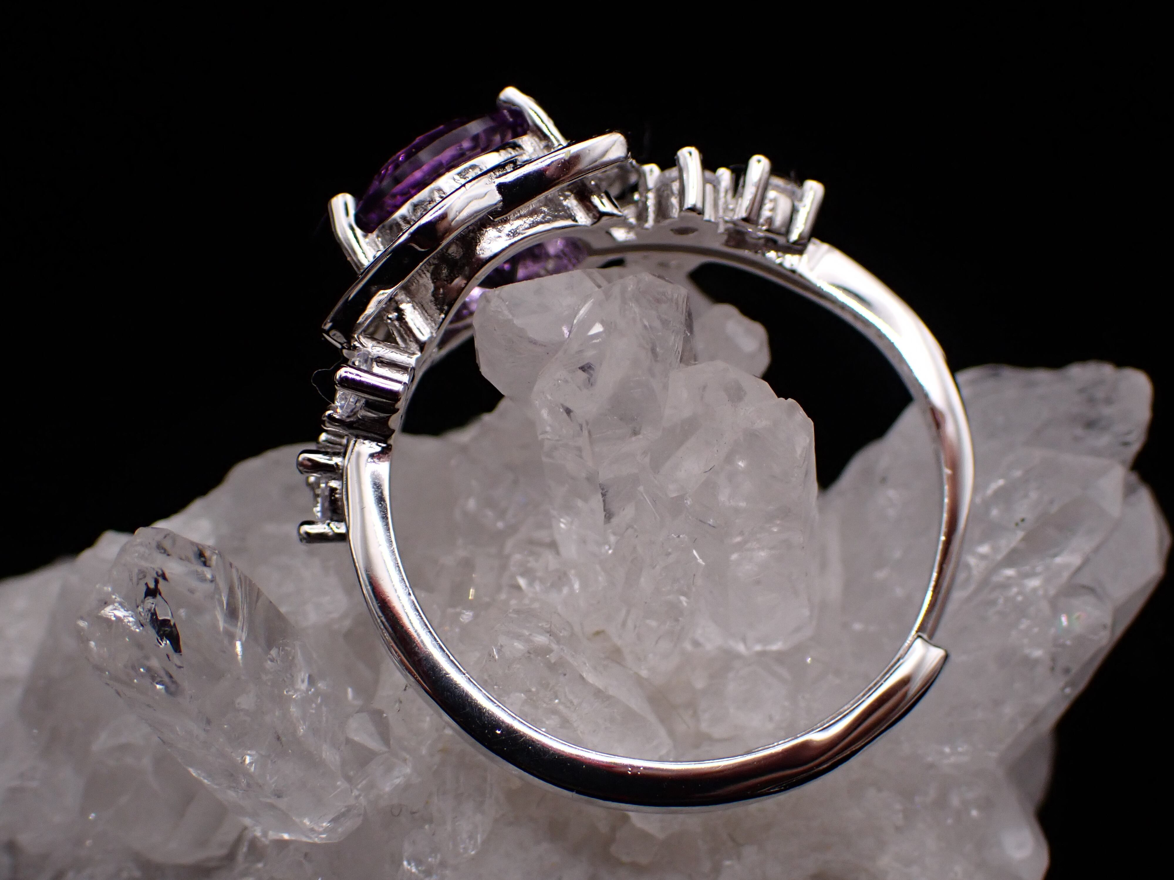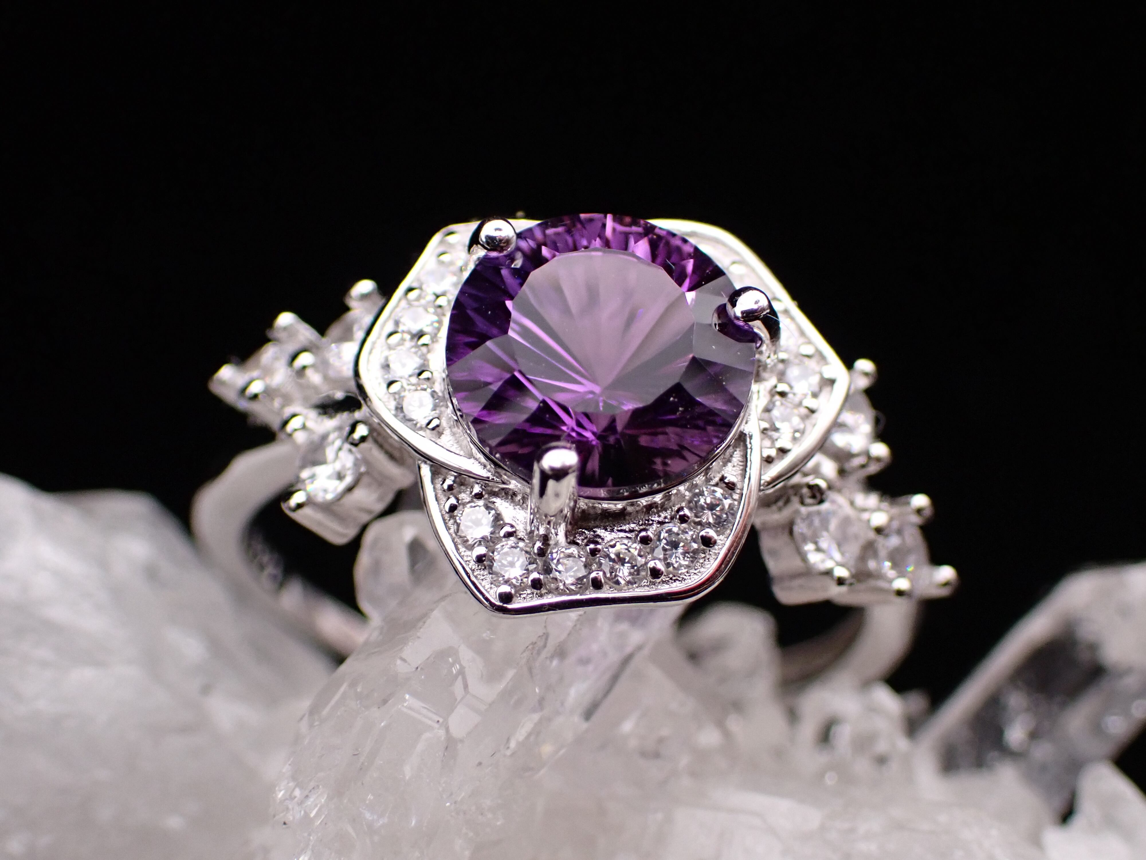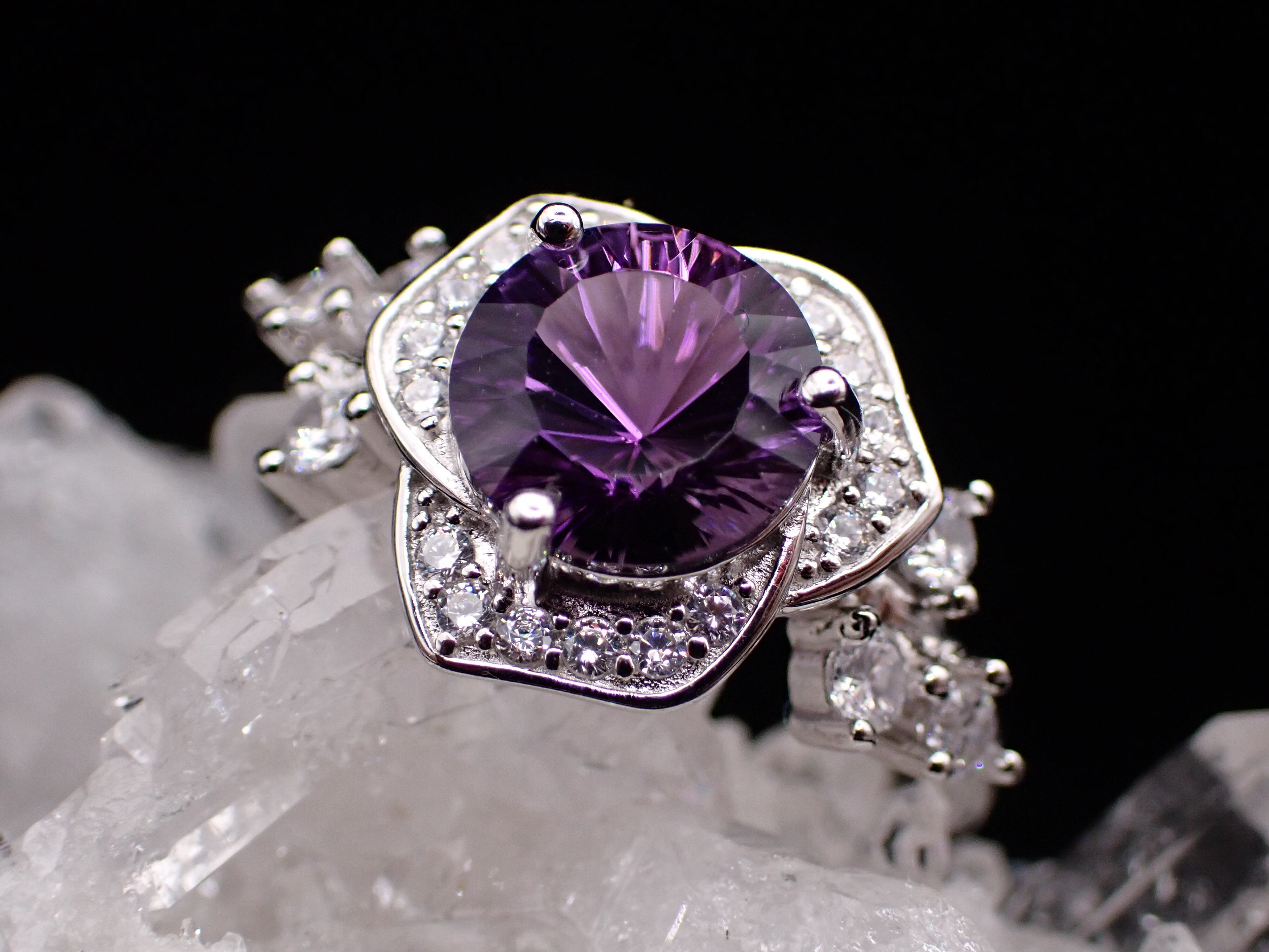 美しいジルコニアの中に8mmの大きなコンケーブカットのアメジストが豪華に輝きます。