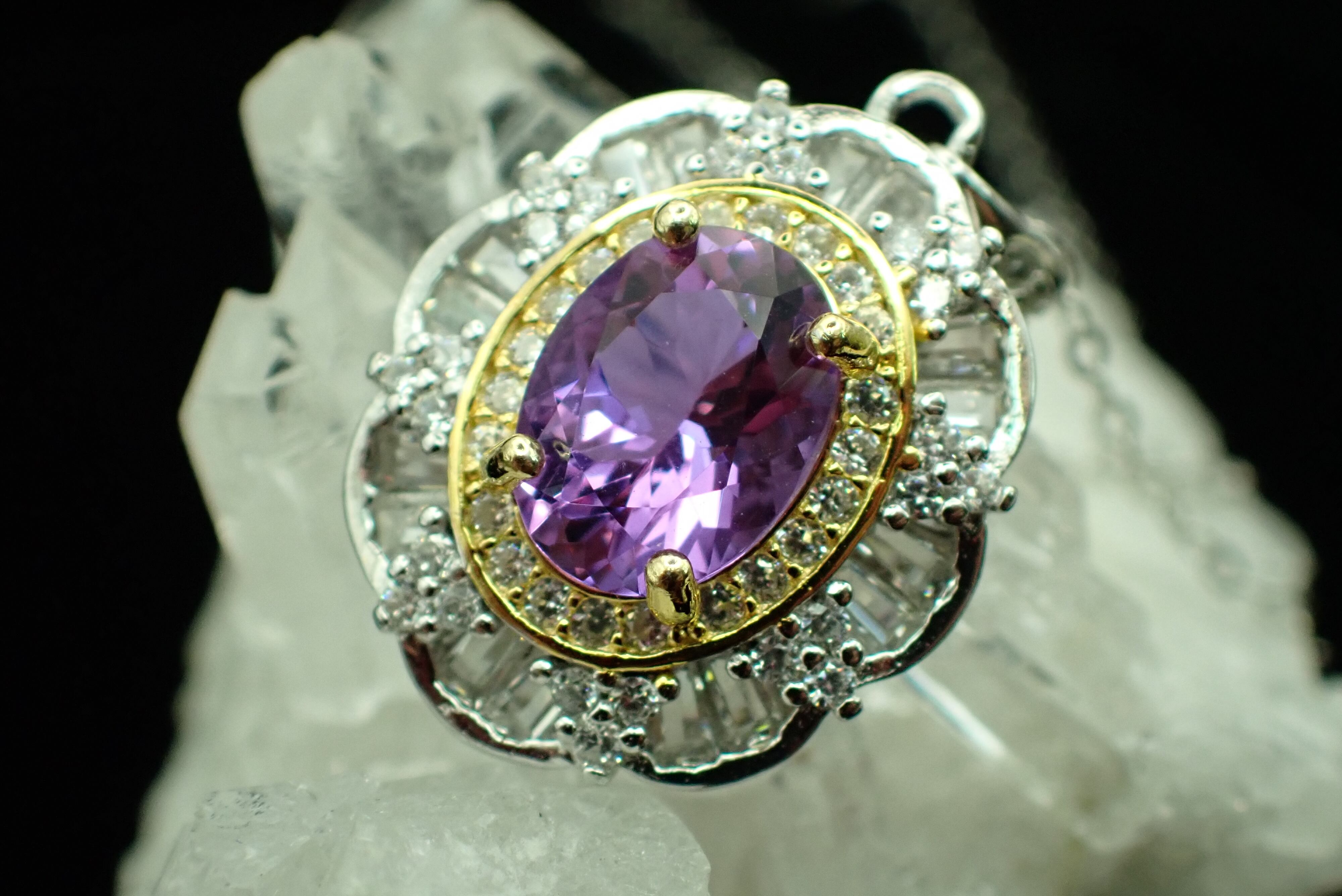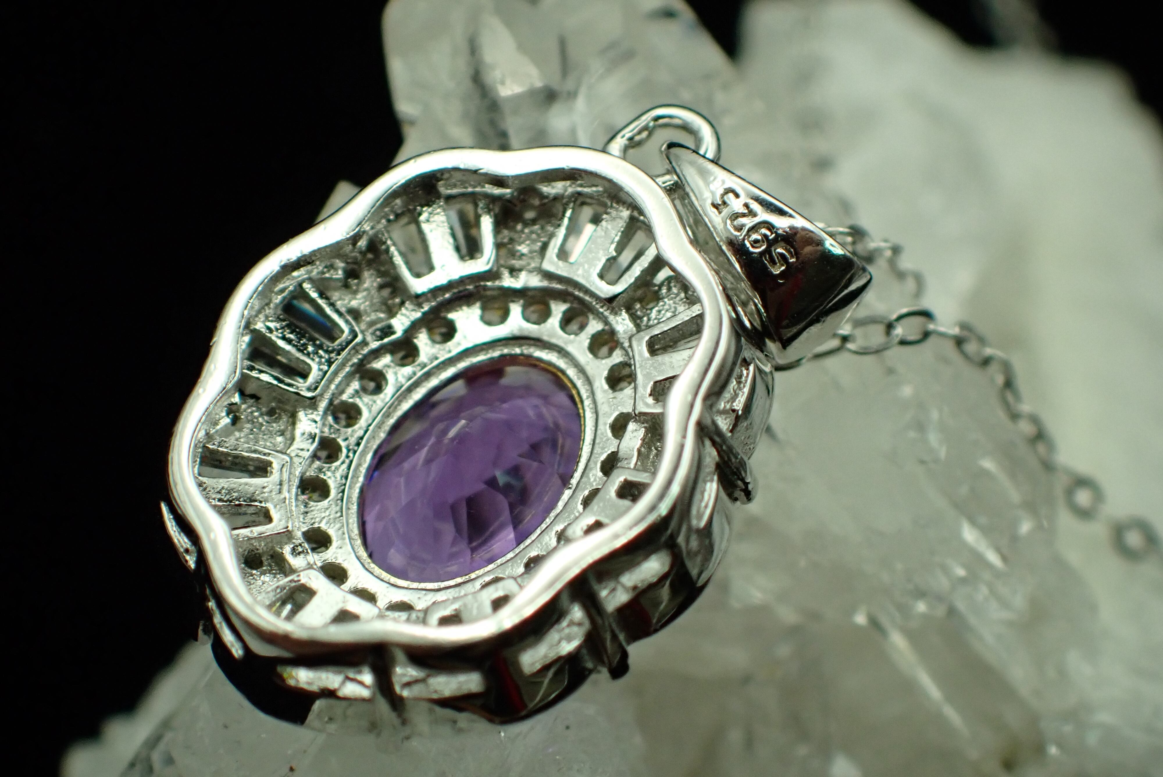 大きく澄んだパープルが美しいザンドライトガラスが中央に鎮座したゴージャスなペンダントです。