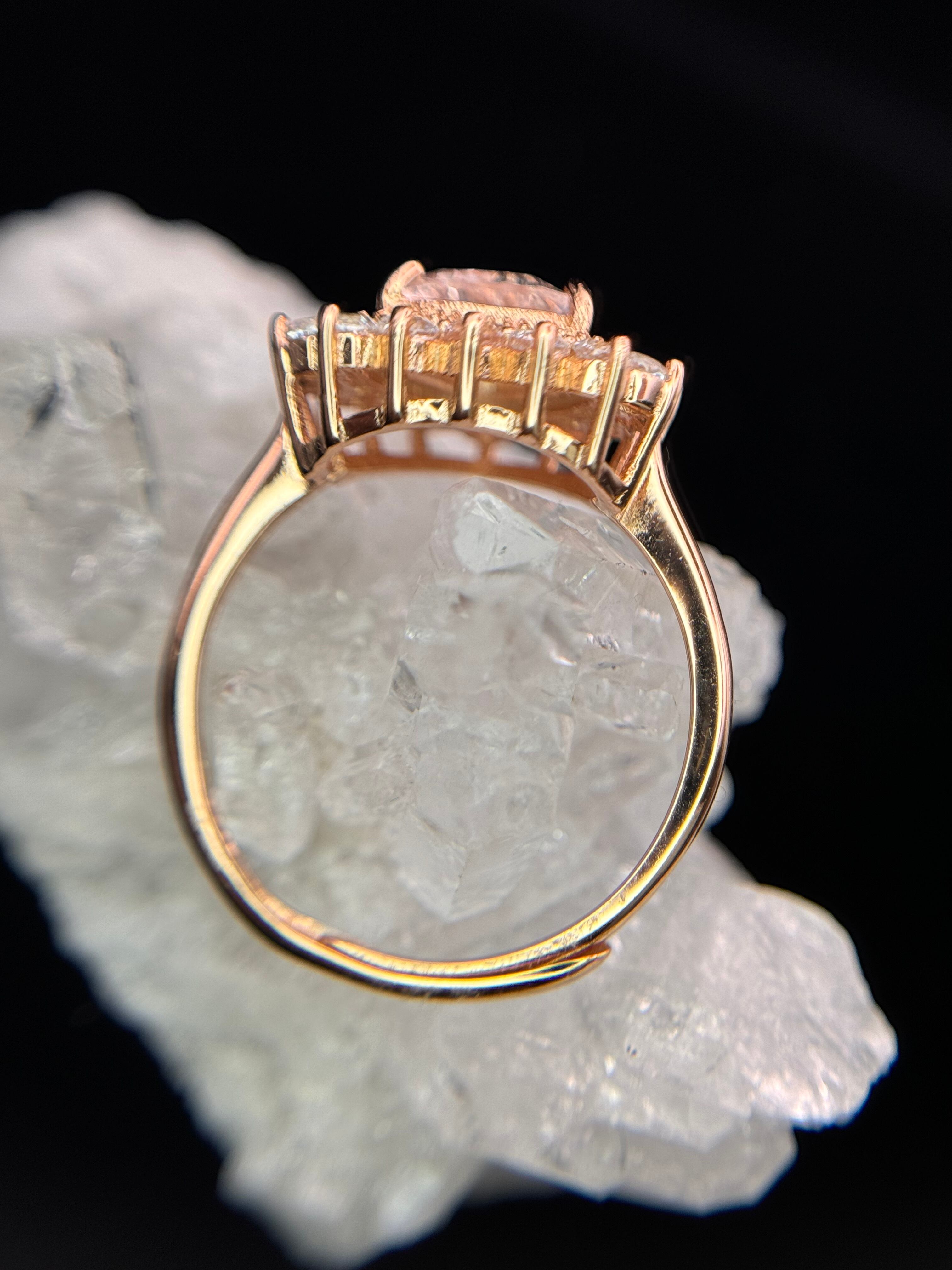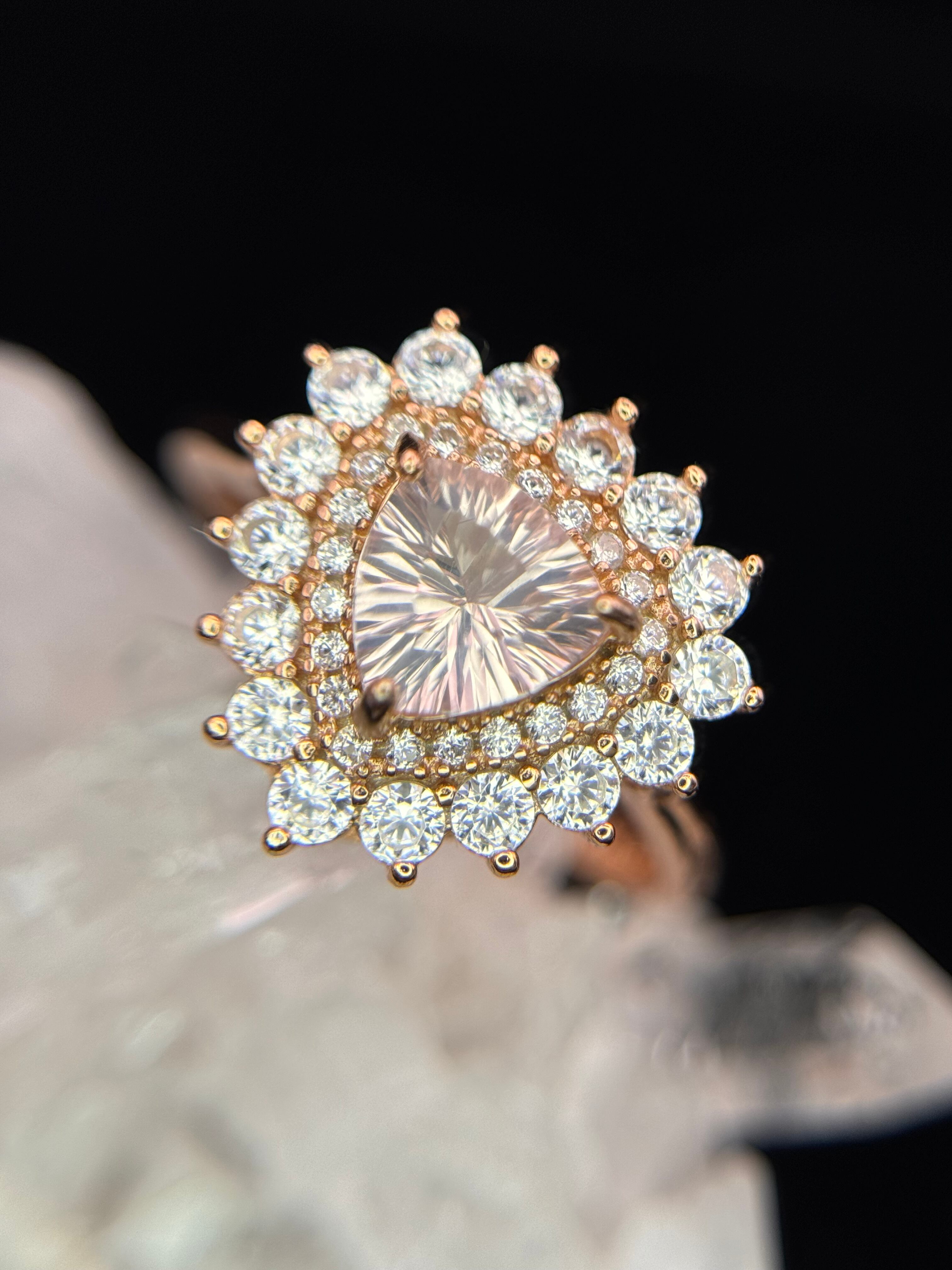 煌びやかに散るジルコニアの中央に佇む、愛らしい桜色が美しいローズクォーツのリングです。