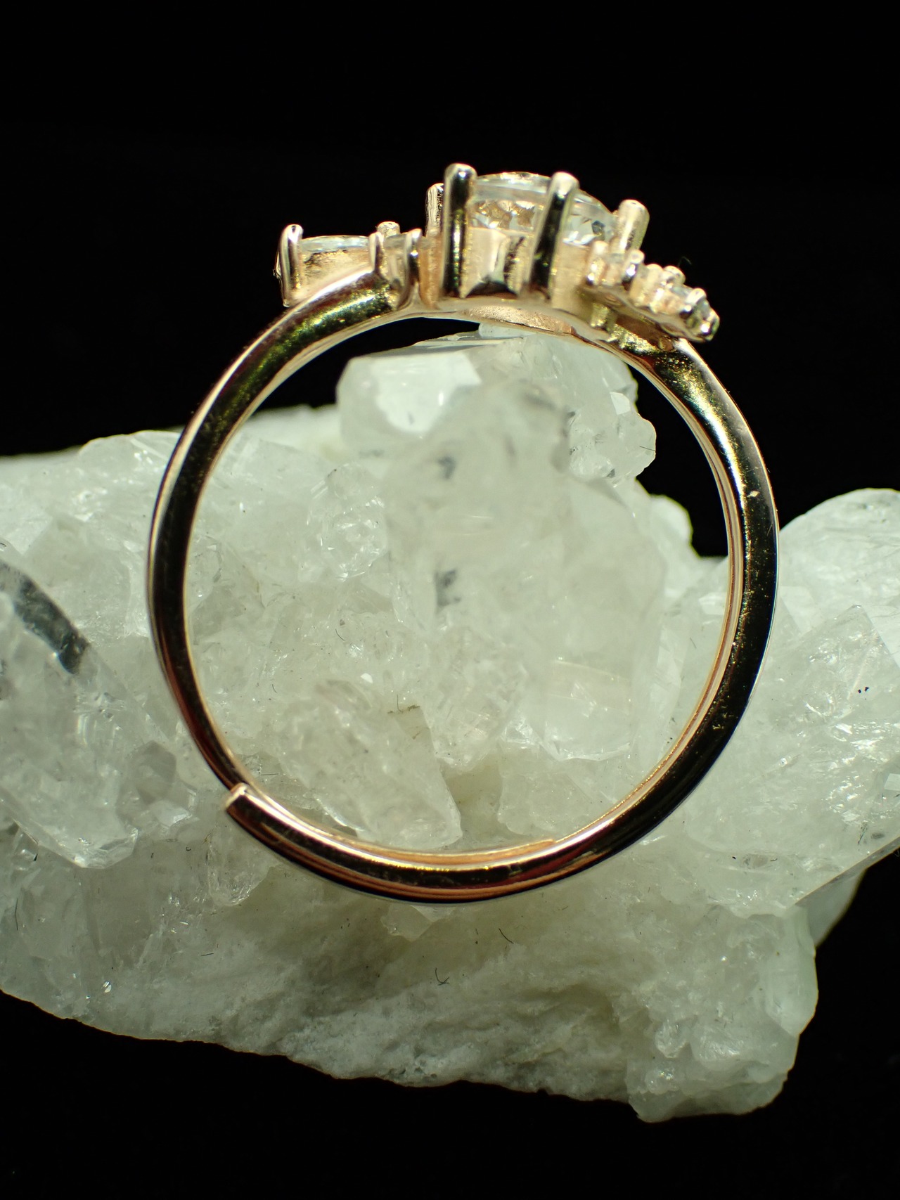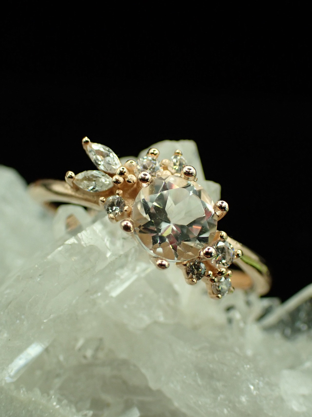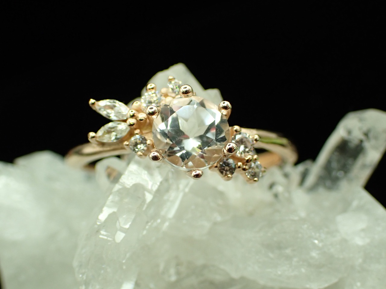花束のように並んだ小さなジルコニアたちが、クリアなピースが美しいホワイトトパーズをさらに輝かせる繊細なリングです。