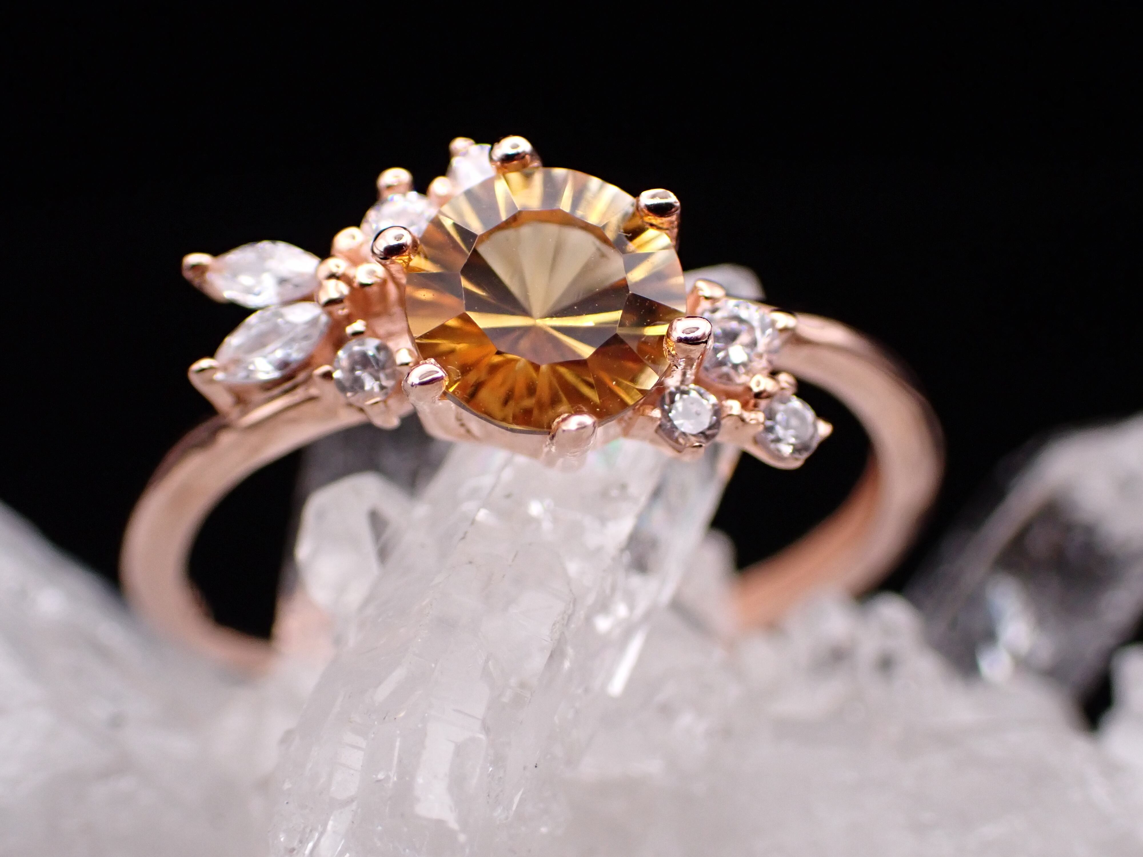 花束のように並んだ小さなジルコニアたちが、コンケーブカットが美しいシトリンをさらに輝かせる繊細なリングです。