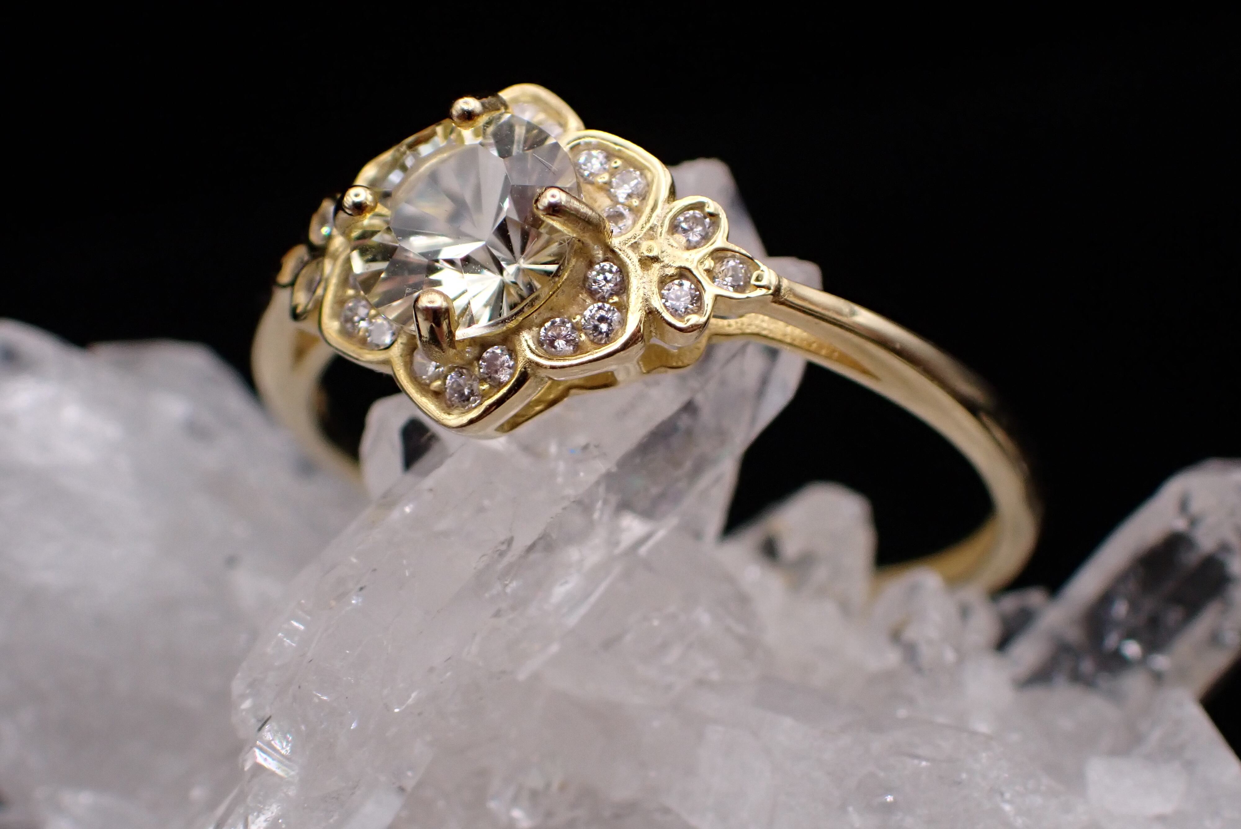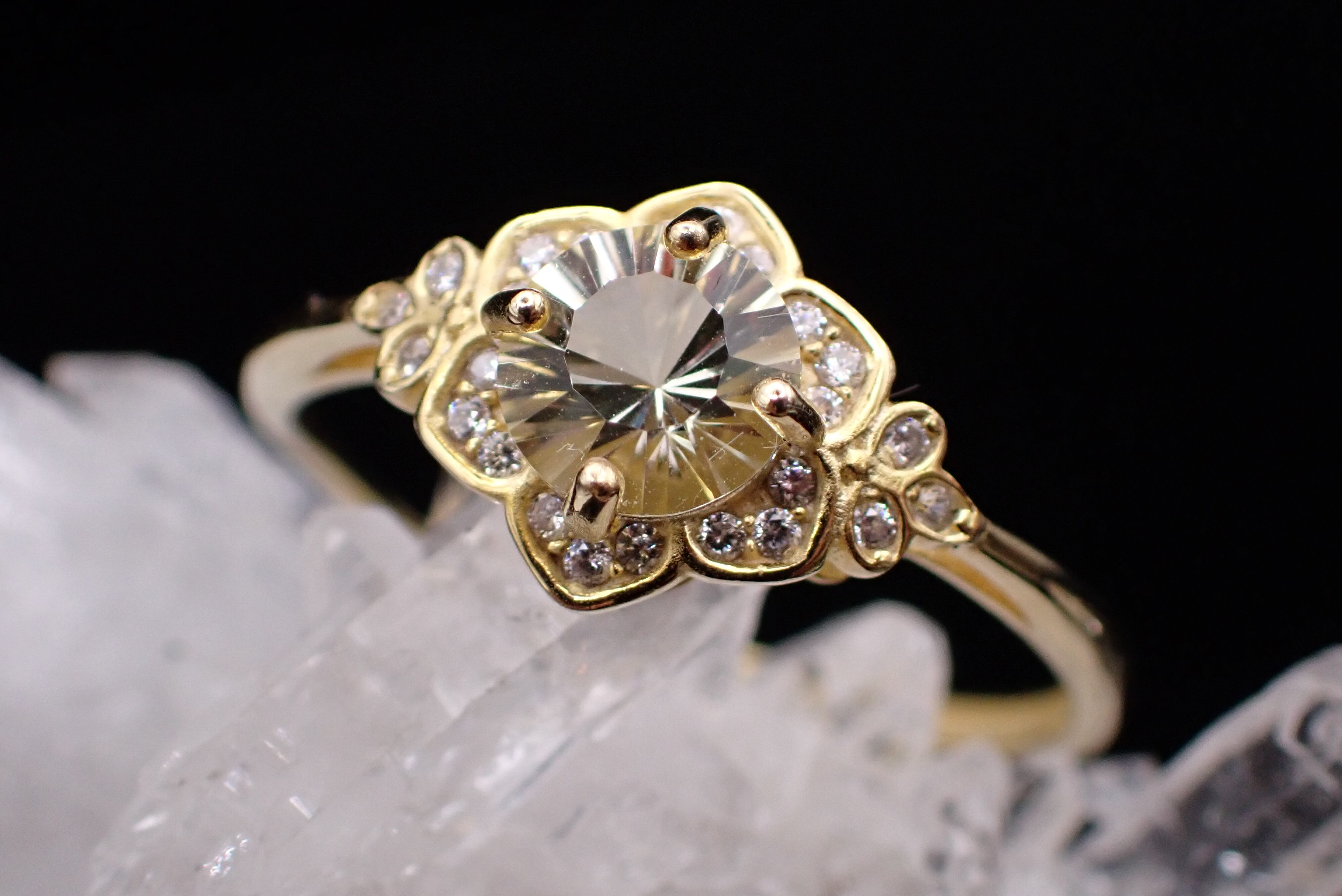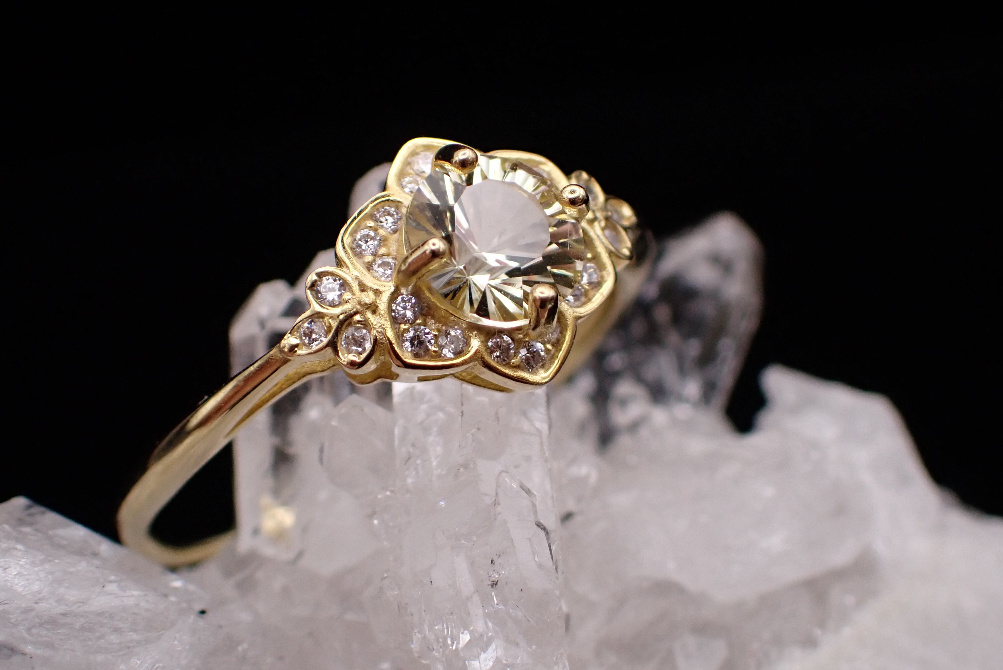 中央に光を集めるコンケーブカットにより、一段と輝きを増すピースが目を惹きます。