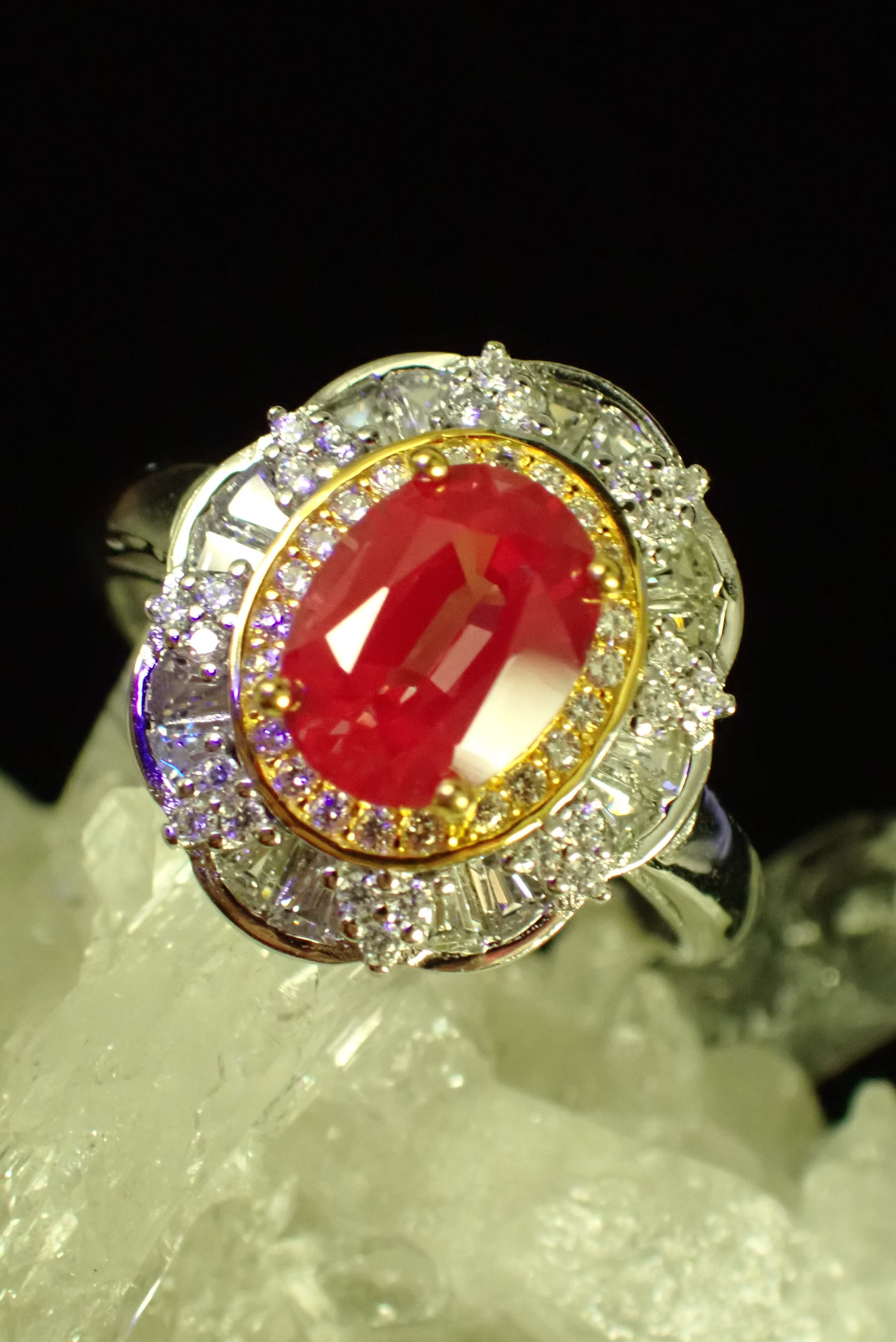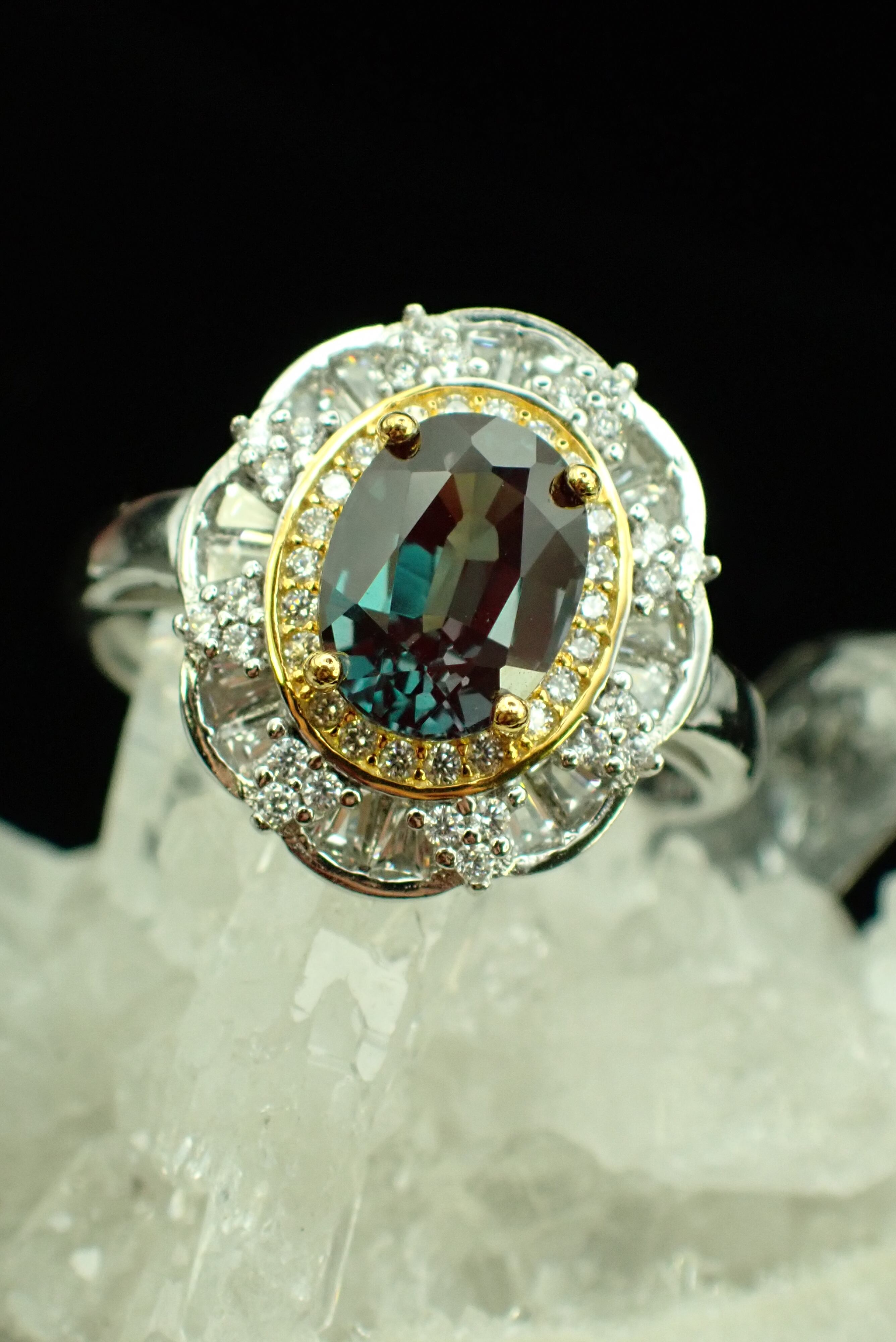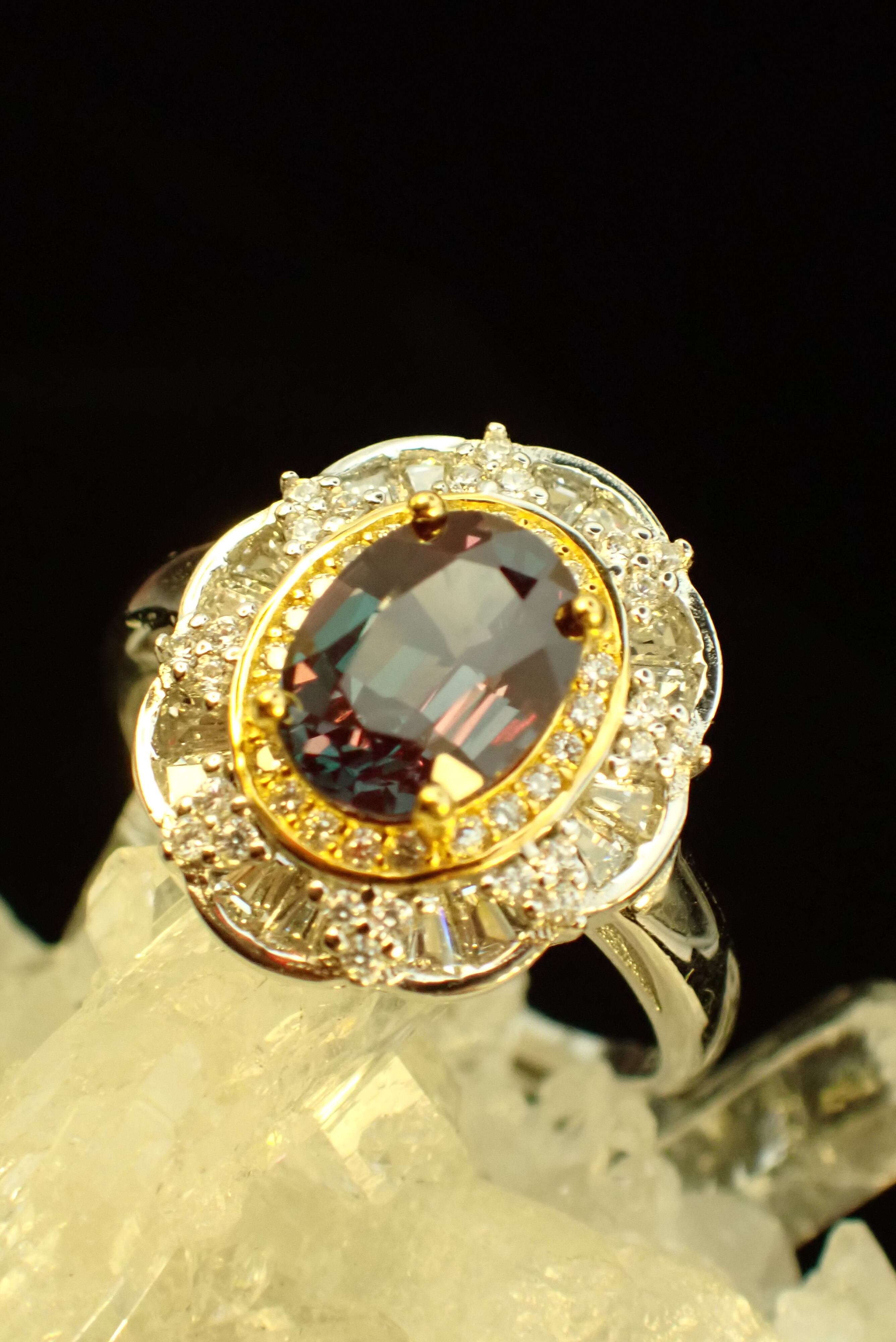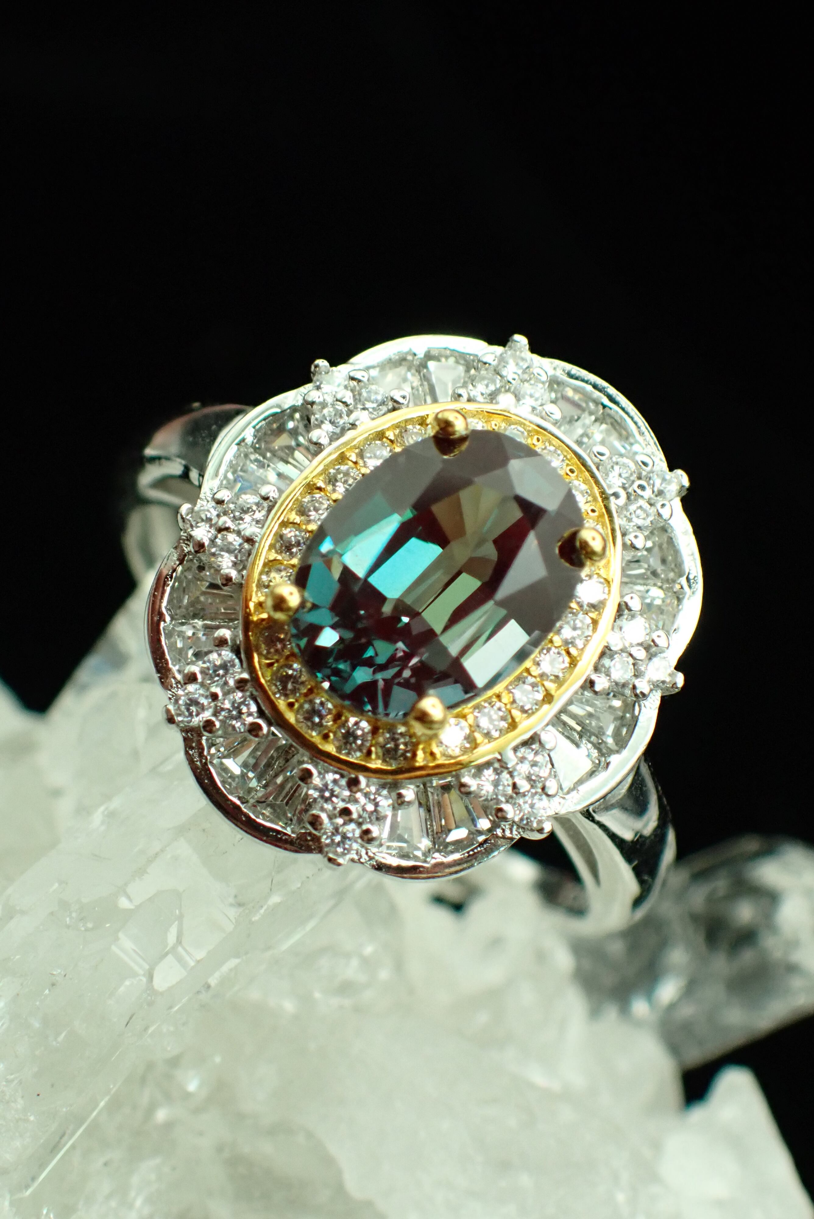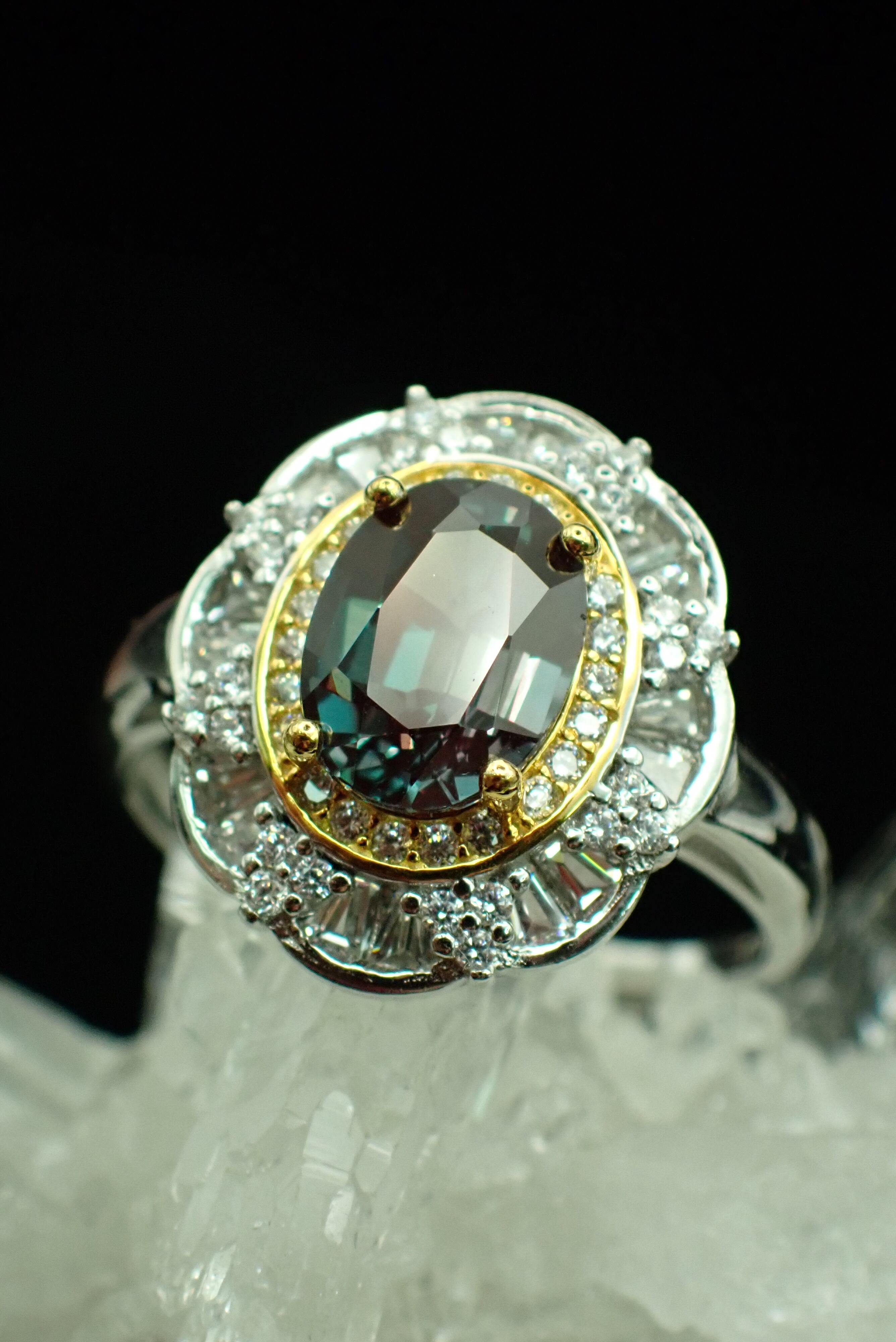取り巻きのジルコニアたちがキラキラと輝き、合成アレキサンドライトの輝きを引き立てます。