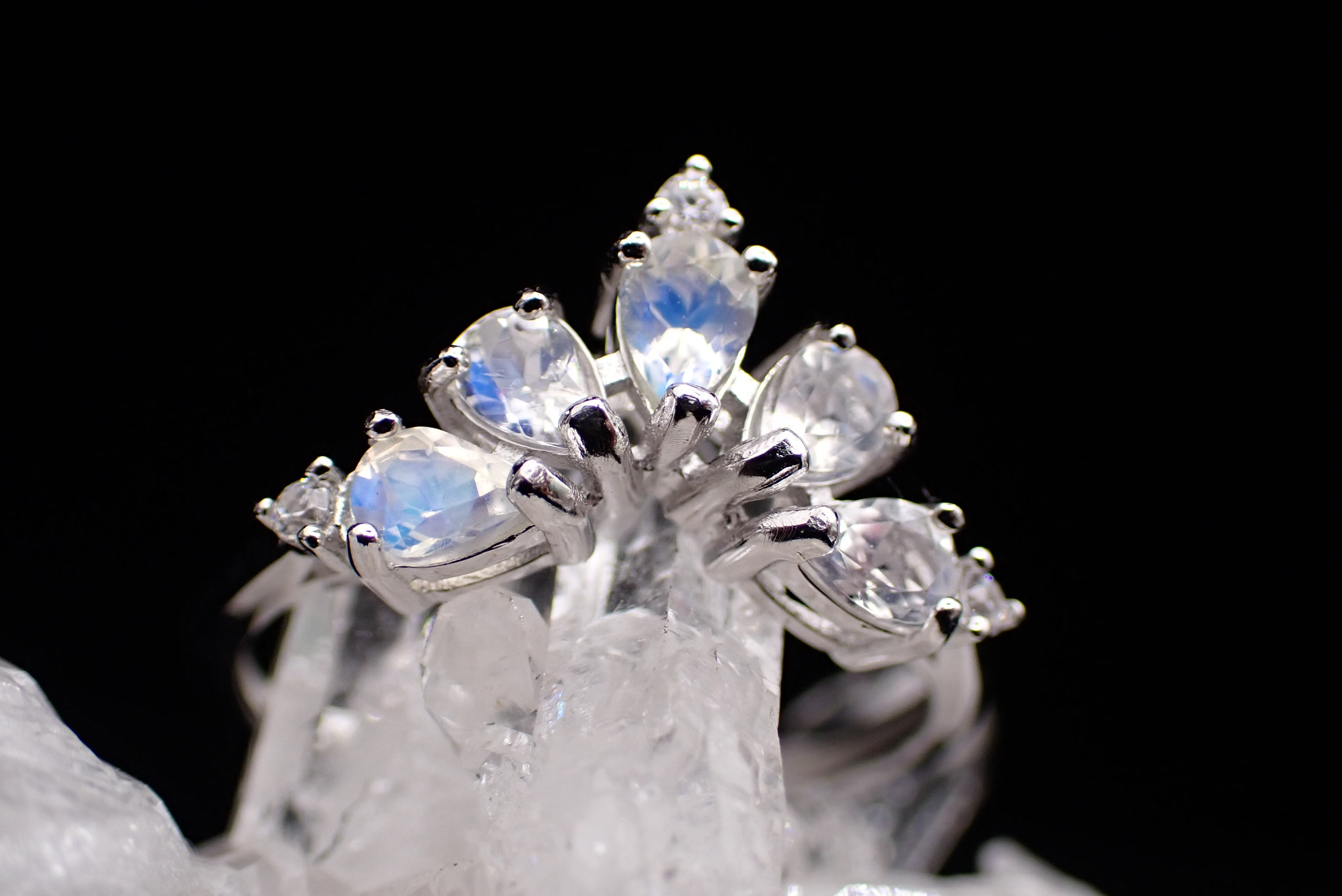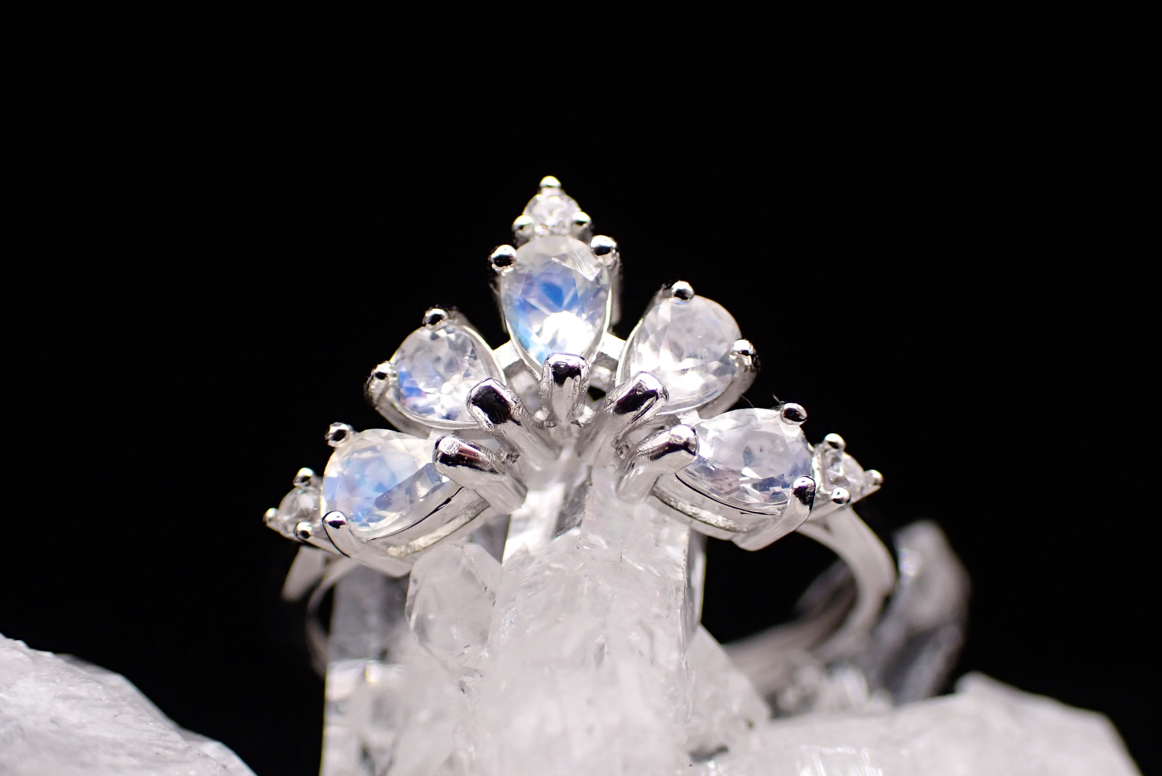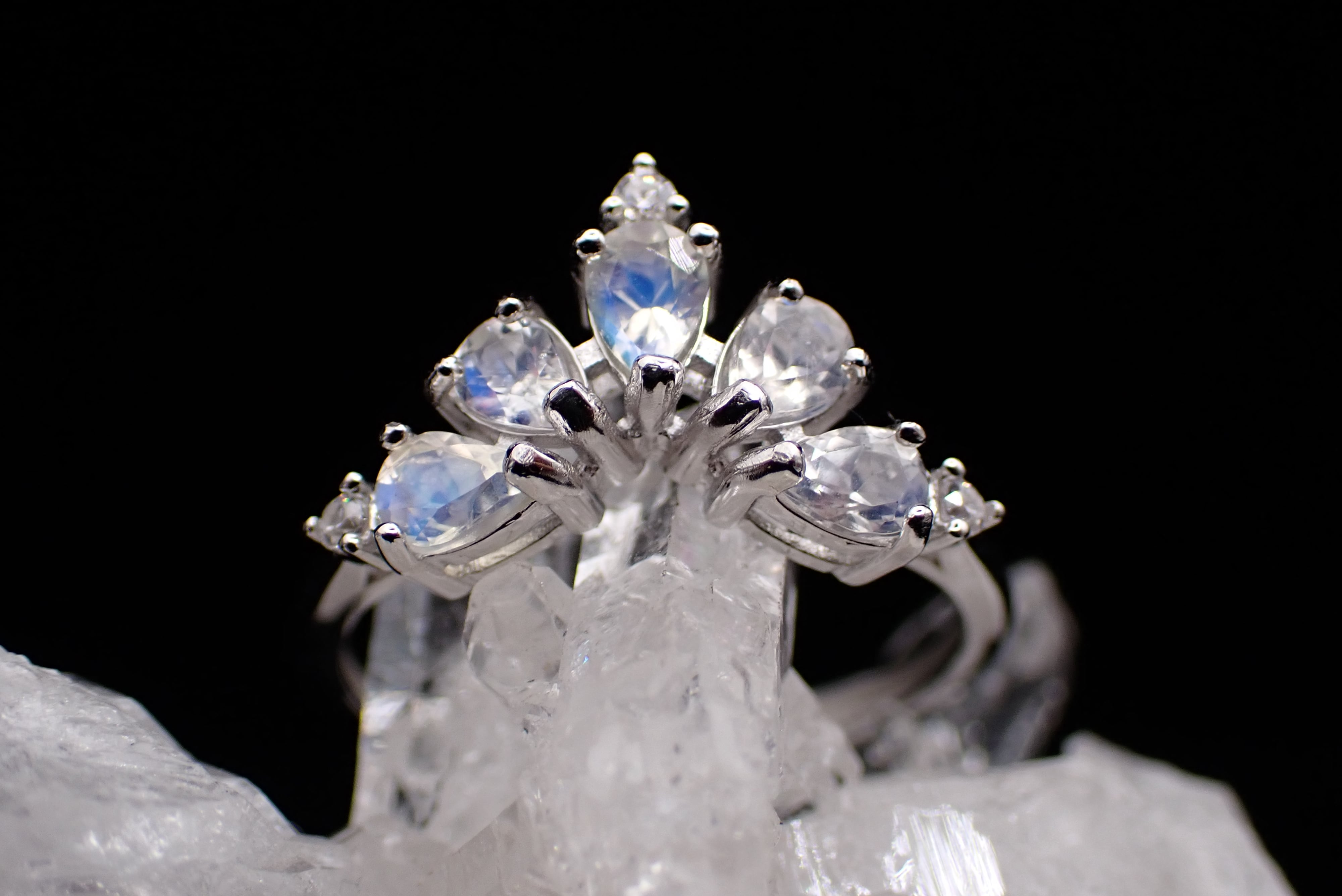 ドロップのアンデシンラブラドライトたちが5つ、孔雀が羽根をひろげたように並んだリングです。