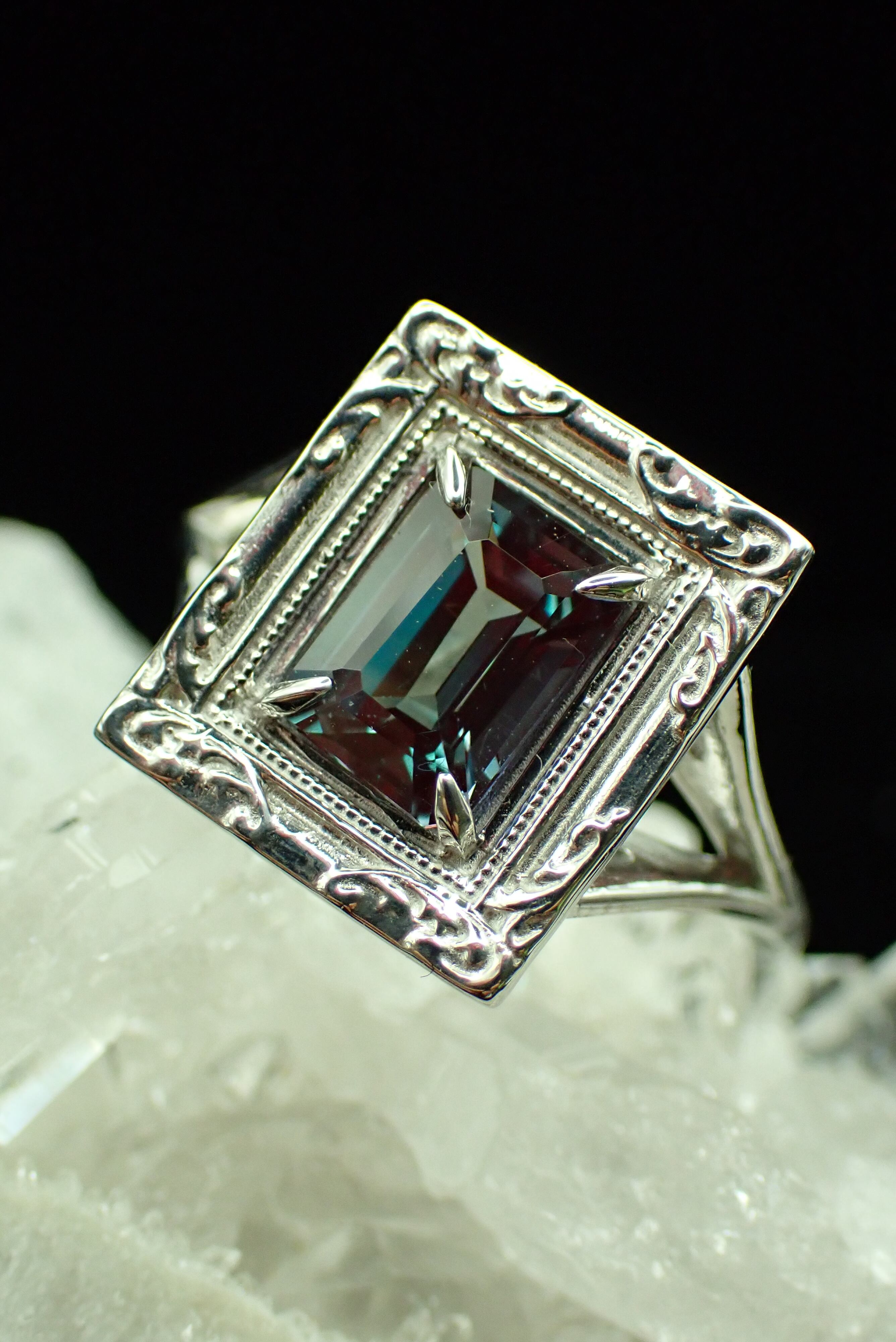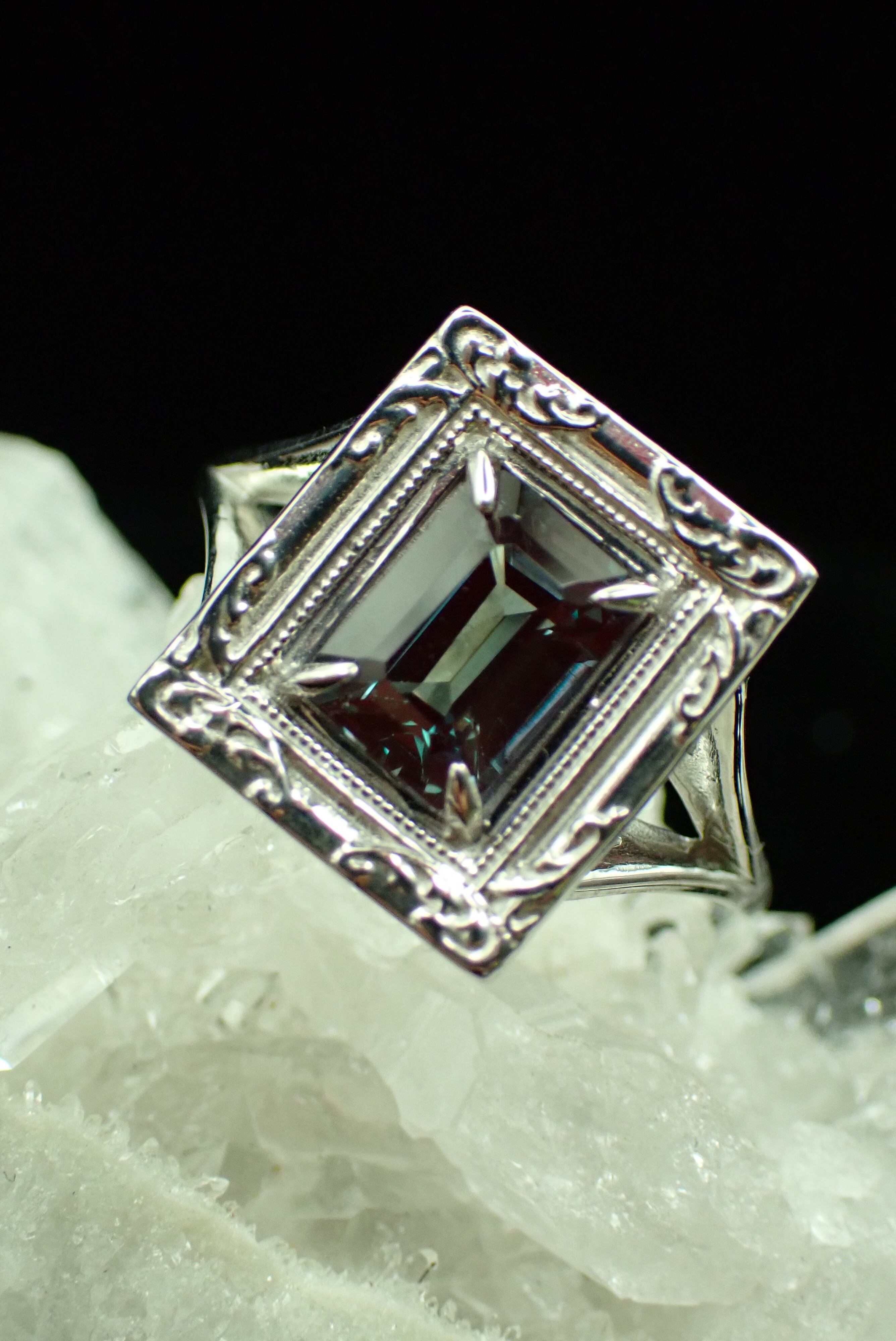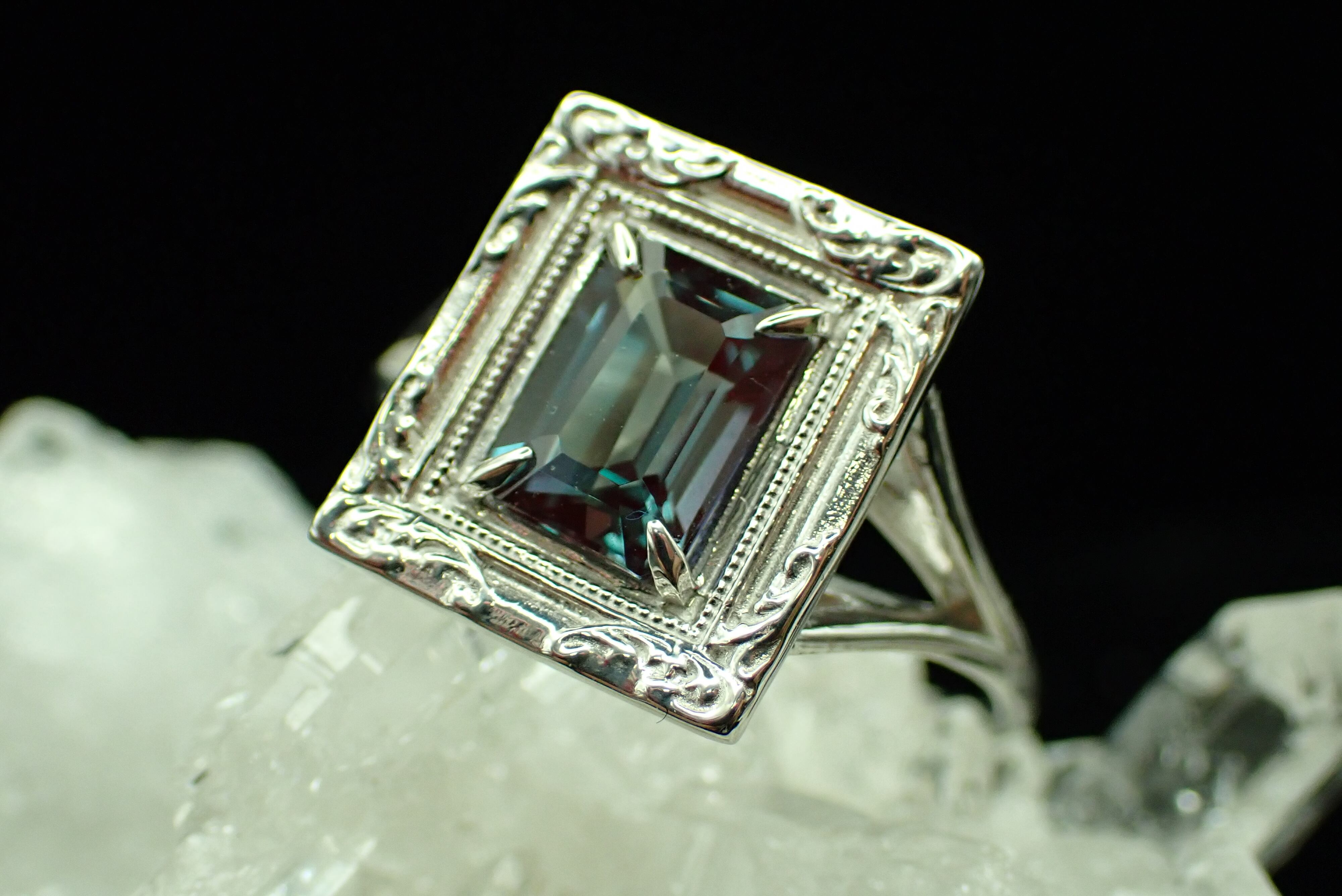 カラーチェンジと蛍光の美しい合成アレキサンドライトを絵画のように、美しい額縁の中へ納めました。