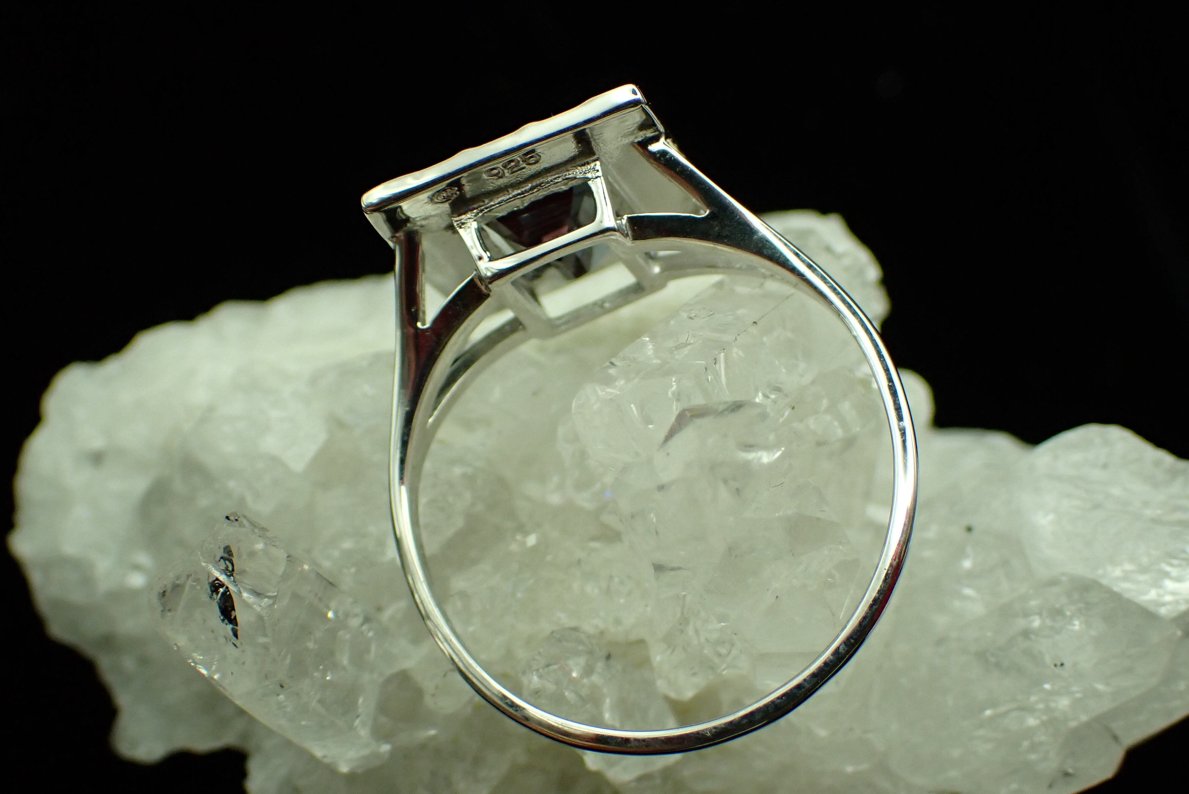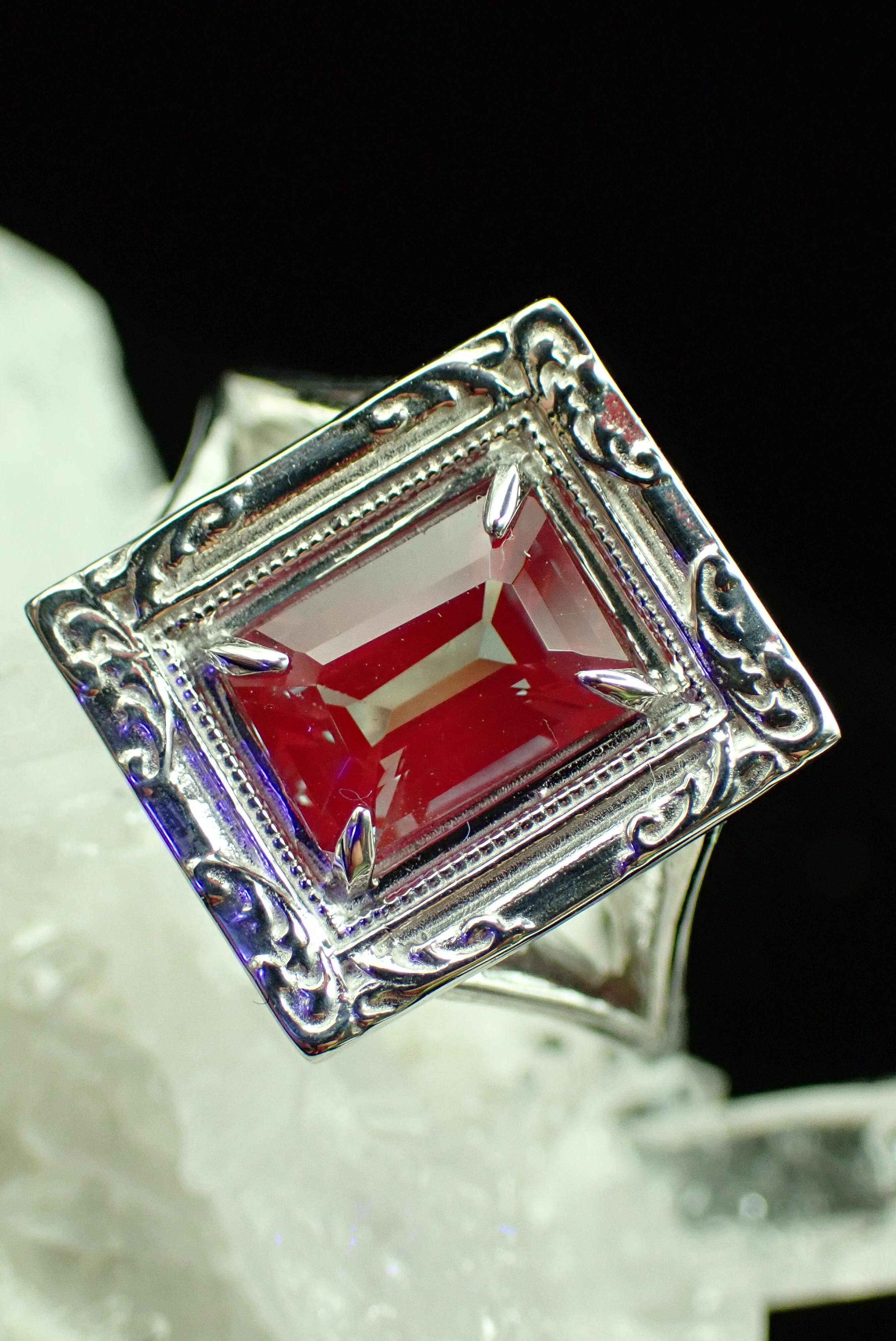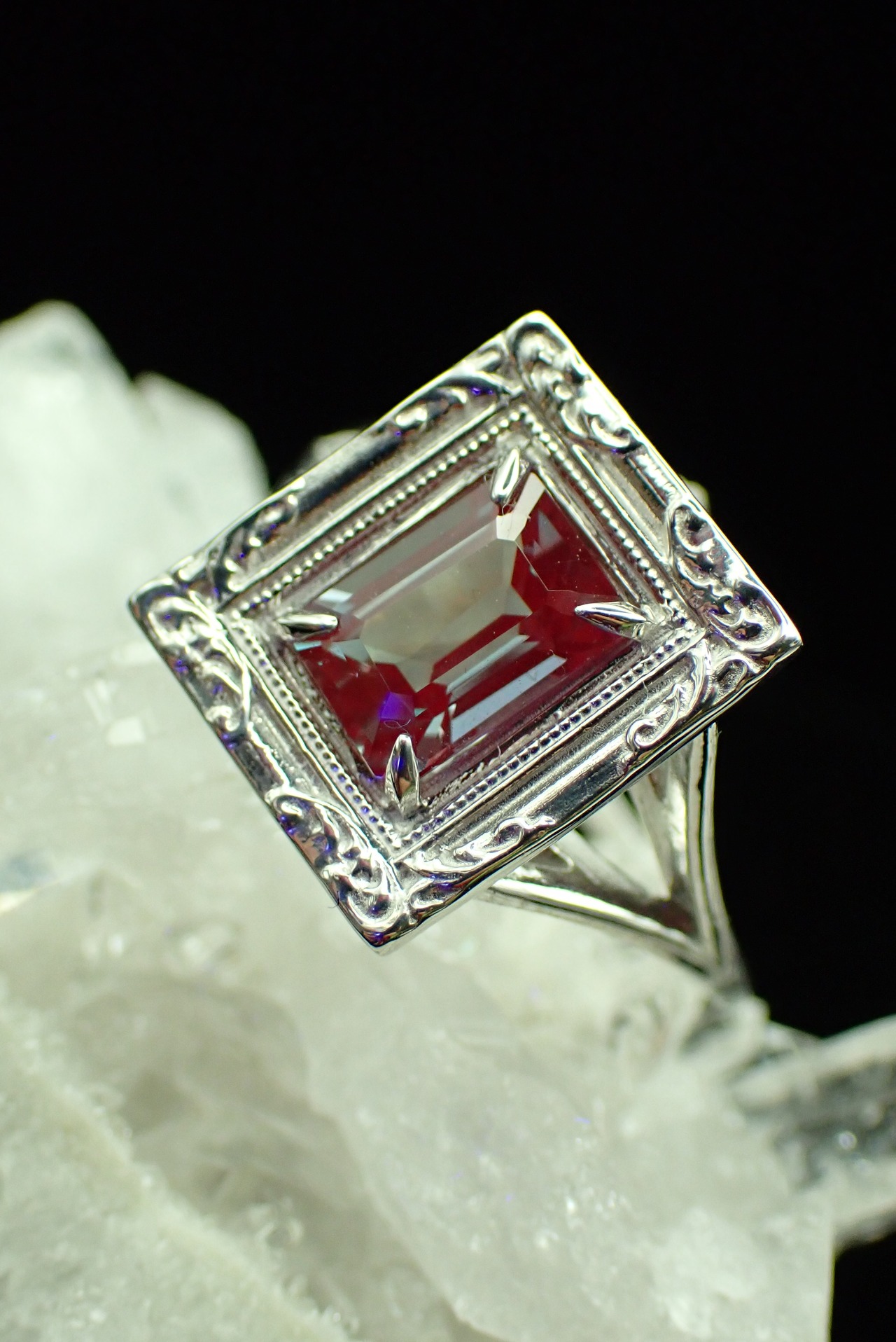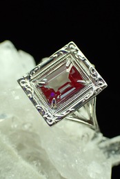 カラーチェンジと蛍光の美しい合成アレキサンドライトを絵画のように、美しい額縁の中へ納めました。
