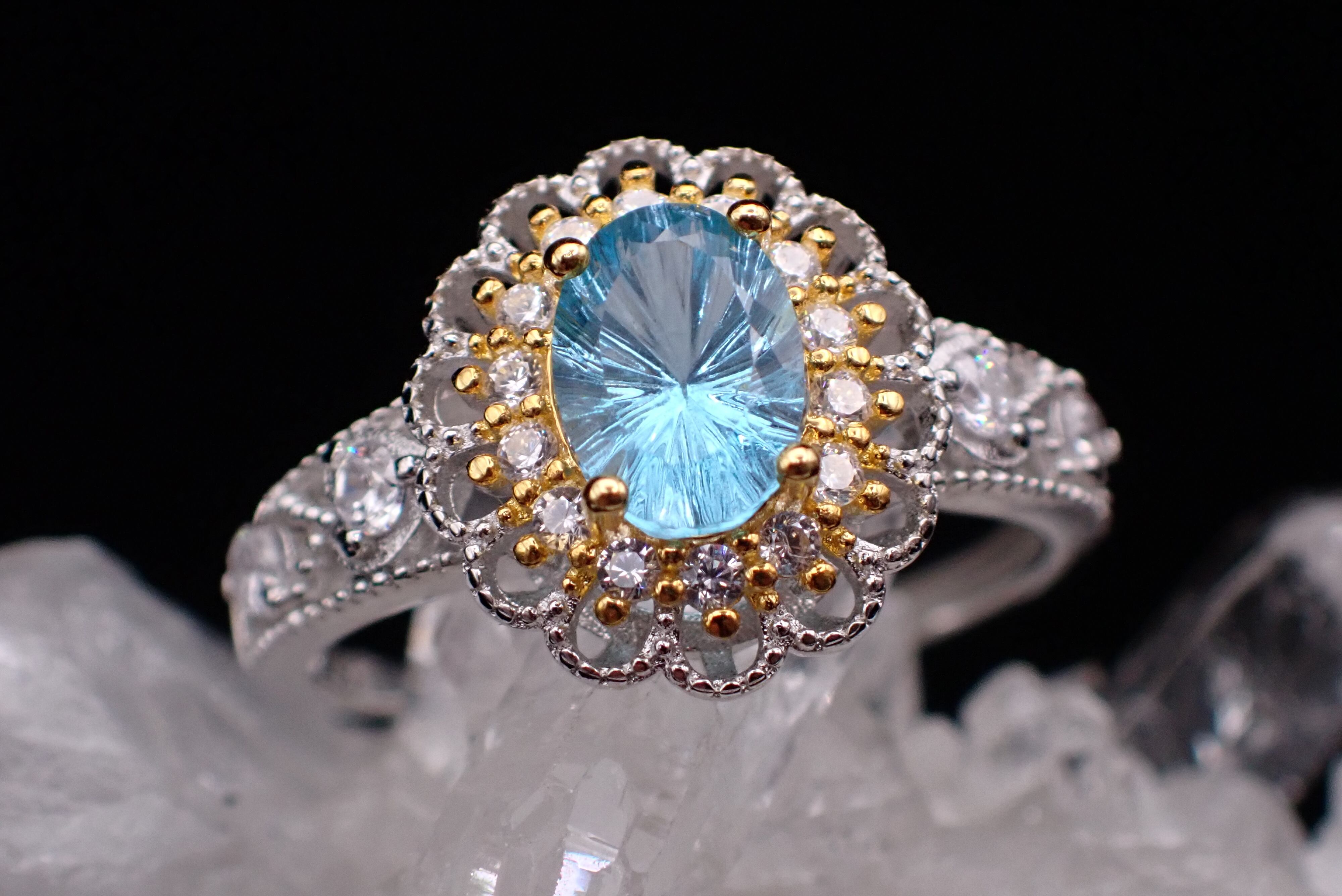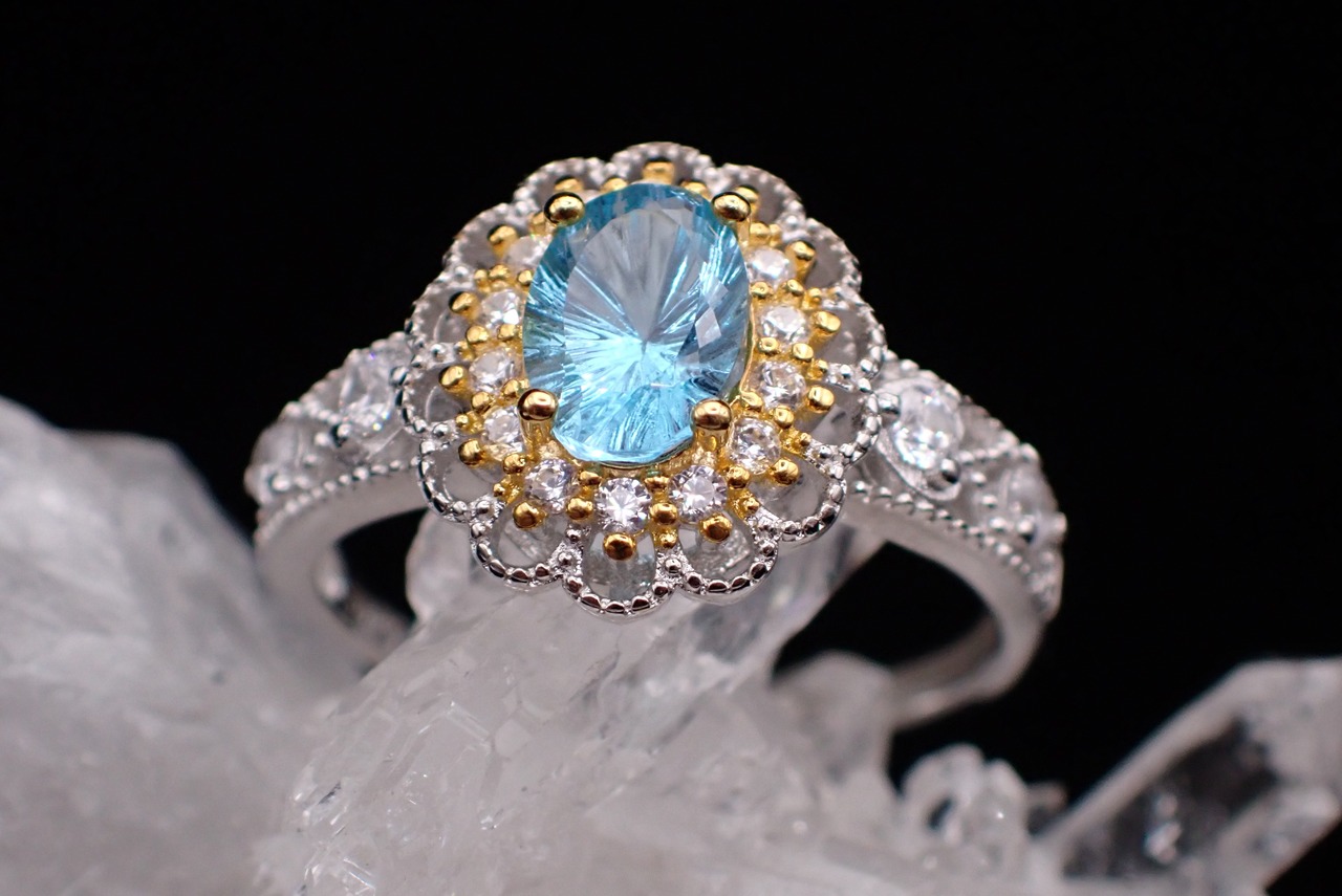 特殊カットの美しいブルートパーズが中央に鎮座したゴージャスなリングです。