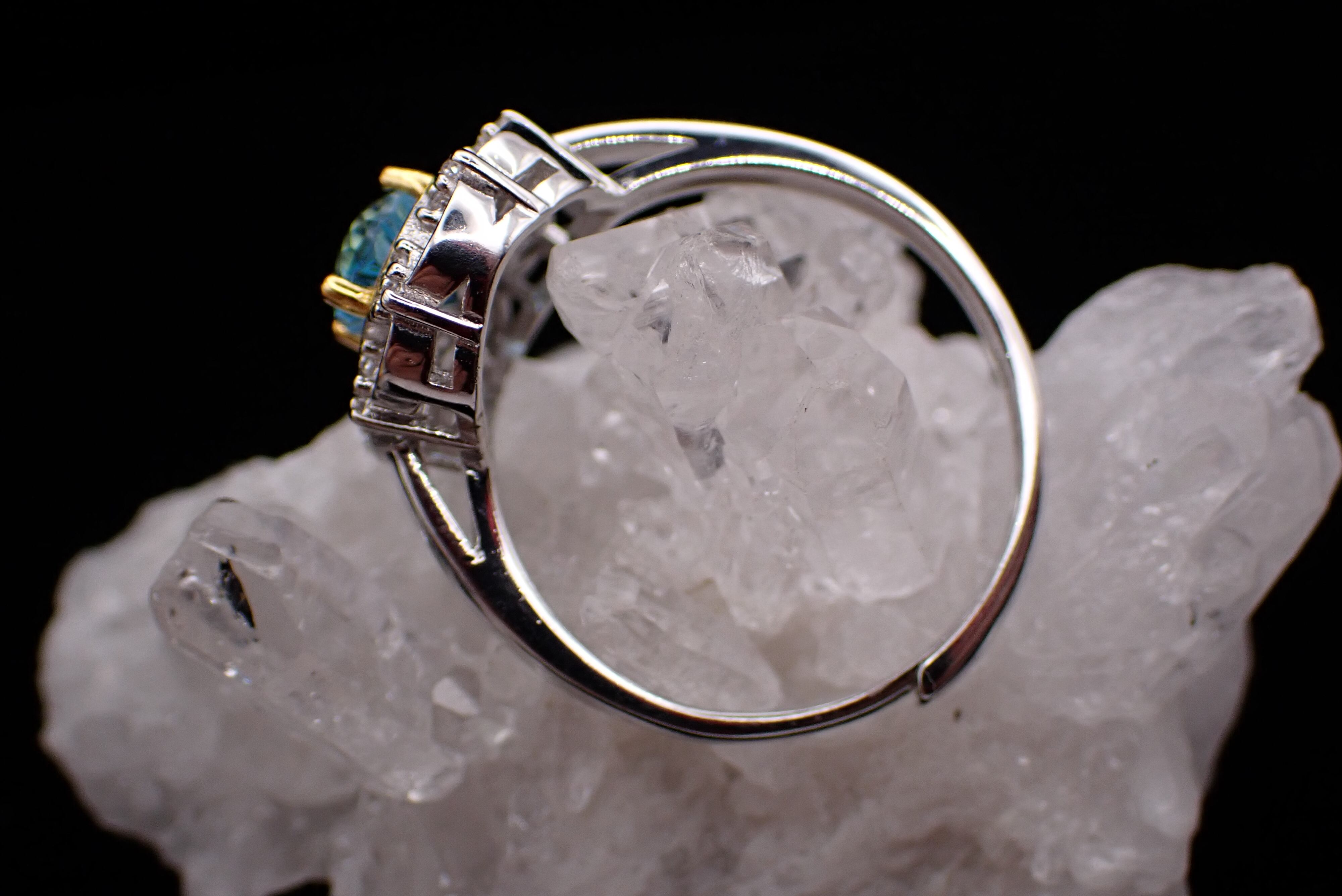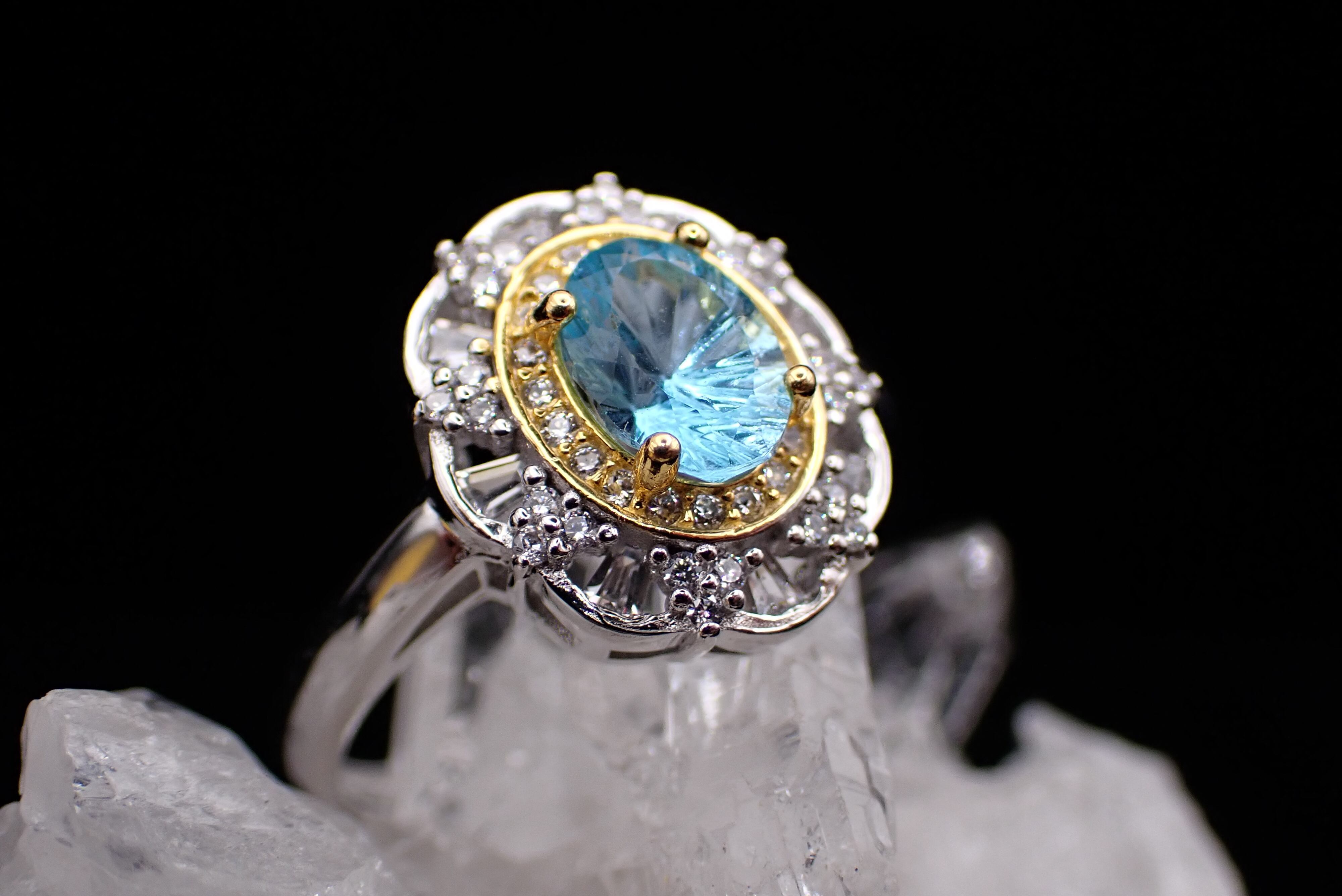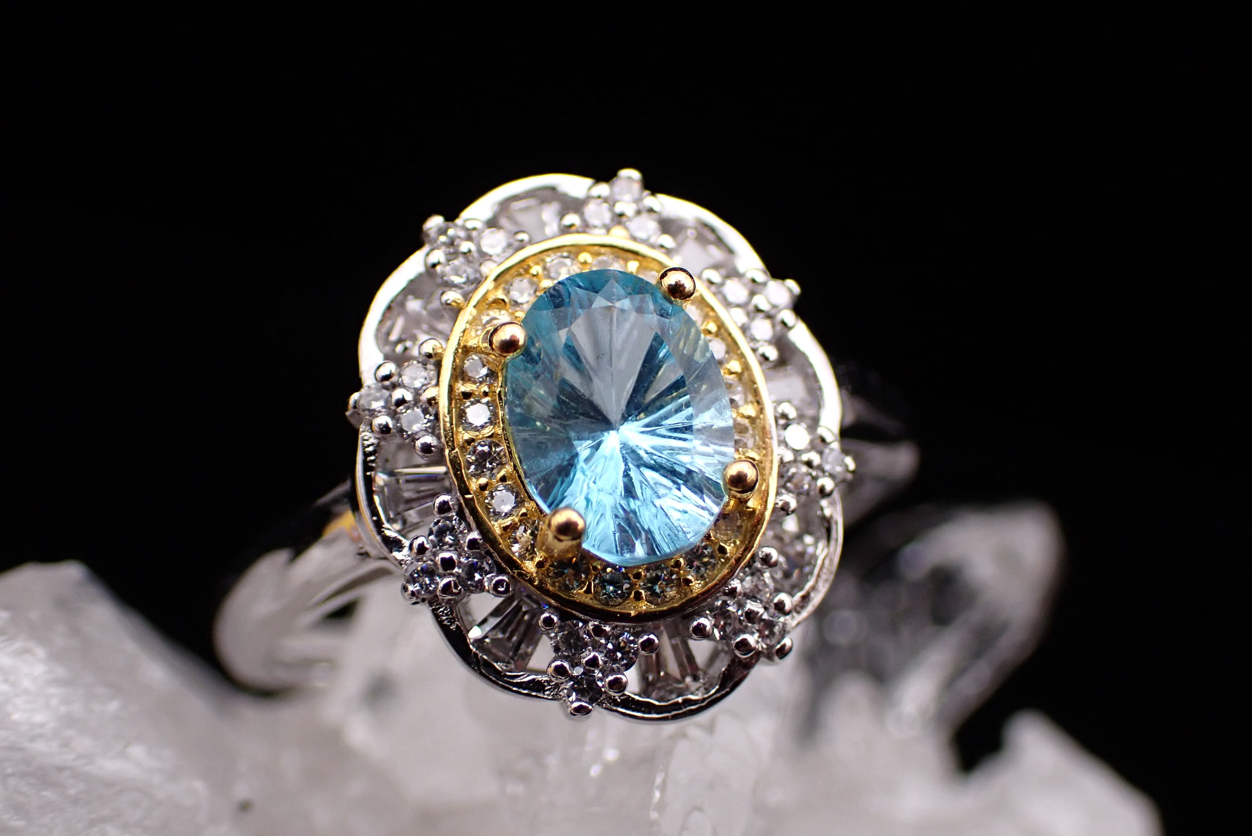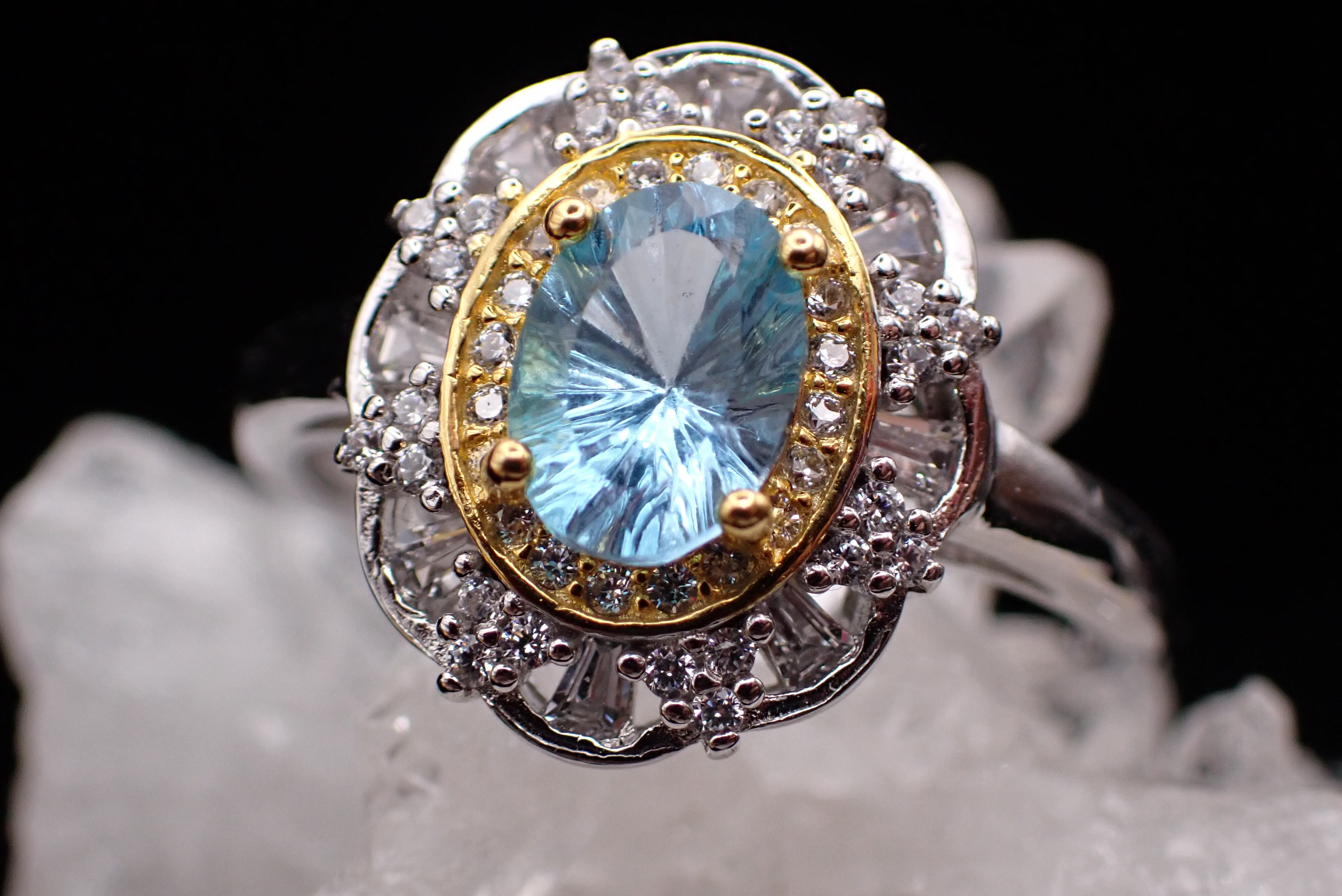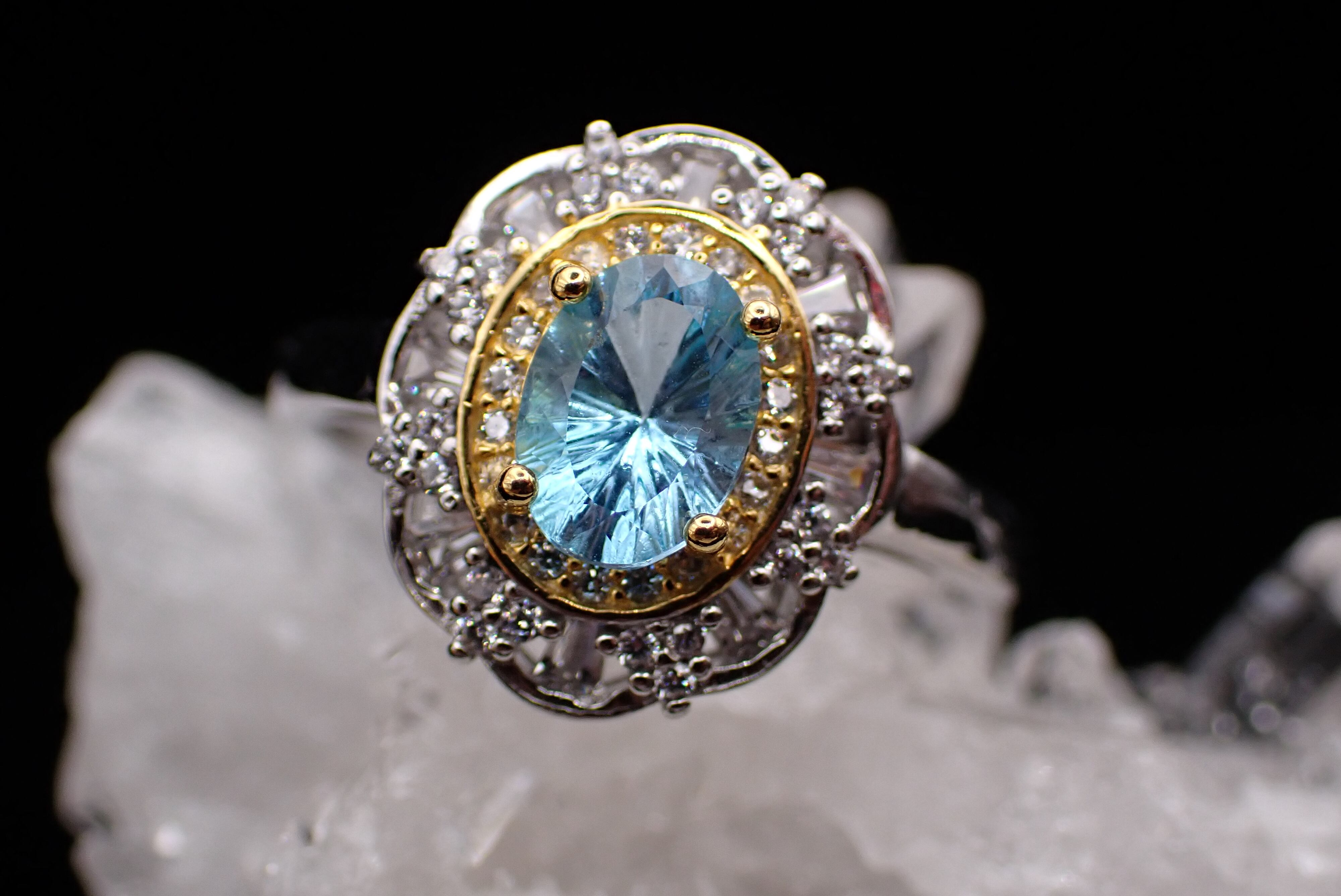 取り巻きのジルコニアたちがキラキラと輝き、ブルートパーズの輝きを引き立てます。
