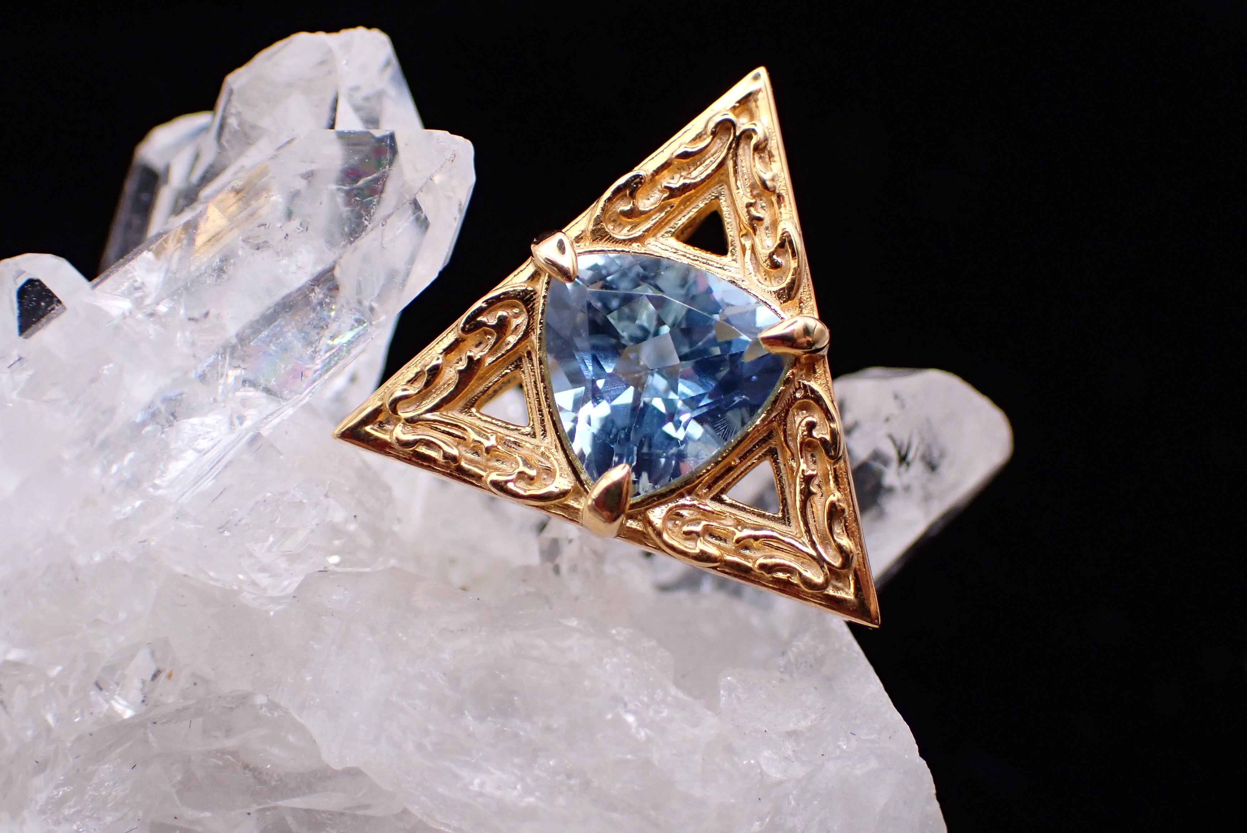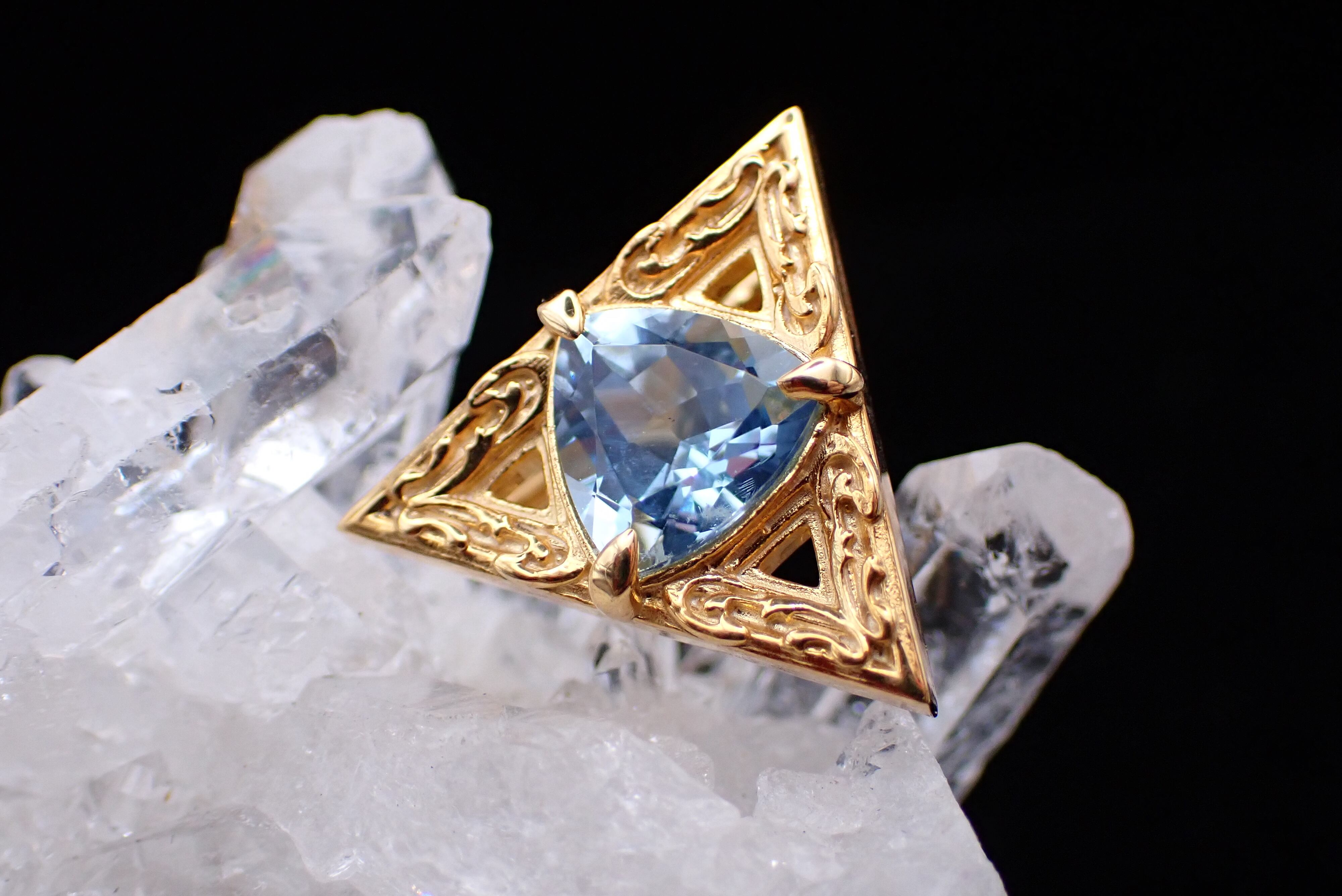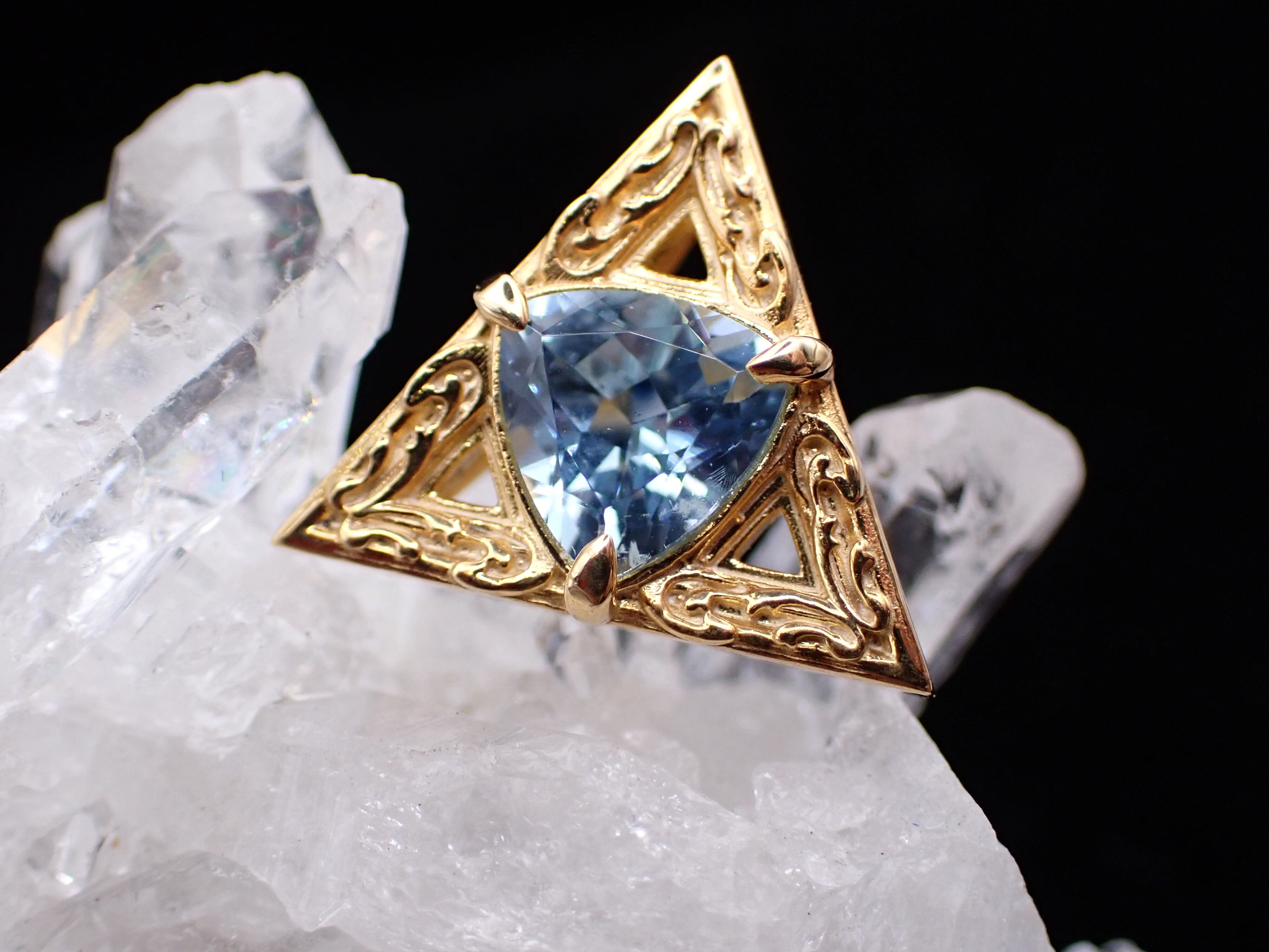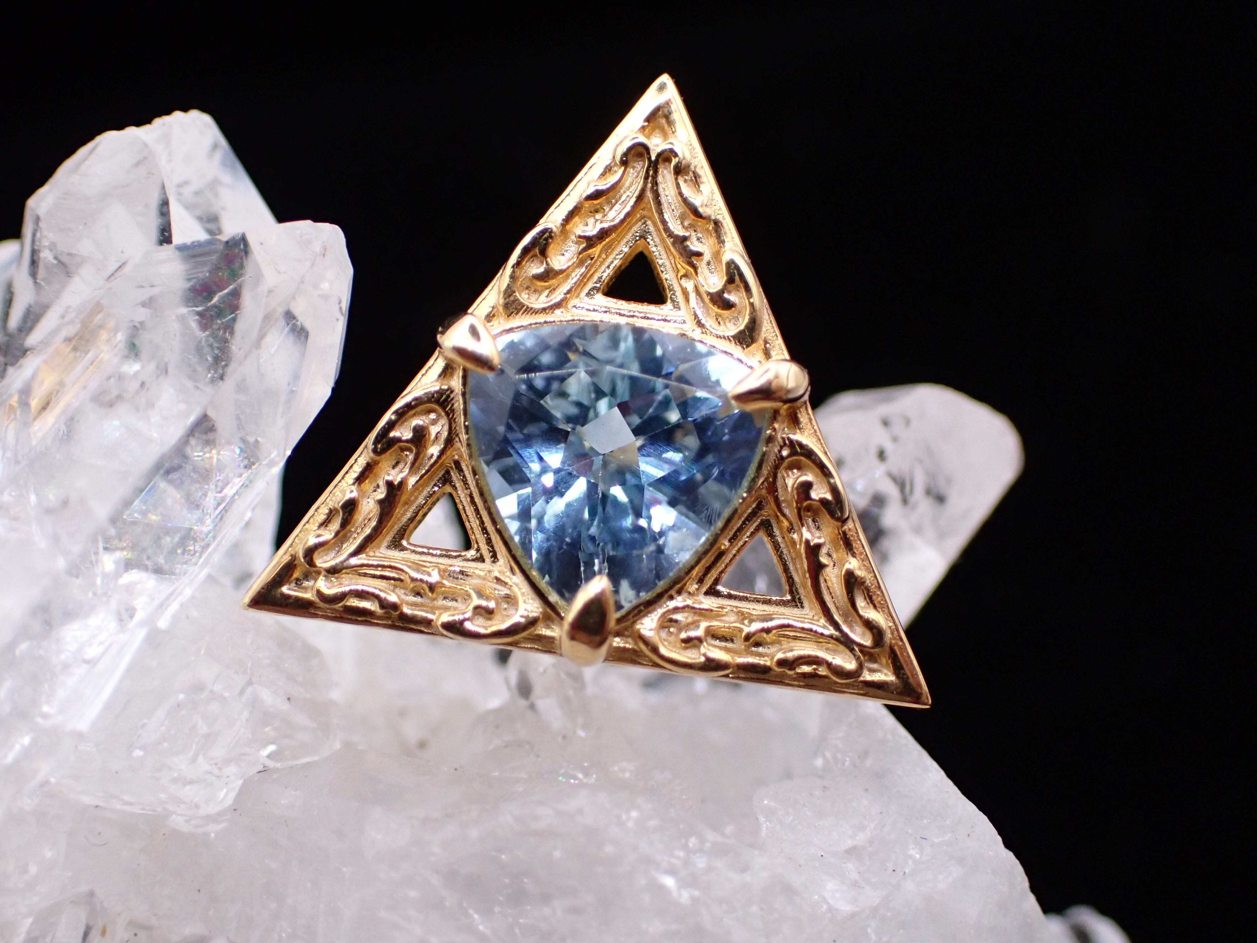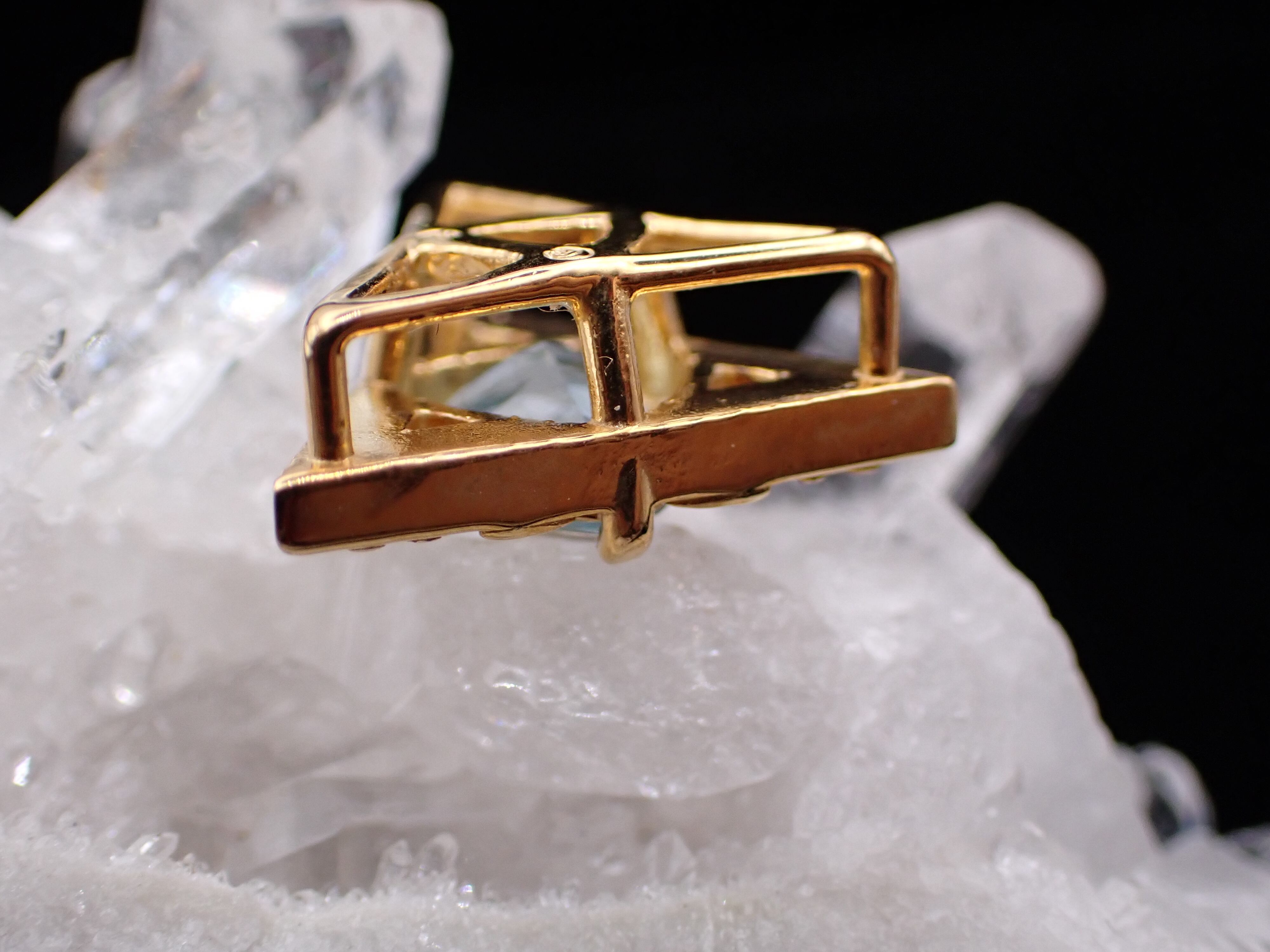まるで絵画のように美しい三角の額縁に、コンケーブカットのペリドットを納めました。