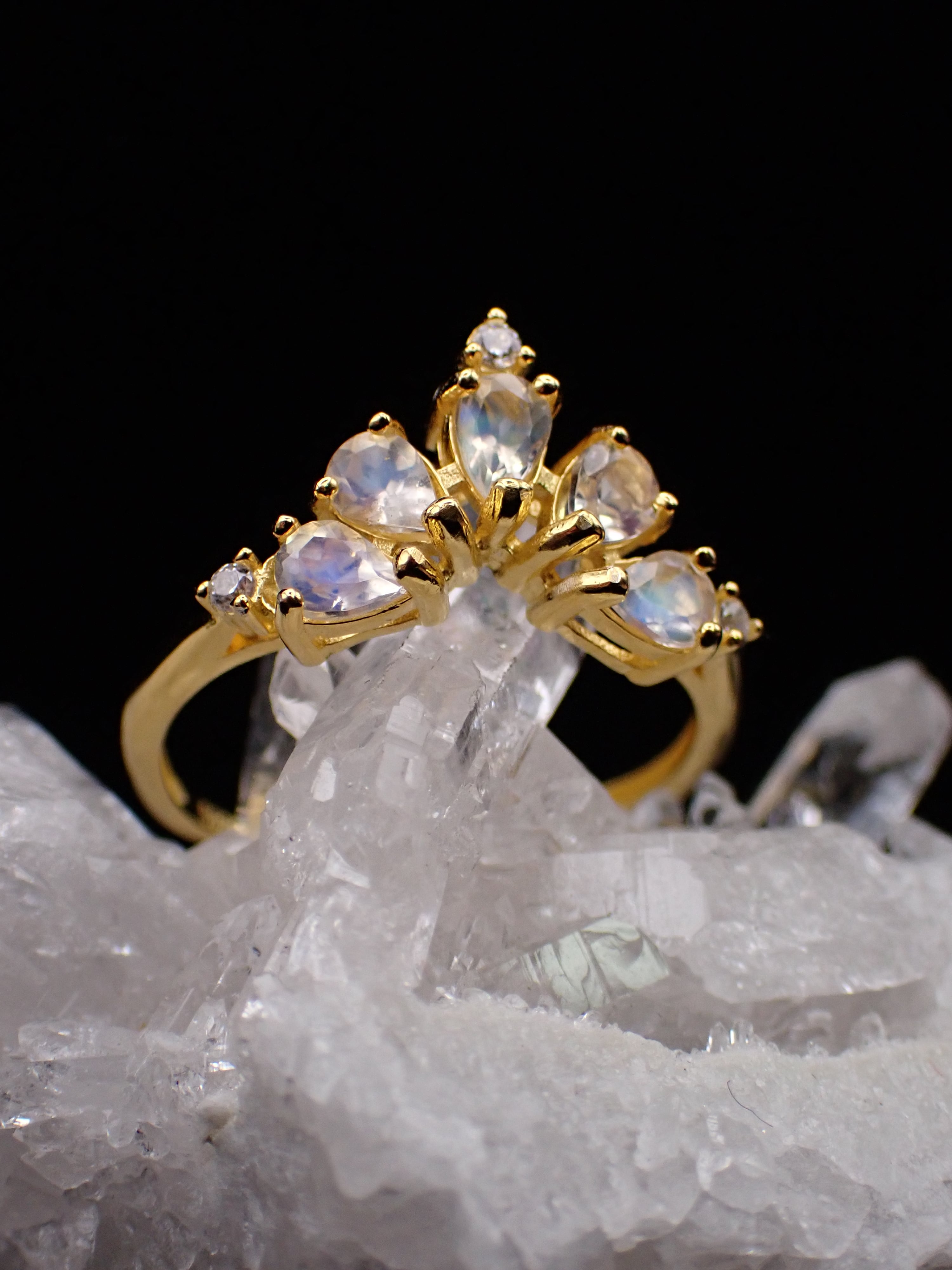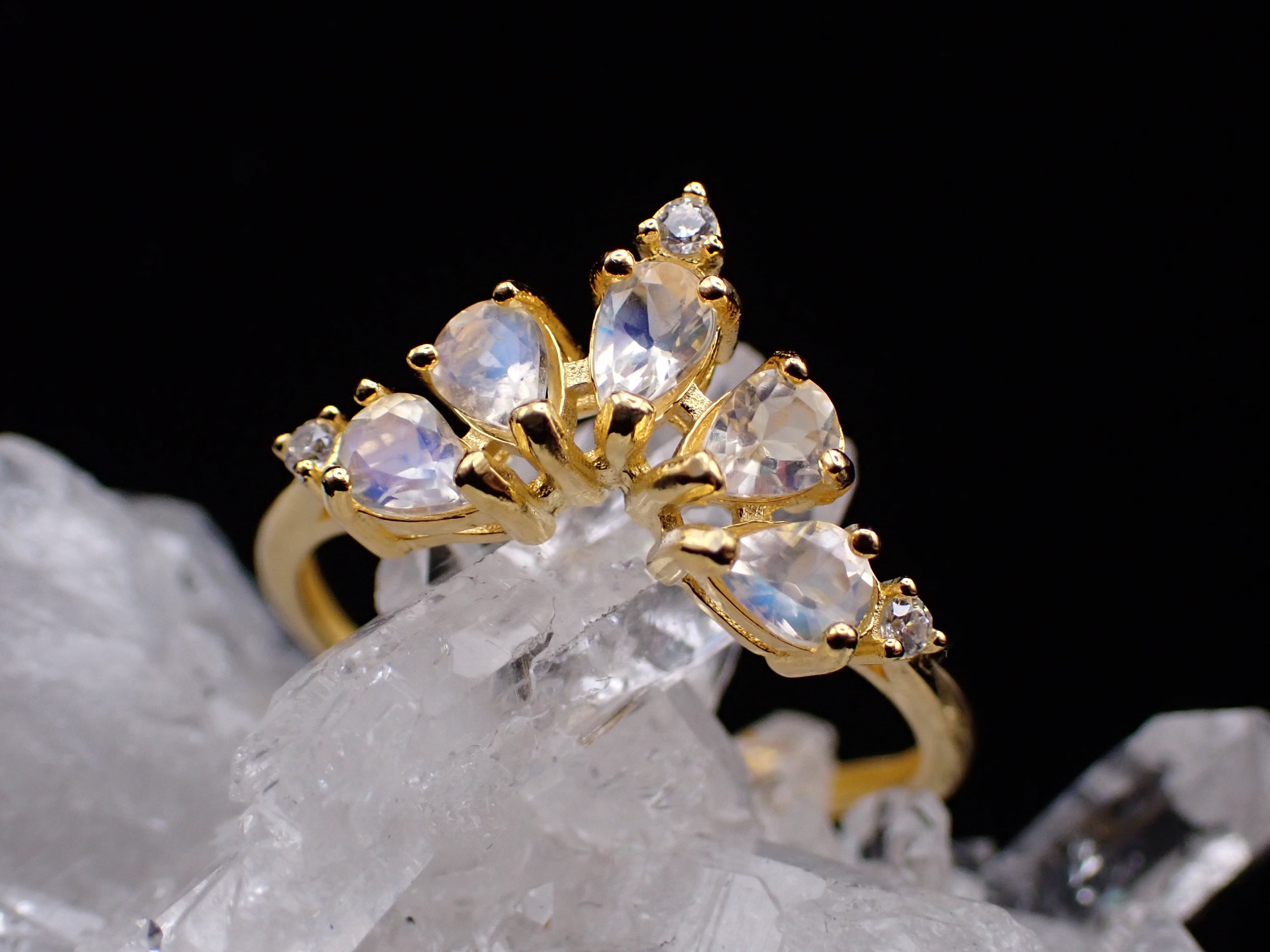 ドロップのアンデシンラブラドライトたちが5つ、孔雀が羽根をひろげたように並んだリングです。