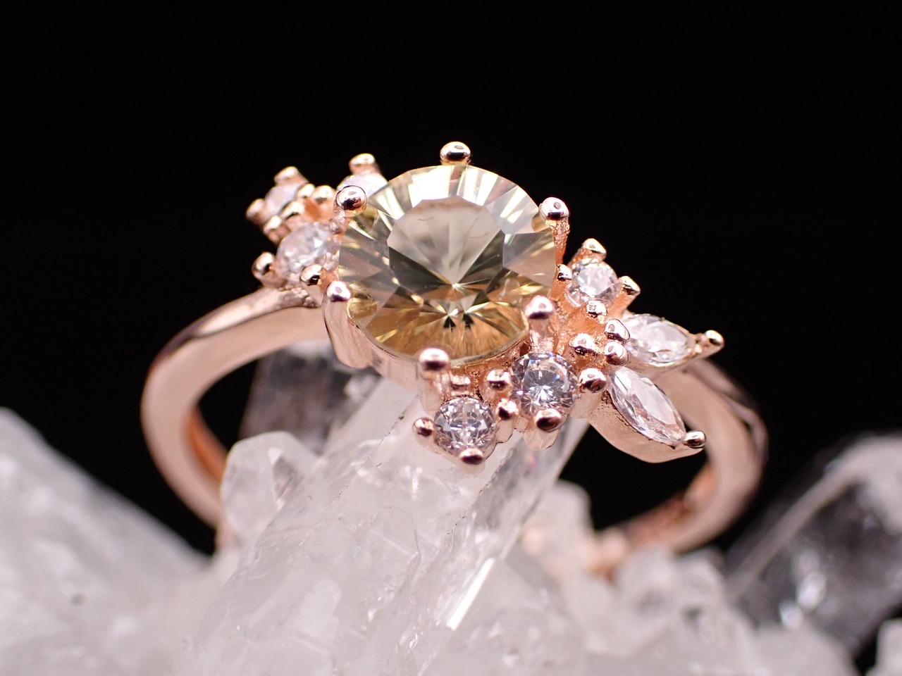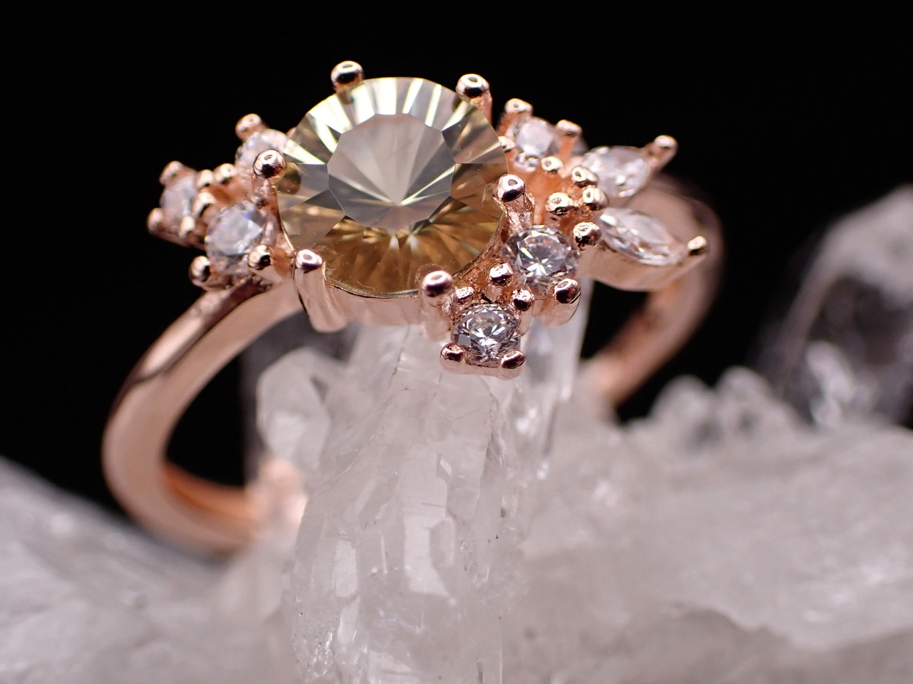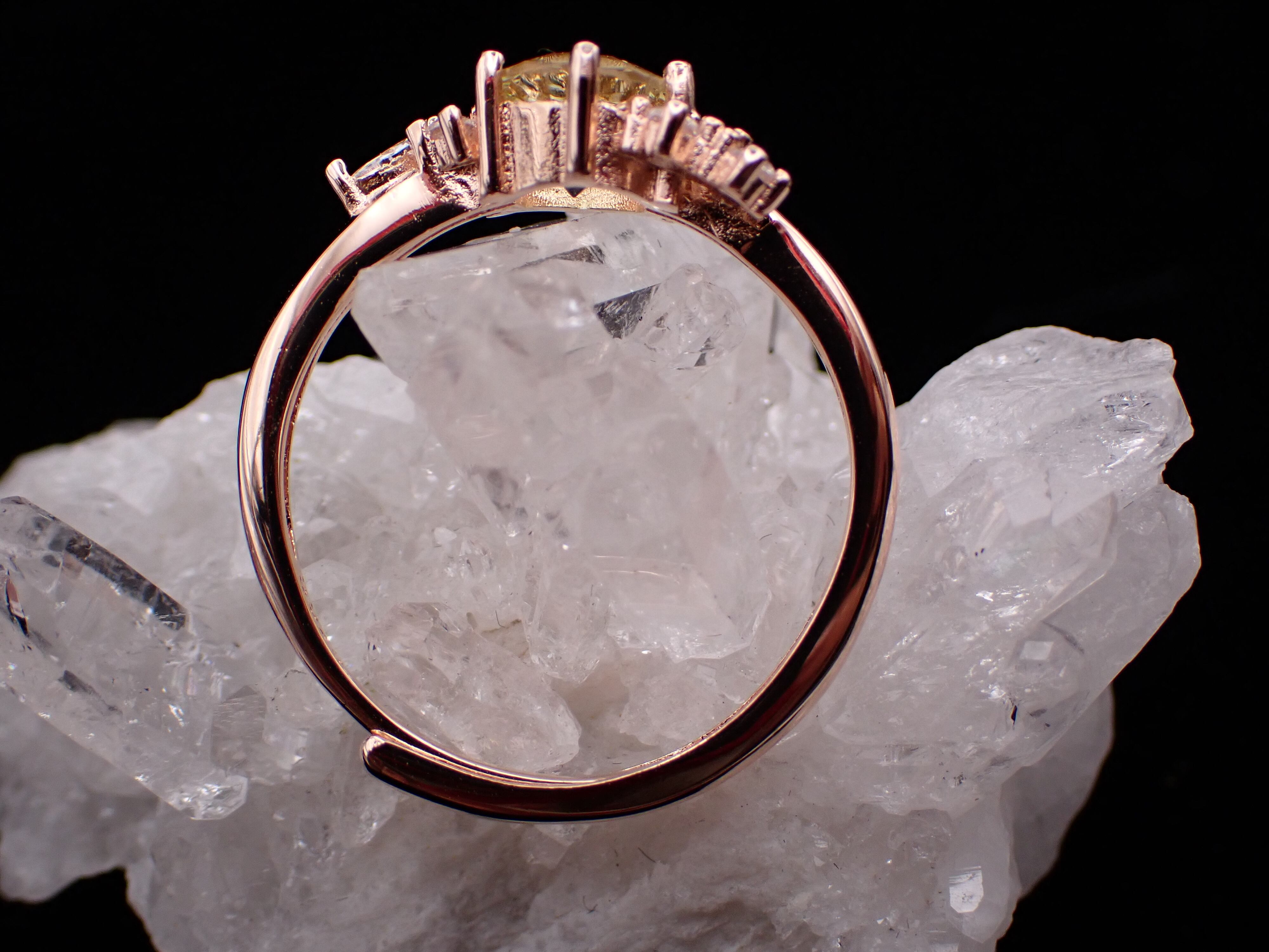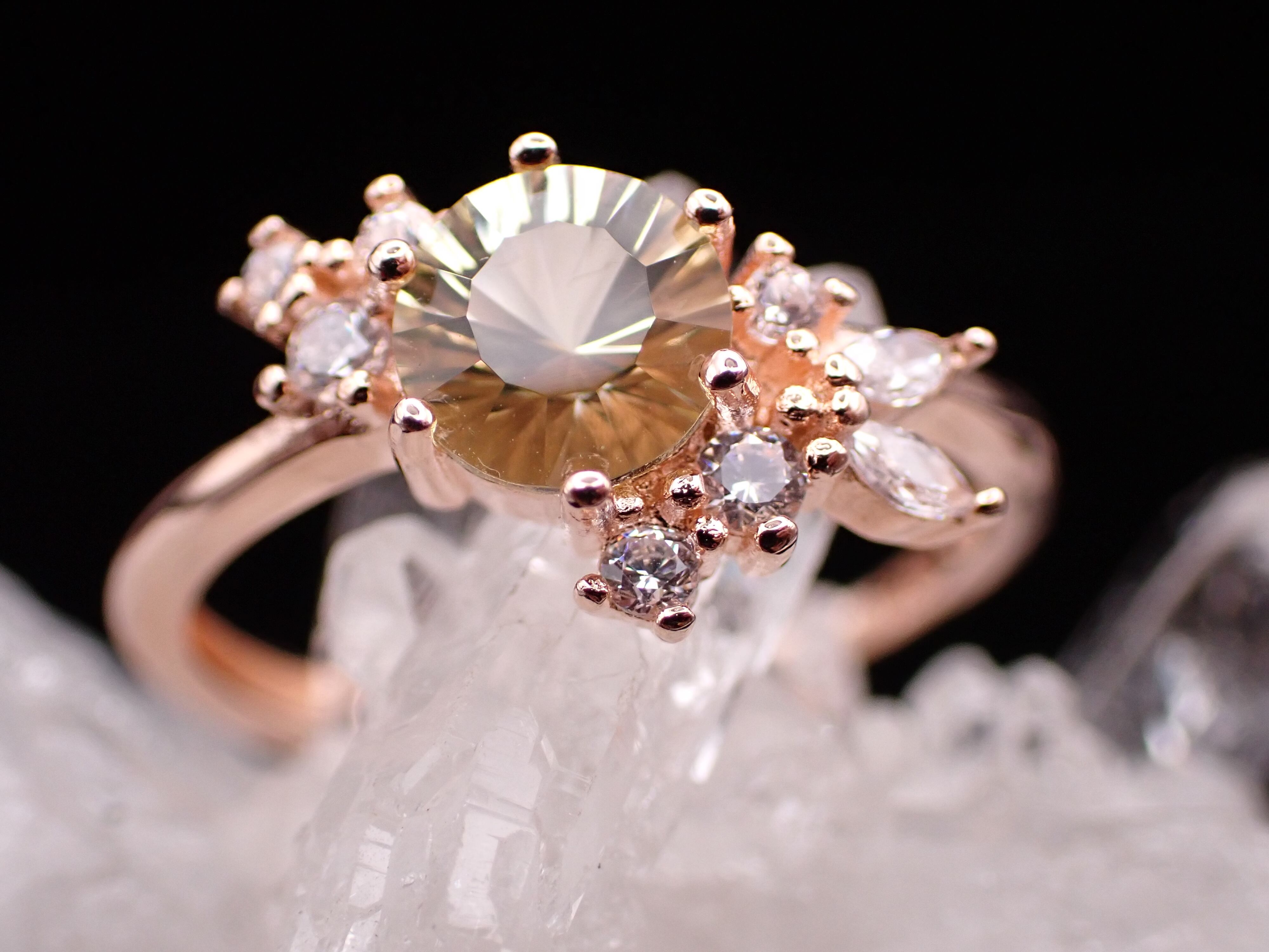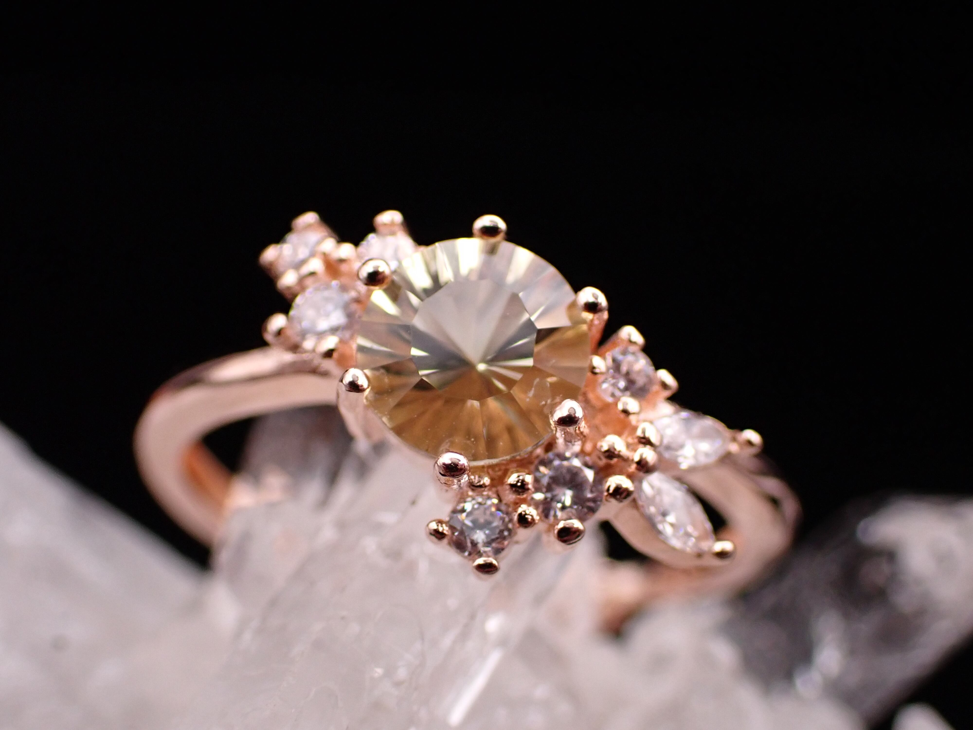 花束のように並んだ小さなジルコニアたちが、コンケーブカットが美しいレモンクォーツをさらに輝かせる繊細なリングです。