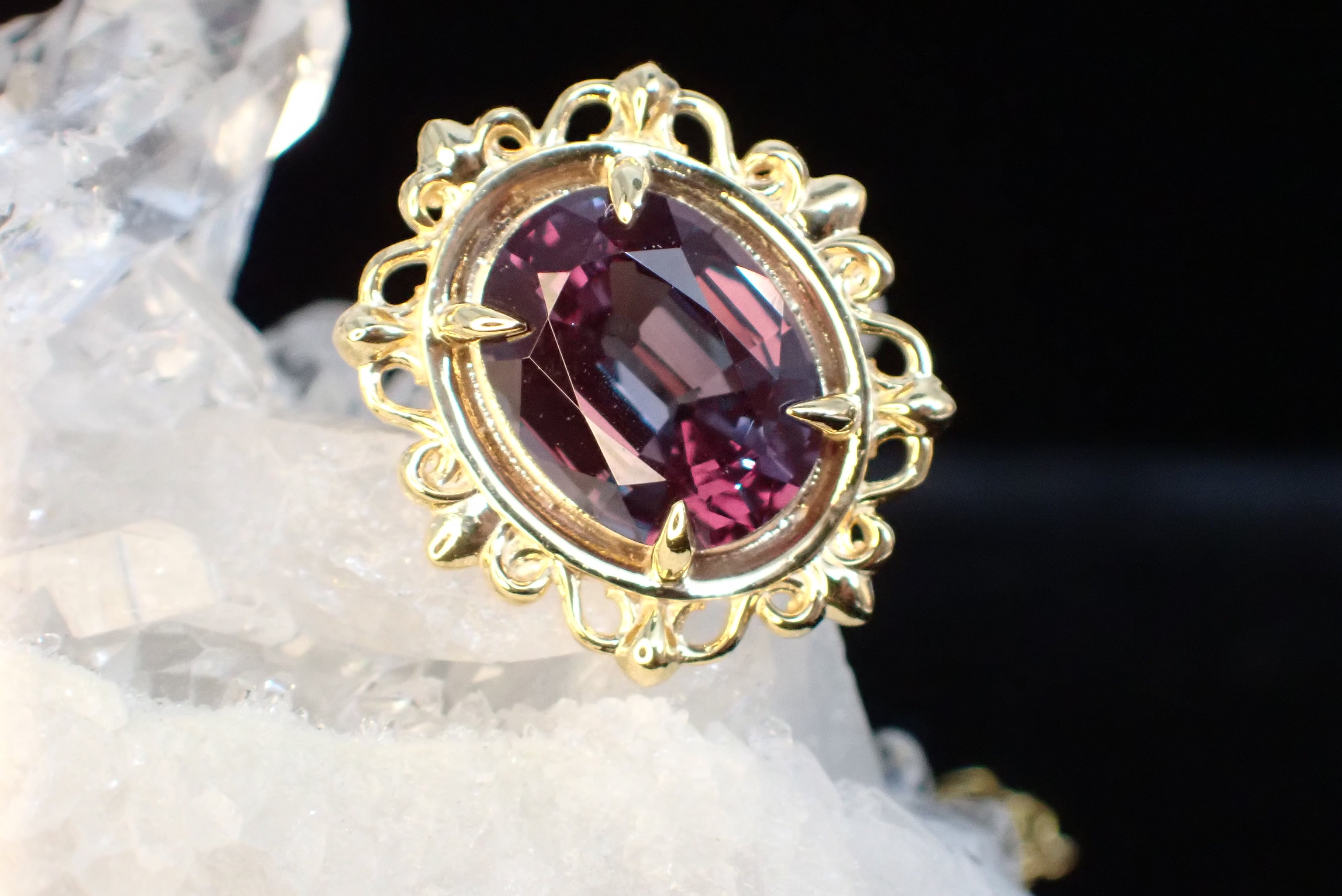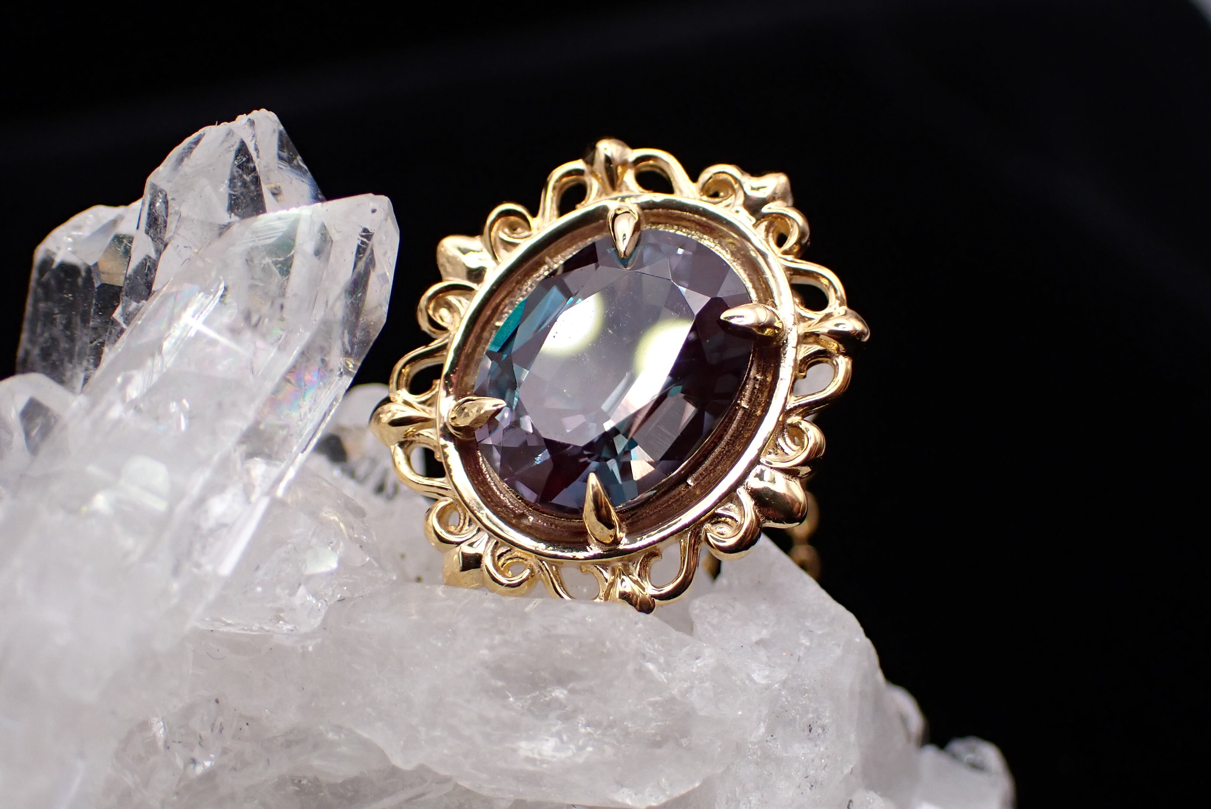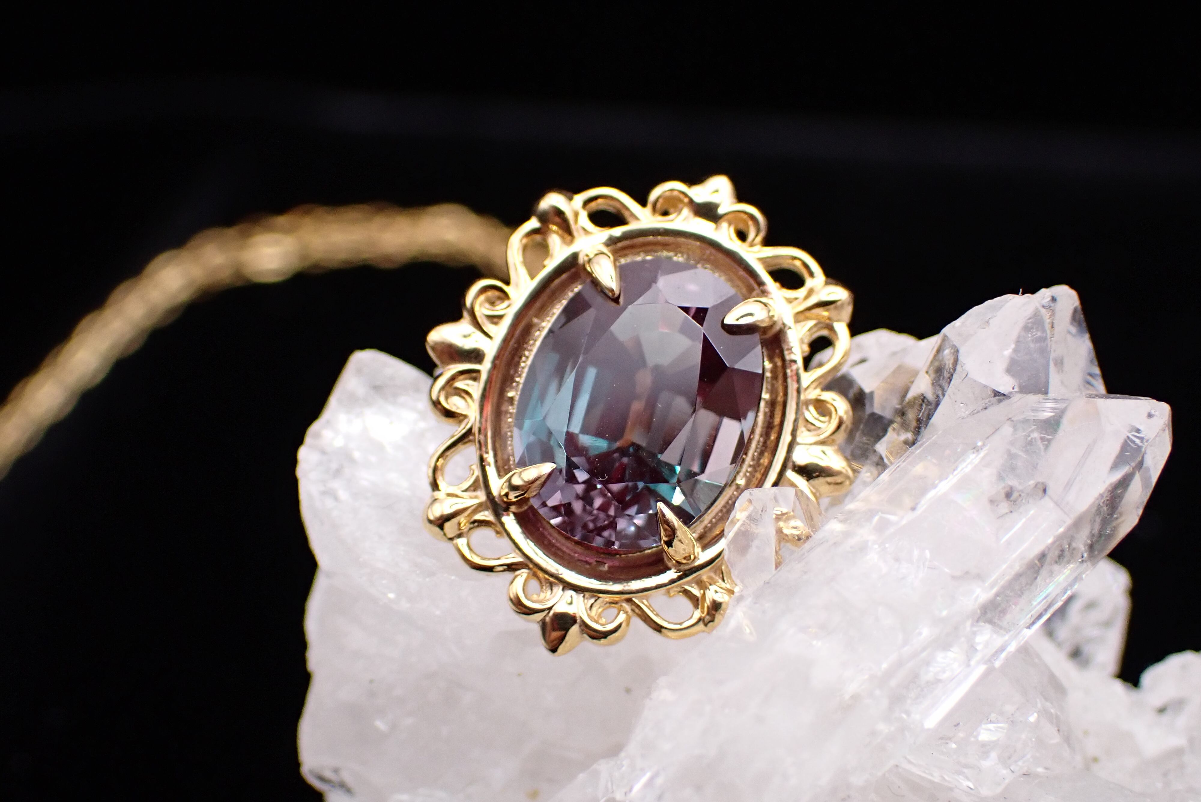 まるで石を絵画のように、美しい額縁の中へ合成アレキサンドライトを納めました。