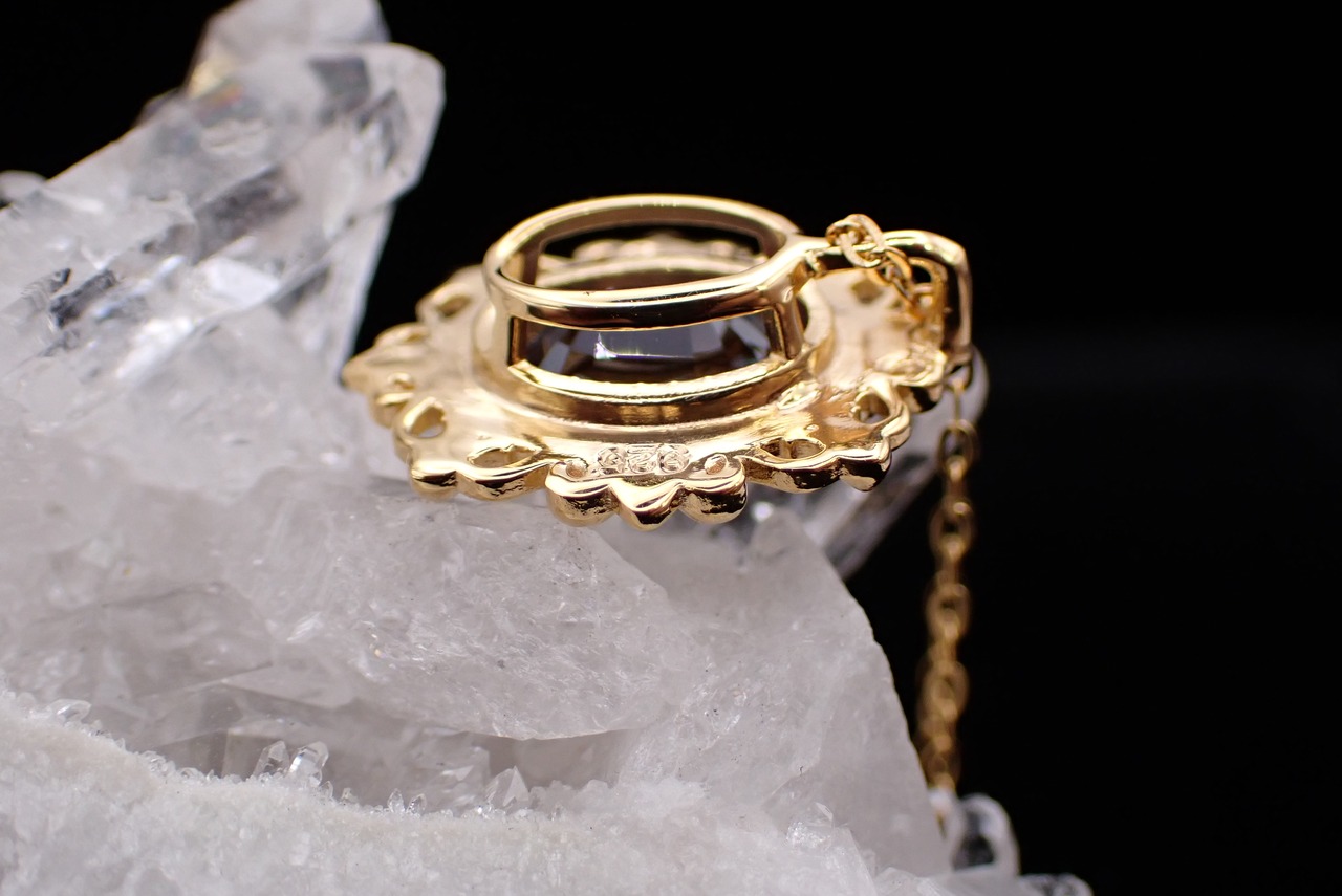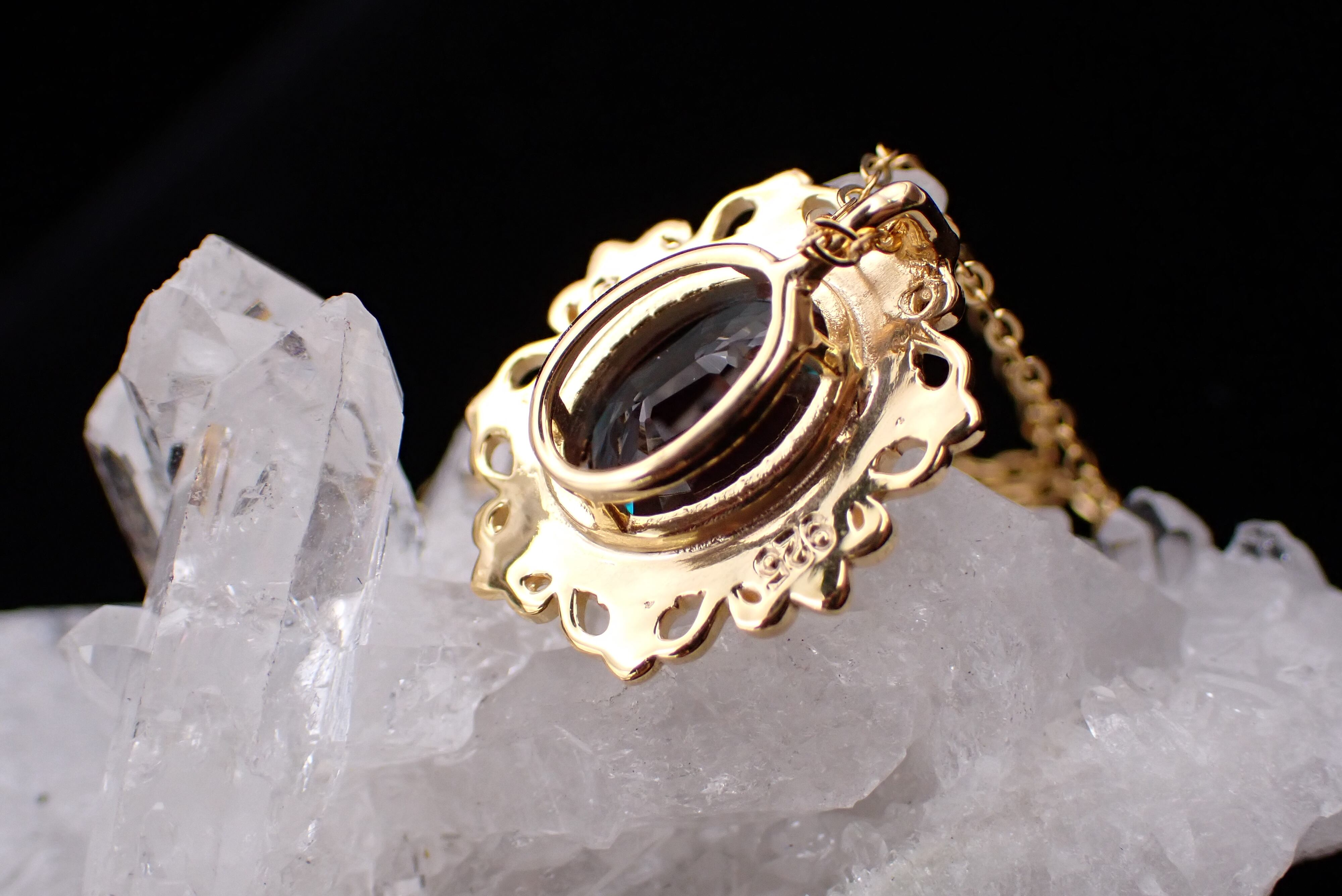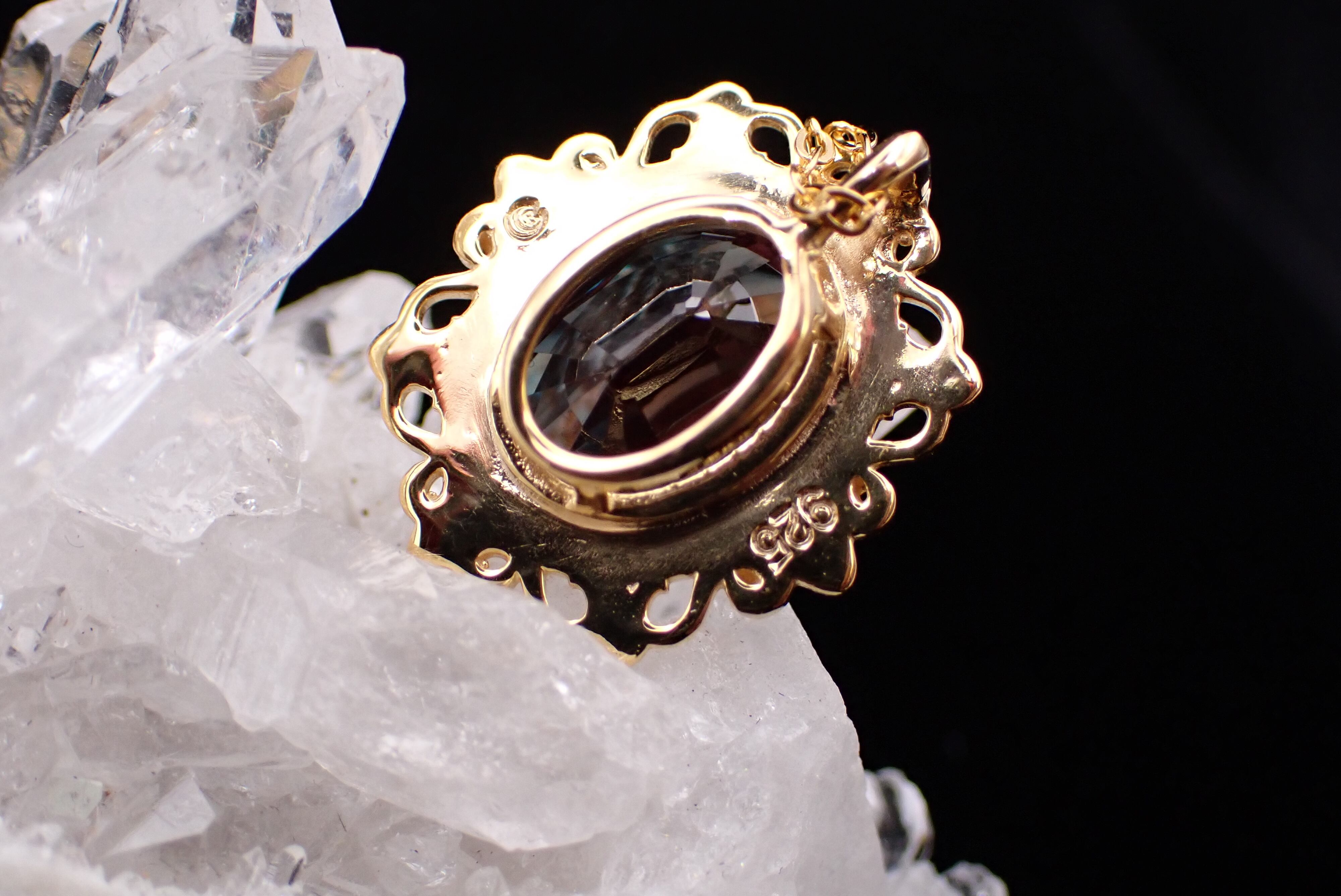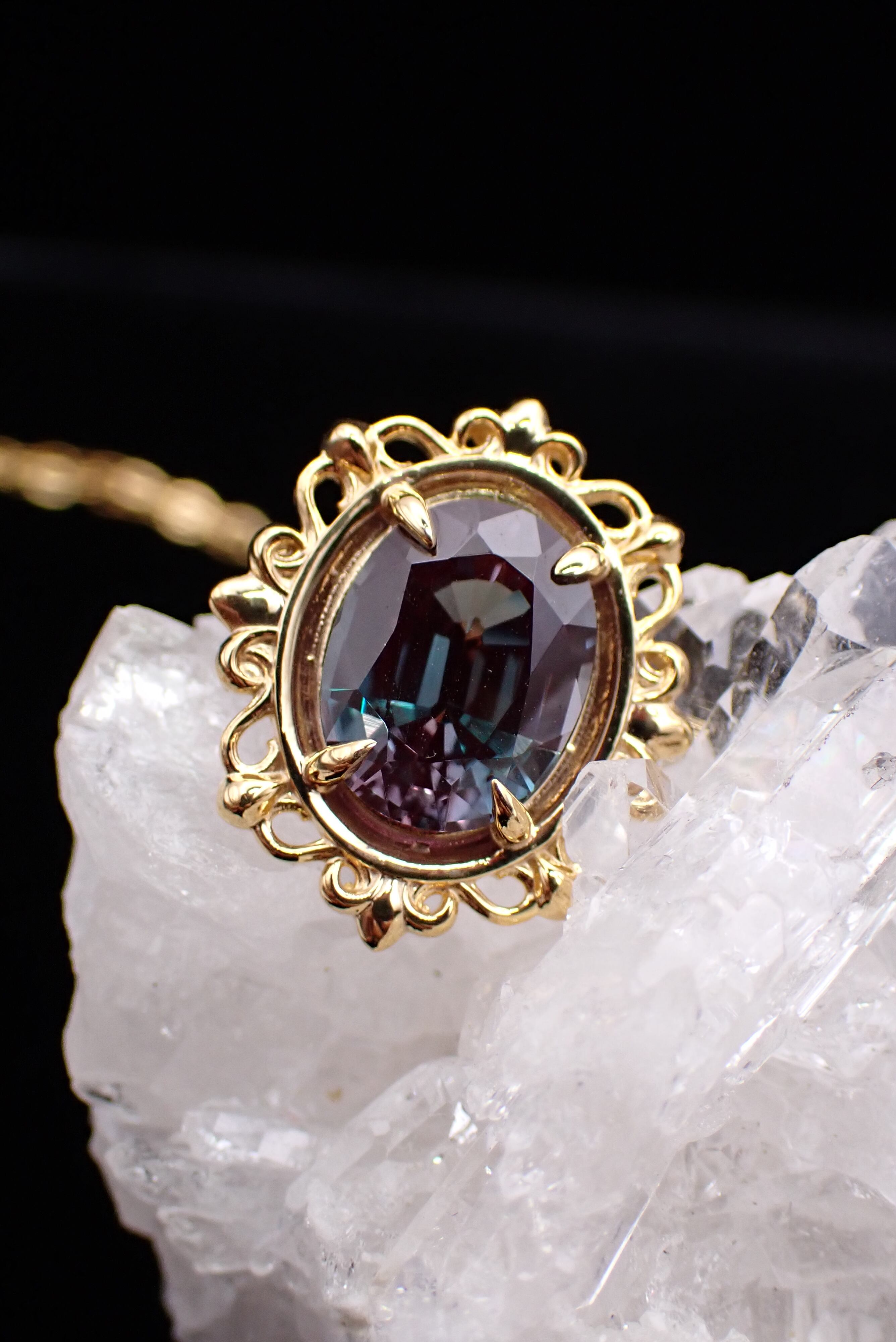 まるで石を絵画のように、美しい額縁の中へ合成アレキサンドライトを納めました。