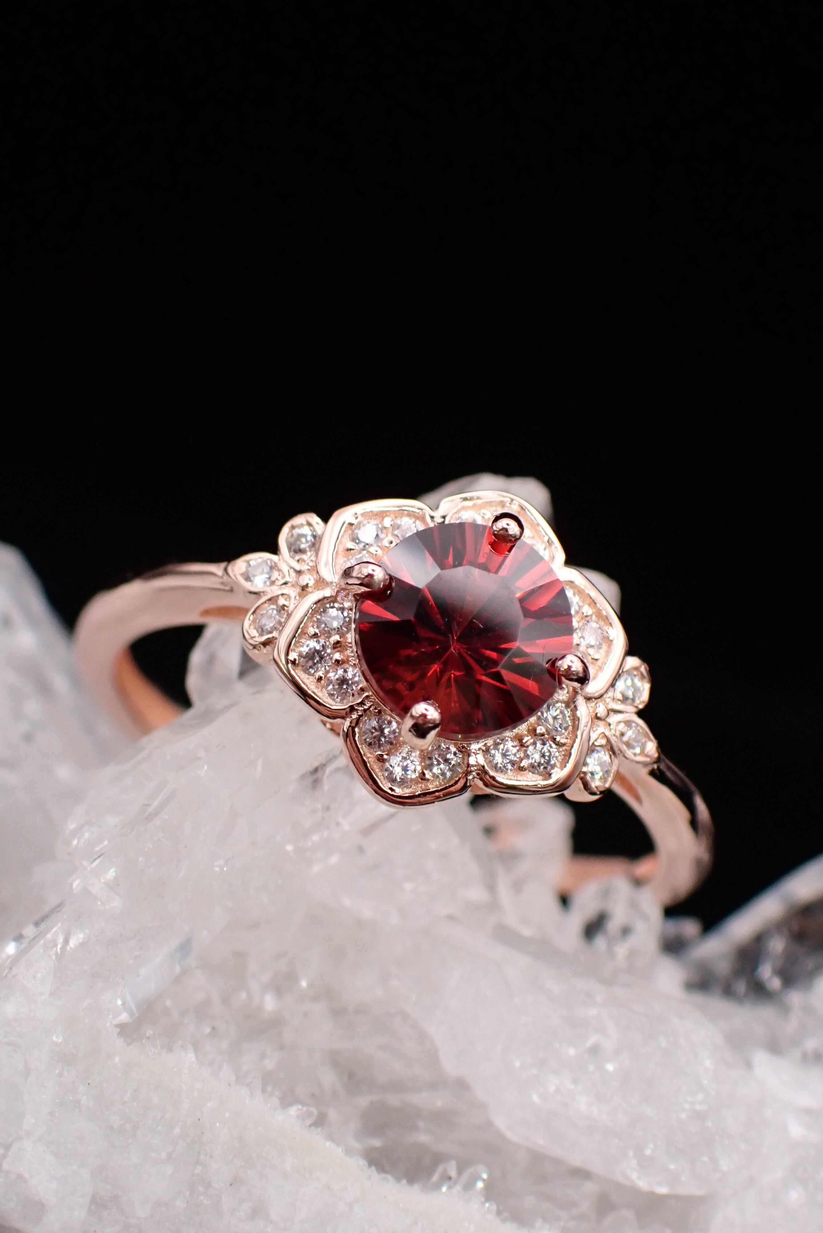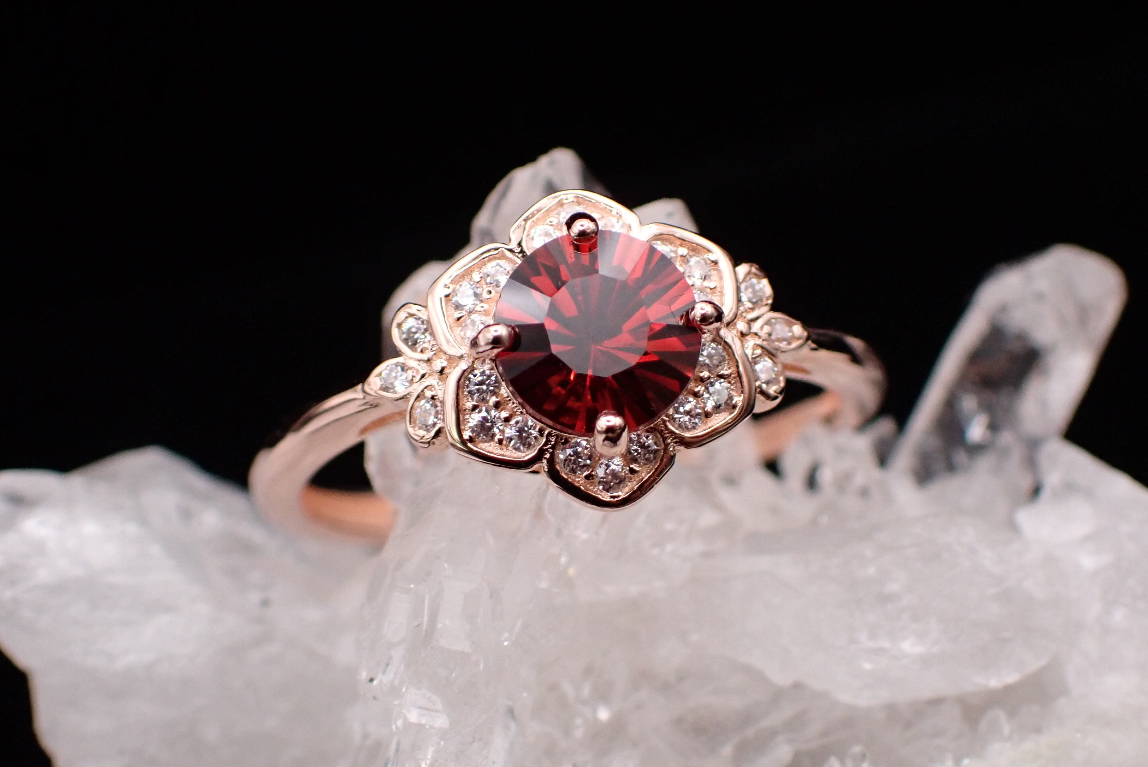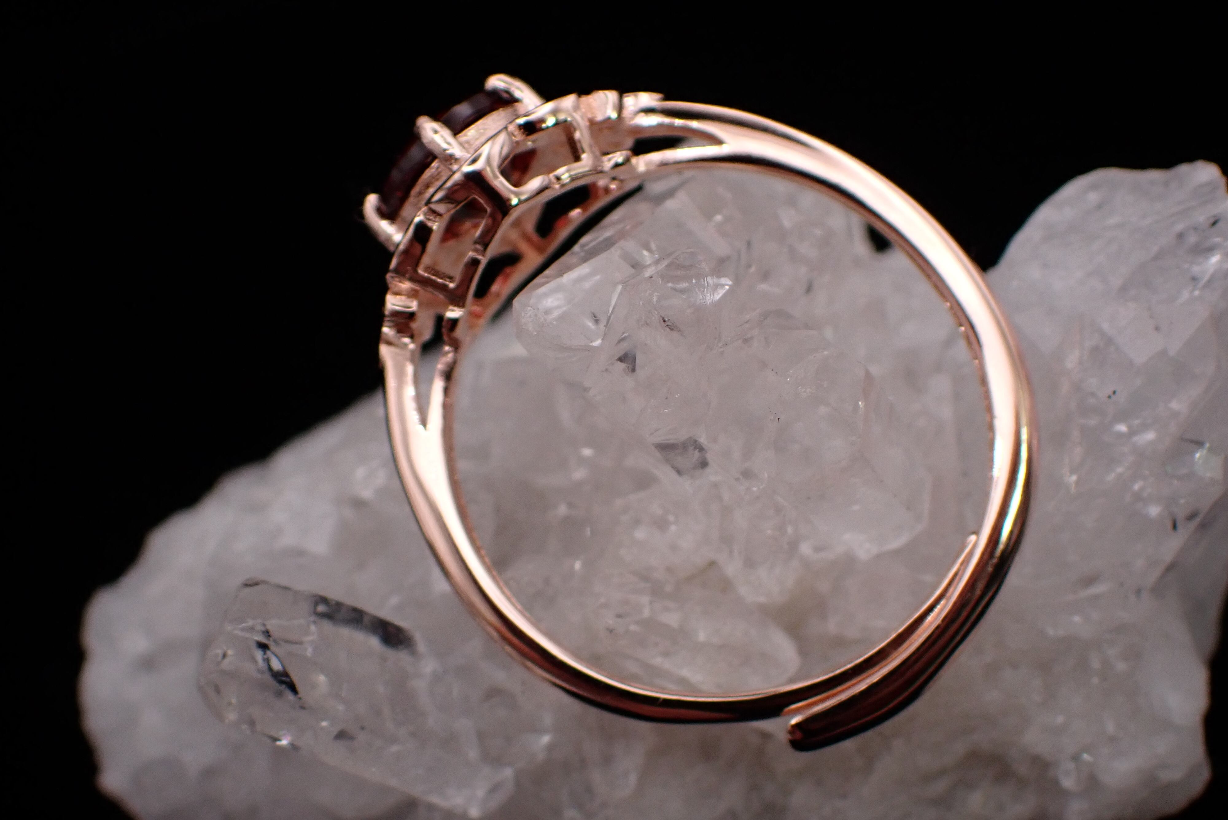 桔梗の花びらの中央に咲き誇る美しいコンケーブカットのガーネット。