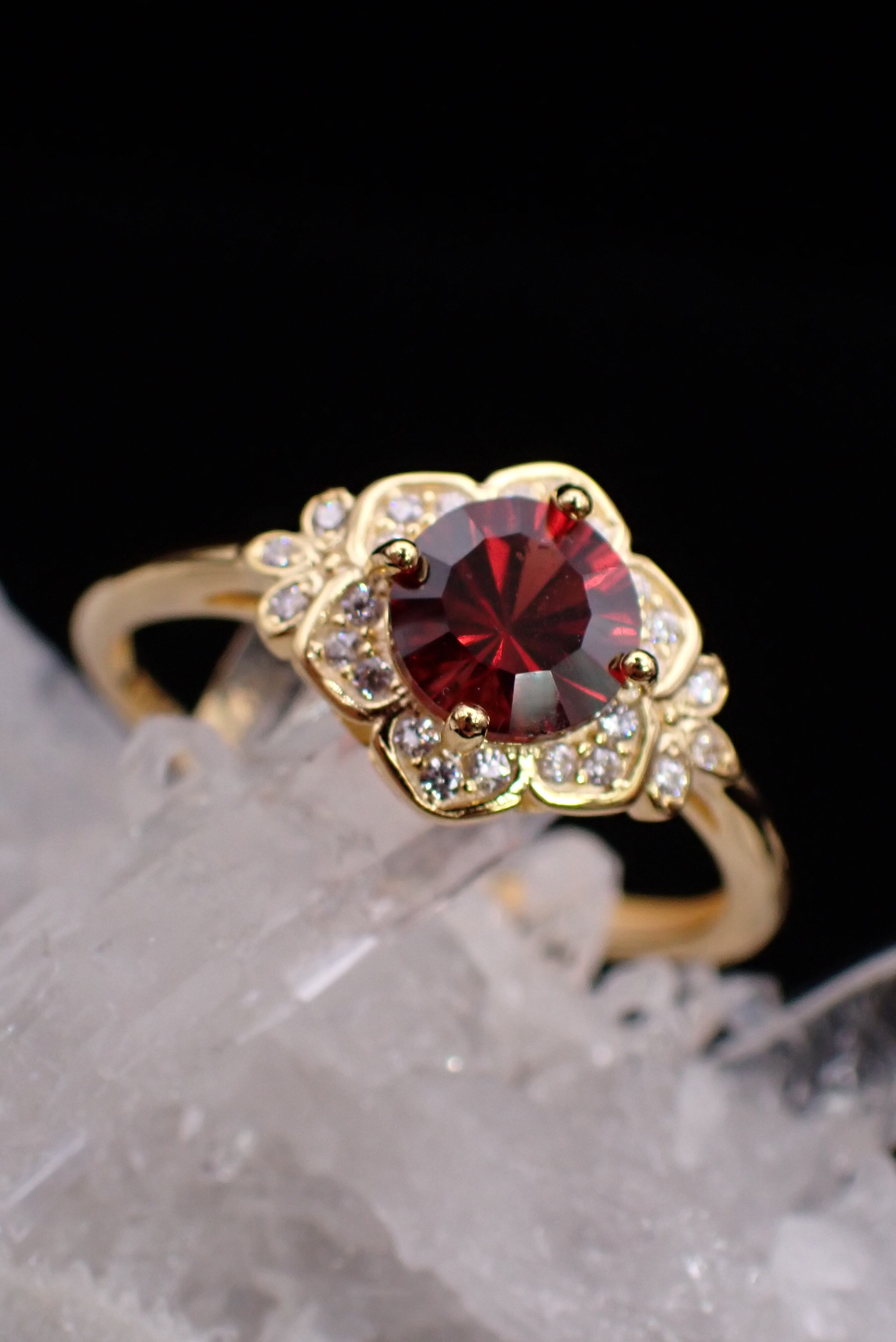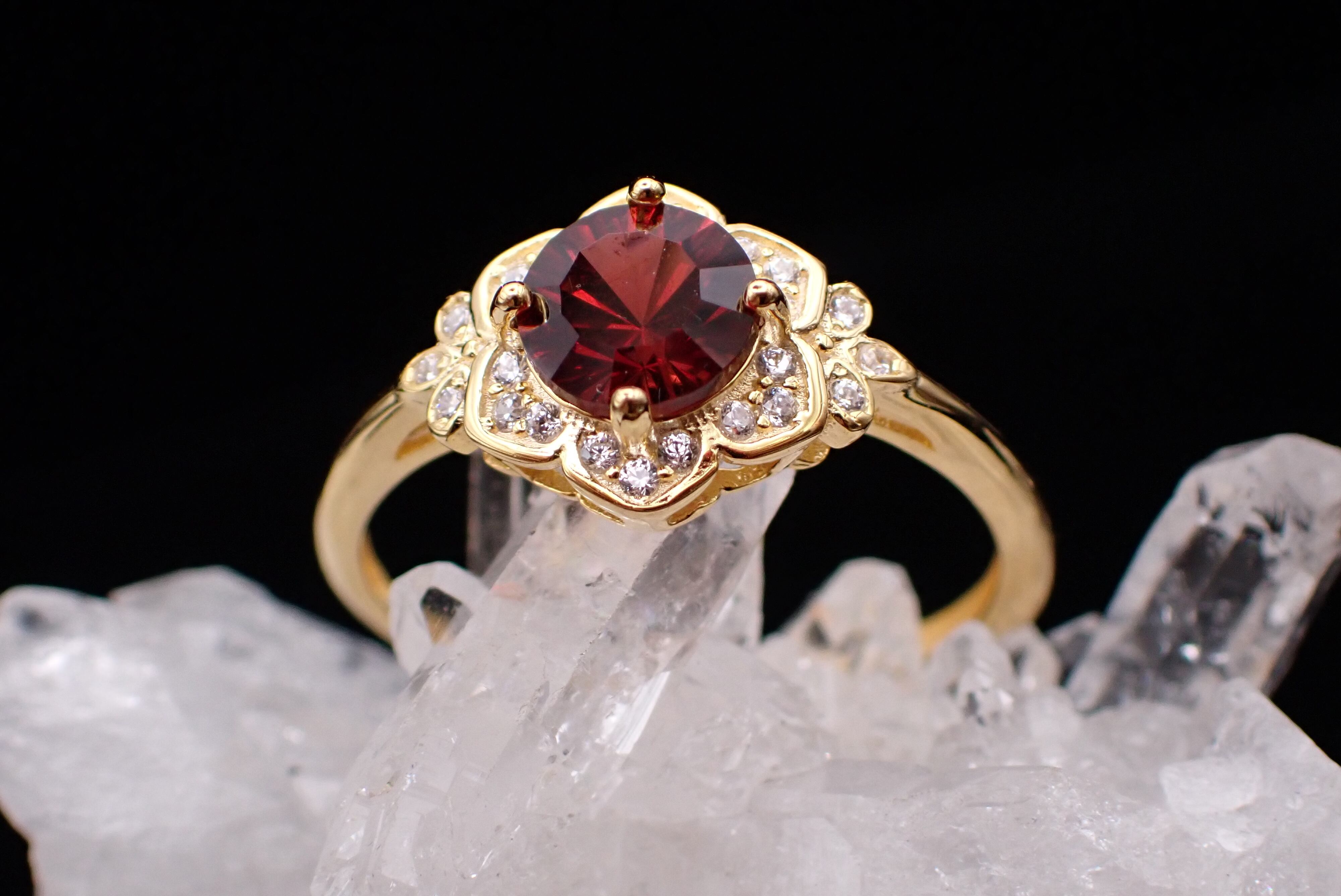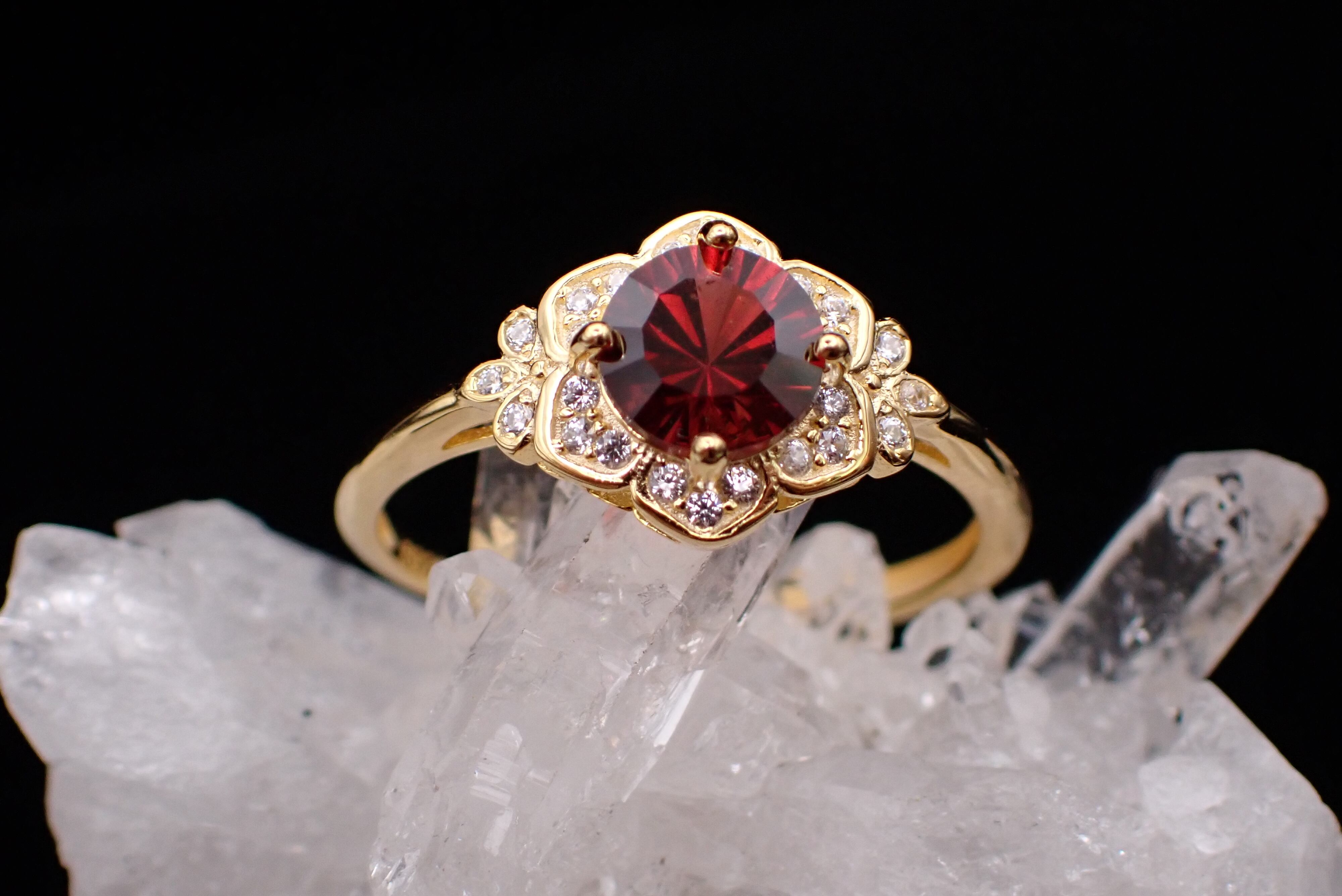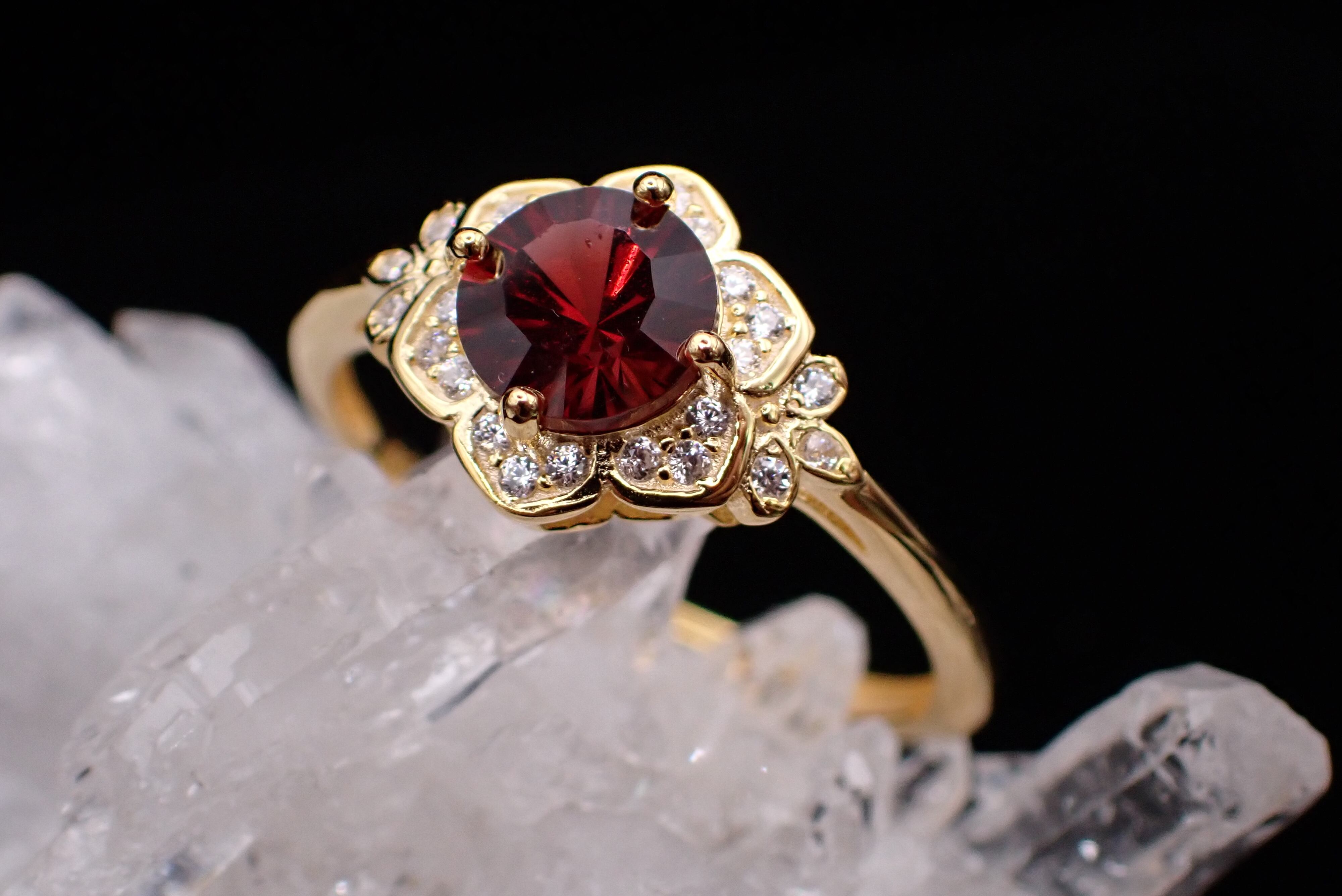 桔梗の花びらの中央に咲き誇る美しいコンケーブカットのガーネット。