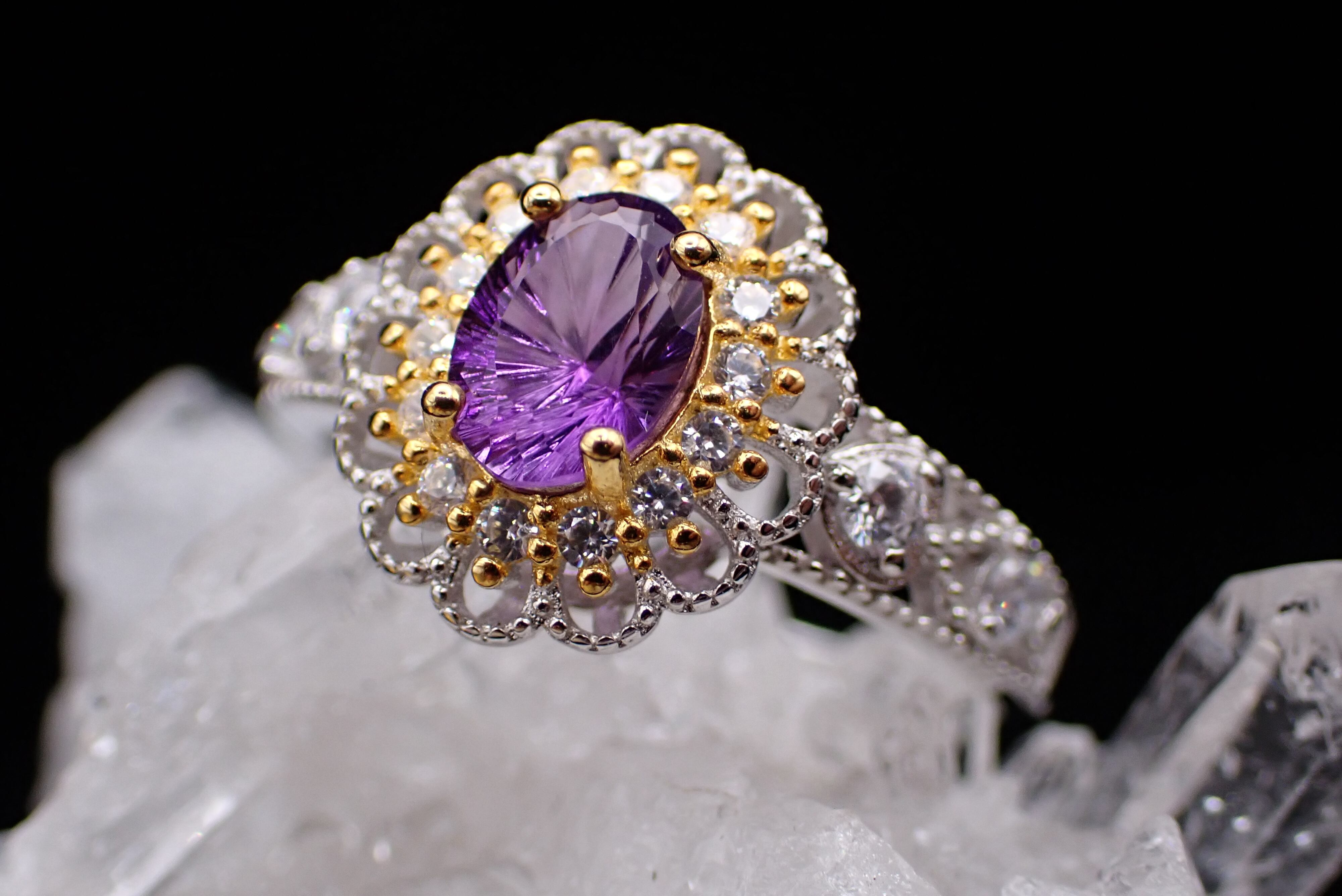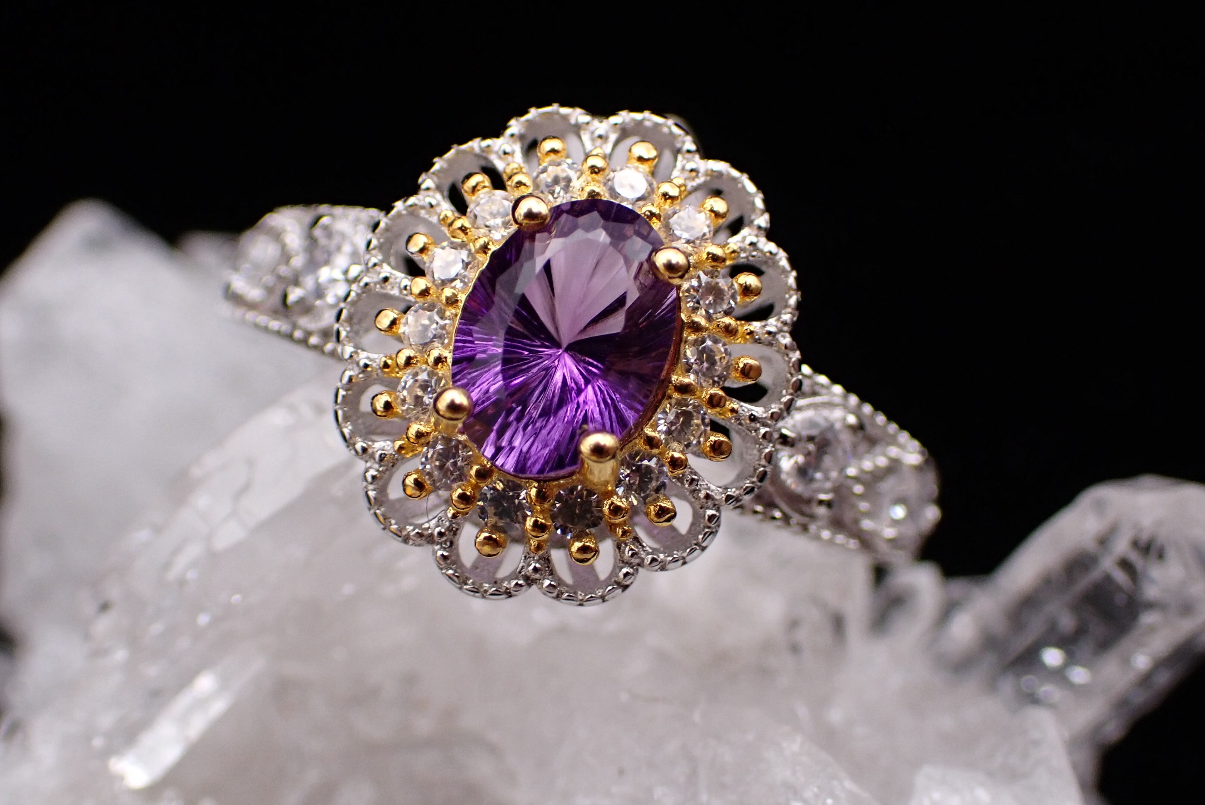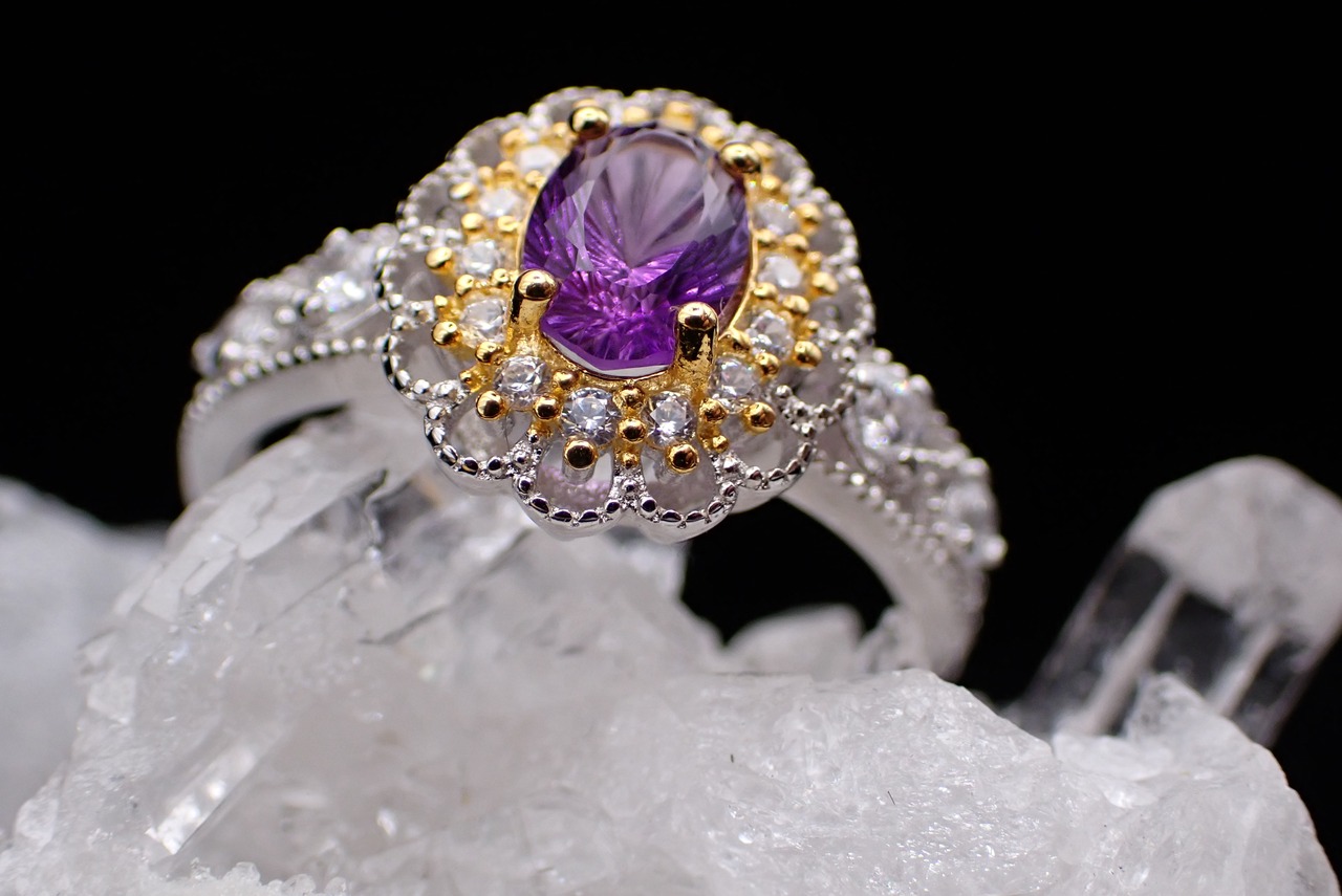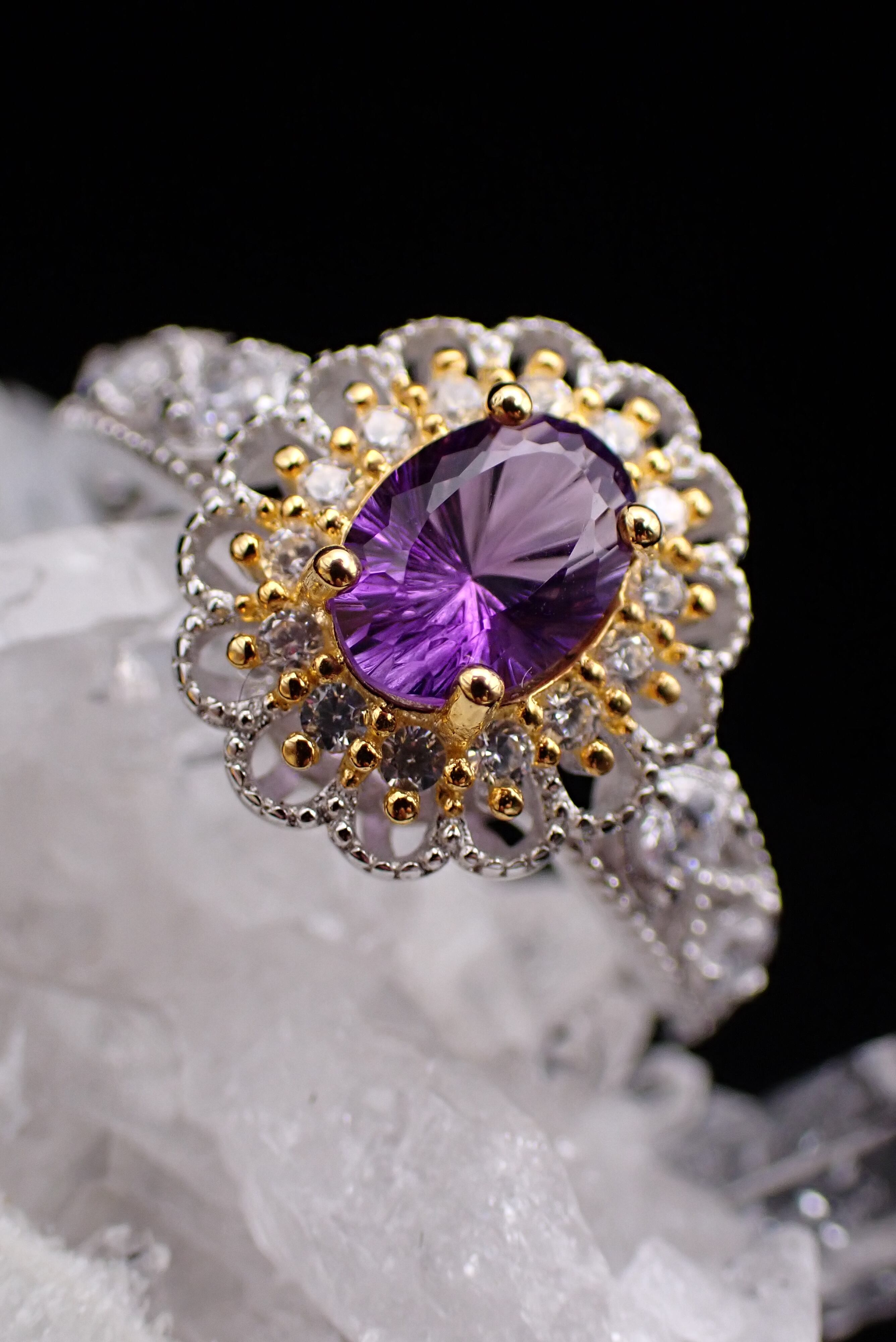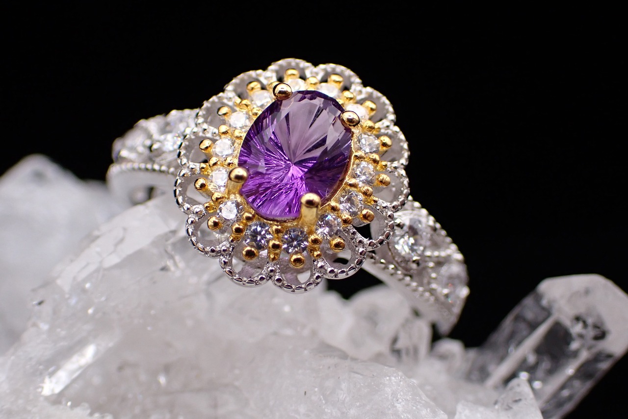 特殊カットの美しいアメジストが中央に鎮座したゴージャスなリングです。