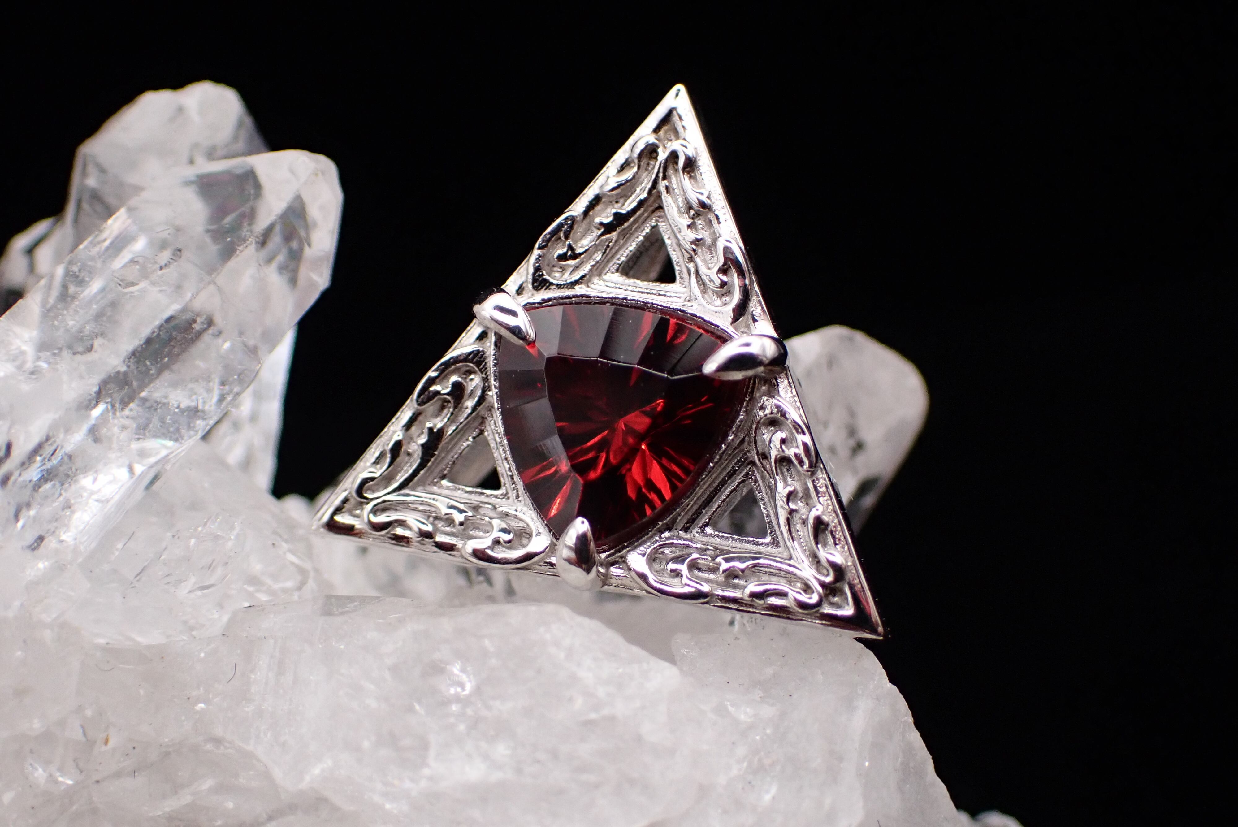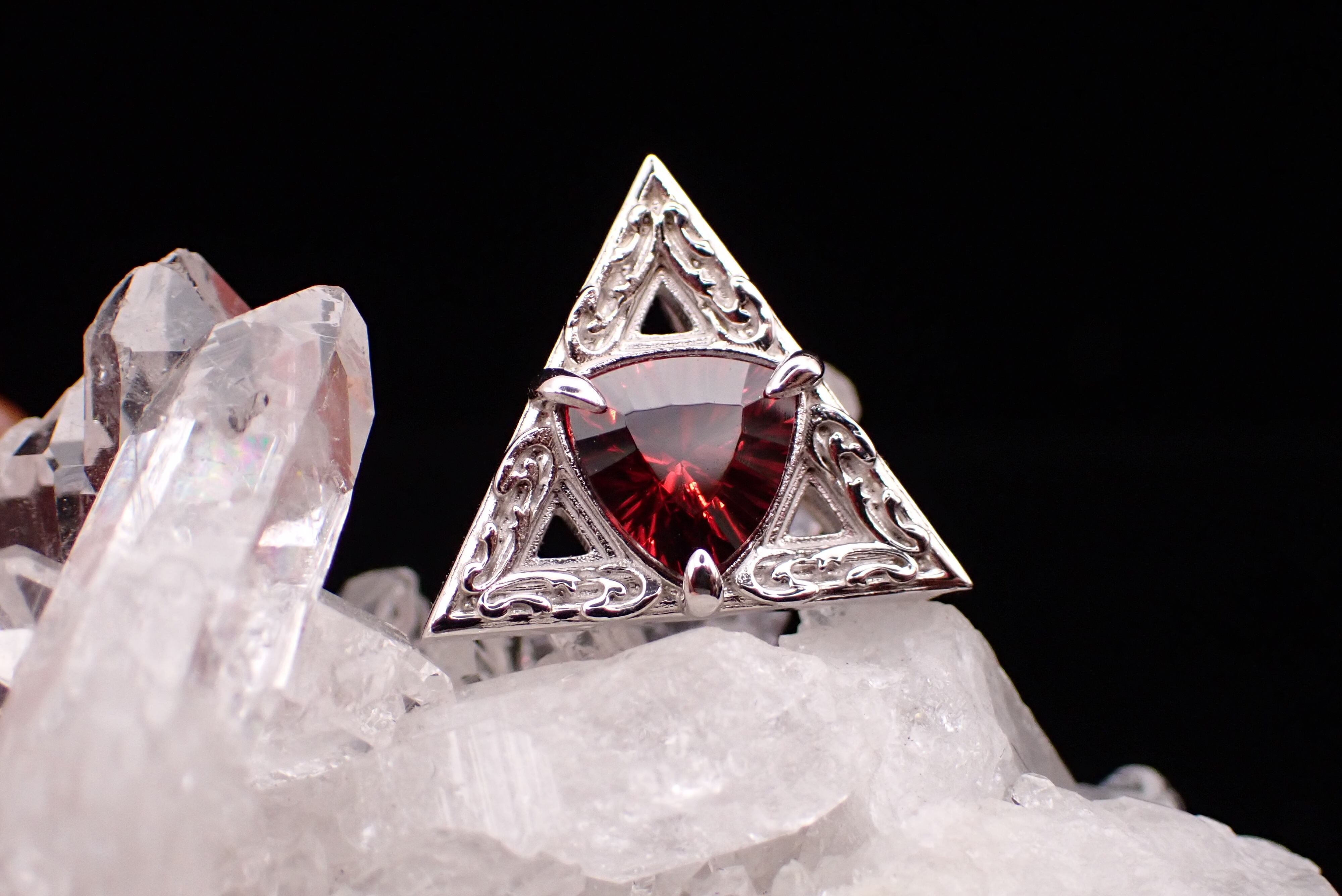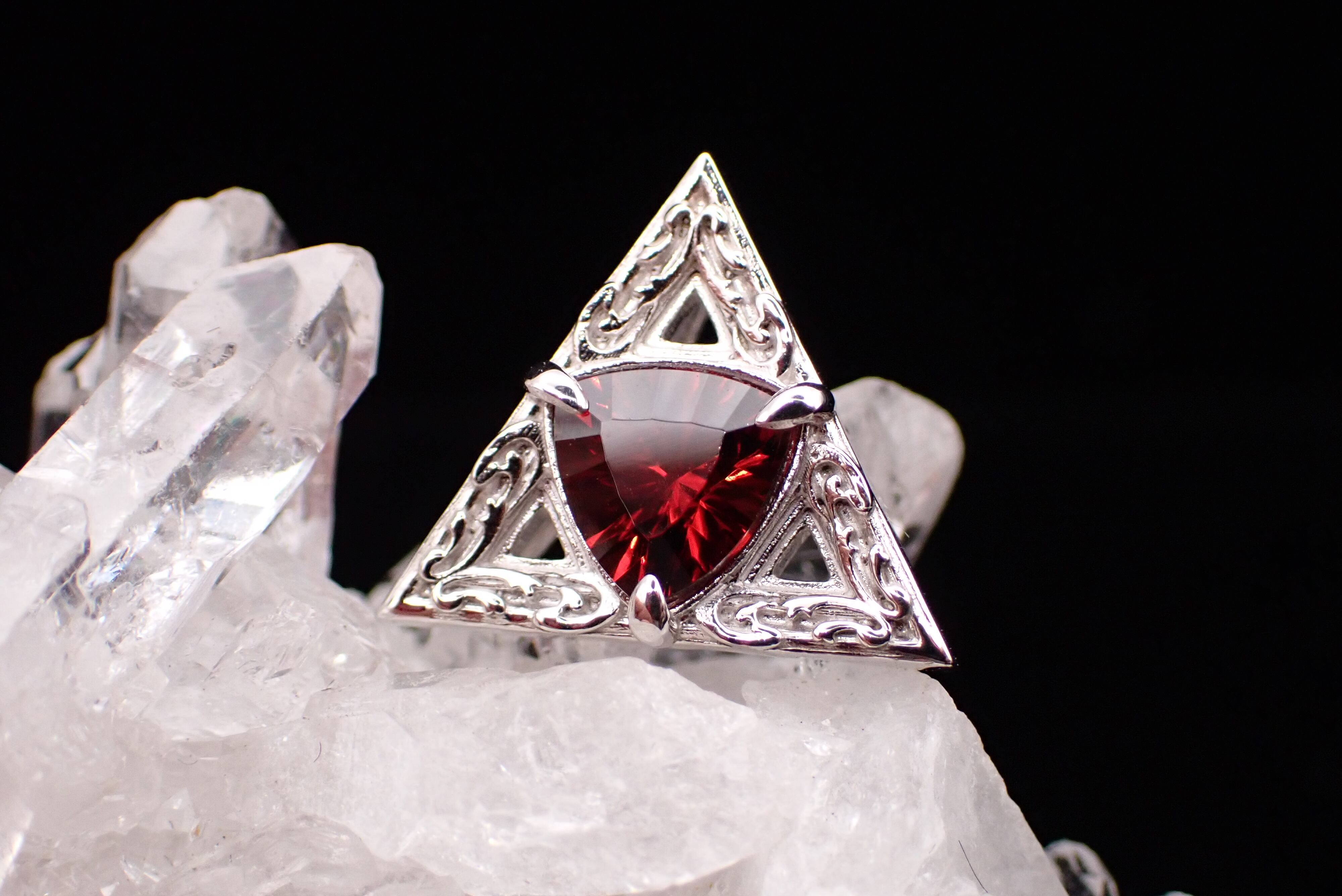 まるで絵画のように美しい三角の額縁に、コンケーブカットのガーネットを納めました。
