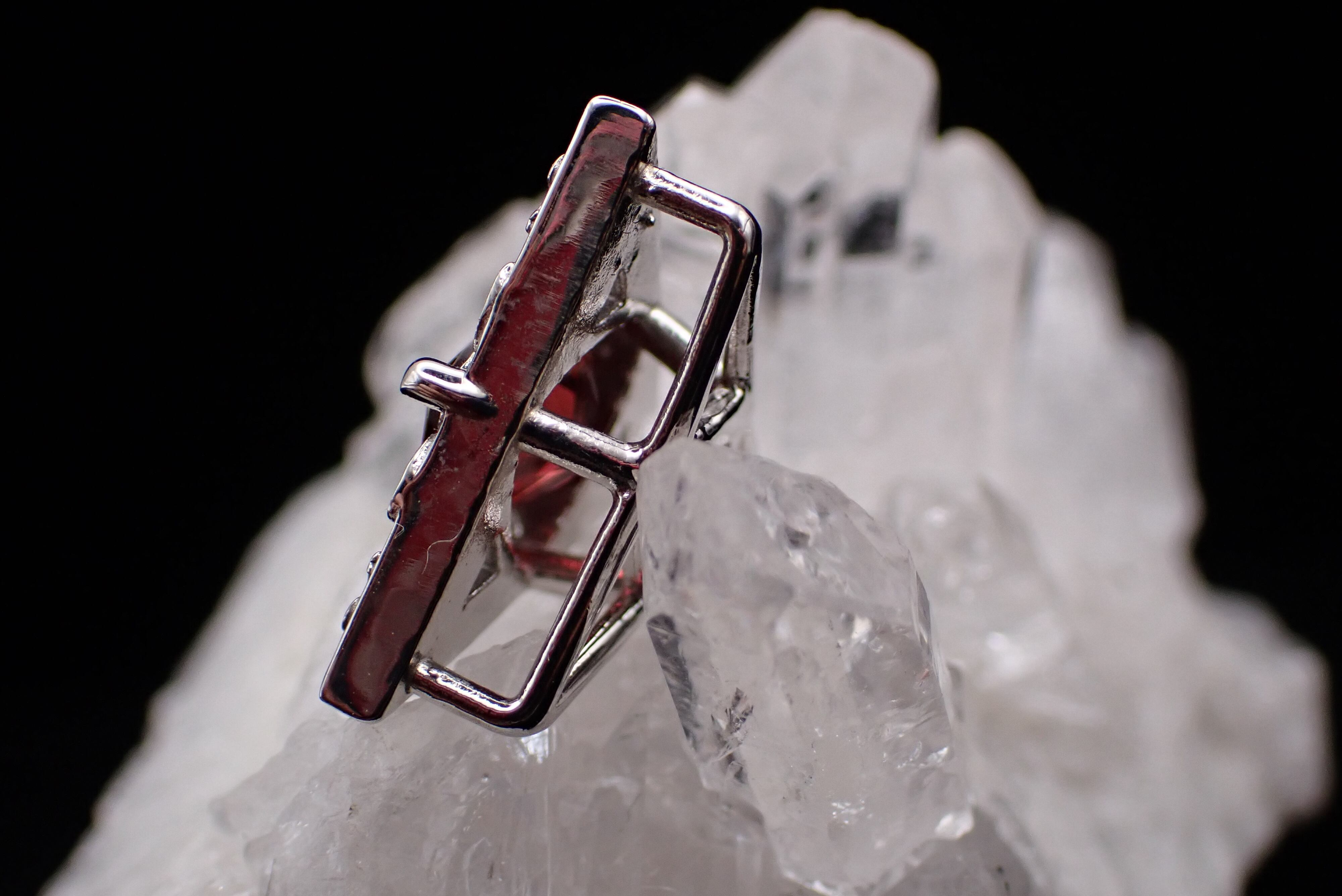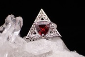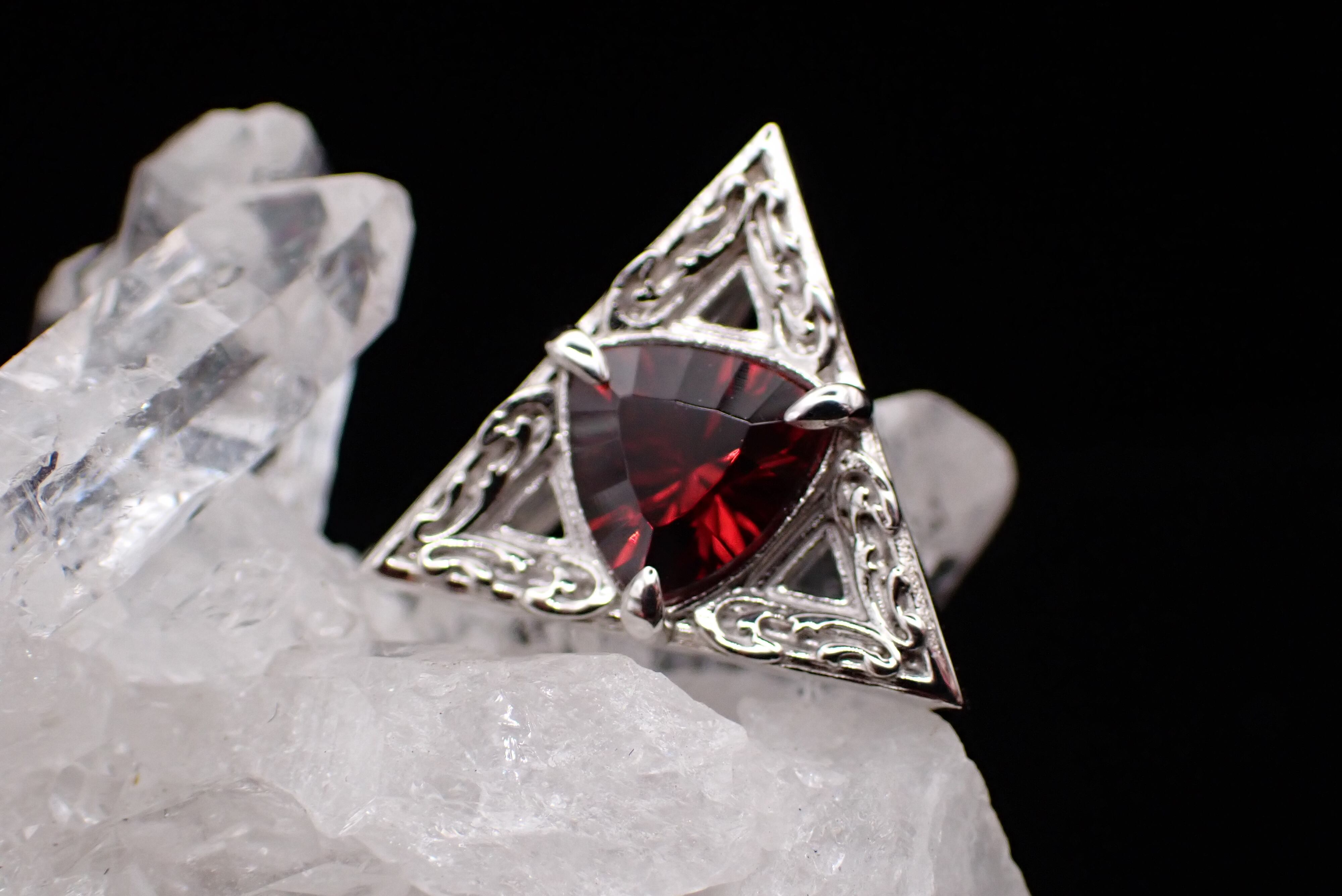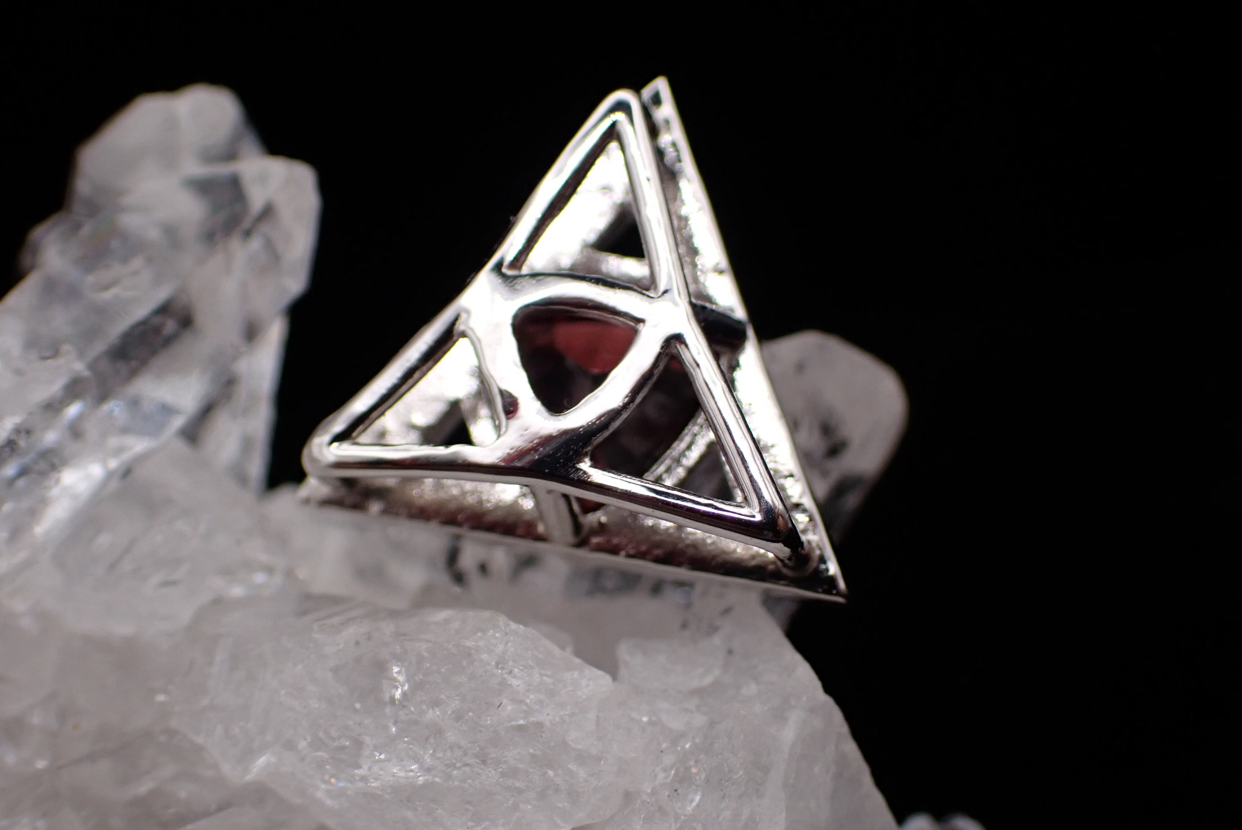 まるで絵画のように美しい三角の額縁に、コンケーブカットのガーネットを納めました。
