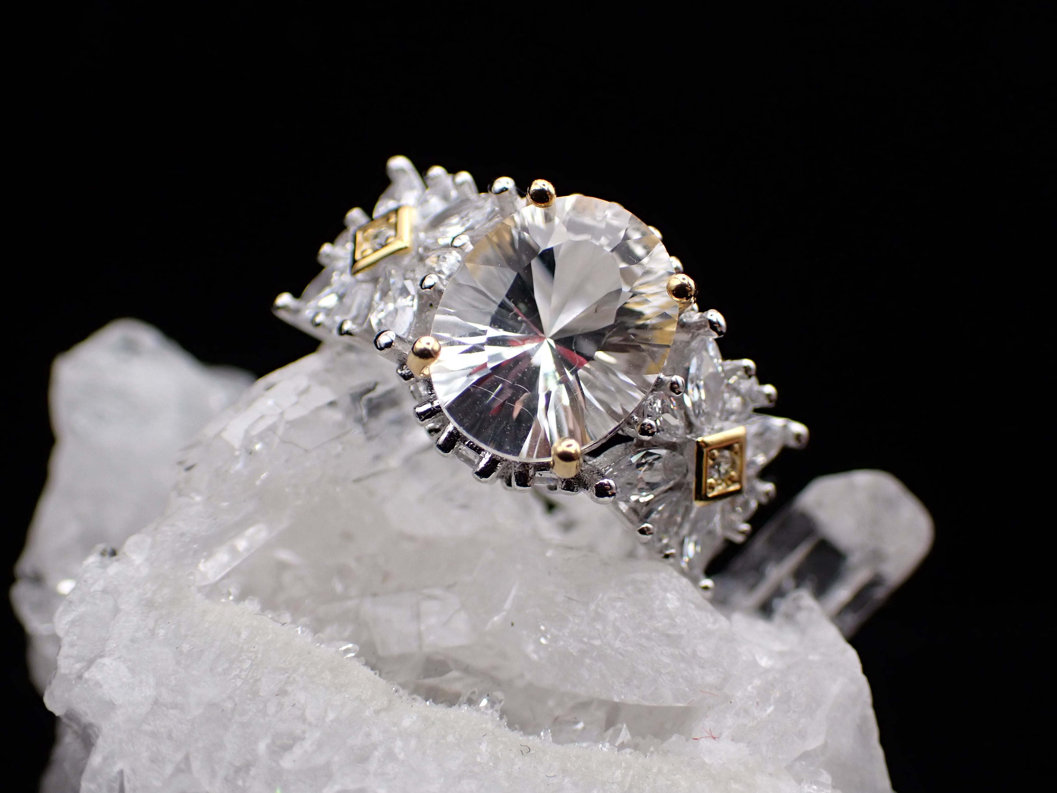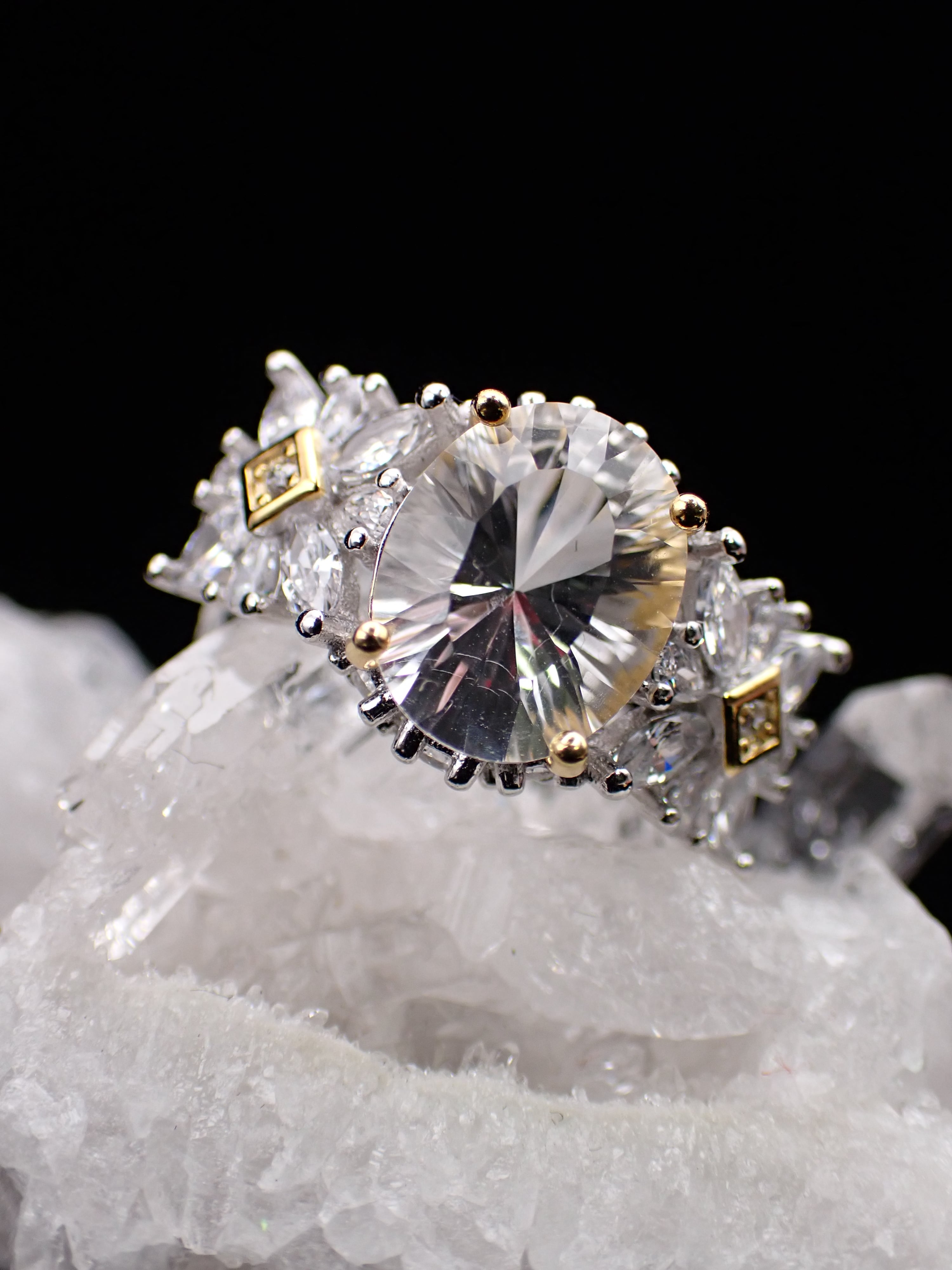 コンケーブカットが美しいホワイトトパーズを包み込んだリングです。