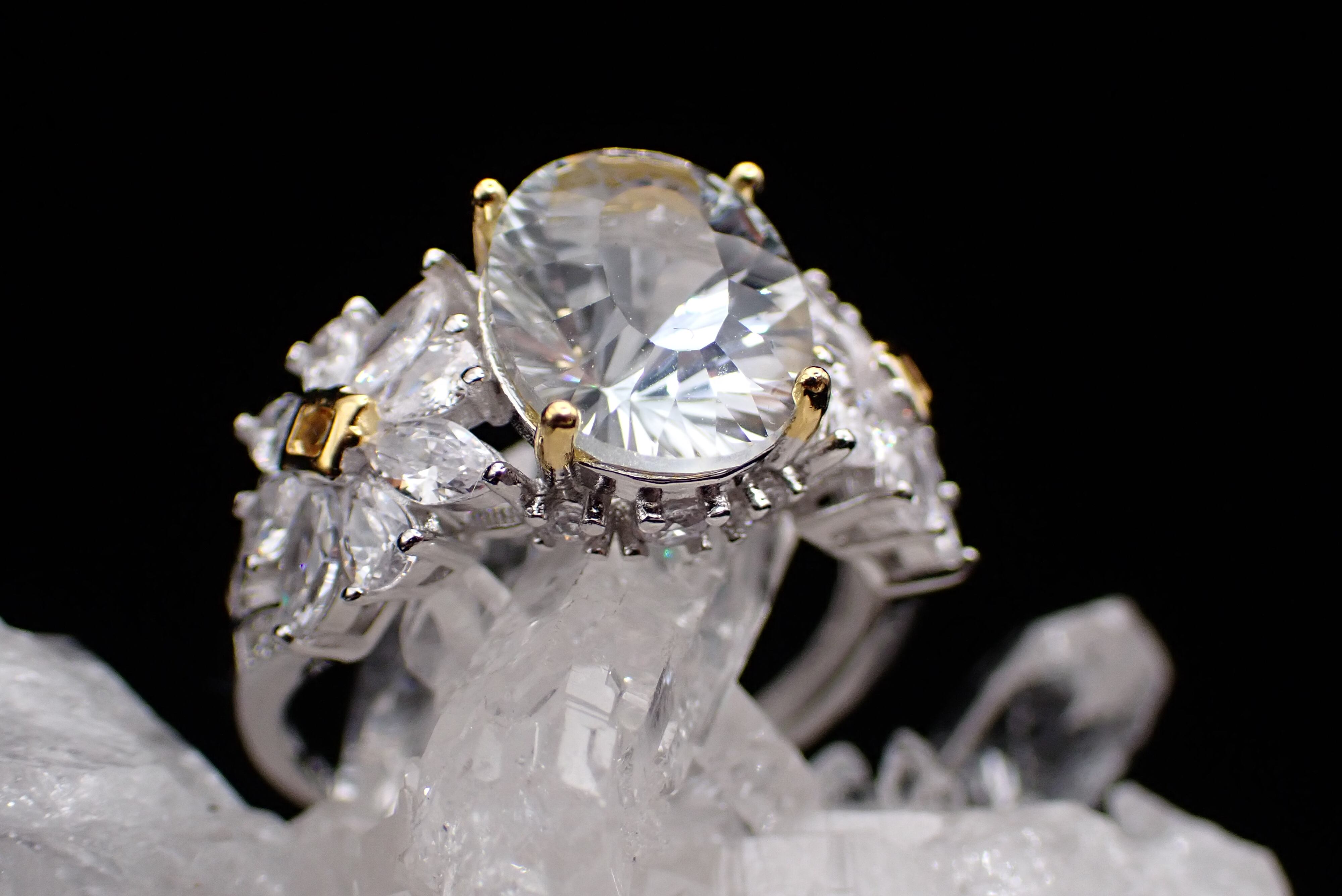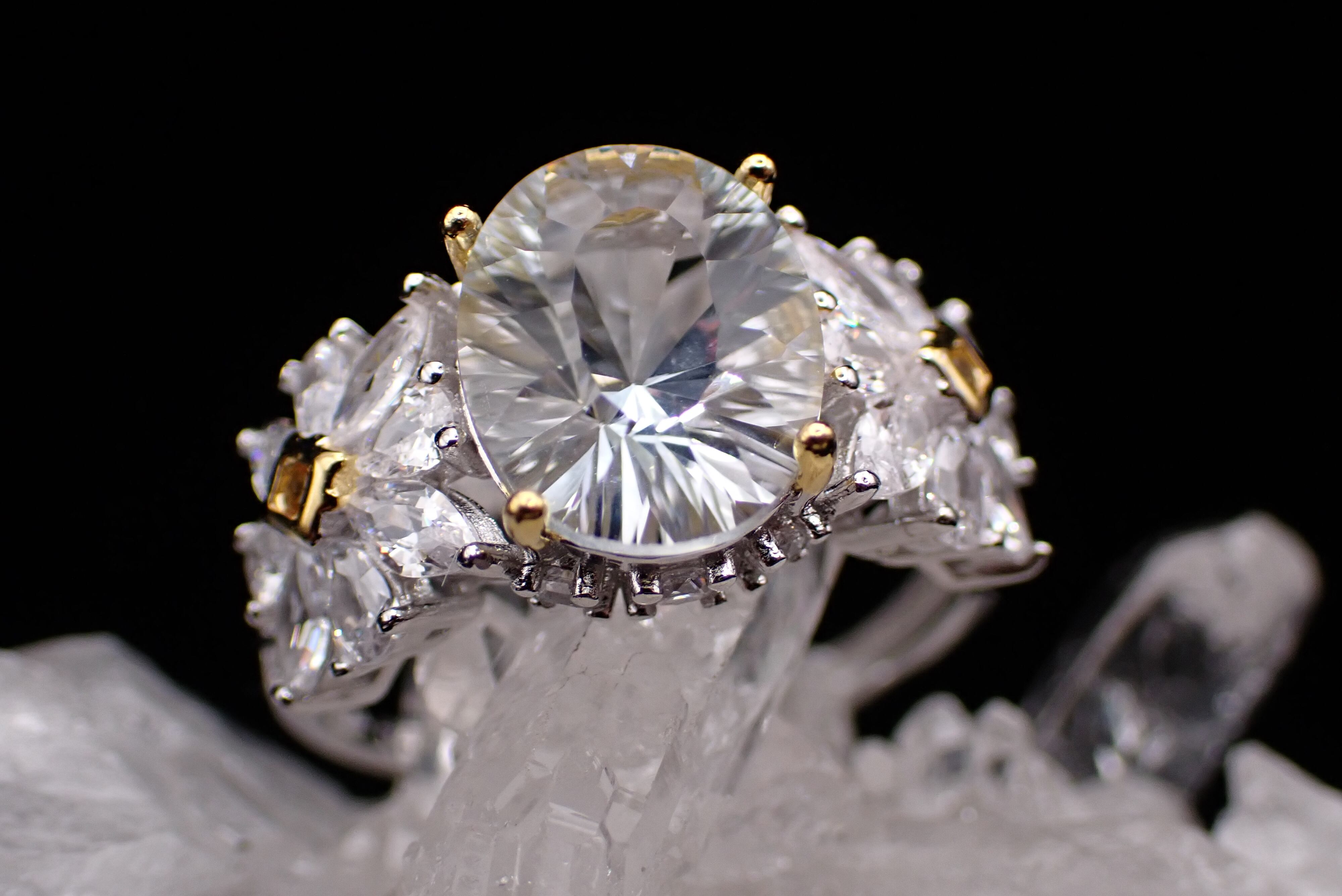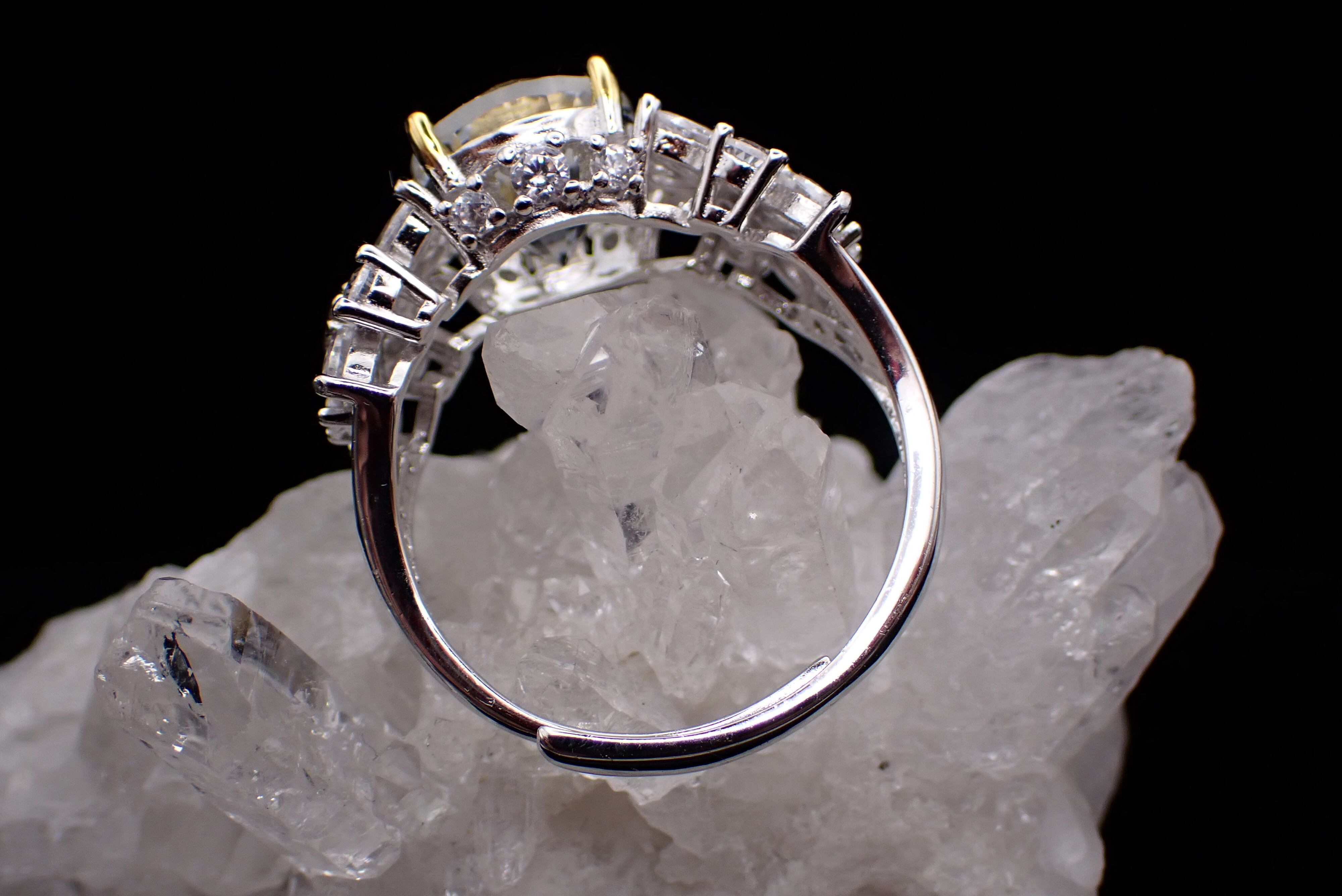 コンケーブカットが美しいホワイトブルートパーズを包み込んだリングです。