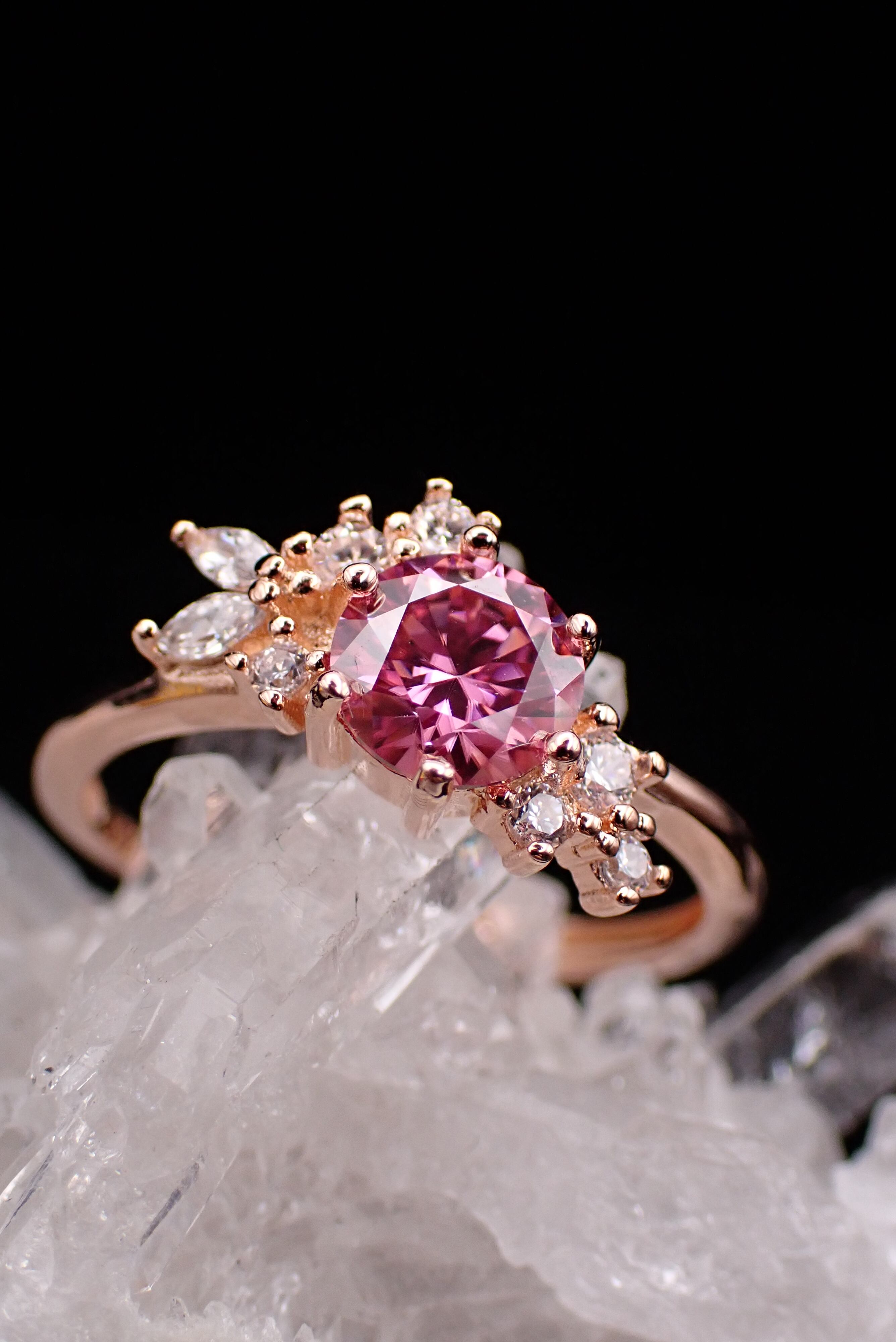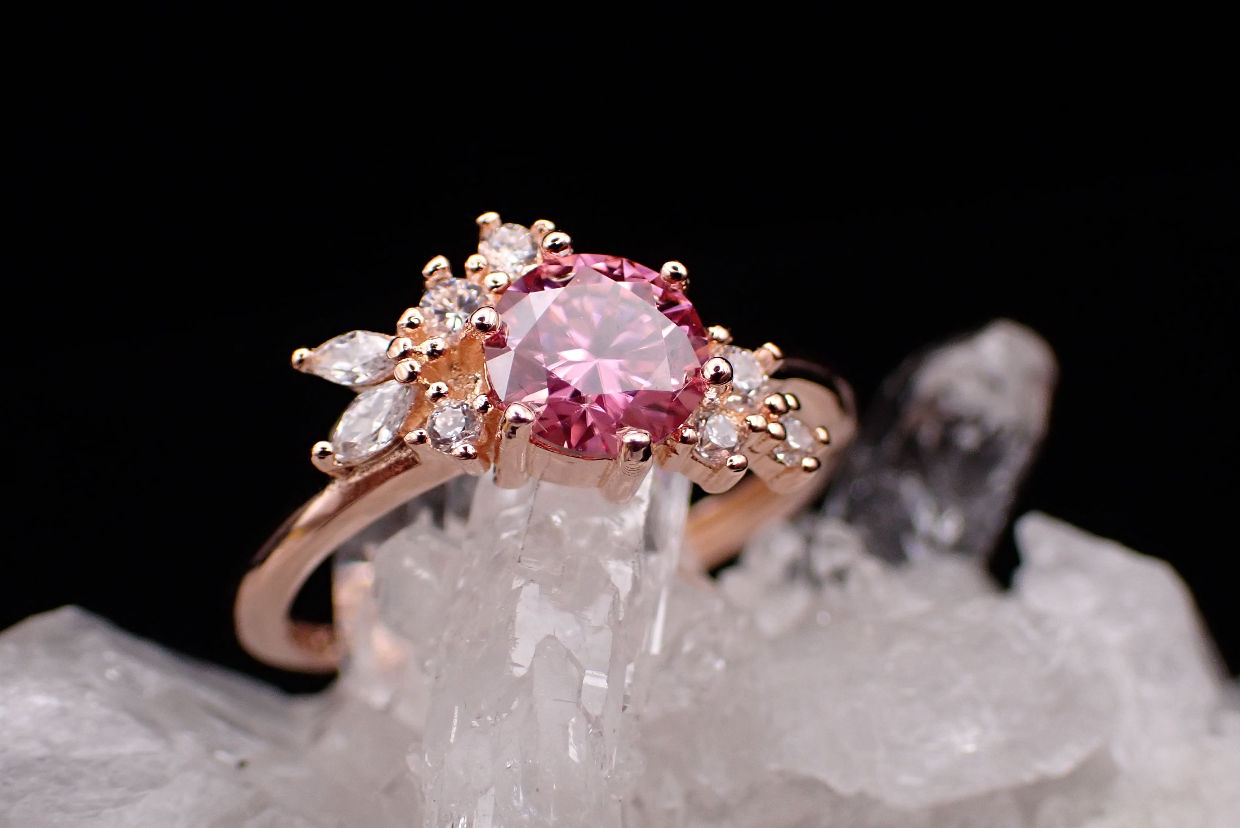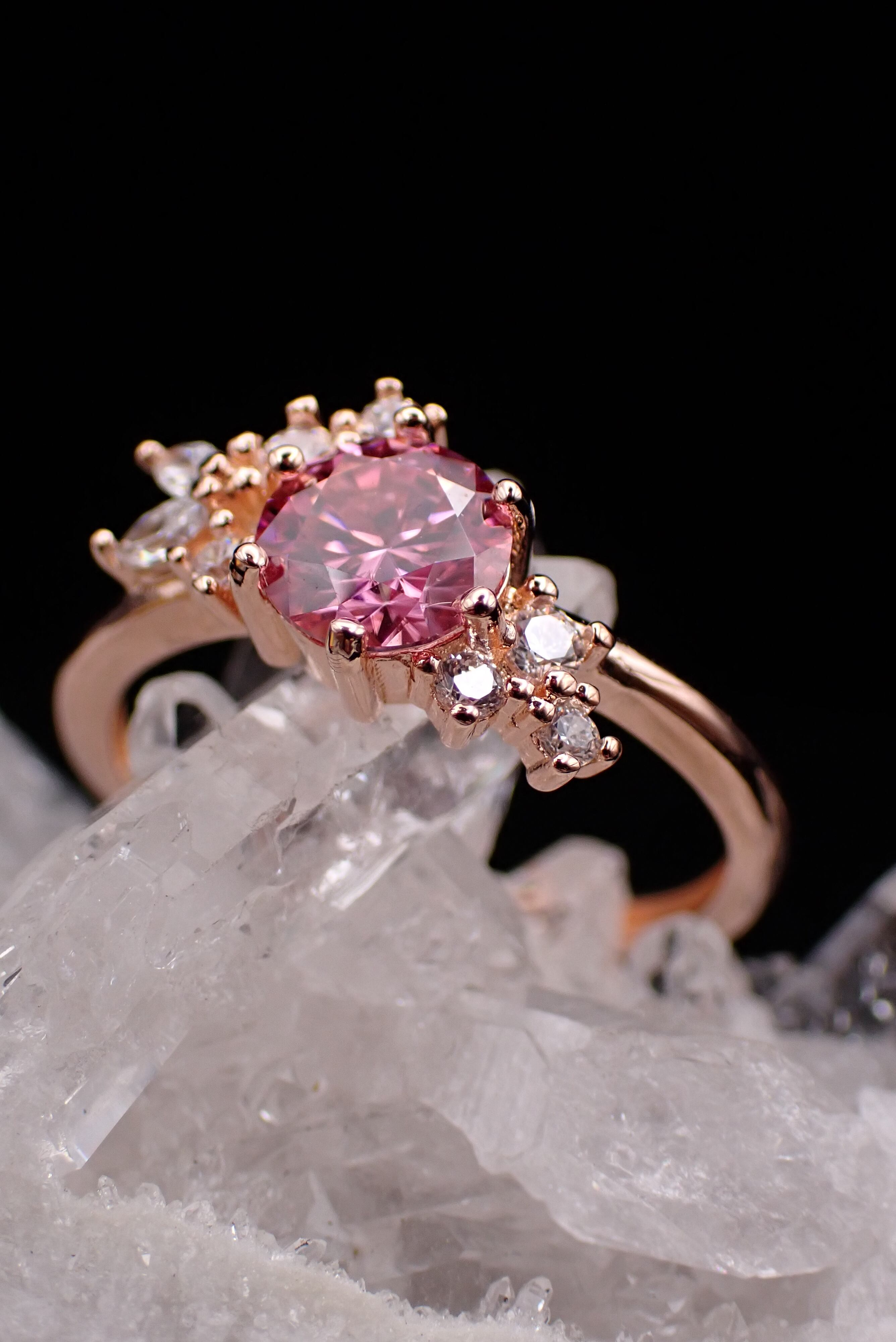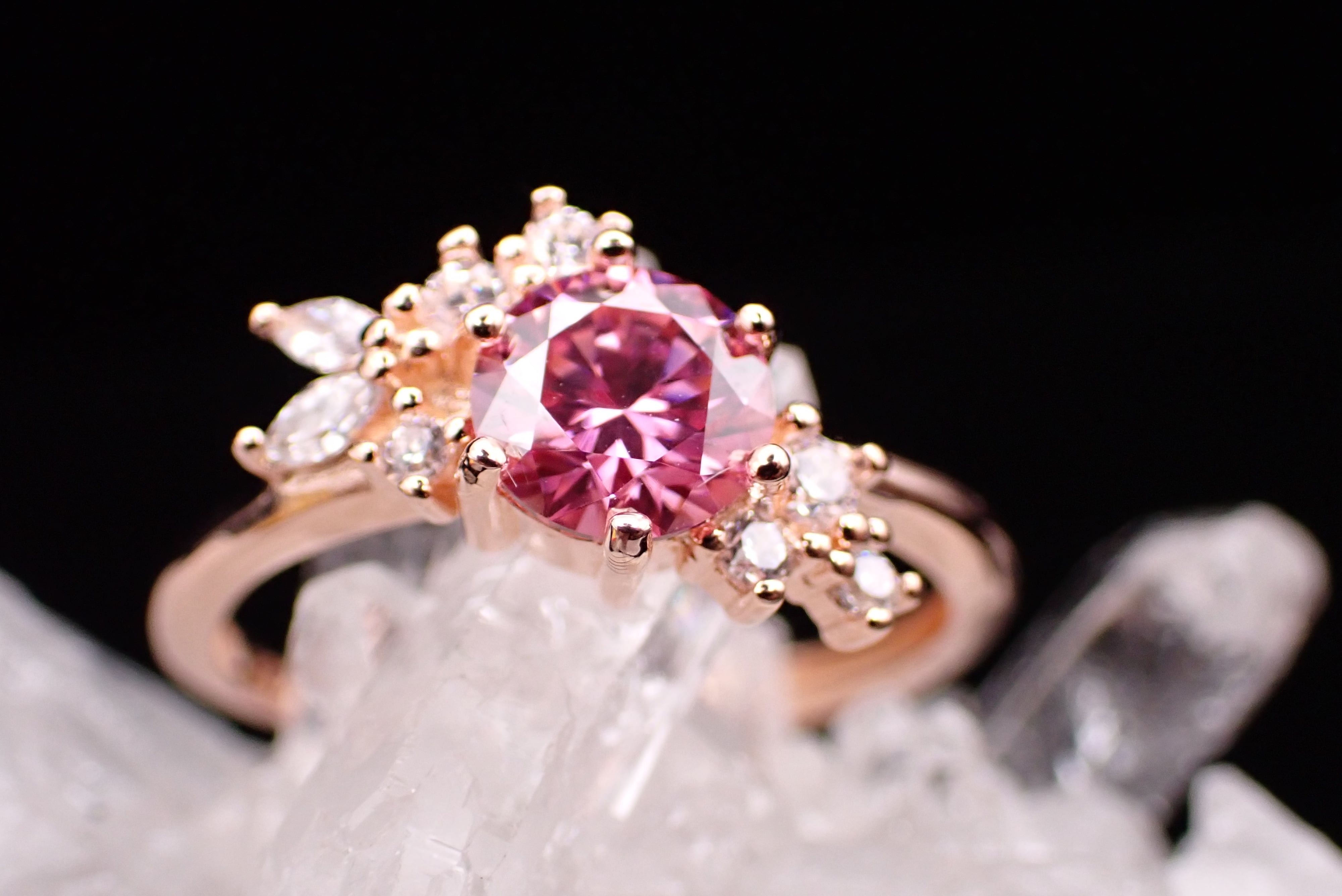 花束のように並んだ小さなジルコニアたちが、カットが美しいピンクモアッサナイトをさらに輝かせる繊細なリングです。