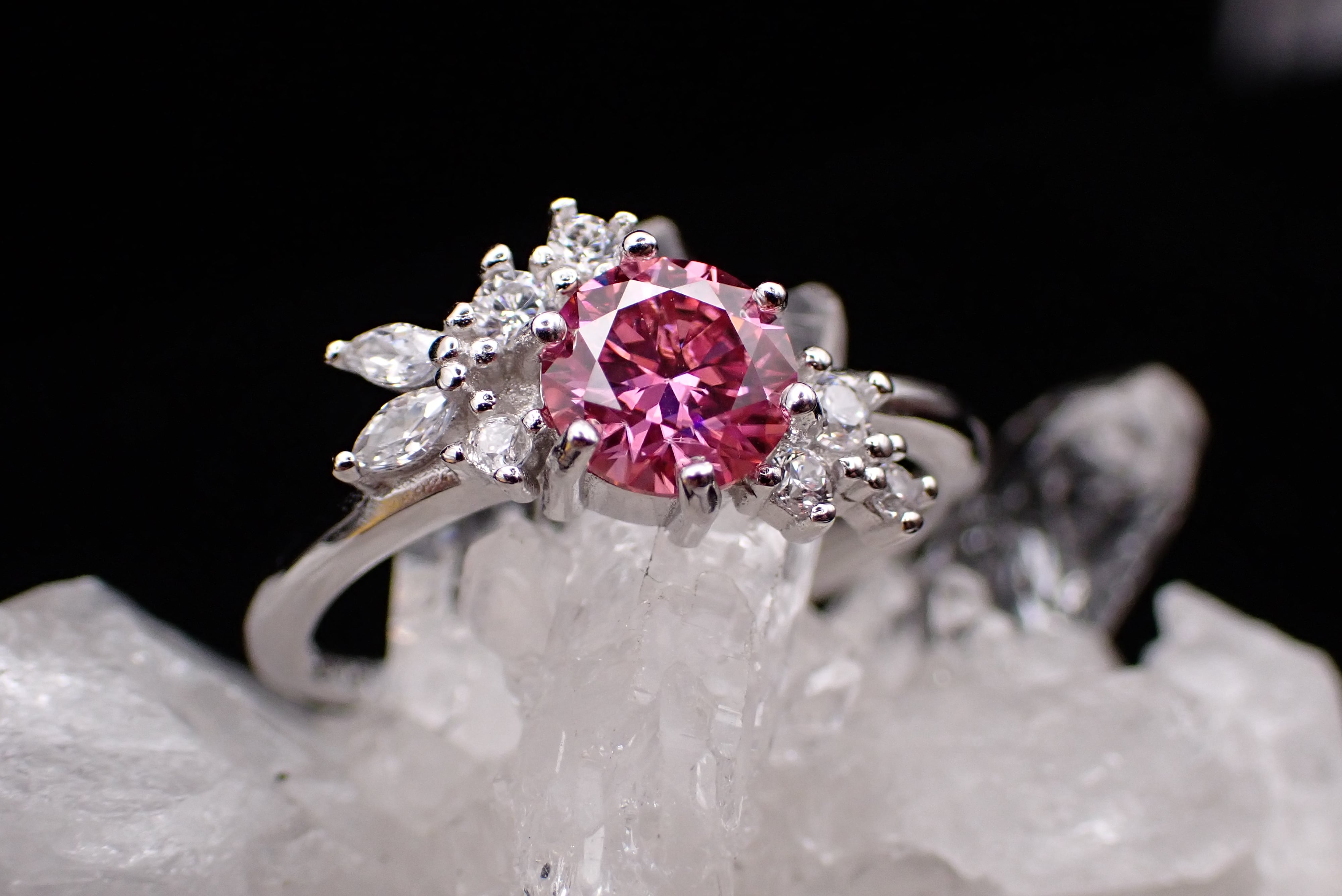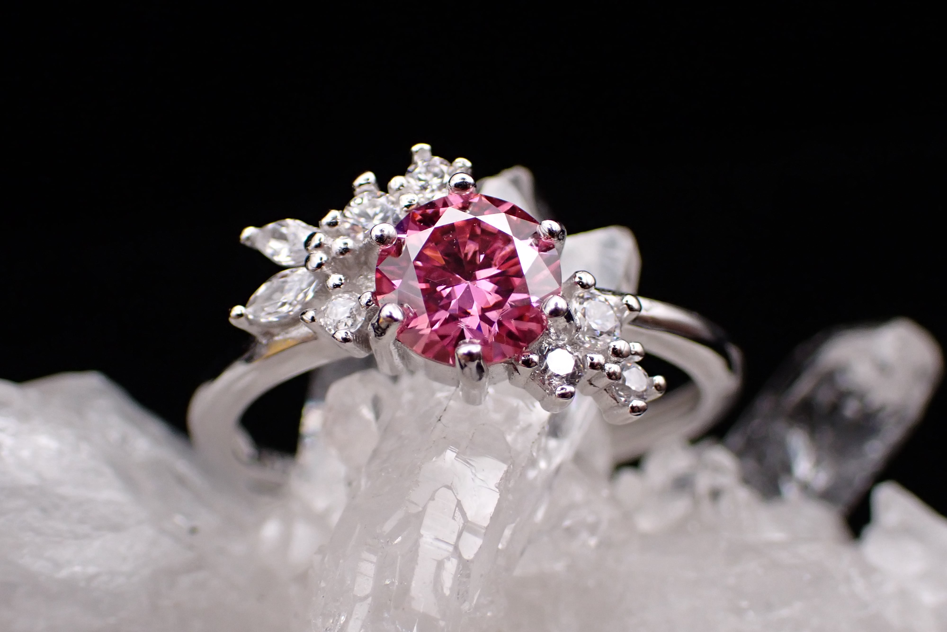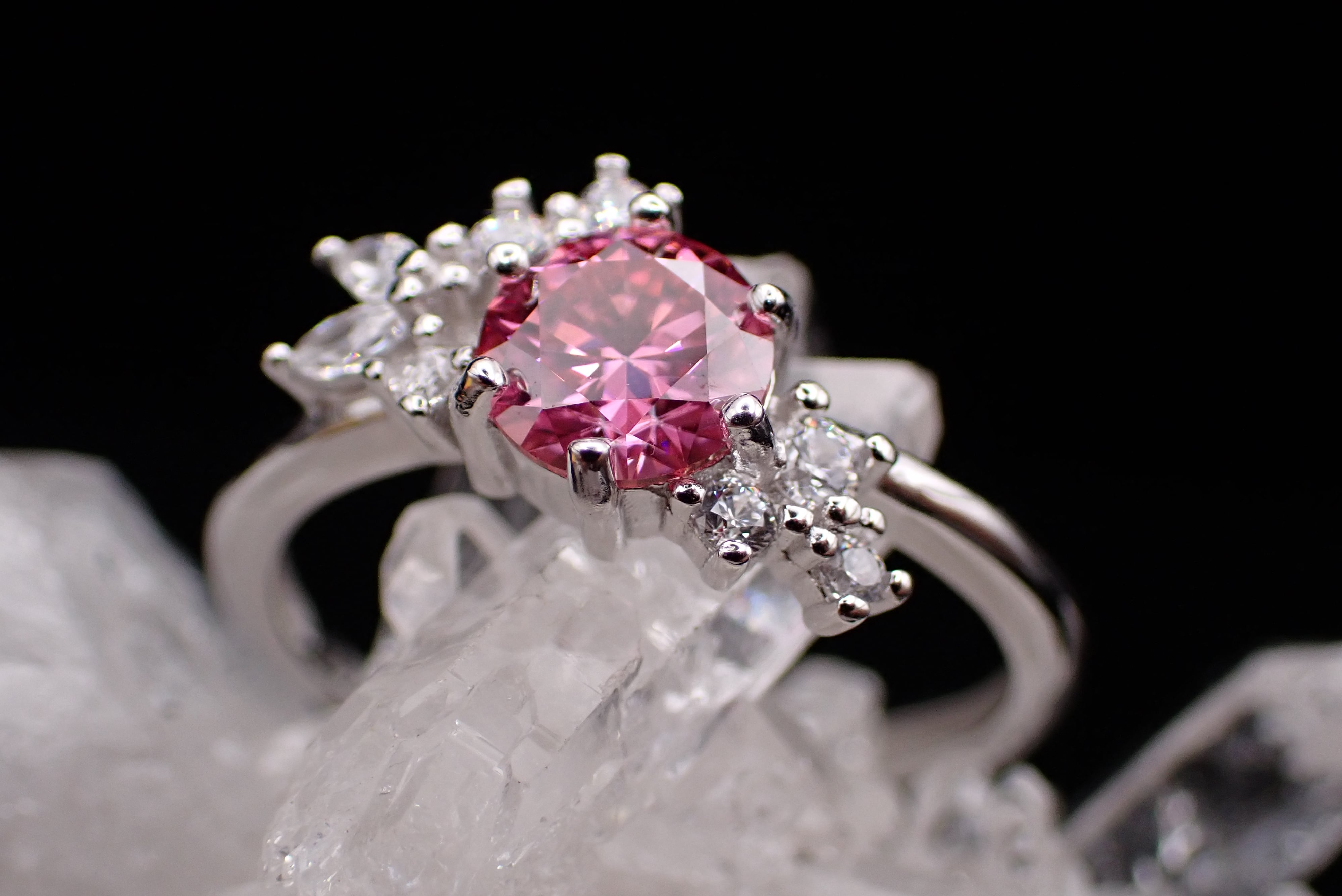 花束のように並んだ小さなジルコニアたちが、カットが美しいピンクモアッサナイトをさらに輝かせる繊細なリングです。
