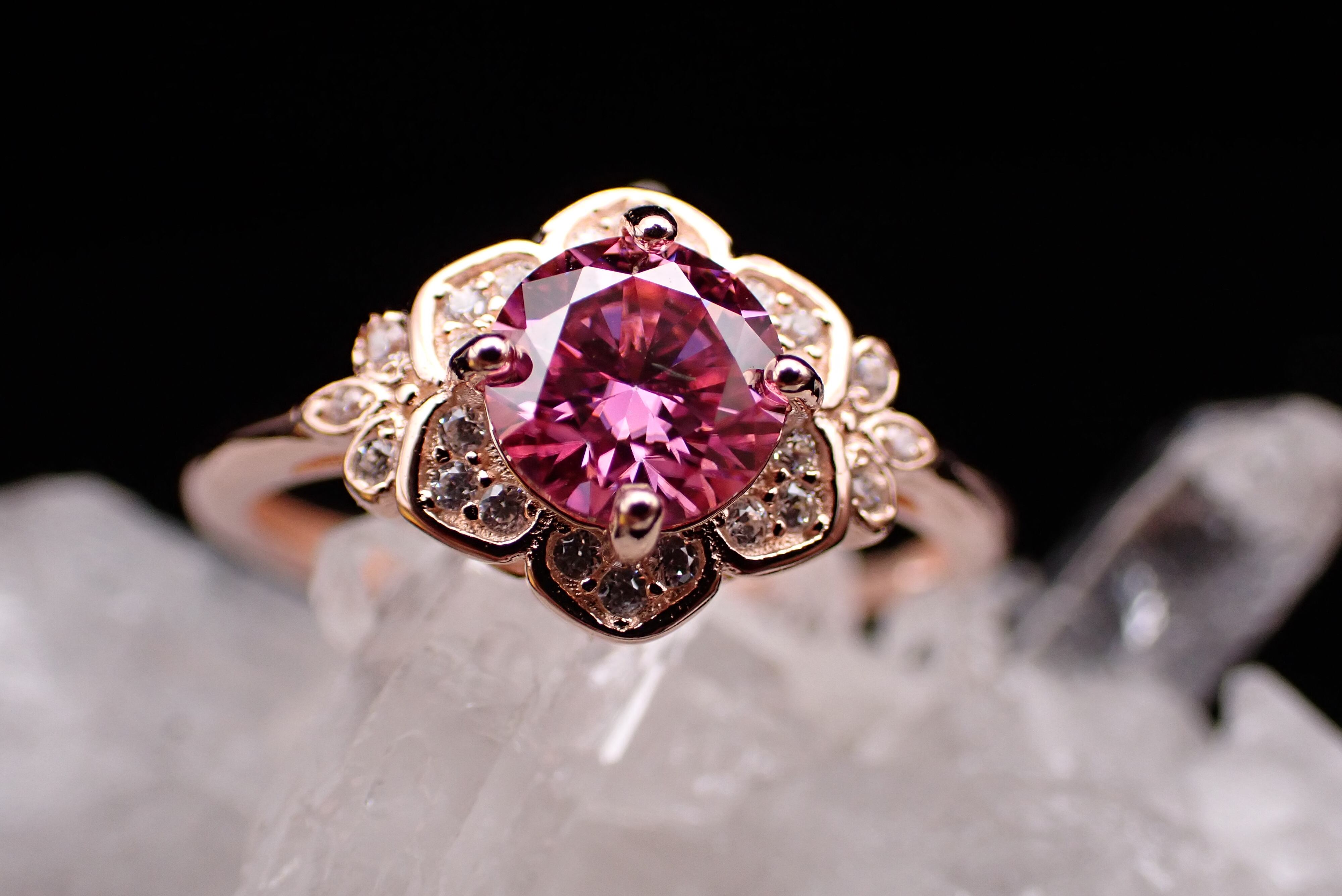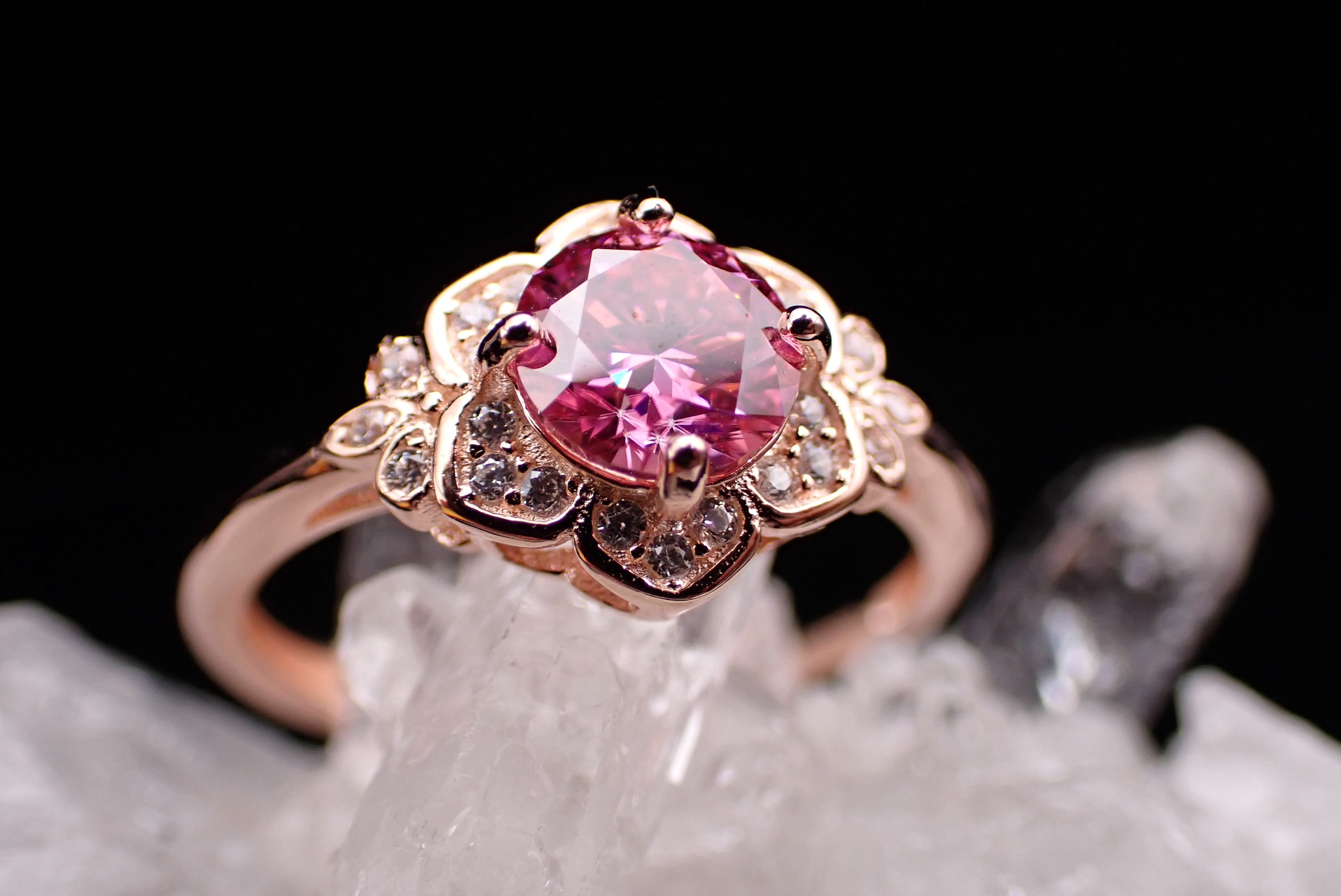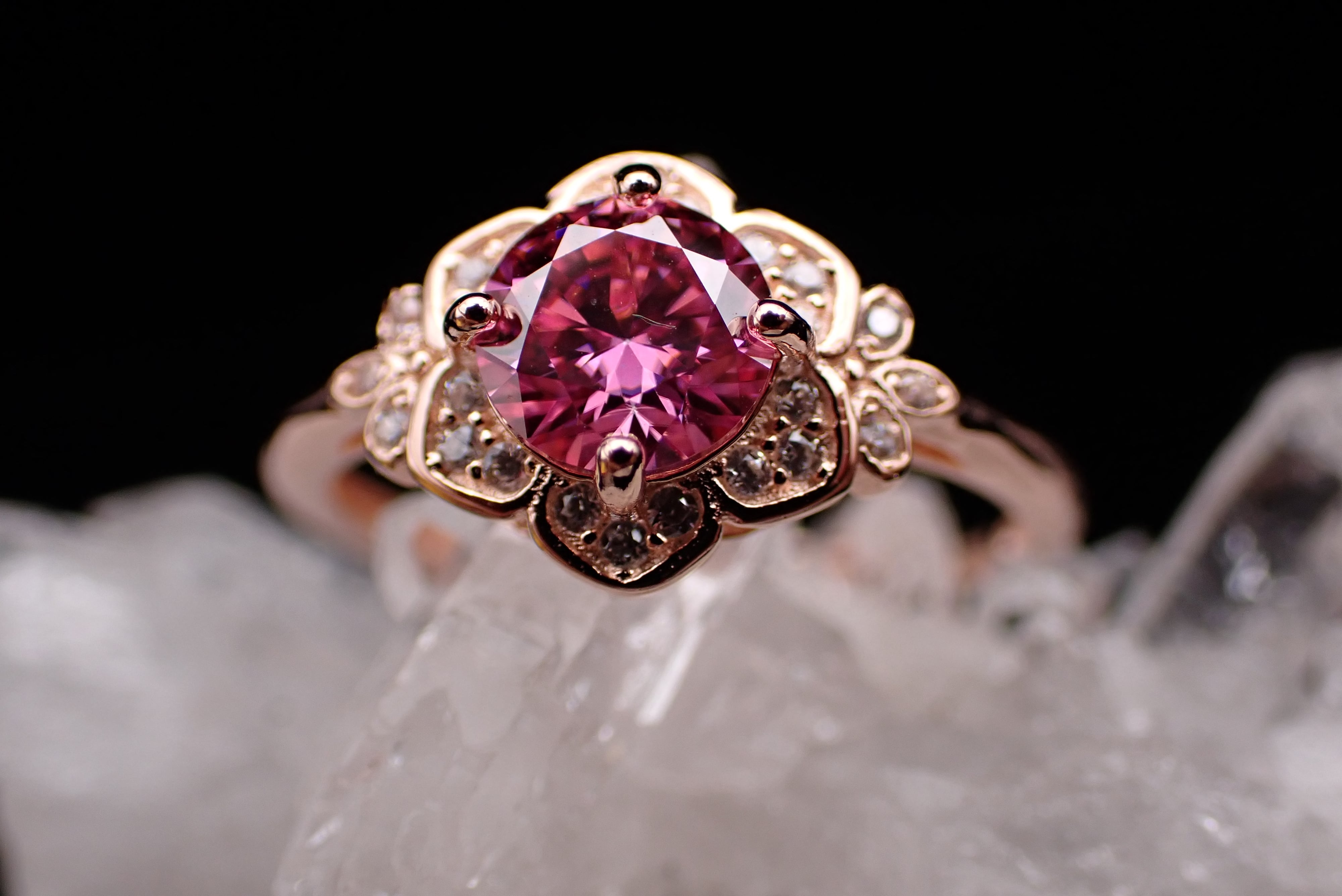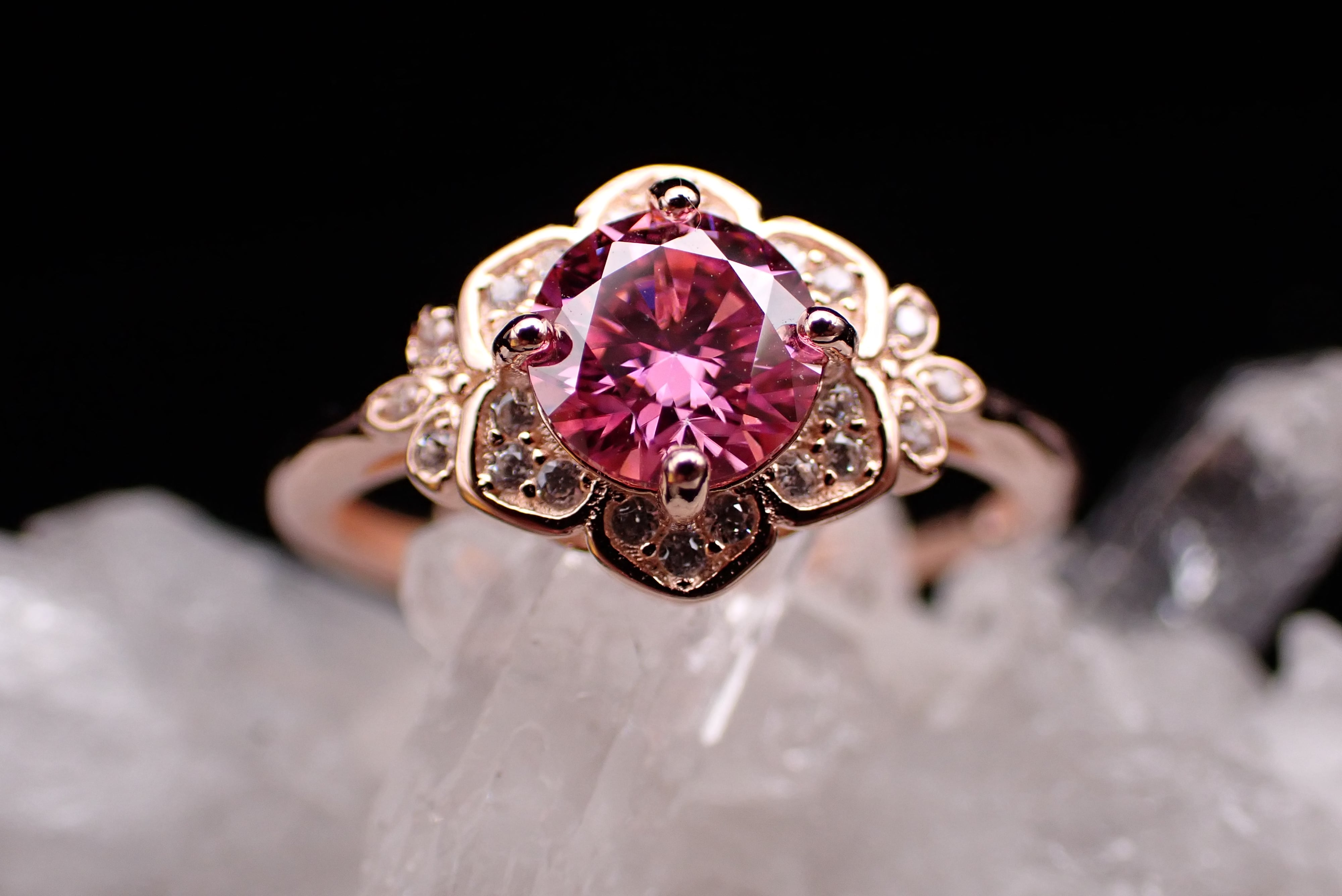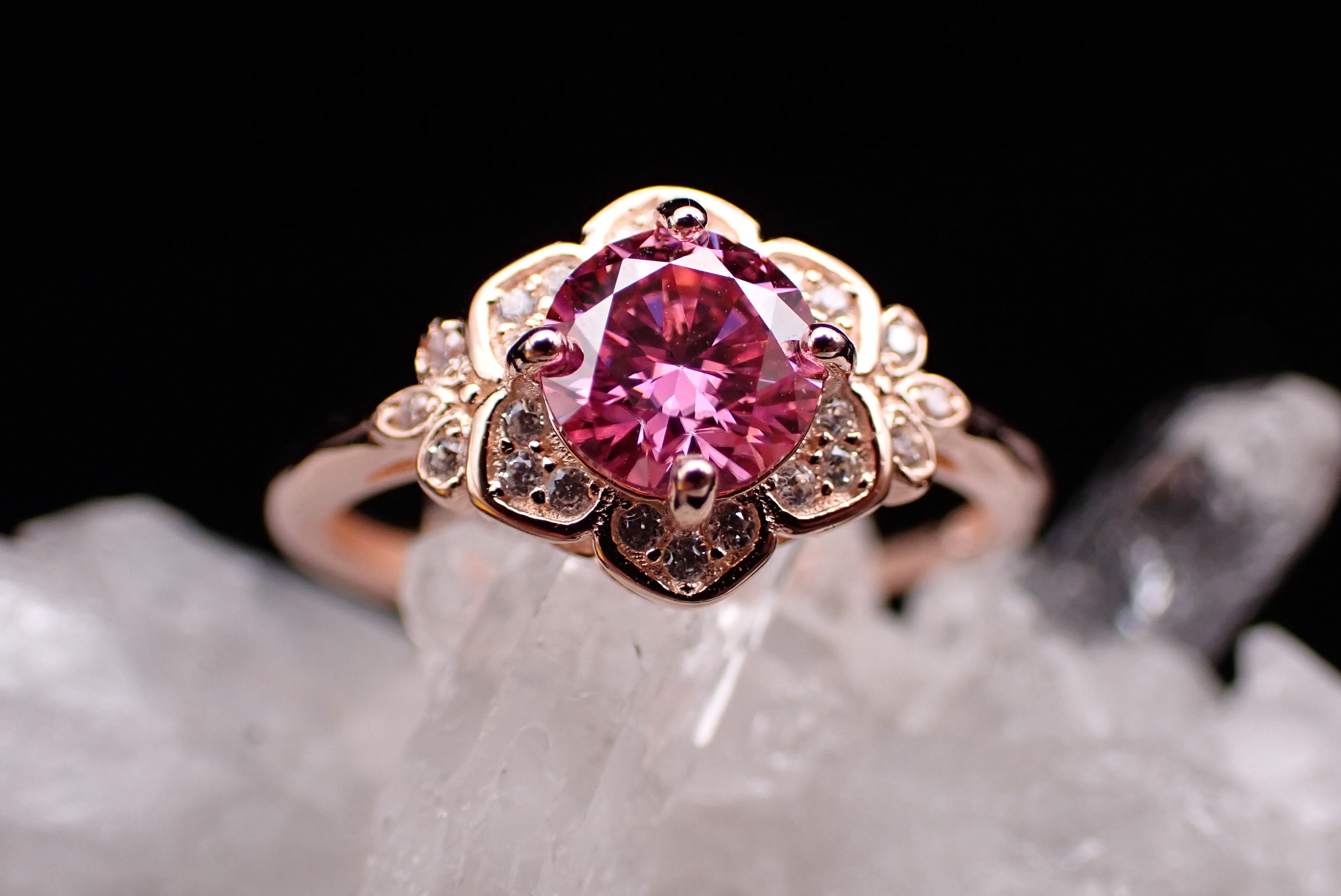 桔梗の花びらの中央に咲き誇る美しいピンクモアッサナイト。