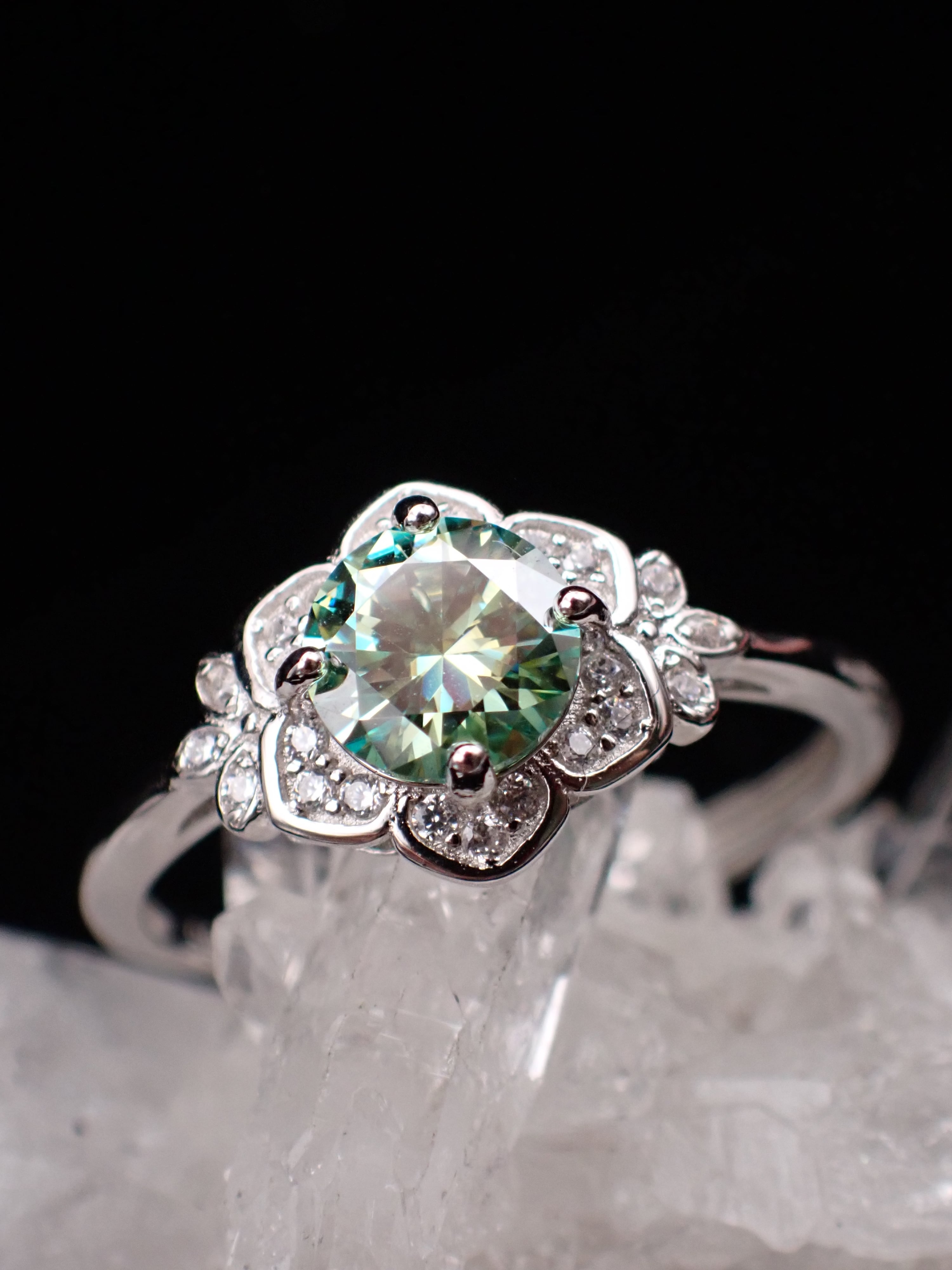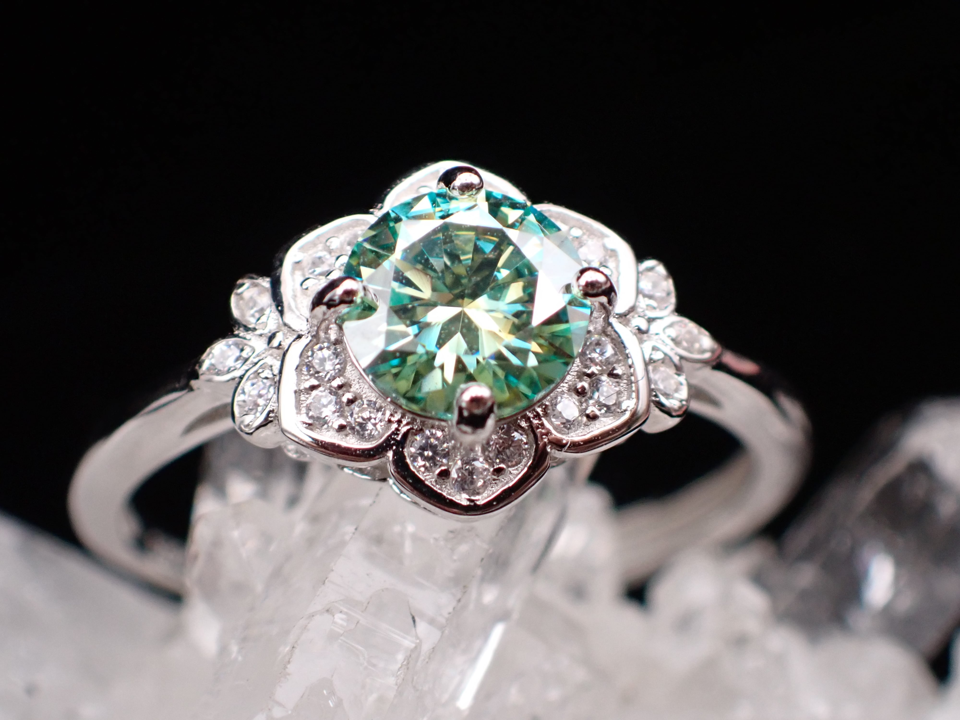 桔梗の花びらの中央に咲き誇る美しいグリーンモアッサナイト。