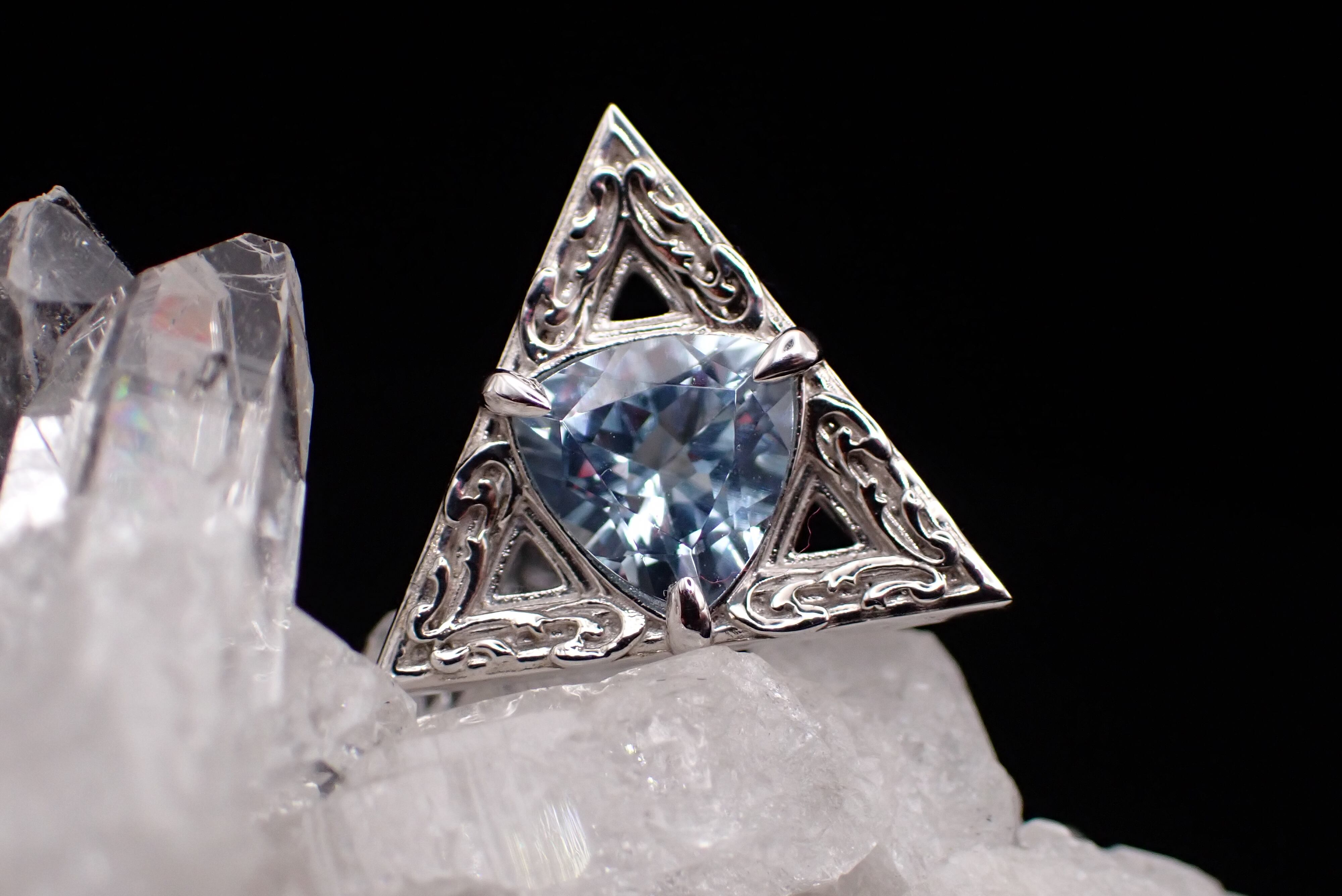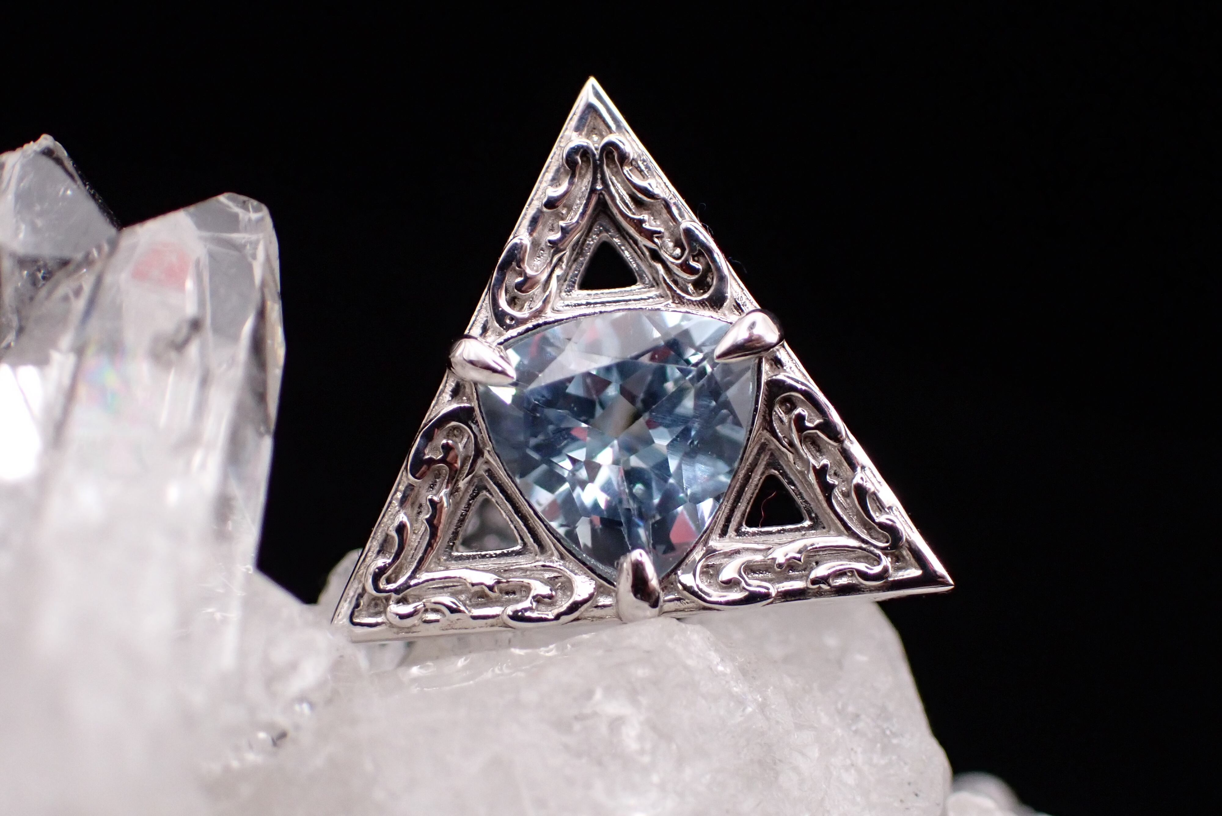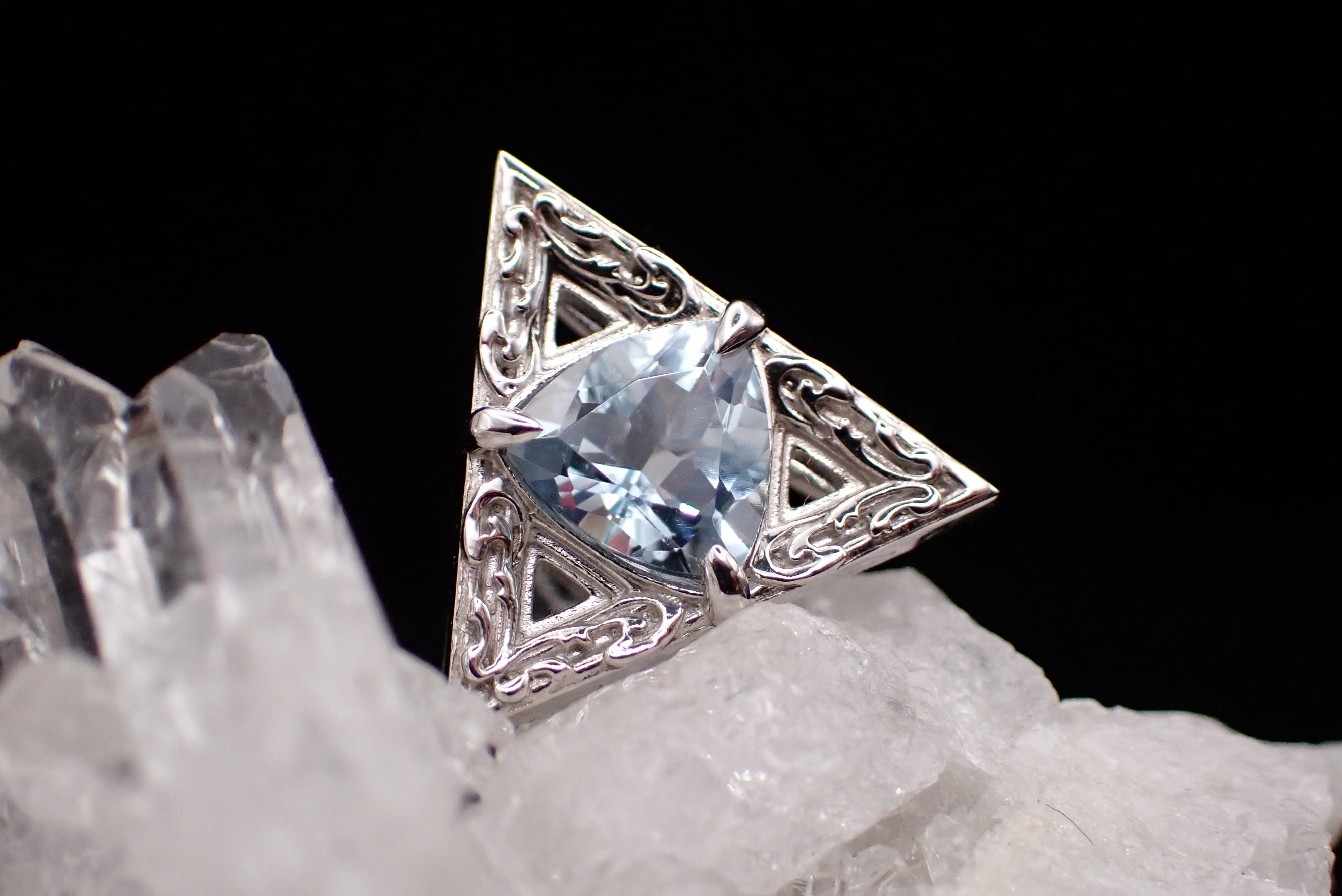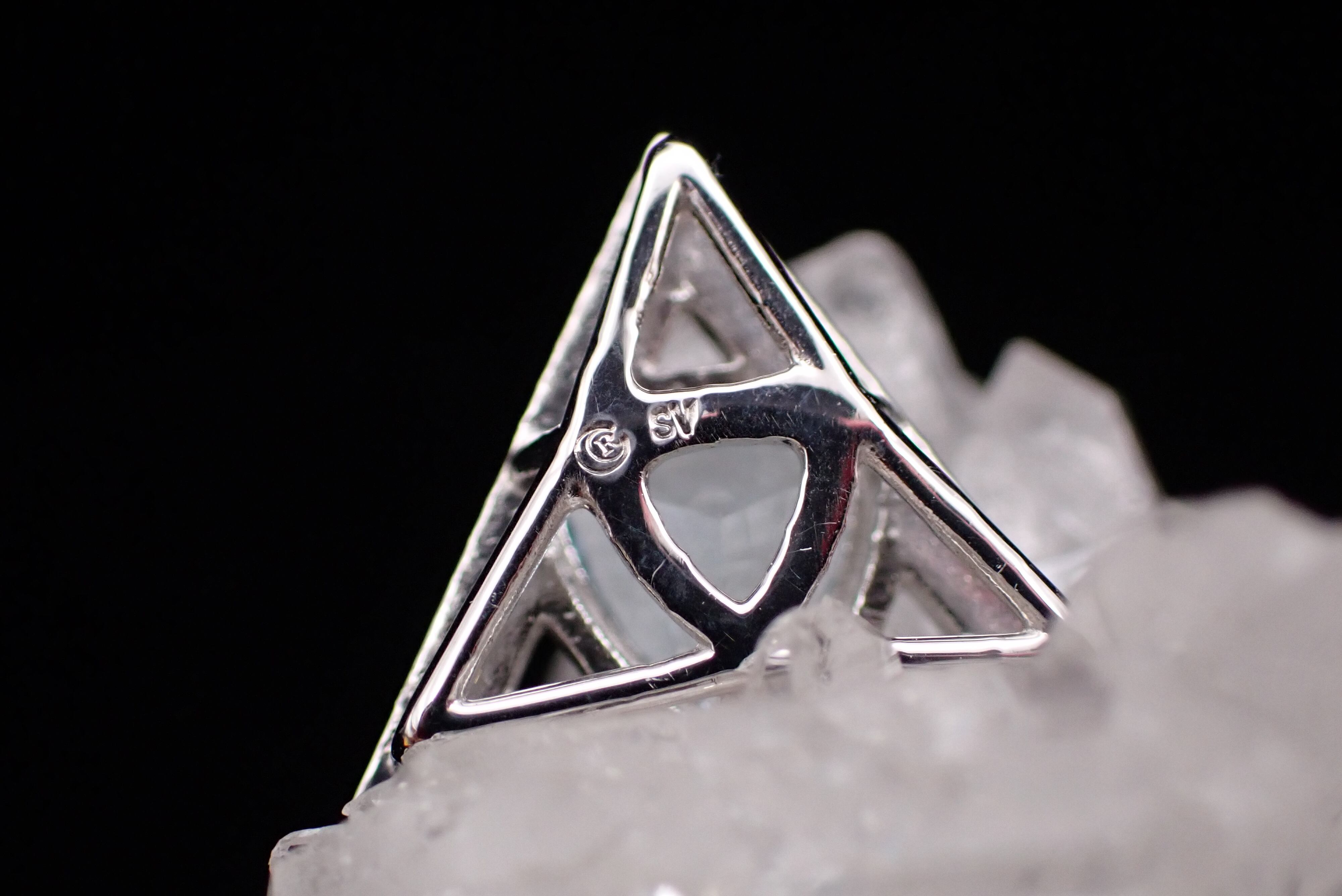 まるで絵画のように美しい三角の額縁に、澄んだアクアマリンを納めました。