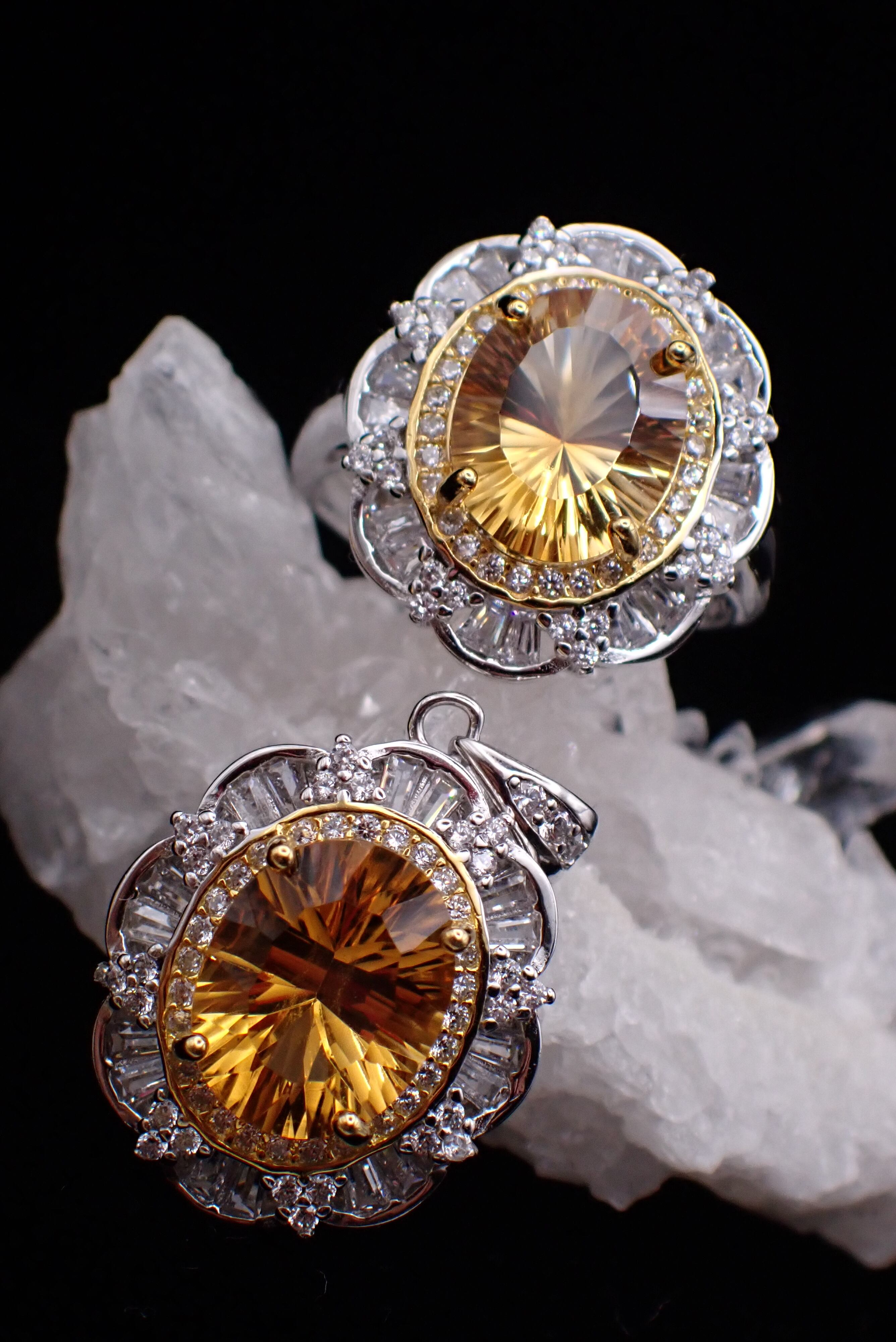 コンケーブカットが美しいシトリンが中央に鎮座したゴージャスなリングとペンダントのセットです。